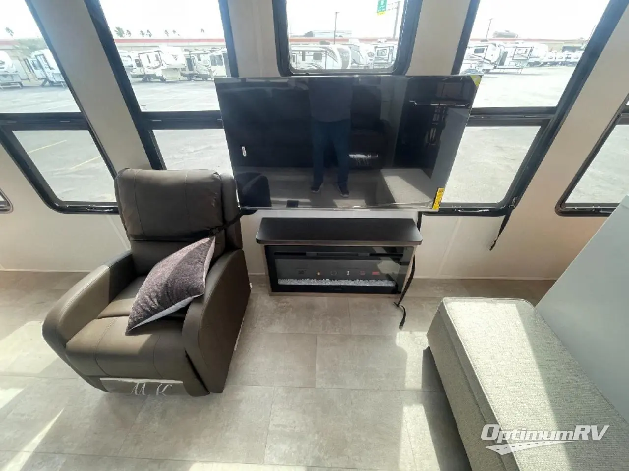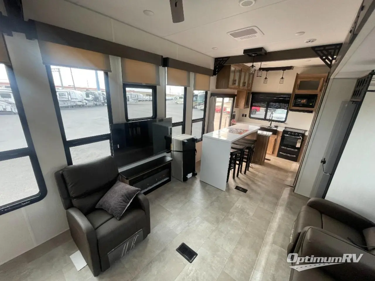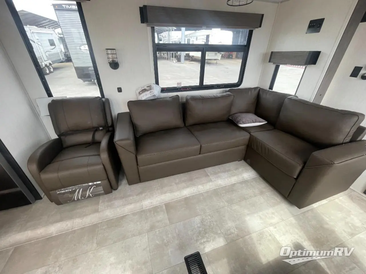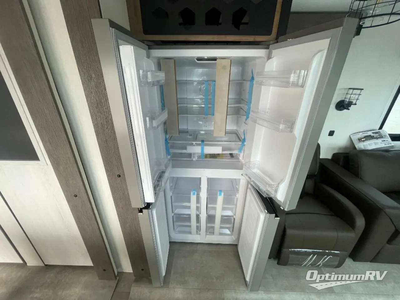 Time spent in this destination trailer will be time well spent! You will appreciate dual entry doors for maximum convenience, plus a spacious full bath that is close by the front private bedroom! Your crew can relax in the middle living area on the L-shaped sofa or on one of the dual lounge chairs. The rear kitchen will be any chef's dream with its island with three stools and all the appliances to create meals each day. This model also features triple slides so you can enjoy more space to relax!