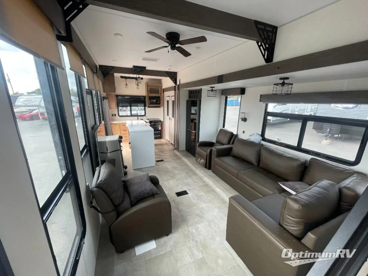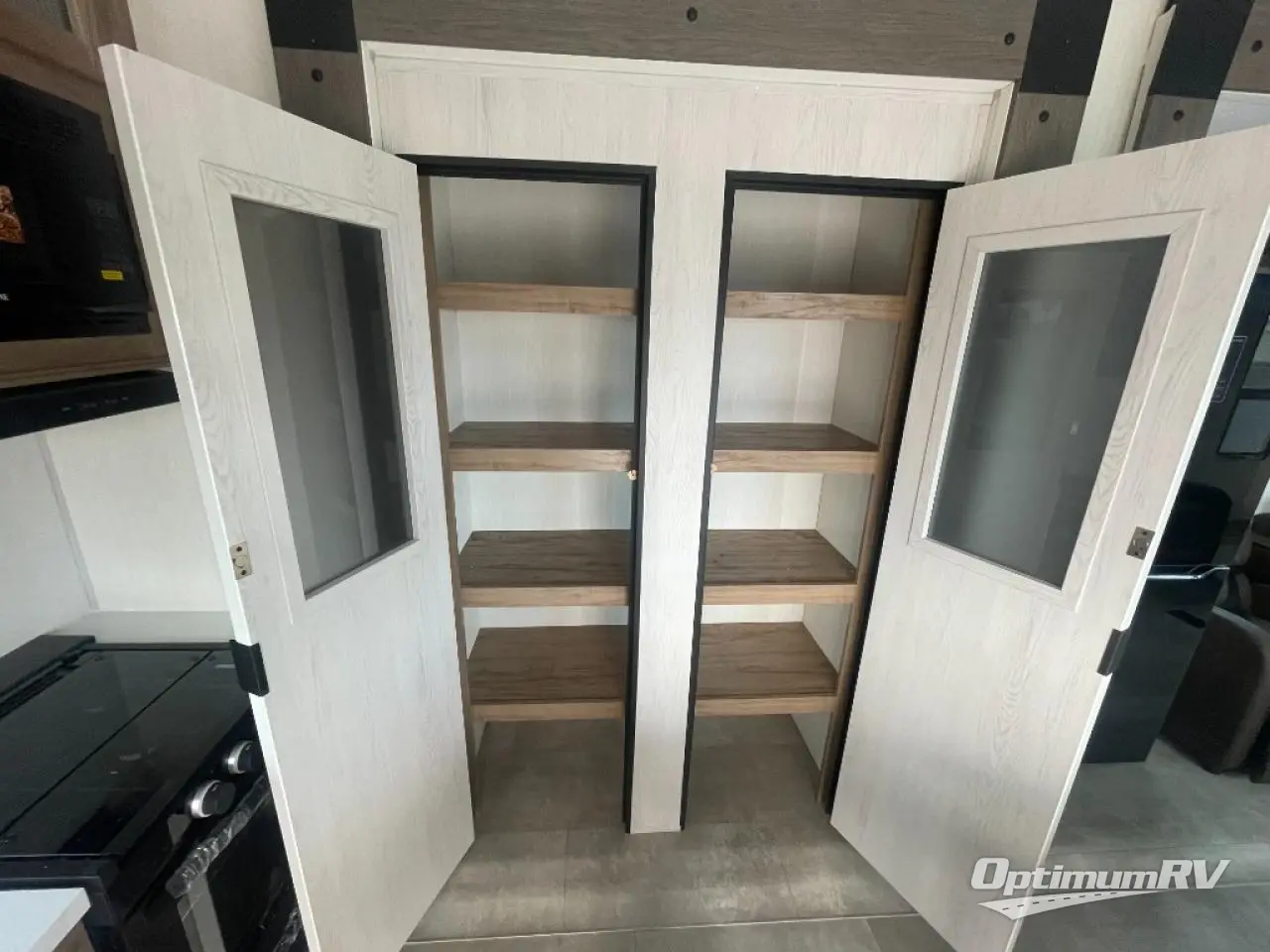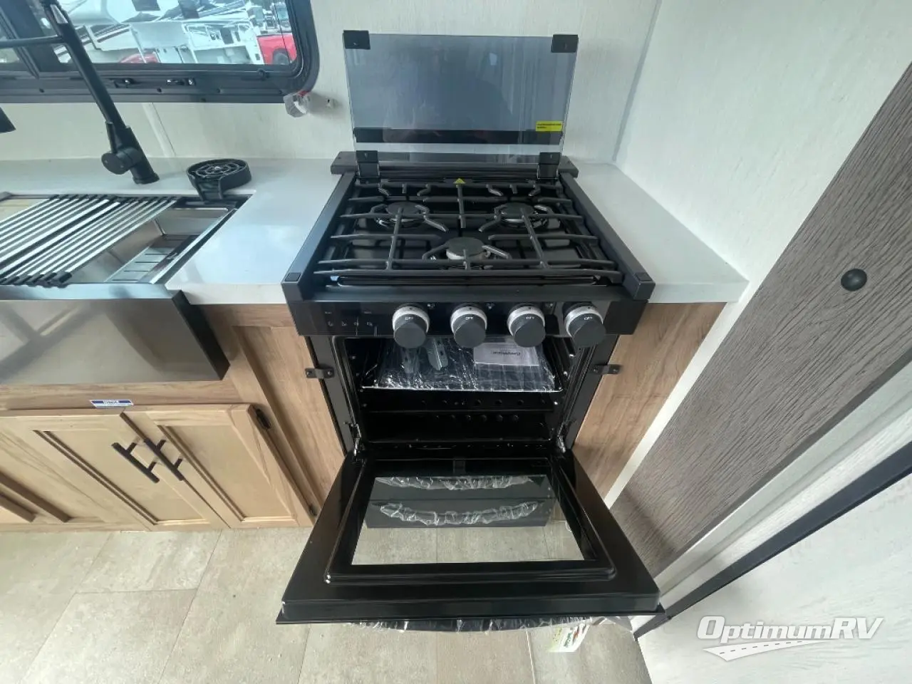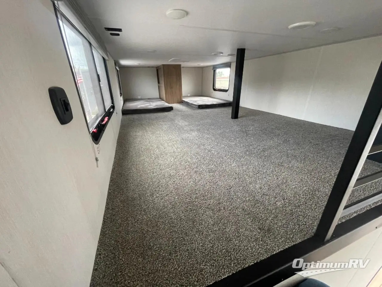 Time spent in this destination trailer will be time well spent! You will appreciate dual entry doors for maximum convenience, plus a spacious full bath that is close by the front private bedroom! Your crew can relax in the middle living area on the L-shaped sofa or on one of the dual lounge chairs. The rear kitchen will be any chef's dream with its island with three stools and all the appliances to create meals each day. This model also features triple slides so you can enjoy more space to relax!