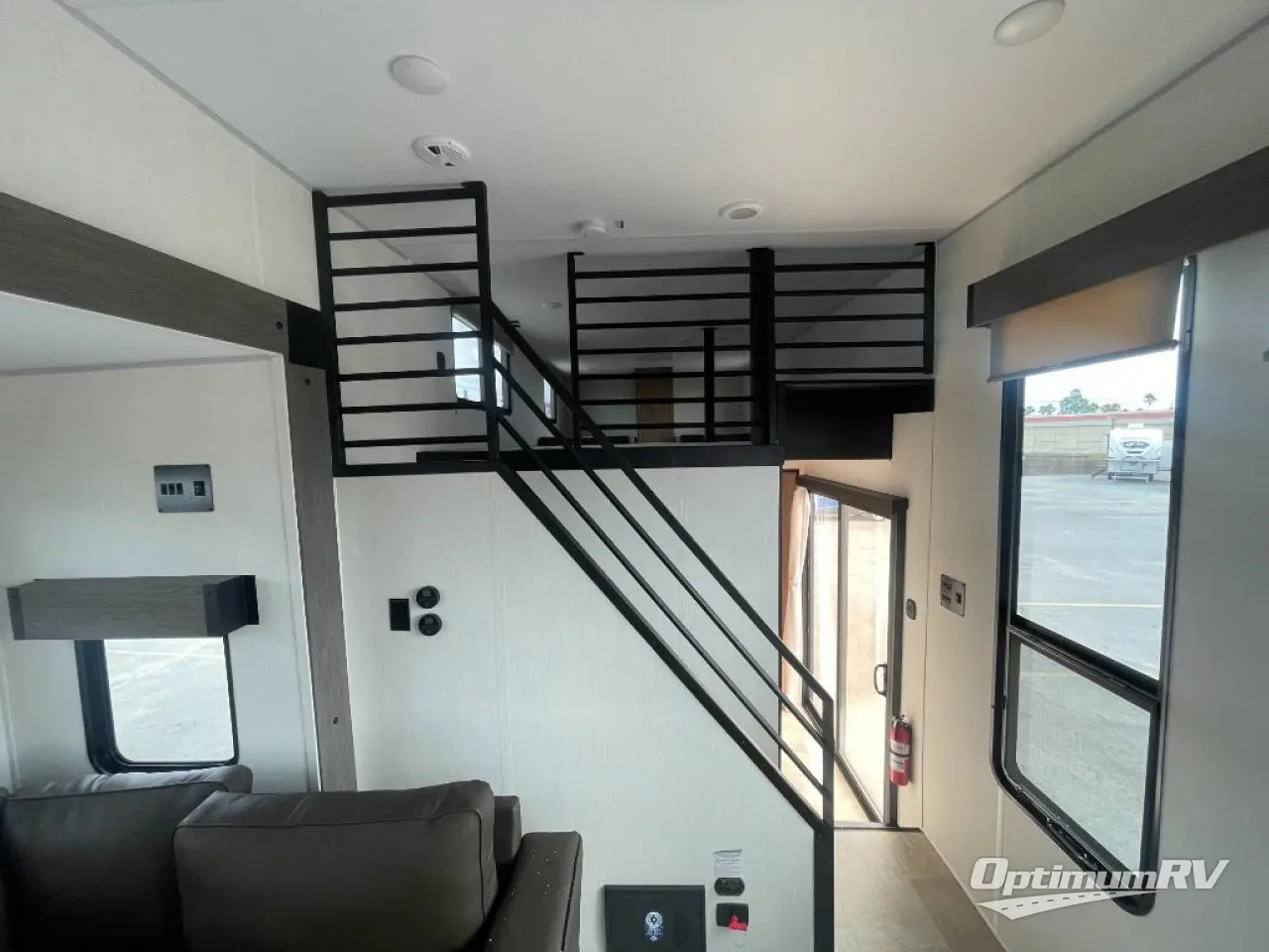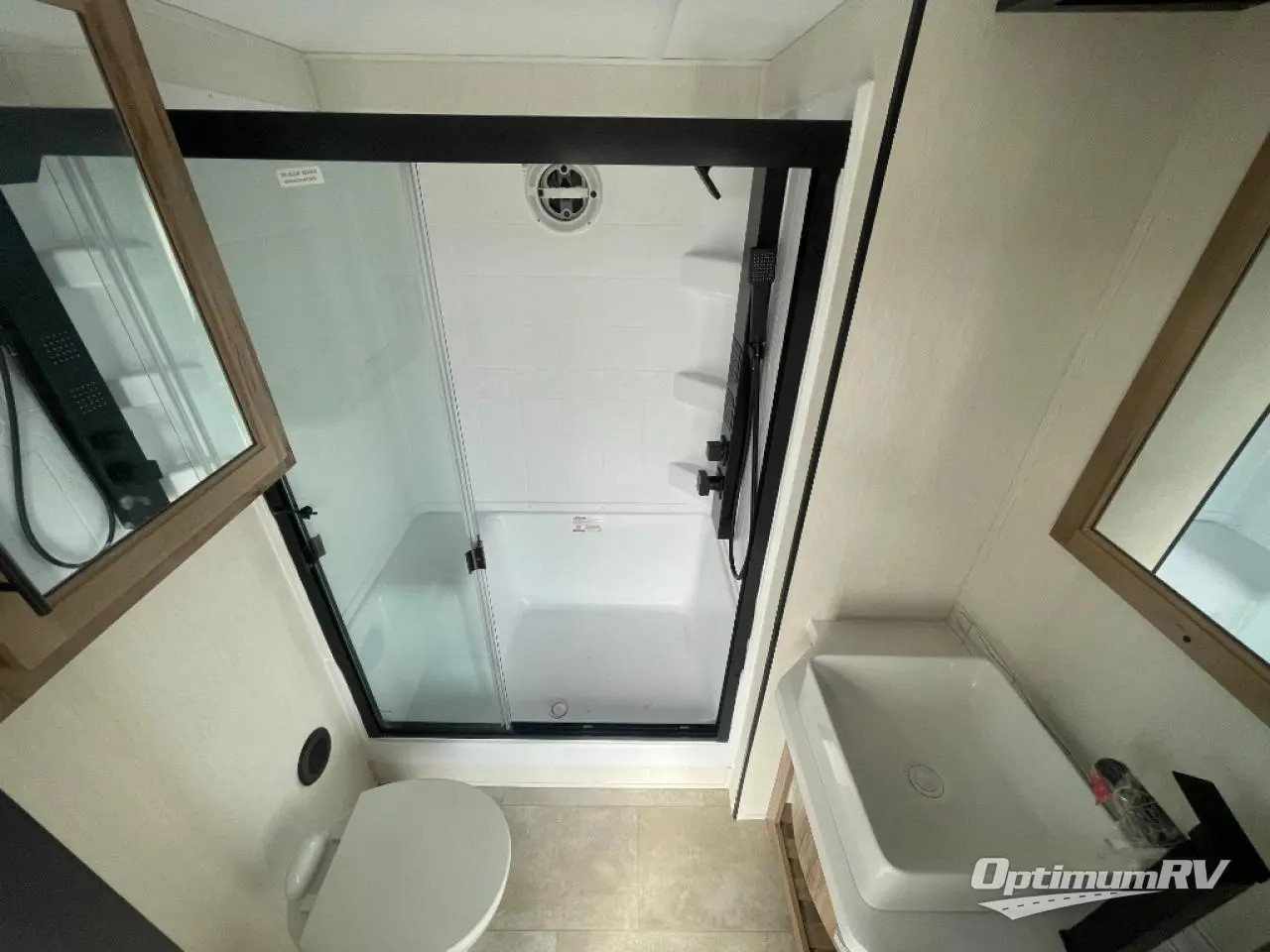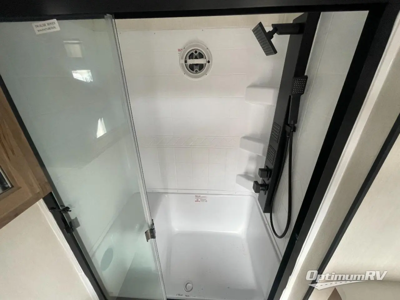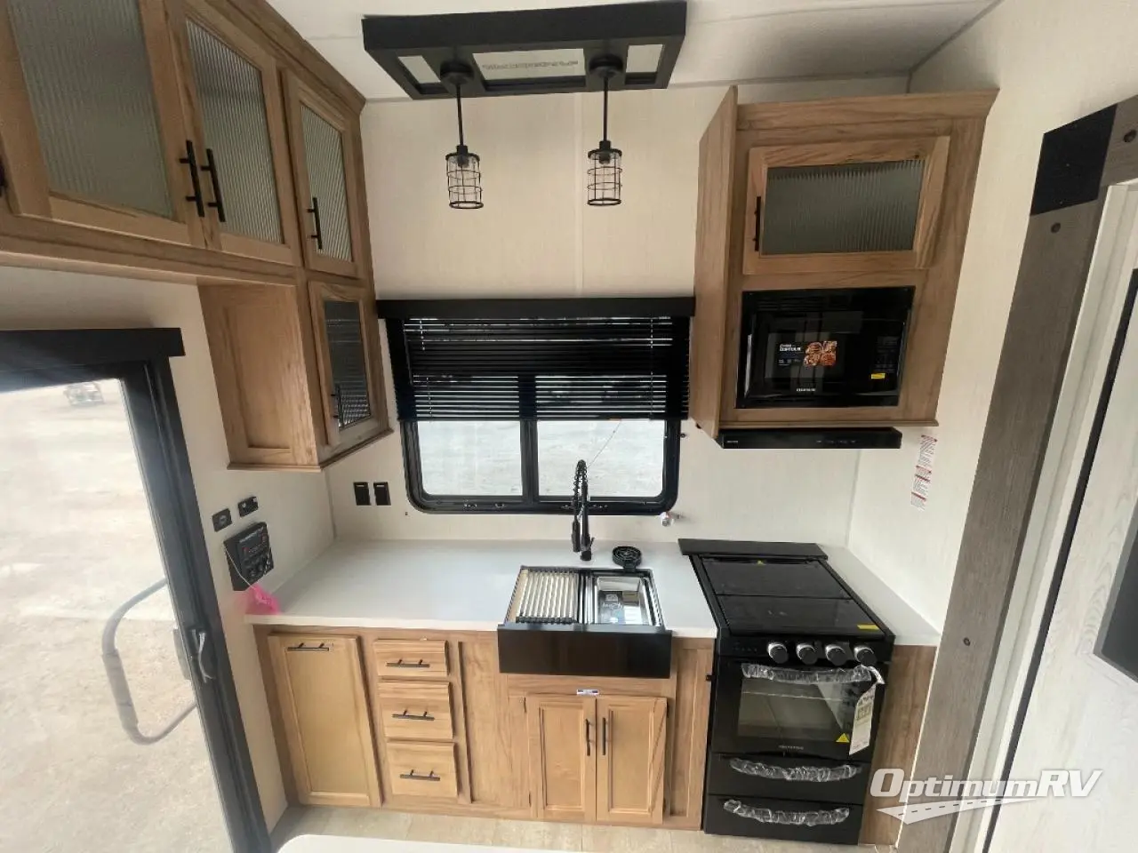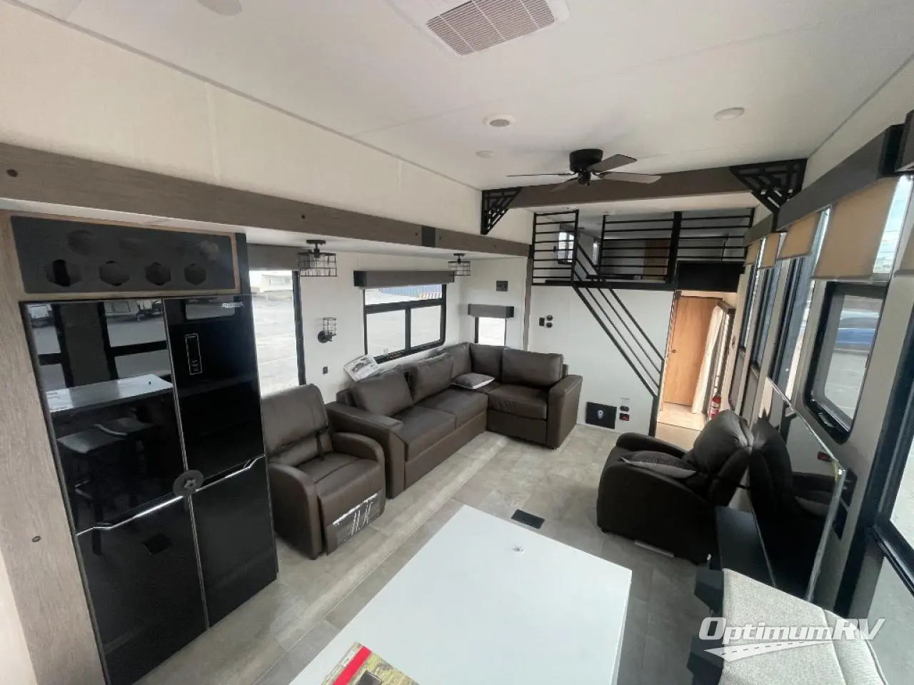 Time spent in this destination trailer will be time well spent! You will appreciate dual entry doors for maximum convenience, plus a spacious full bath that is close by the front private bedroom! Your crew can relax in the middle living area on the L-shaped sofa or on one of the dual lounge chairs. The rear kitchen will be any chef's dream with its island with three stools and all the appliances to create meals each day. This model also features triple slides so you can enjoy more space to relax!