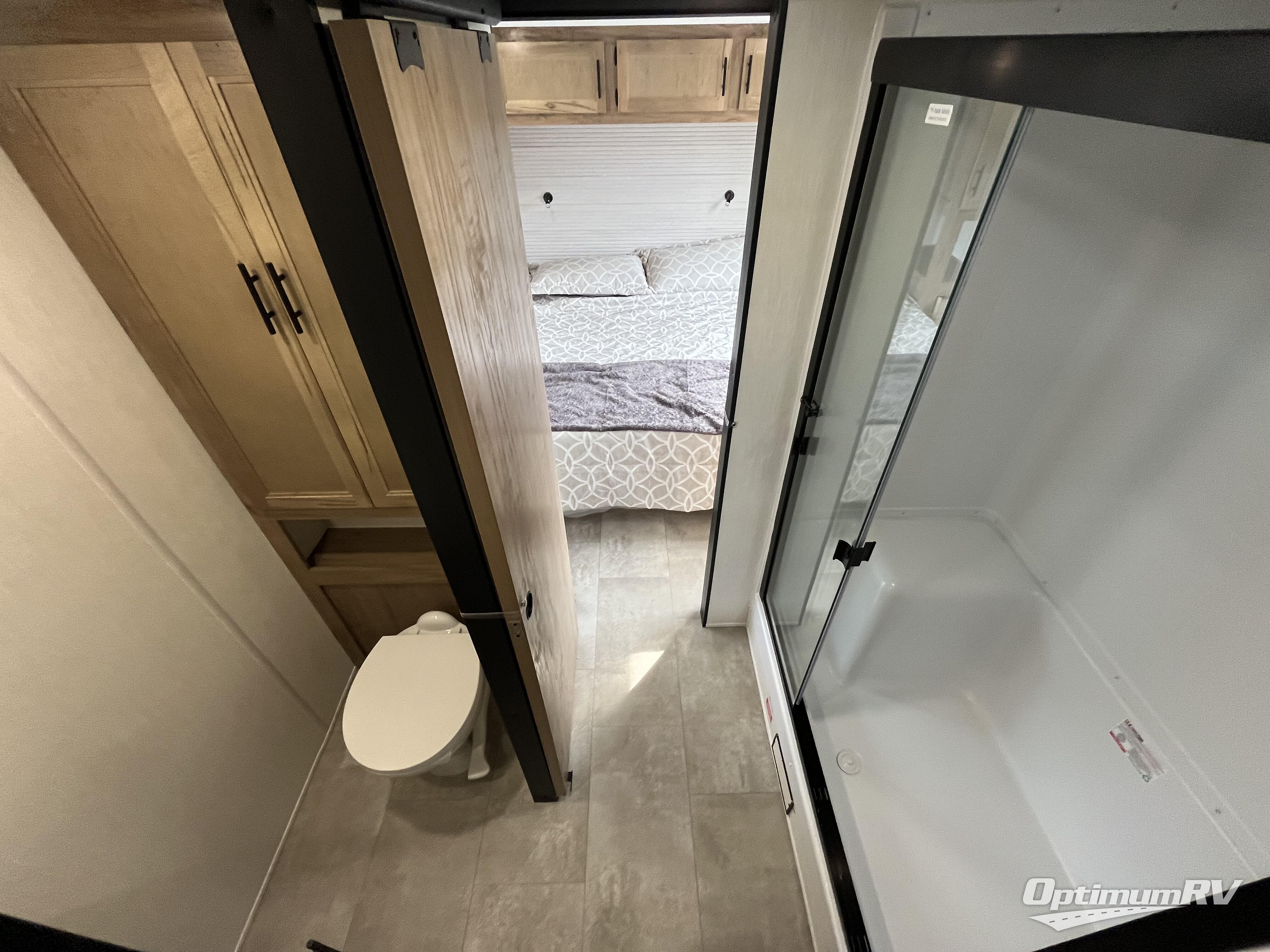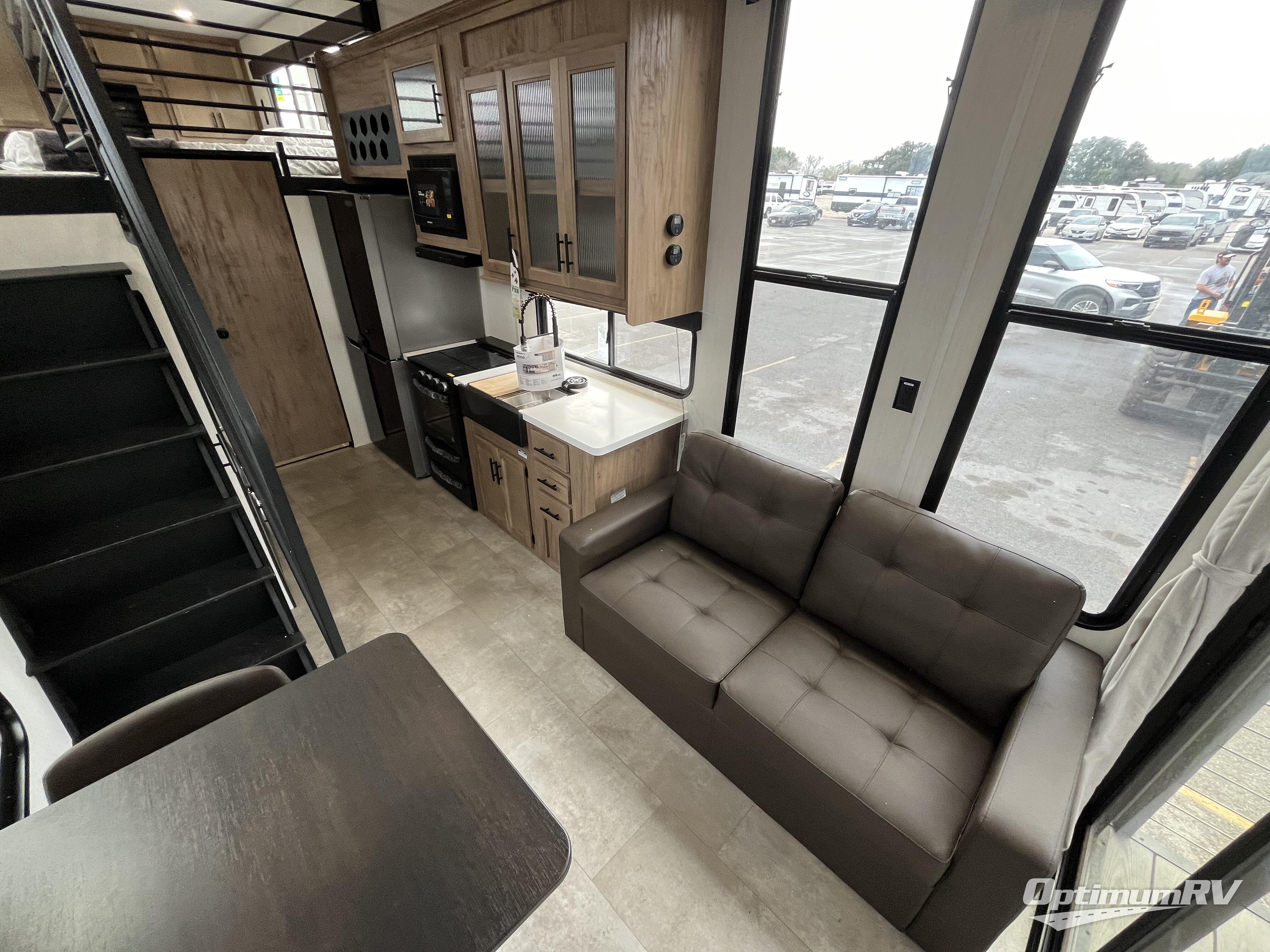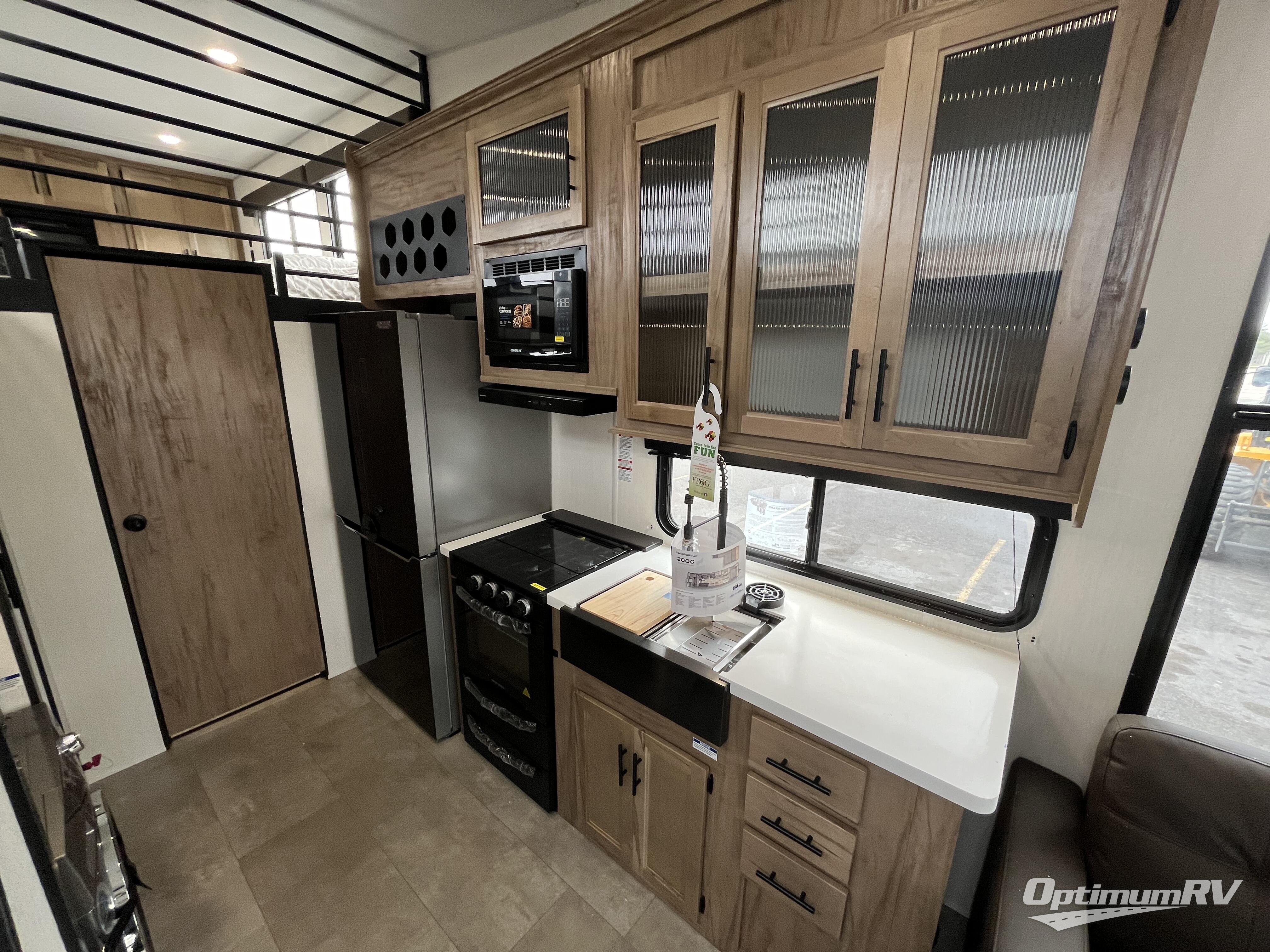 This model is similar to 16ML but larger! A bigger bathroom, king bed in the lower master, and a queen bed plus a twin bunk mat in the front loft. There is an 18 cu. ft. refrigerator so you can stock up for a week long vacation, a hide-a-bed sofa that can transform into added sleeping for guests, and a high top table with two stools to dine at. A ladder allows access into the upper front loft that is over the covered patio. The bathroom below is split with a shower on one side, and a private toilet area and sink opposite. And the view is amazing from just about anywhere inside.