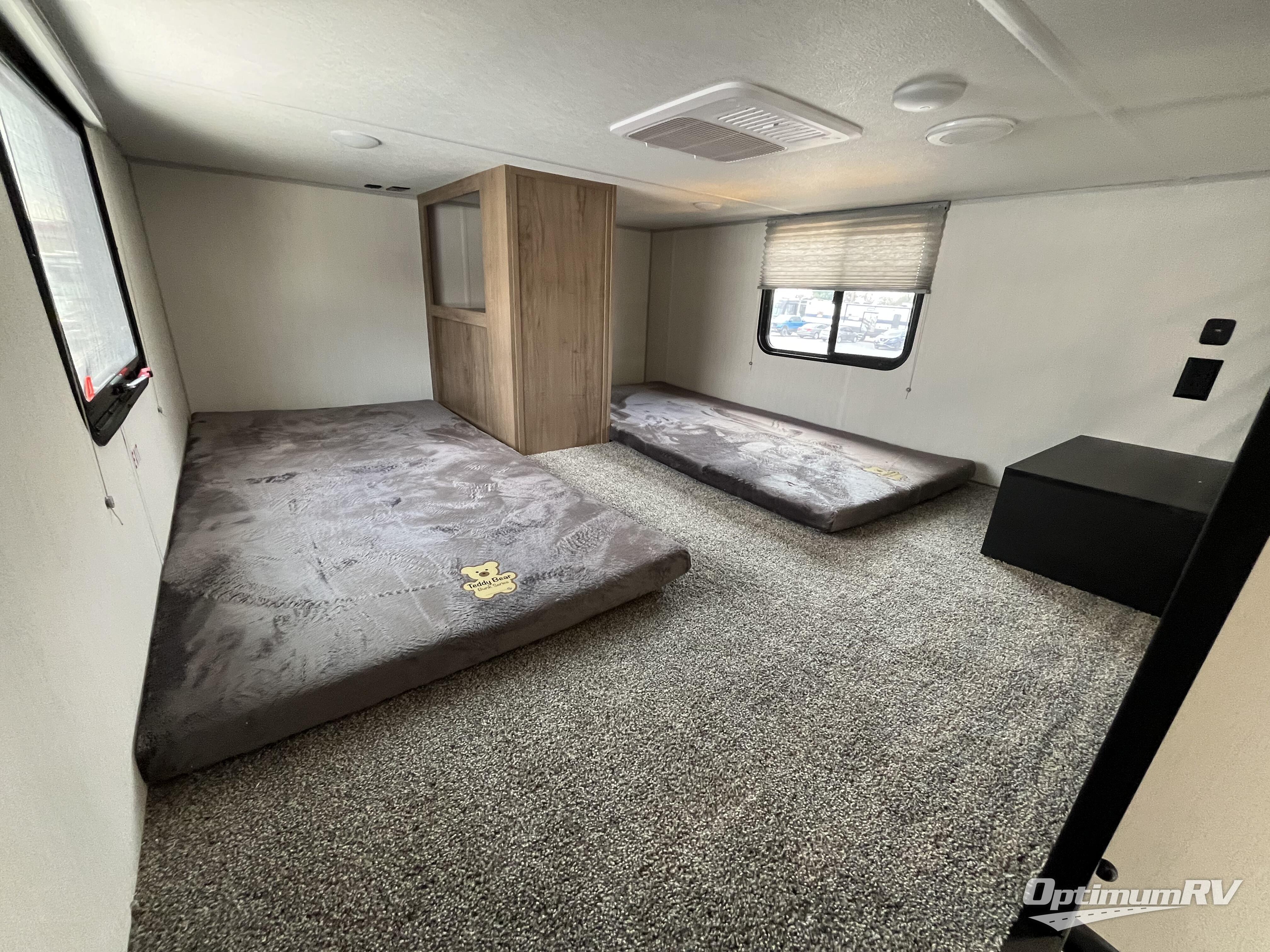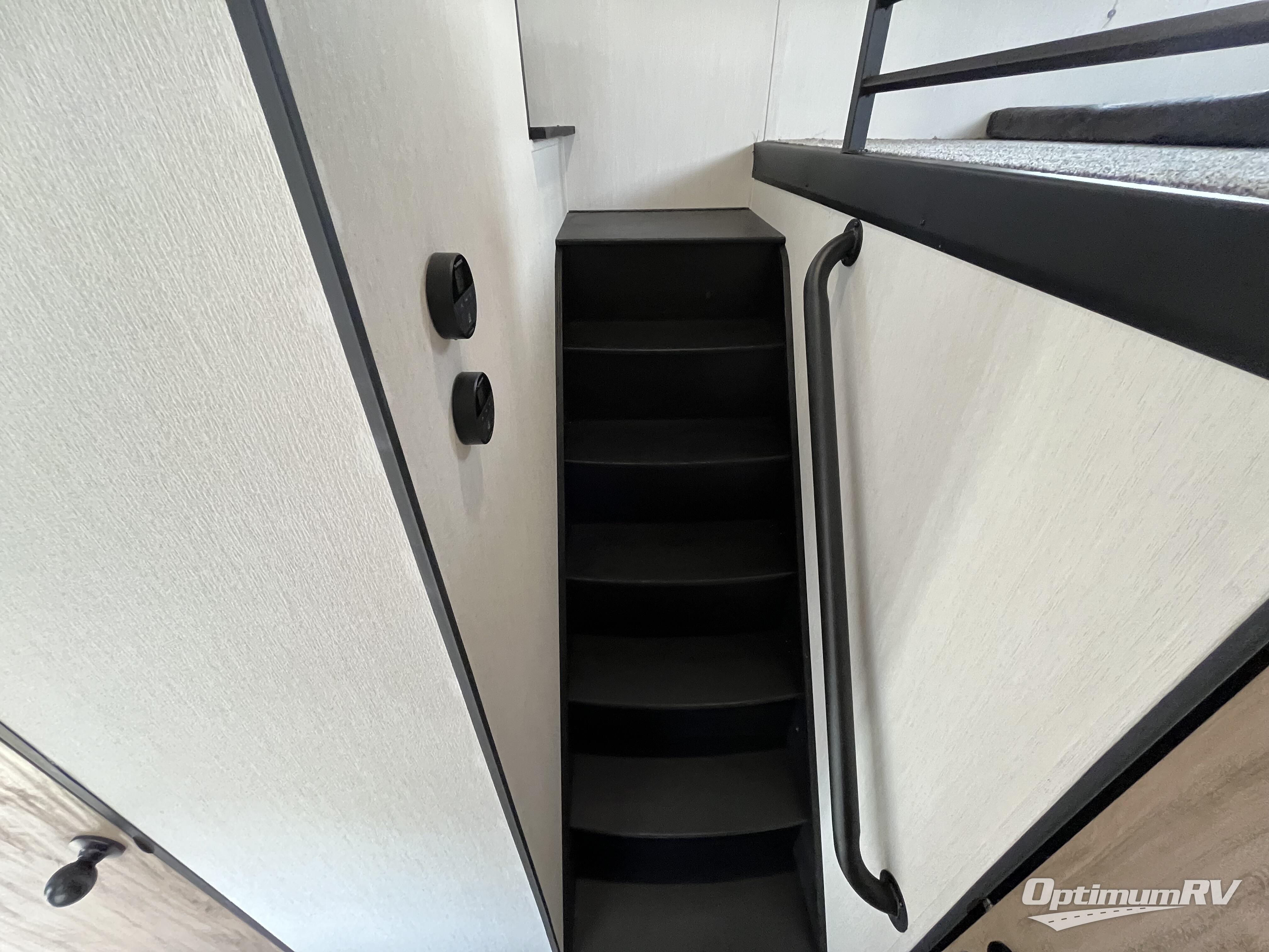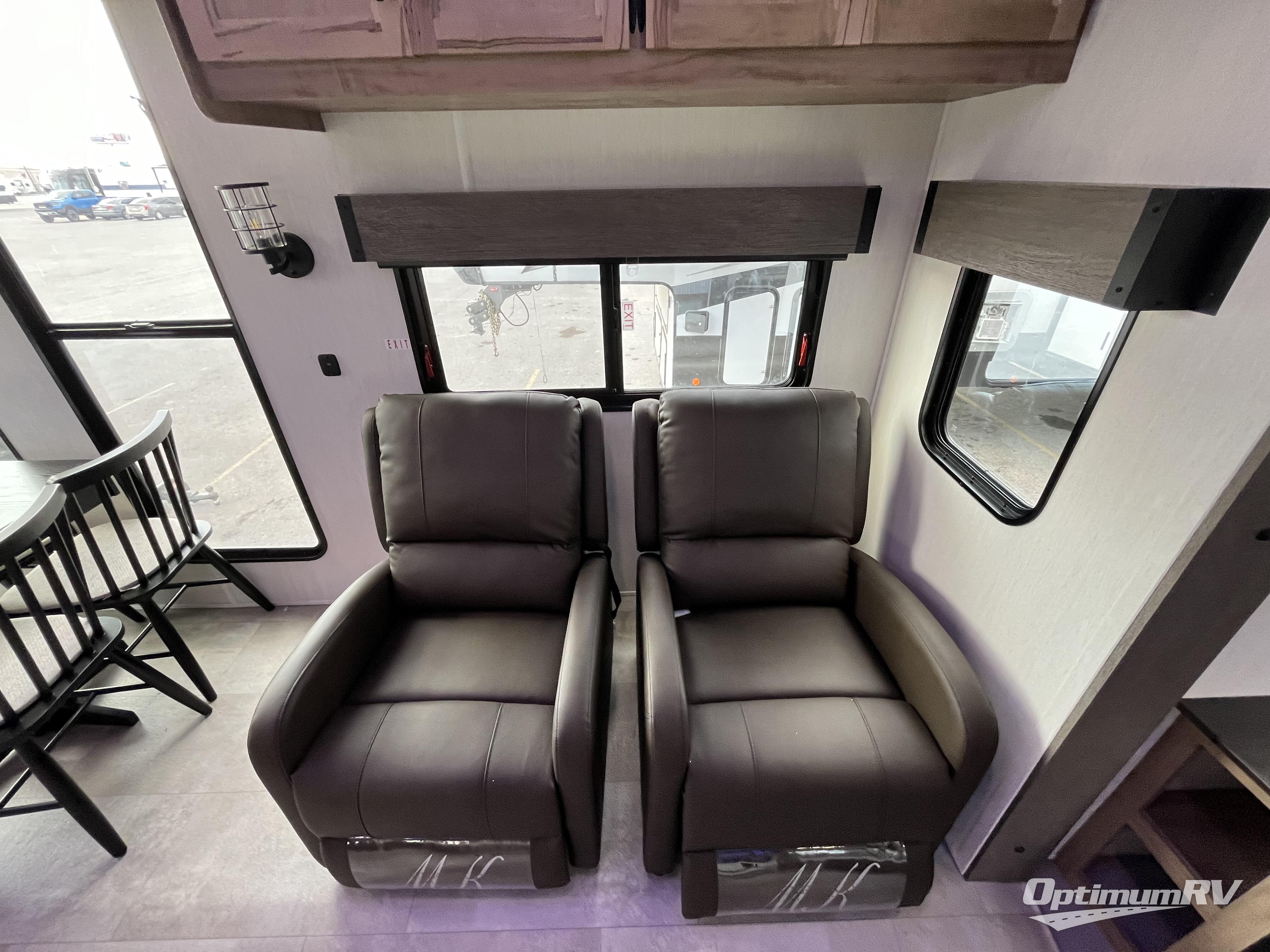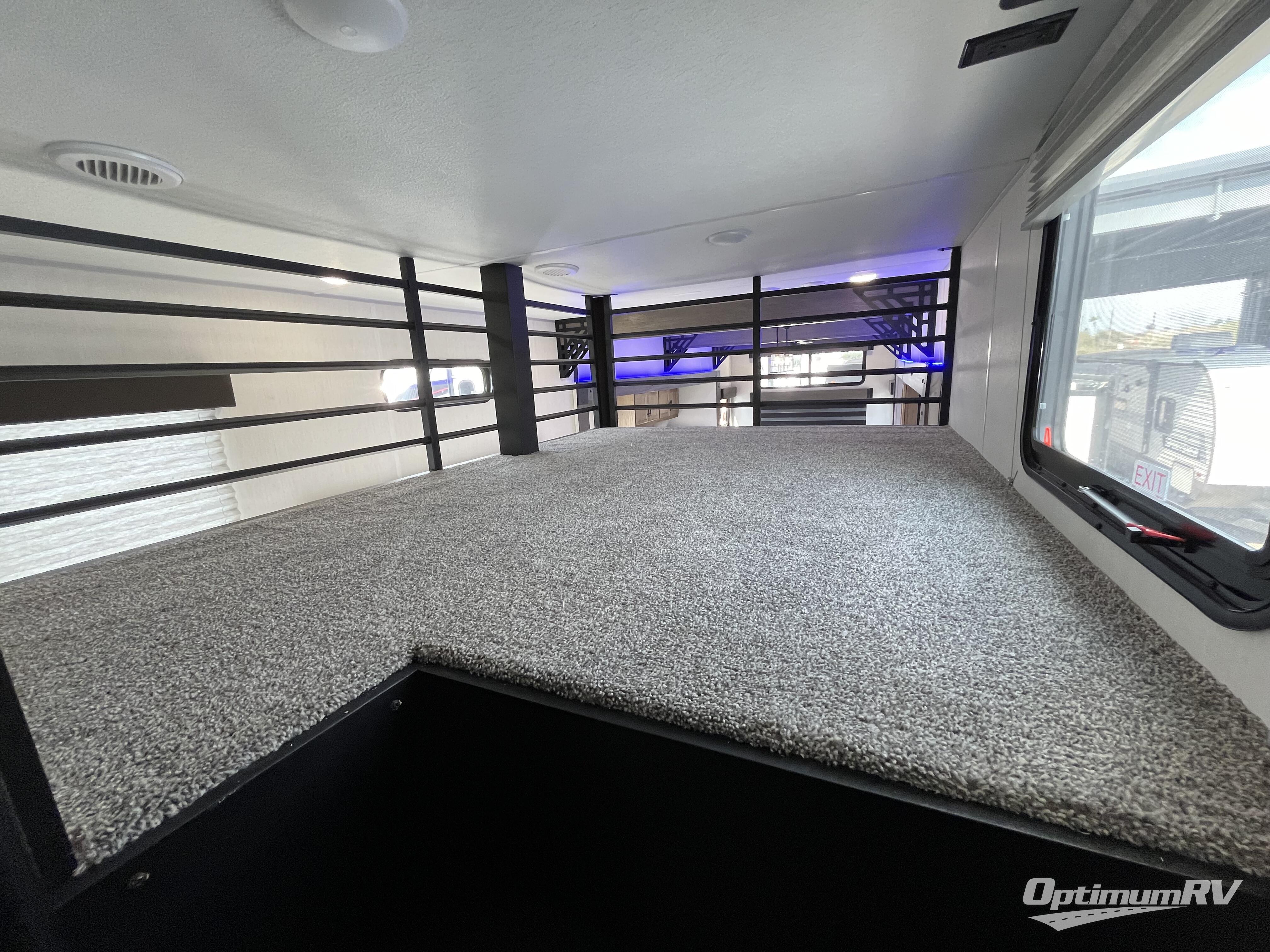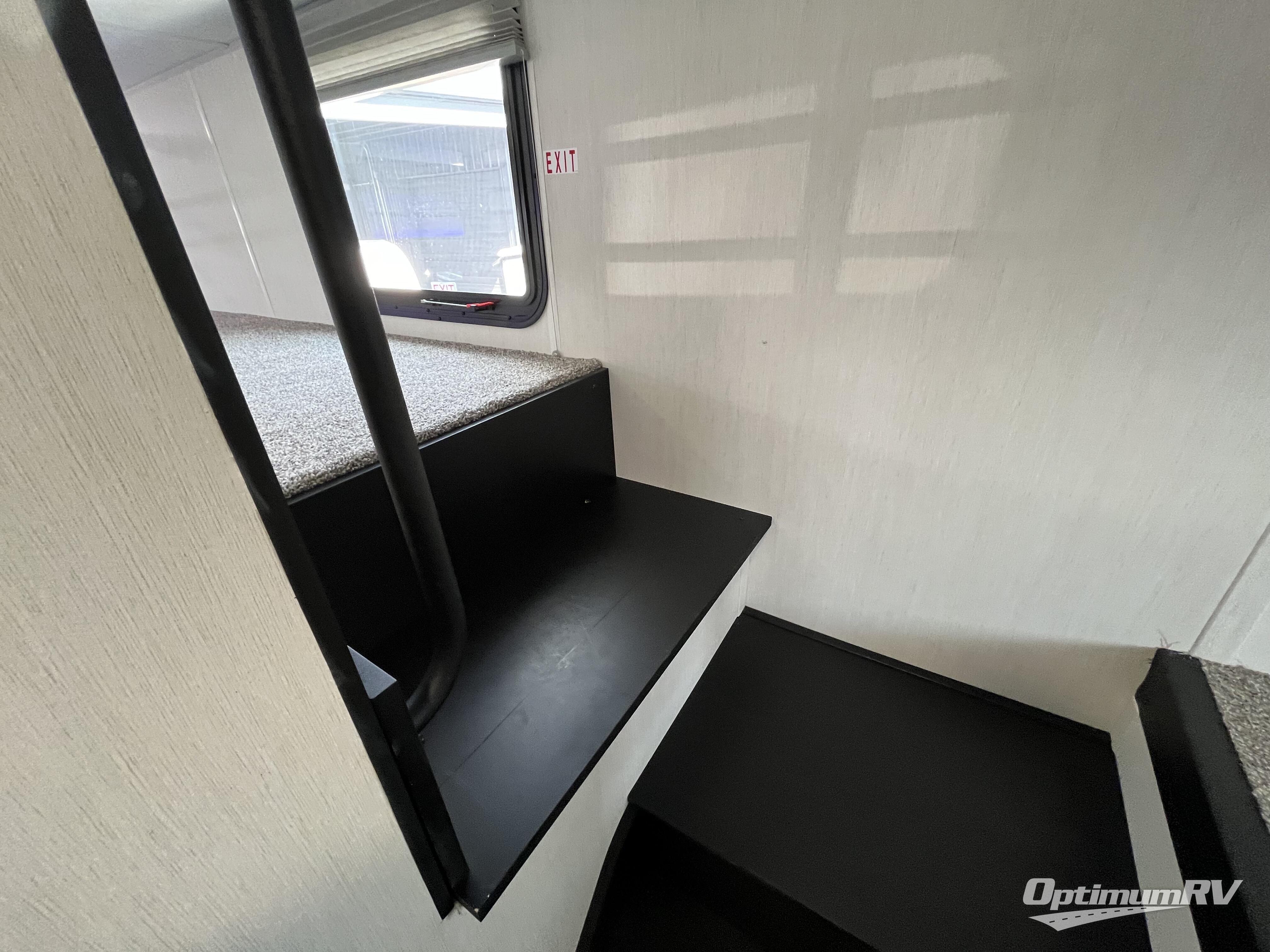 This destination trailer is an excellent and accommodating trailer that will make you feel right at home as soon as you enter through one of the two entry doors. The front private bedroom has a king bed slide and lots of storage with a wardrobe and a linen closet. There is also an entertainment center where you can add your own TV and the bedroom even has a second exterior entry door so that you can come and go as you please. Above the bedroom is where the huge loft is located. When you take the stairs up to the loft, you'll find two 36" x 74" bunk mats, cabinets, and a large open area with a railing. The main living area has a free-standing dinette with chairs, theater seats, and a hide-a-bed sofa, so you will have plenty of seating as you watch the main entertainment center.
