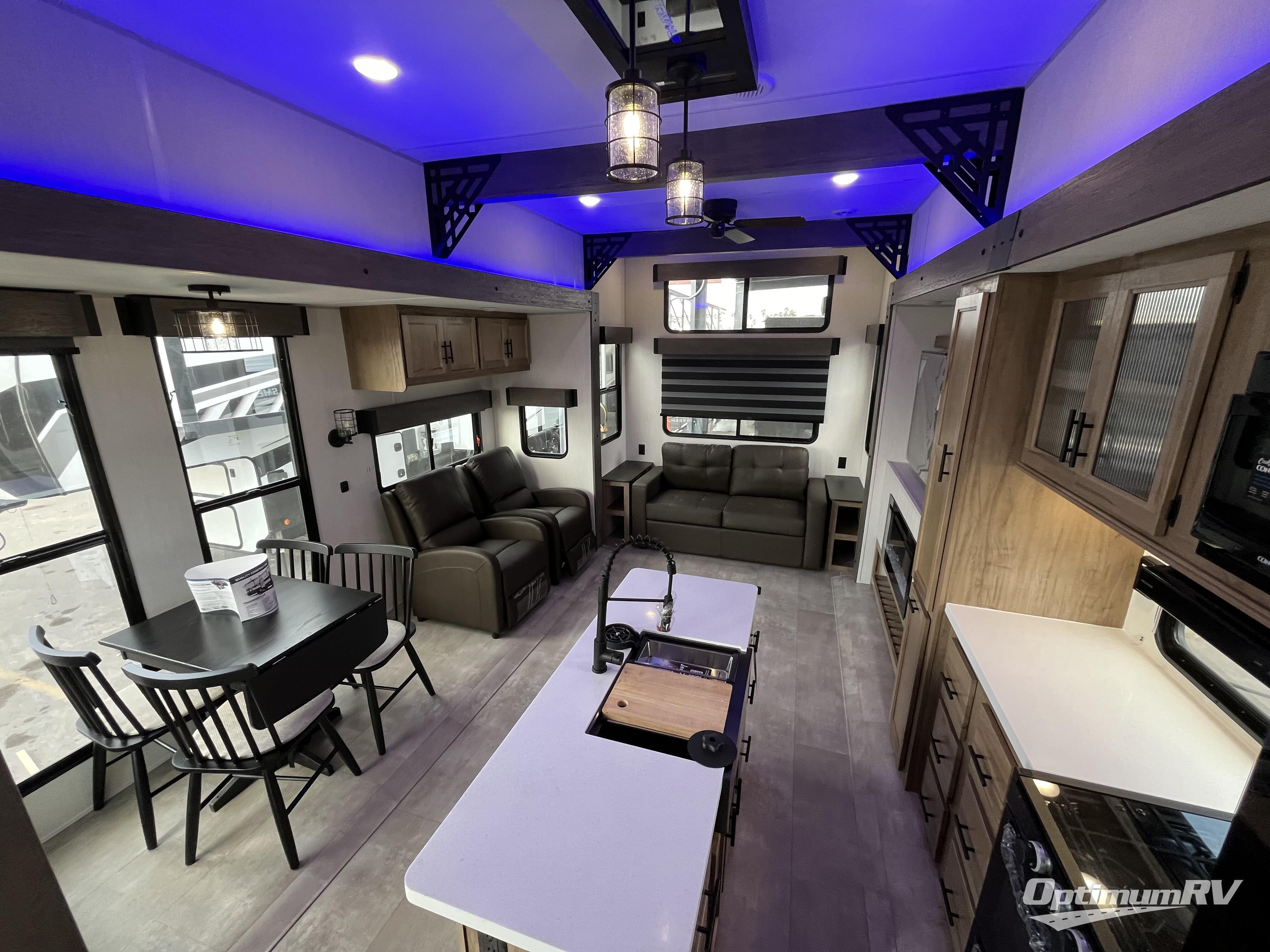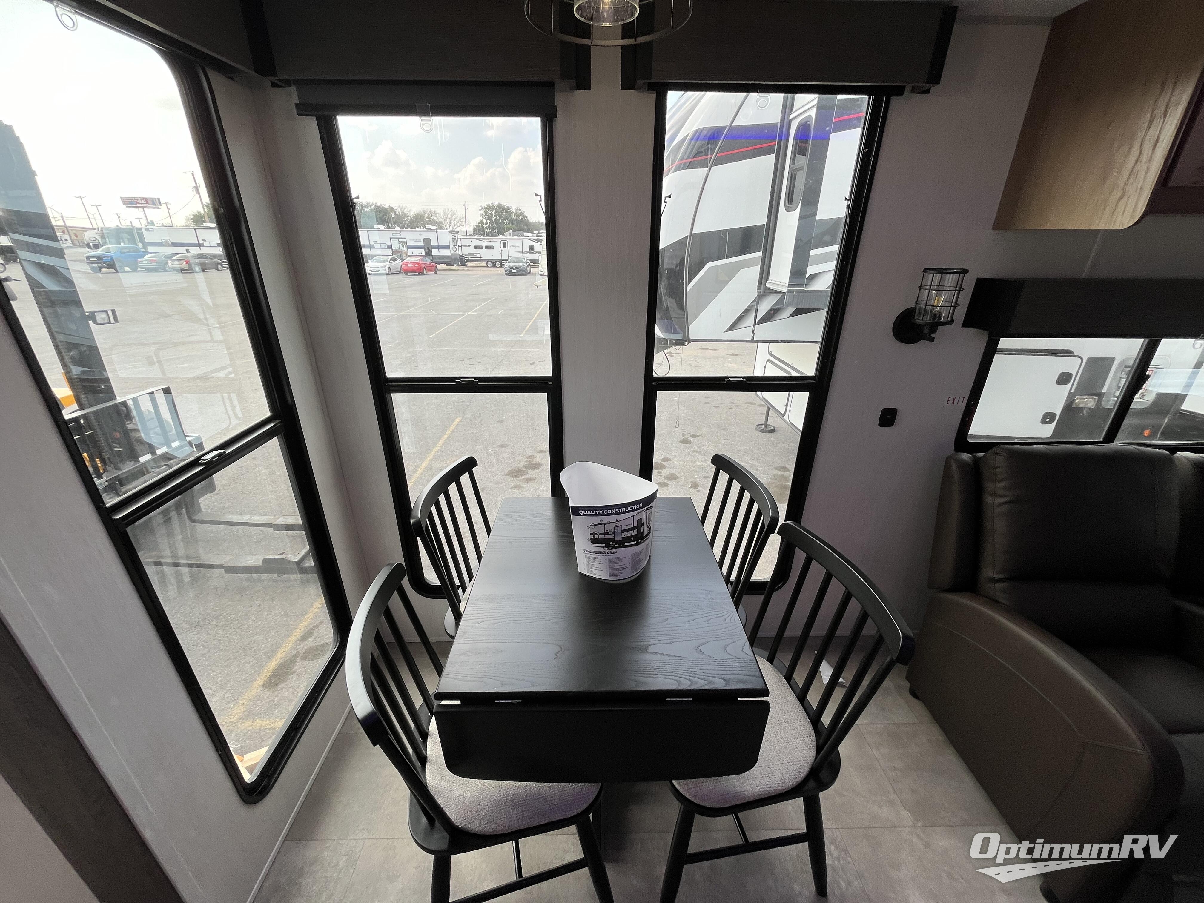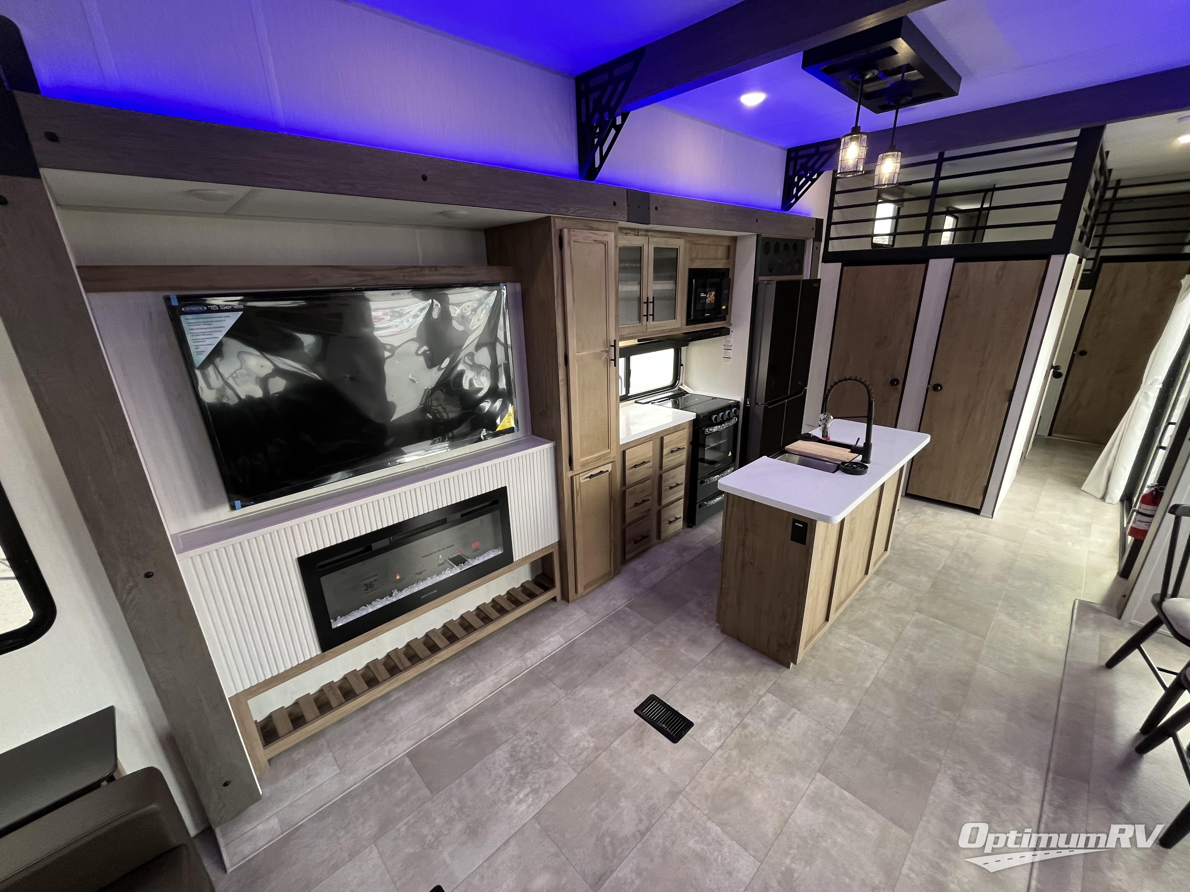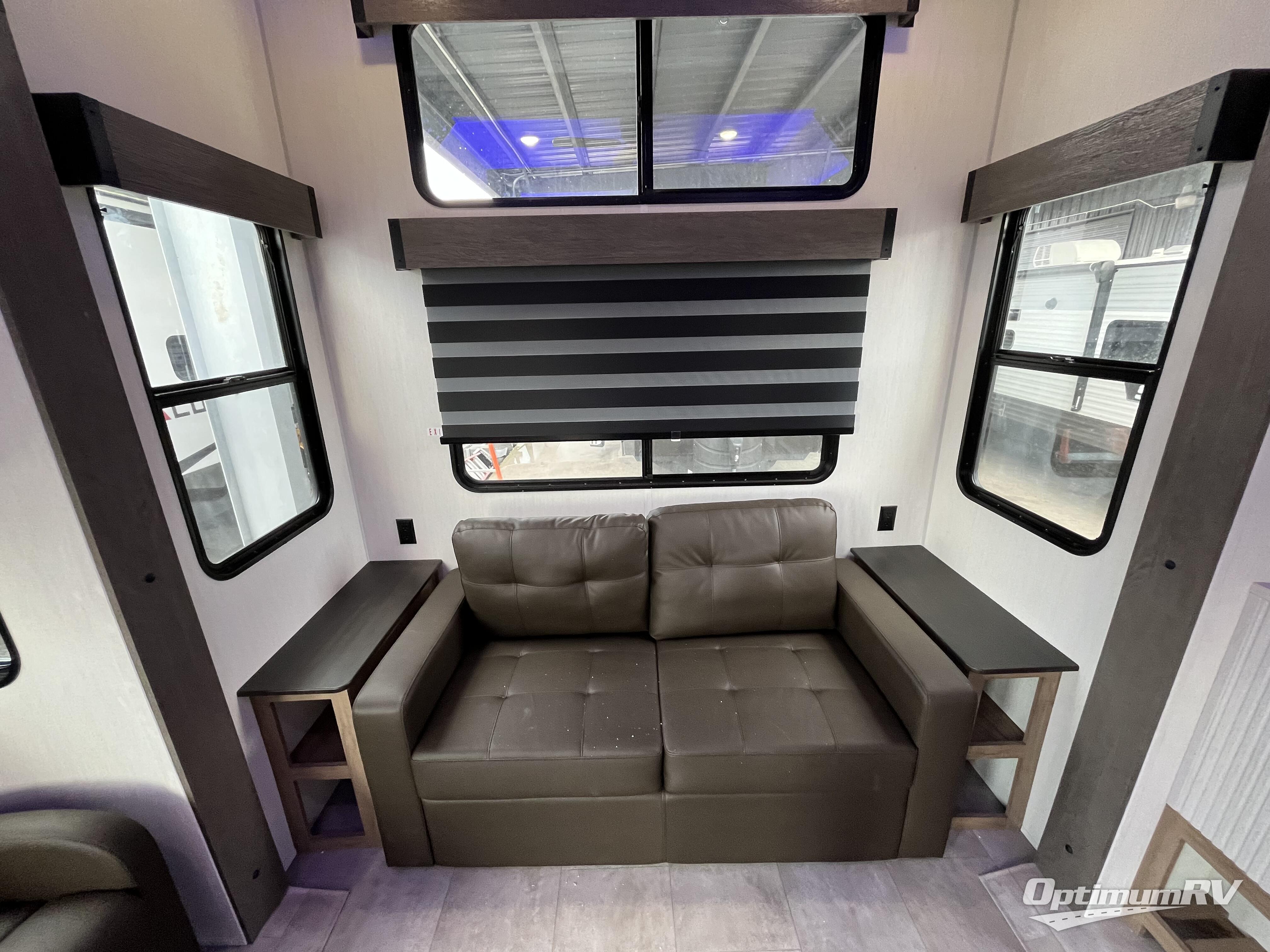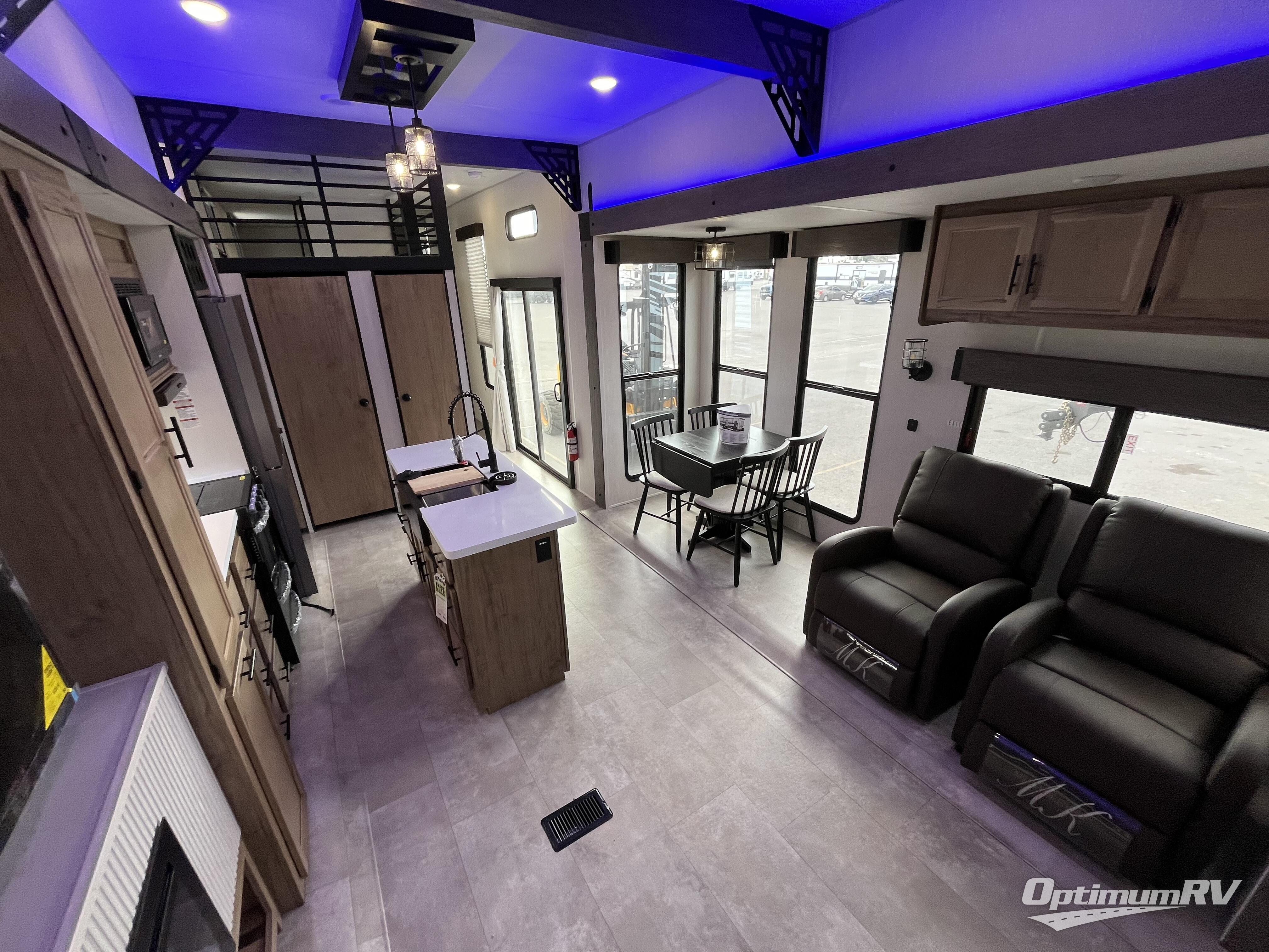This destination trailer is an excellent and accommodating trailer that will make you feel right at home as soon as you enter through one of the two entry doors. The front private bedroom has a king bed slide and lots of storage with a wardrobe and a linen closet. There is also an entertainment center where you can add your own TV and the bedroom even has a second exterior entry door so that you can come and go as you please. Above the bedroom is where the huge loft is located. When you take the stairs up to the loft, you'll find two 36" x 74" bunk mats, cabinets, and a large open area with a railing. The main living area has a free-standing dinette with chairs, theater seats, and a hide-a-bed sofa, so you will have plenty of seating as you watch the main entertainment center.
