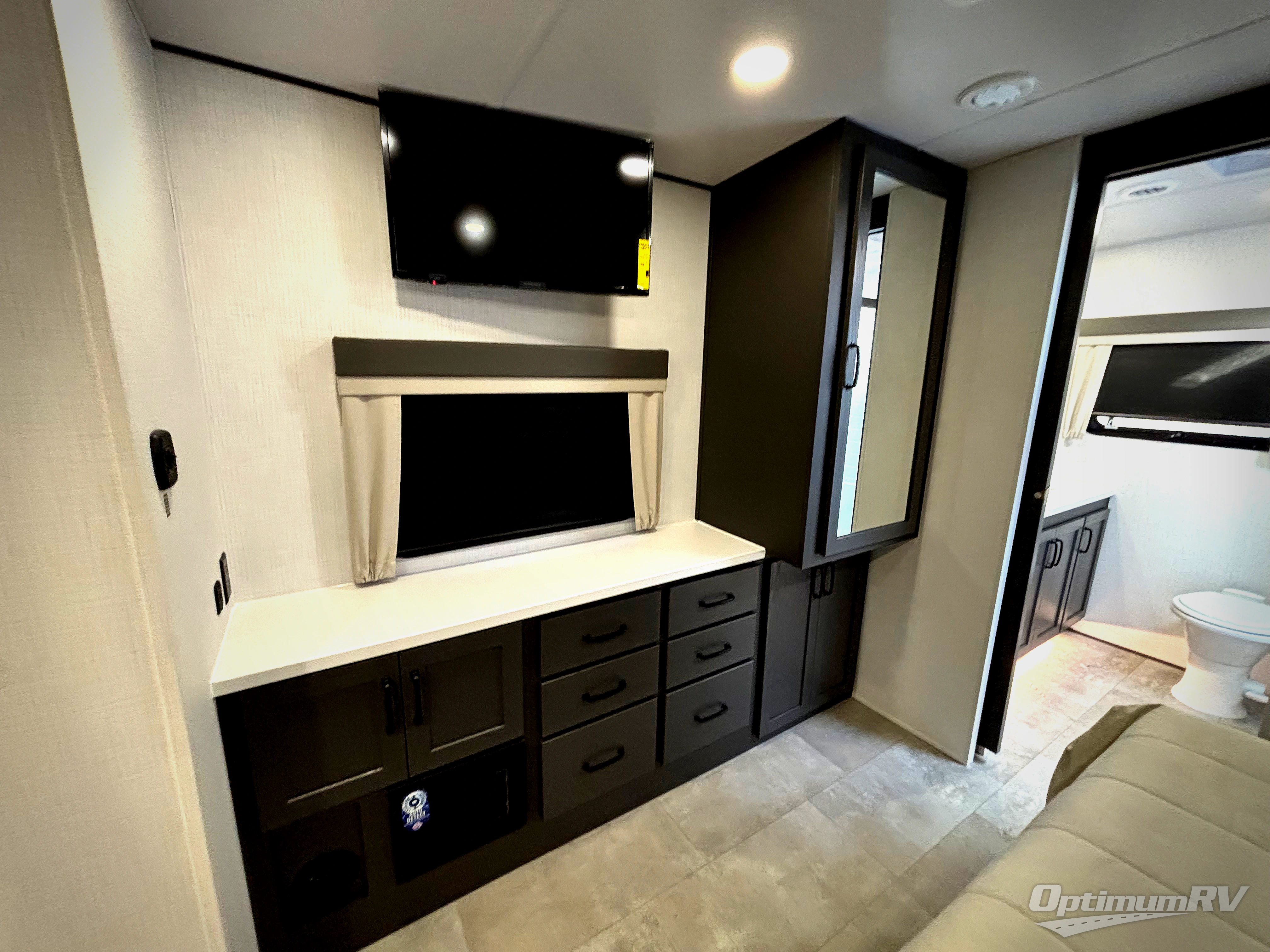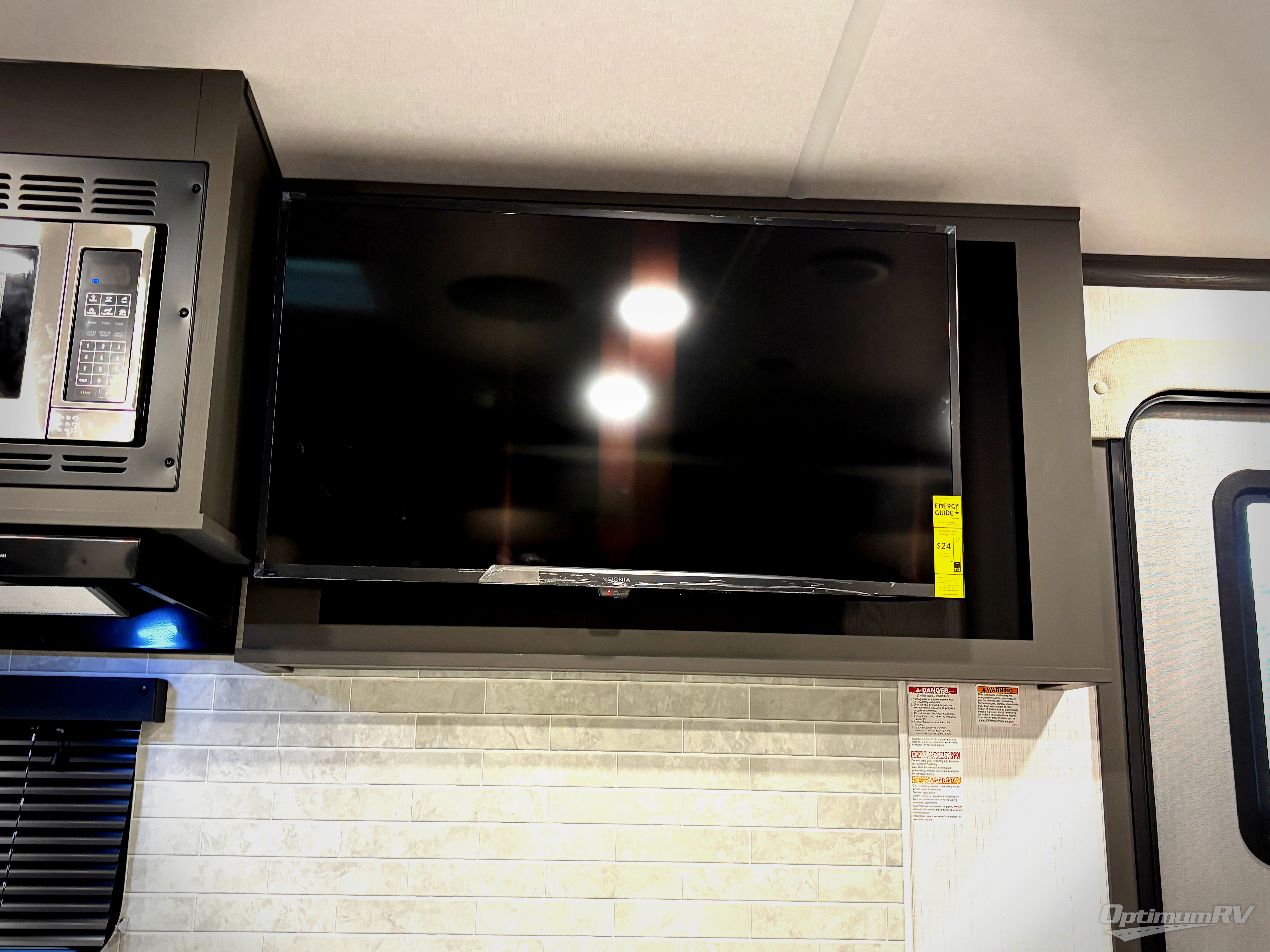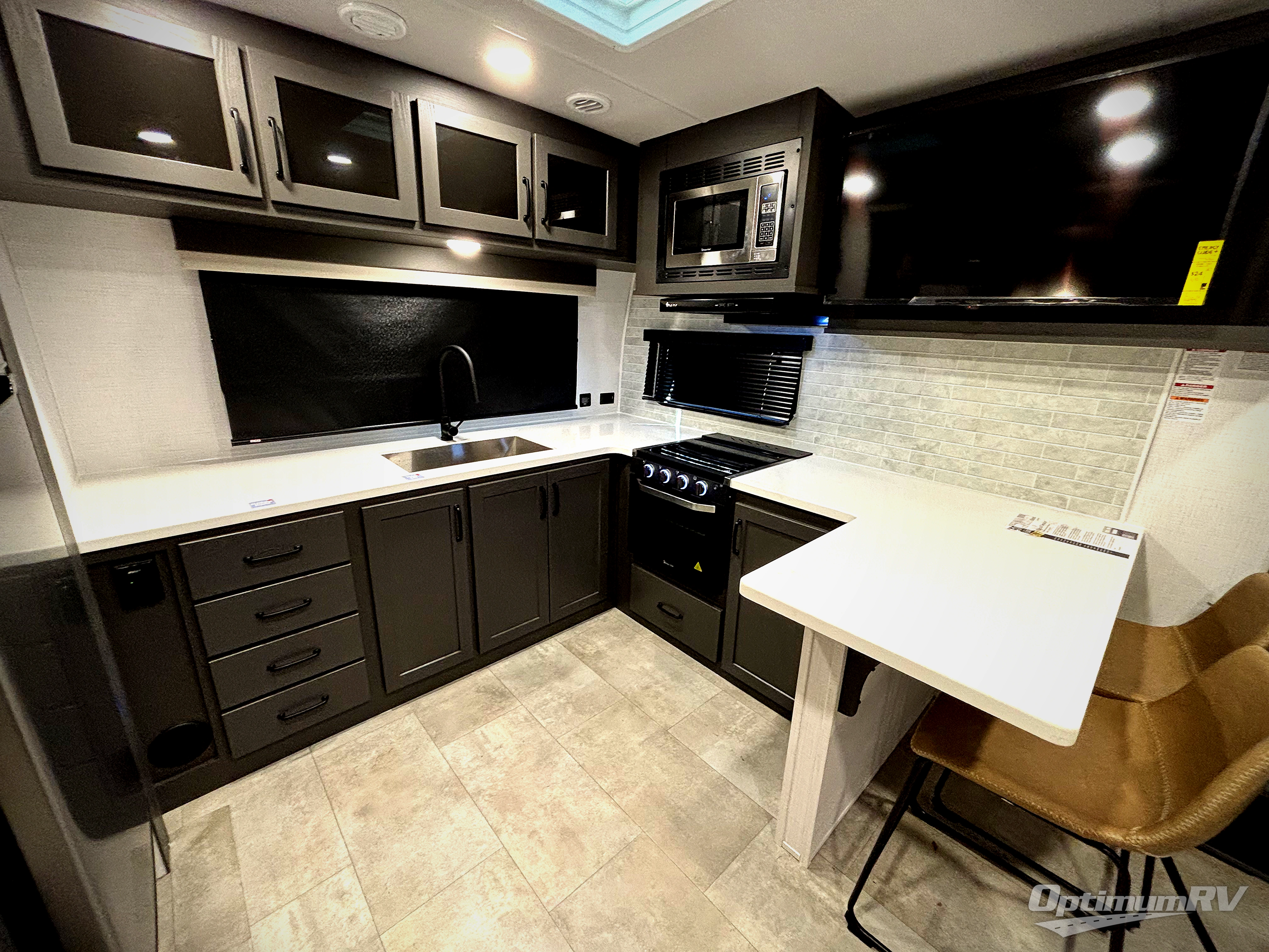 You will love how open this travel trailer will feel with the large front window that you can look out from the two-person bar top seating! The front kitchen has plenty of countertop space for you to prepare your best meals. Your nights will be spent in true relaxation with a 67" theater seating and king bed slide in the bedroom for a great night's rest. The full rear bathroom has a shower with a seat to take a nice, hot shower before bed, and a dual-sink vanity for two to get ready at once in the mornings!