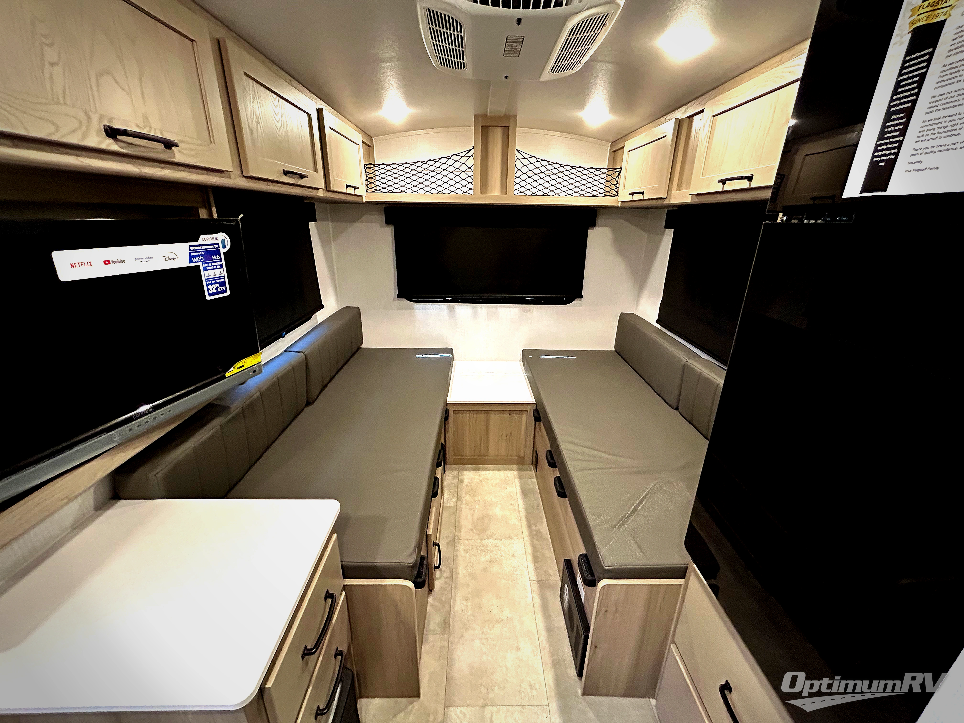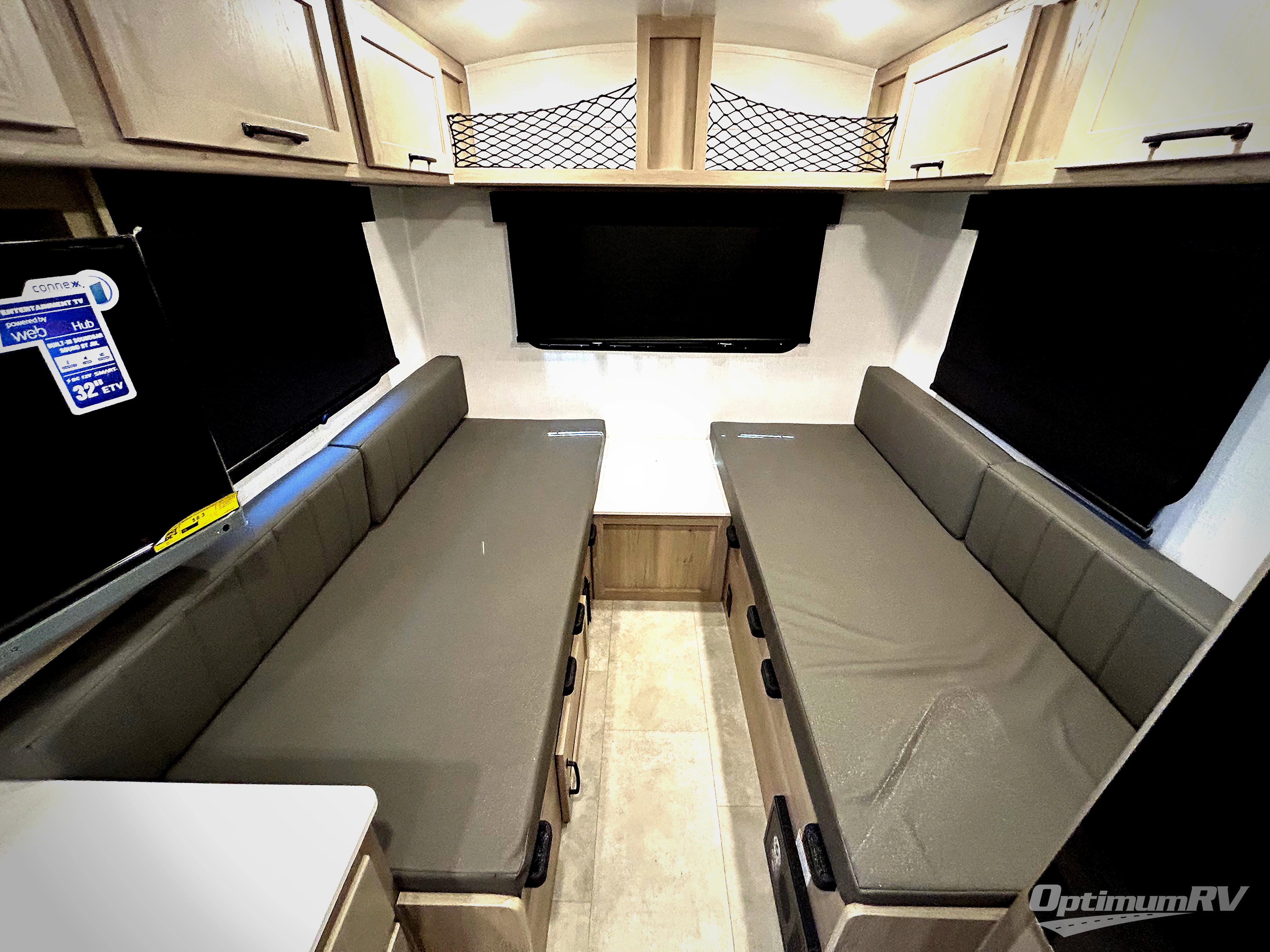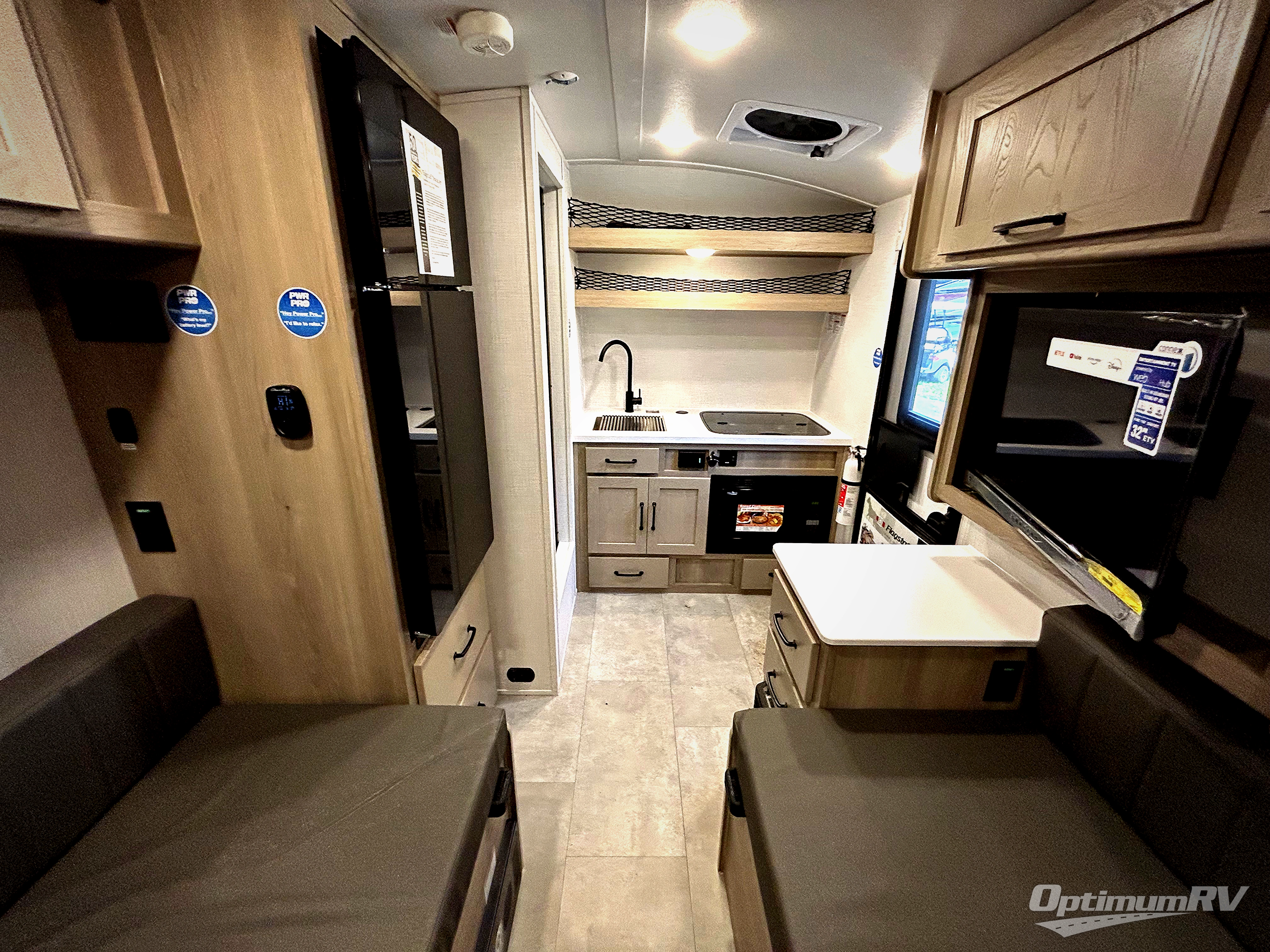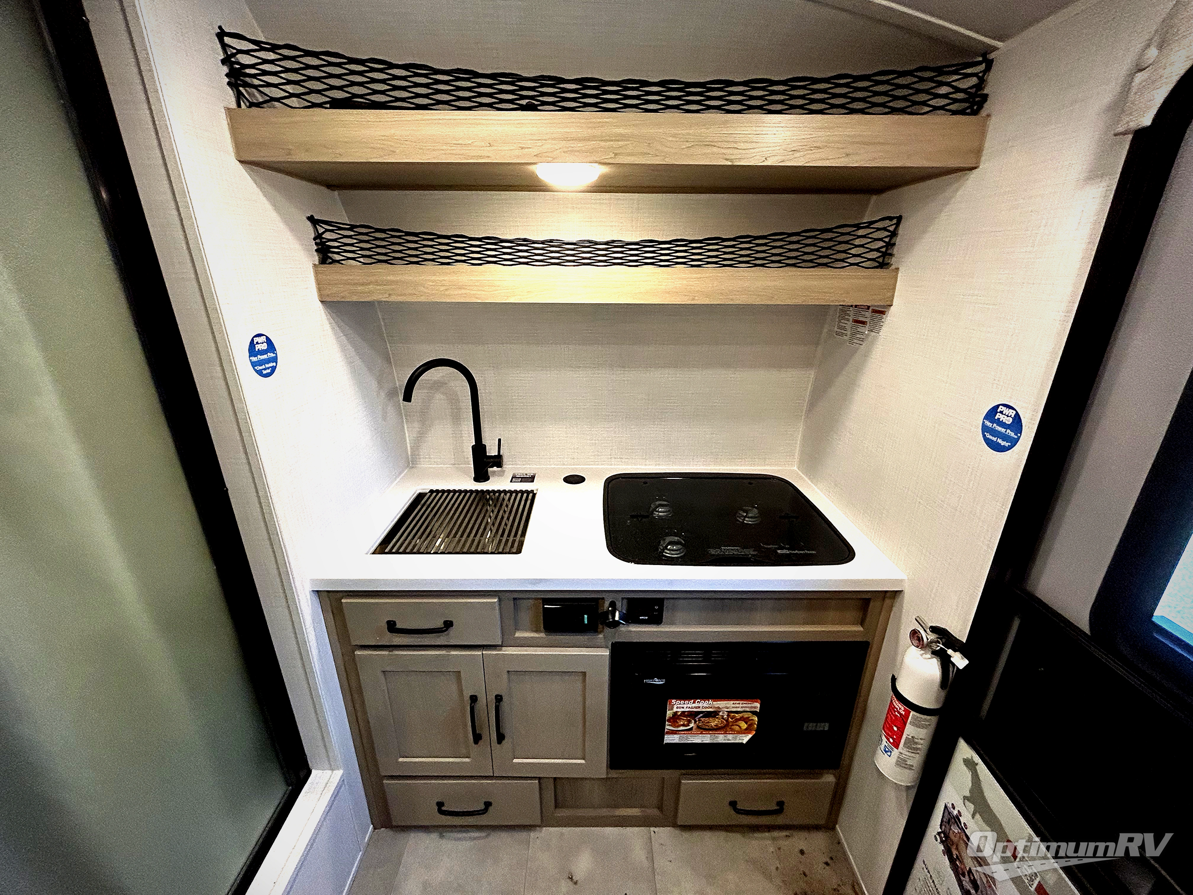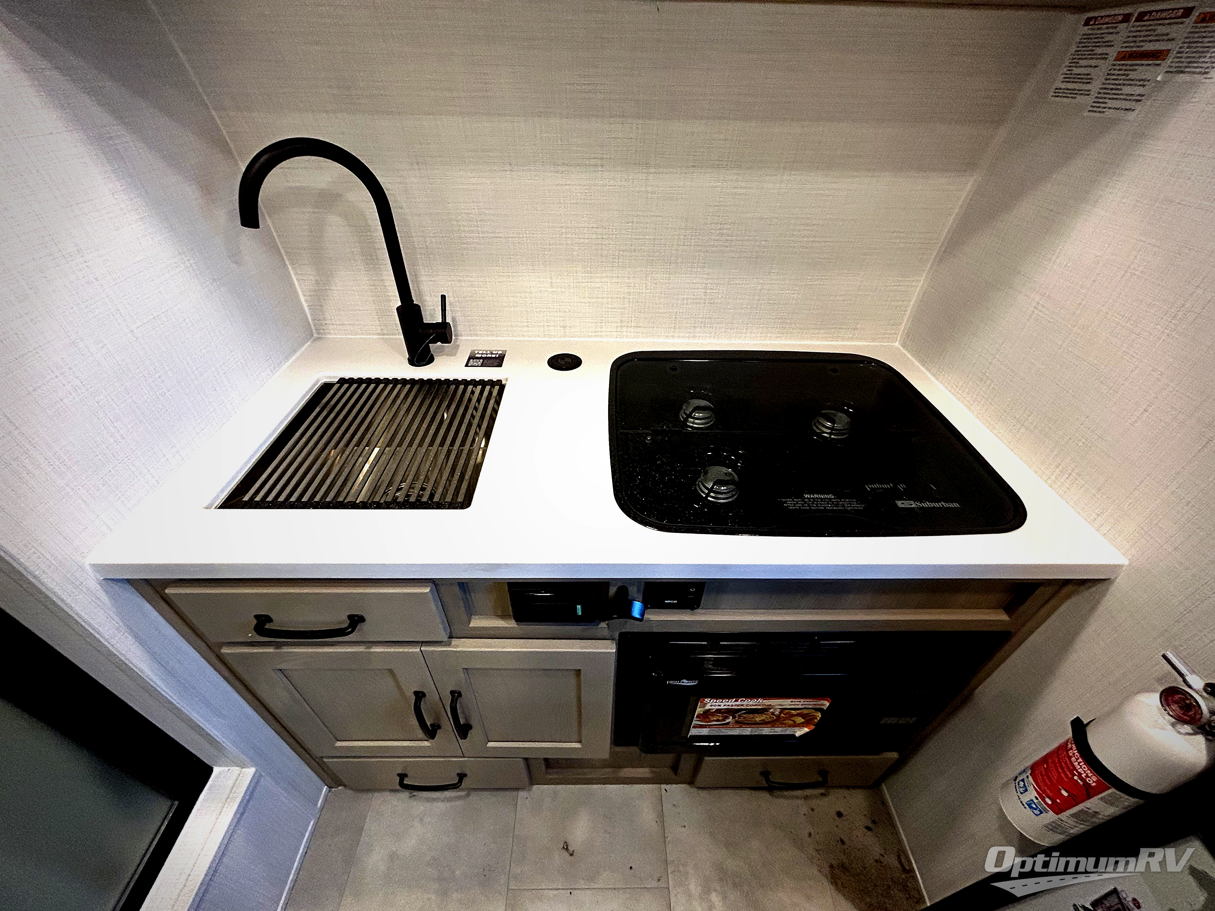 It's time to hit the road in this small, yet walkable travel trailer that is versatile to your needs and offers everything you will want to stay comfortable at a campground or off-grid. You can make meals using the cooktop and microwave up front, and store your cold items in the 12V refrigerator. Take turns getting cleaned up in the wet bath so you can skip the public facilities, and store your clothing in the overhead cabinets. You can watch the 32" TV while dining or sleeping on the twin beds that offer a table top to help you convert this area into a king bed. And the 10' power awning will give you a place to hang out while you use the outdoor griddle.
