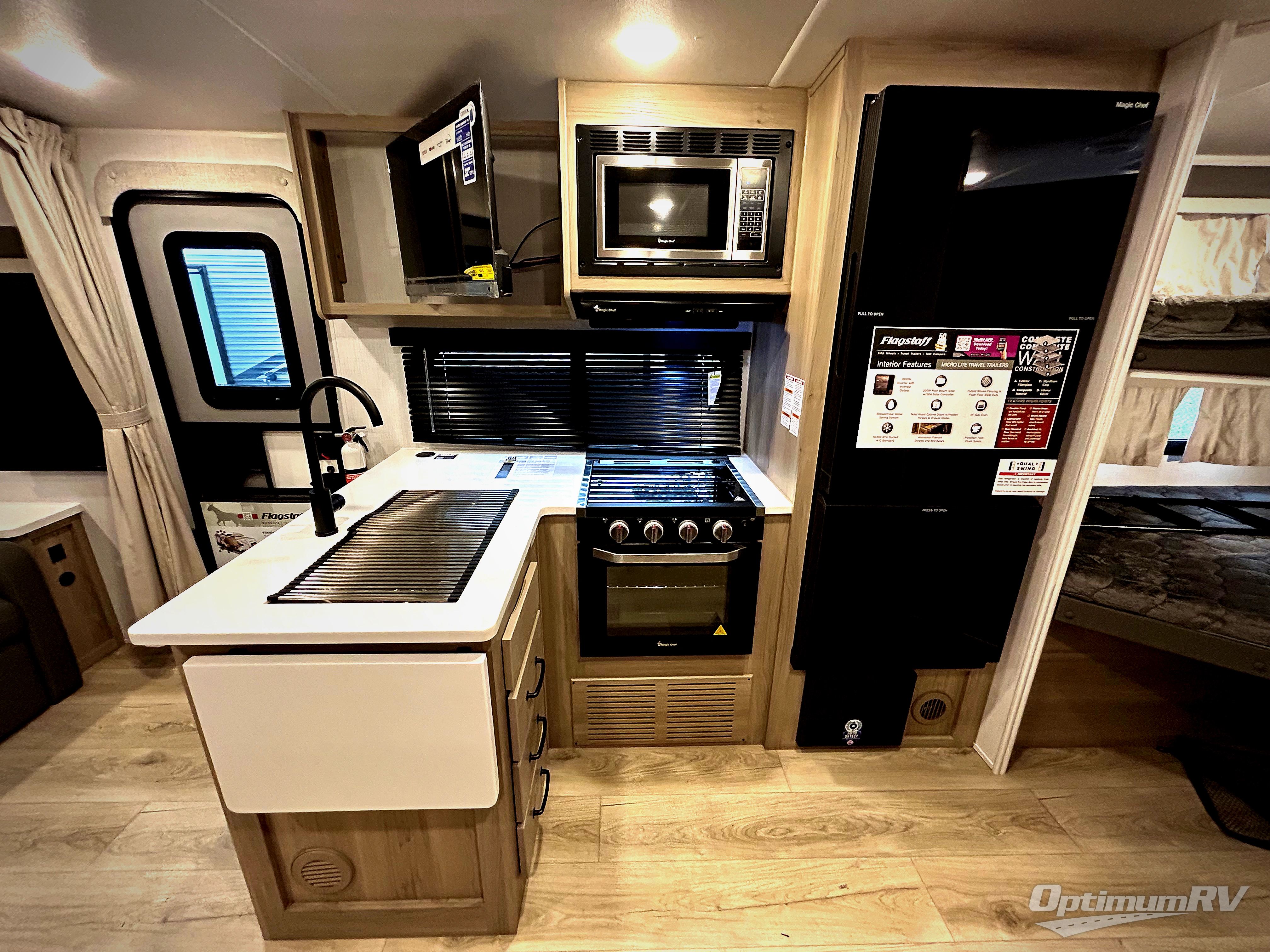 With any Flagstaff Micro Lite travel trailer by Forest River you will enjoy lightweight towing, durable construction, and added interior comforts to make each trip memorable! Each model features a torsion axle, Rubber-Ryde suspension, nitrogen filled, Goodyear Endurance tires, and easy lube axles with Nev-R-Adjust brakes for smooth towing from home to campground. The 6-sided aluminum framed construction provides a strong foundation so you can enjoy your RV for years to come, plus electronically controlled heated holding tanks and an enclosed underbelly will let you camp all year long. Head inside to find hybrid woven flooring in the slide outs, Sedona wood cabinetry, solid surface kitchen countertops, and many more amenities. These travel trailers also include exterior conveniences for hassle-free camping, like the power tongue jack, magnetic compartment door catches, Keyed Alike locks, and rear ladder to name a few!