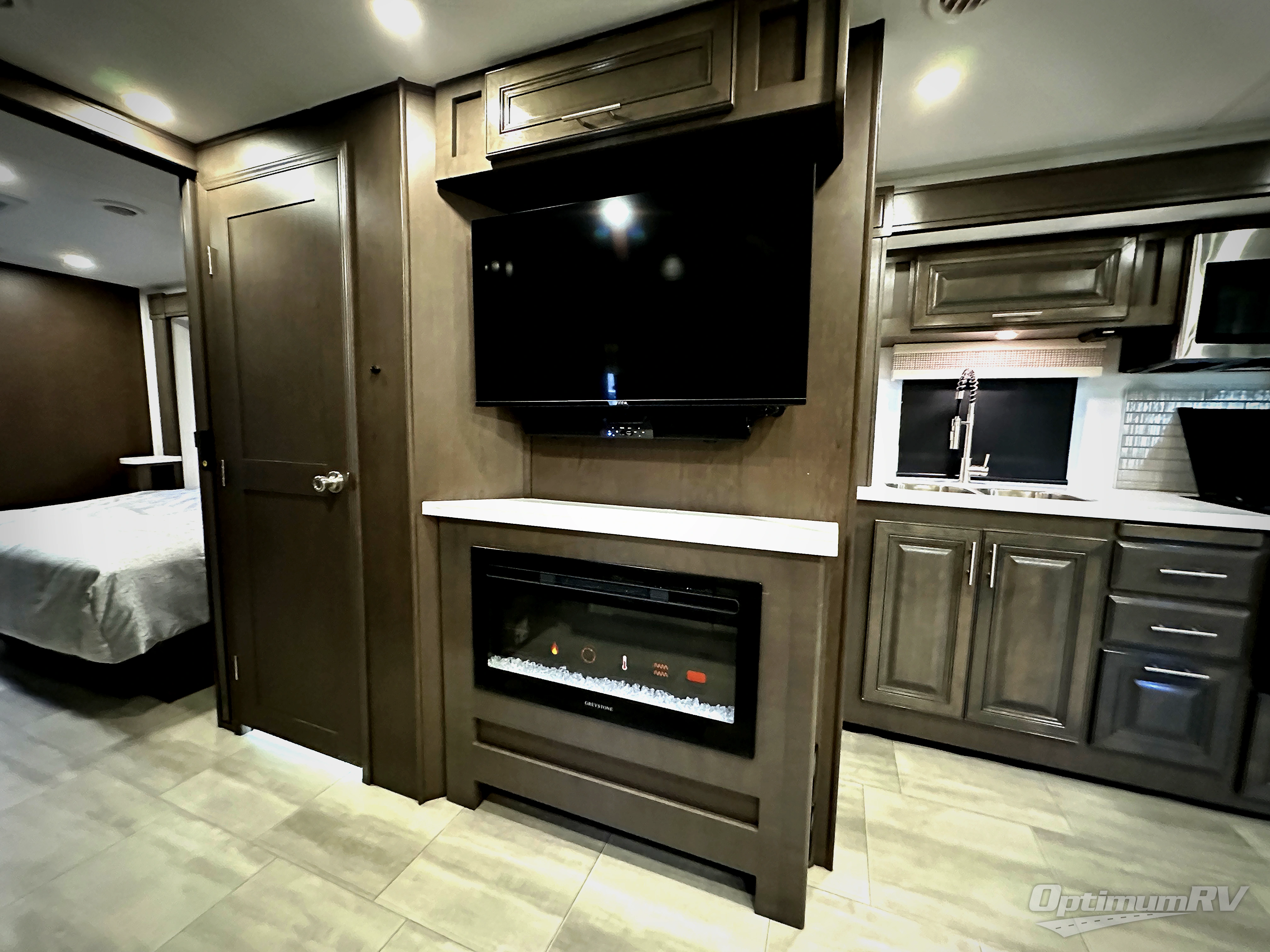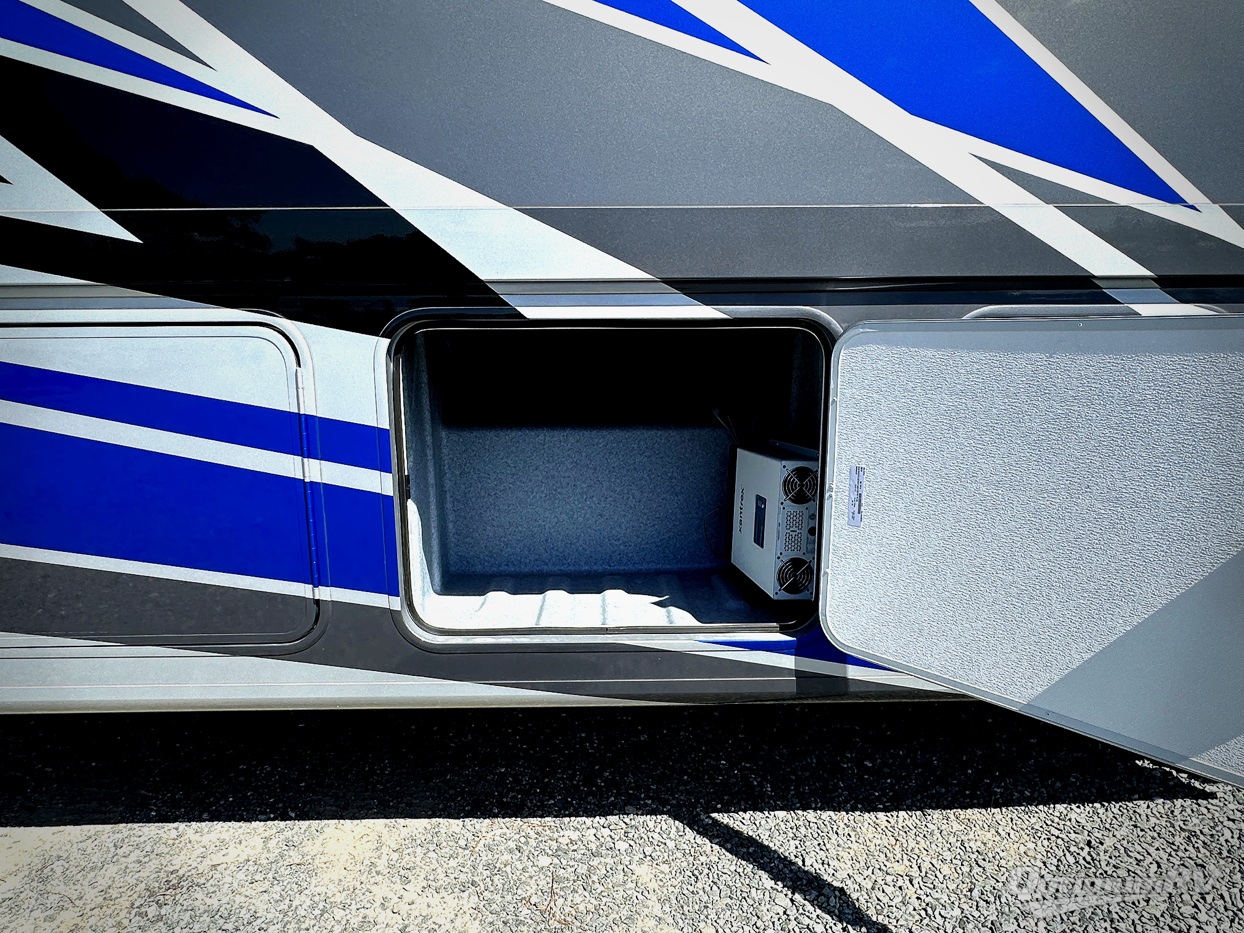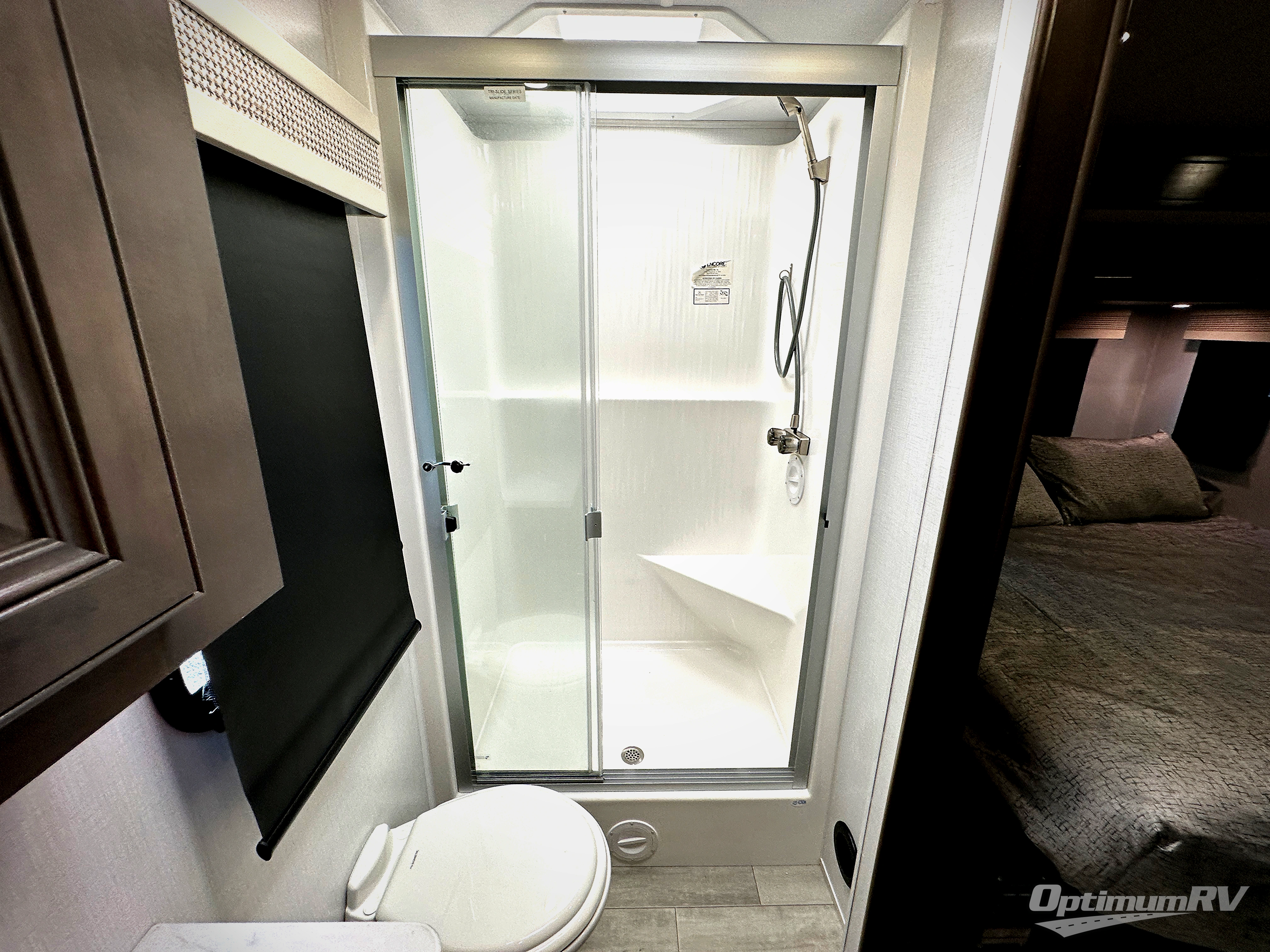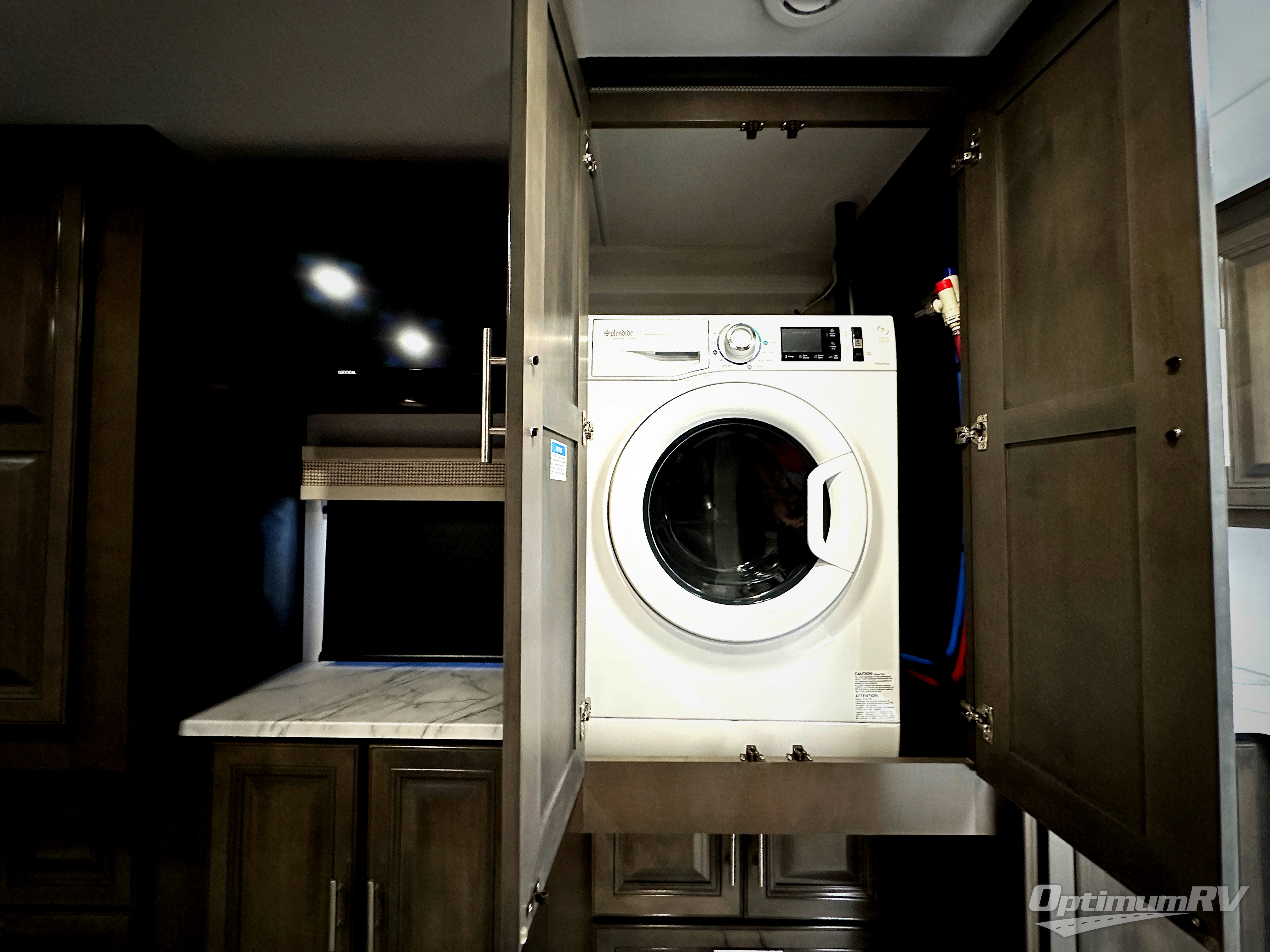 Three slides help to open up this motorhome! The kitchen slide features all of your essentials for cooking delicious meals and you even have a hutch with overhead cabinets to store all of your dishes. The Dream Dinette and Thomas Payne theater seating slide not only open up the living area, but also provide comfortable places to eat meals and unwind in front of the 5,000 BTU fireplace and 40" LED TV after a long day of traveling. The half bathroom is close to the kitchen and living area so you don't have to go far for a quick bathroom break. The master suite will have you feeling right at home with a 72" x 80" king bed slide to lay your head on at night with a dresser across from it that also has a 32" LED TV and wardrobes on either side of it with one of them with an optional washer and dryer. Plus, you even have access to the full rear bathroom which has a shower with a seat to freshen up in each morning!