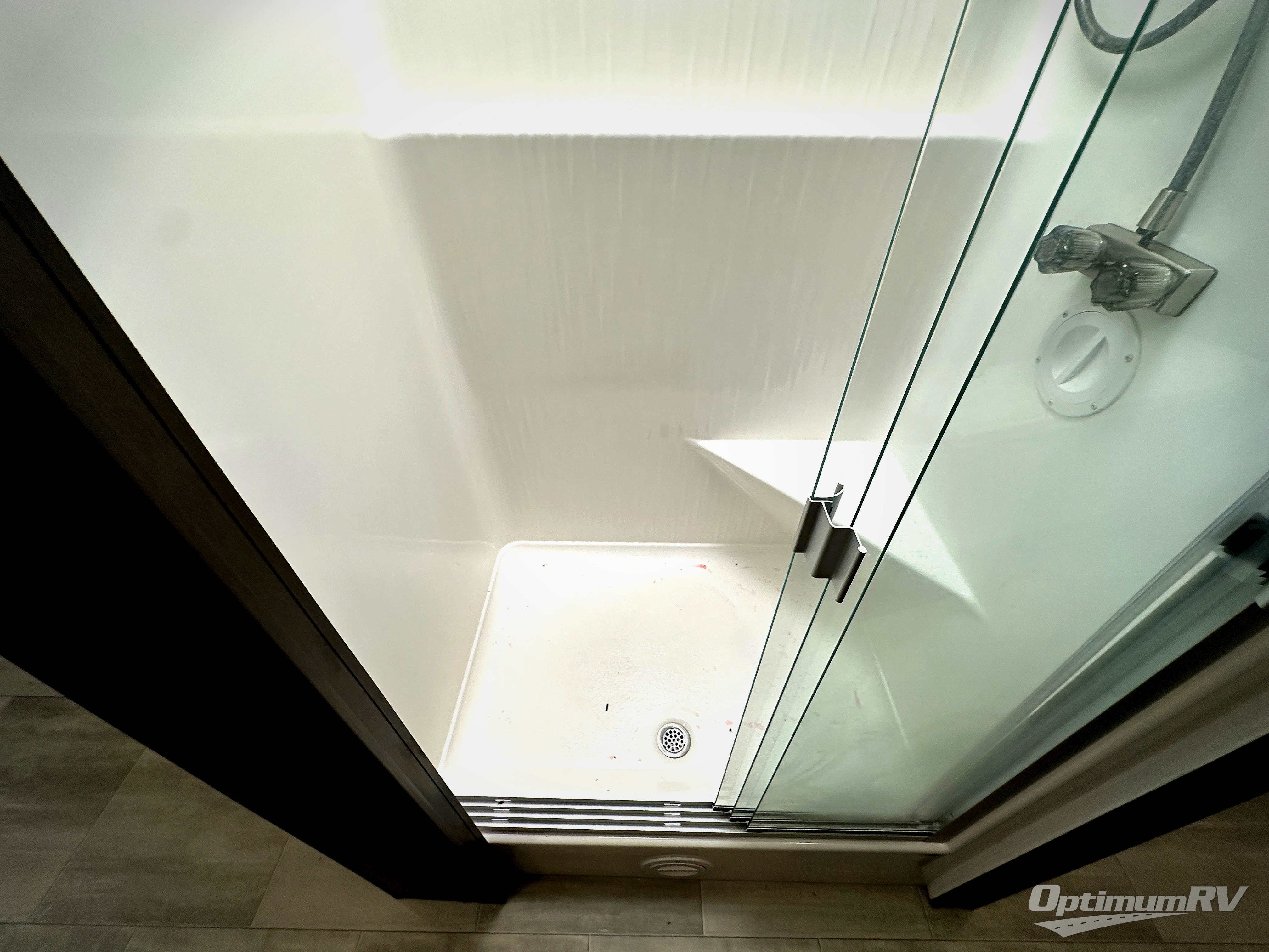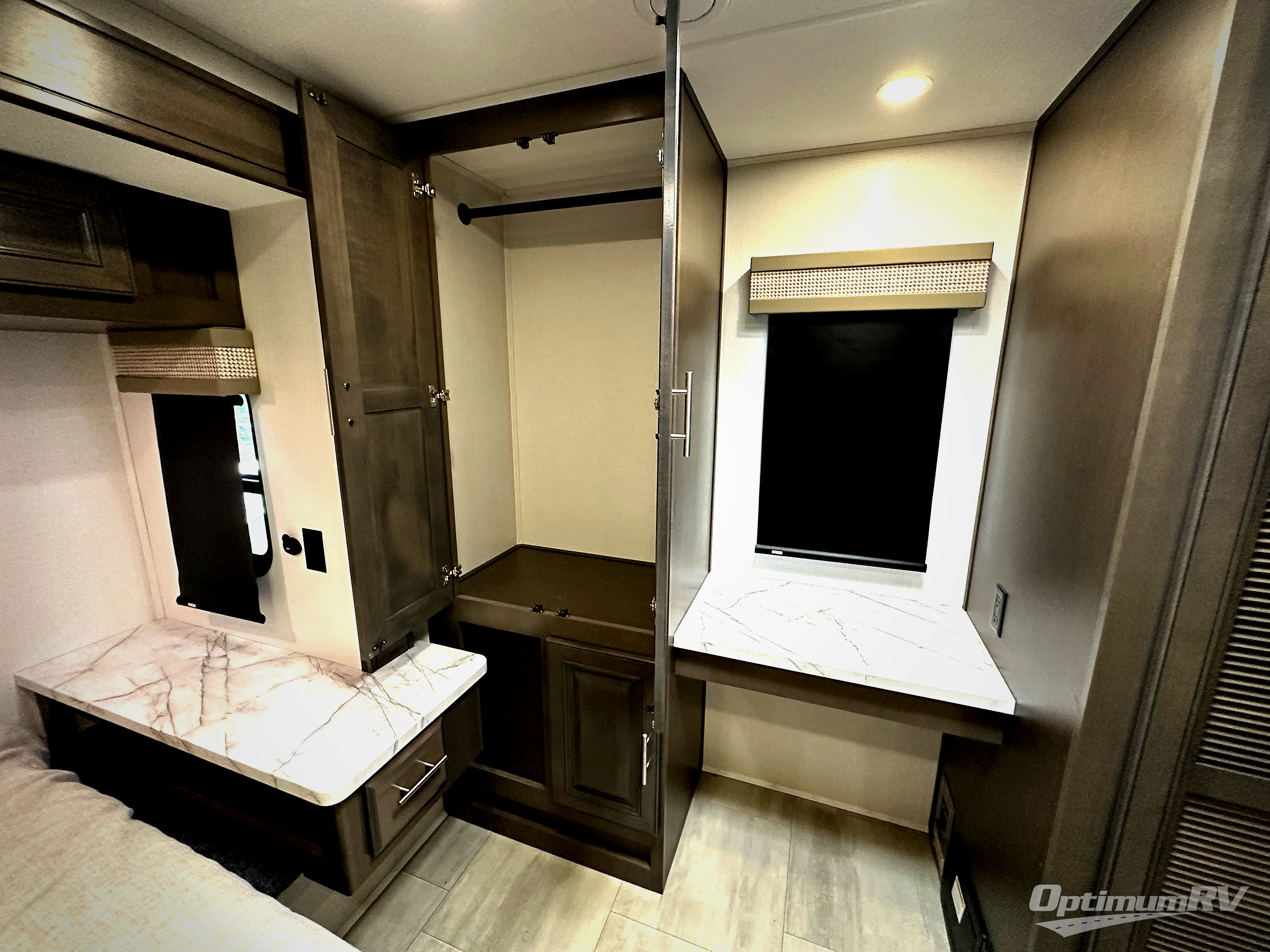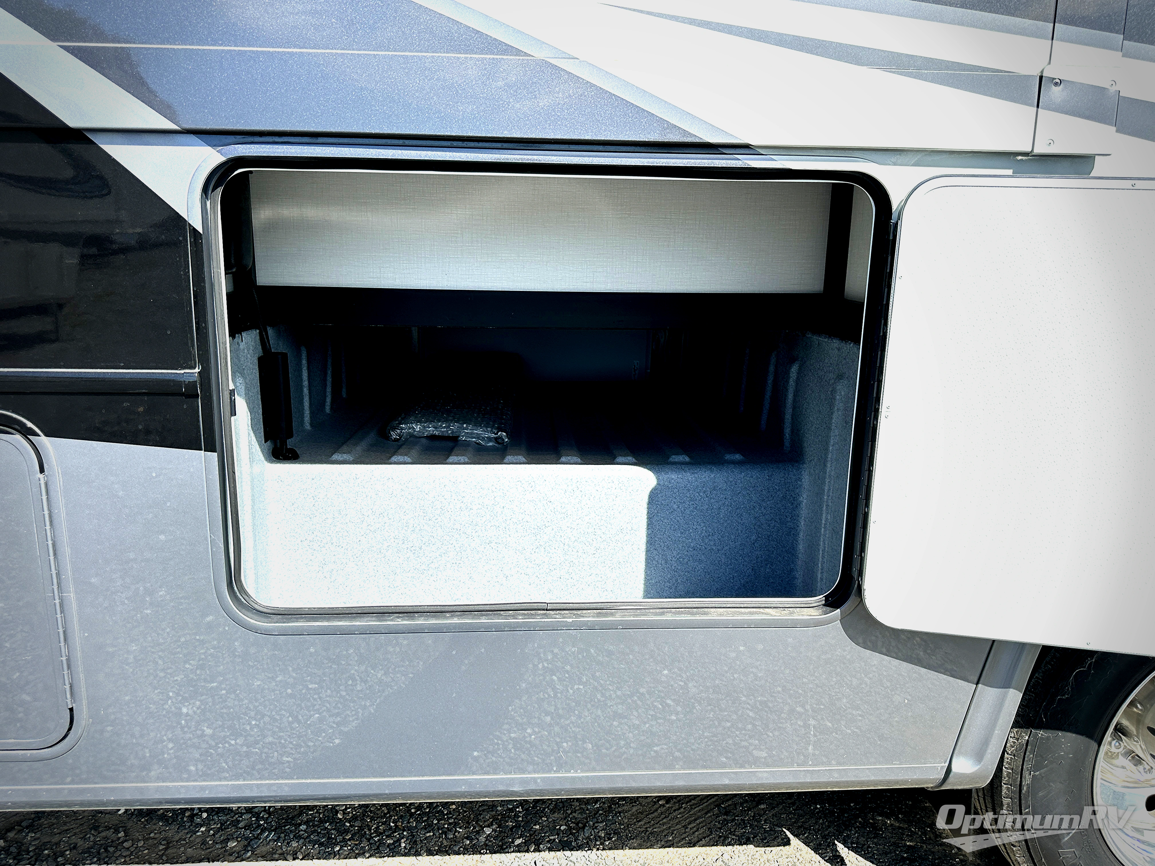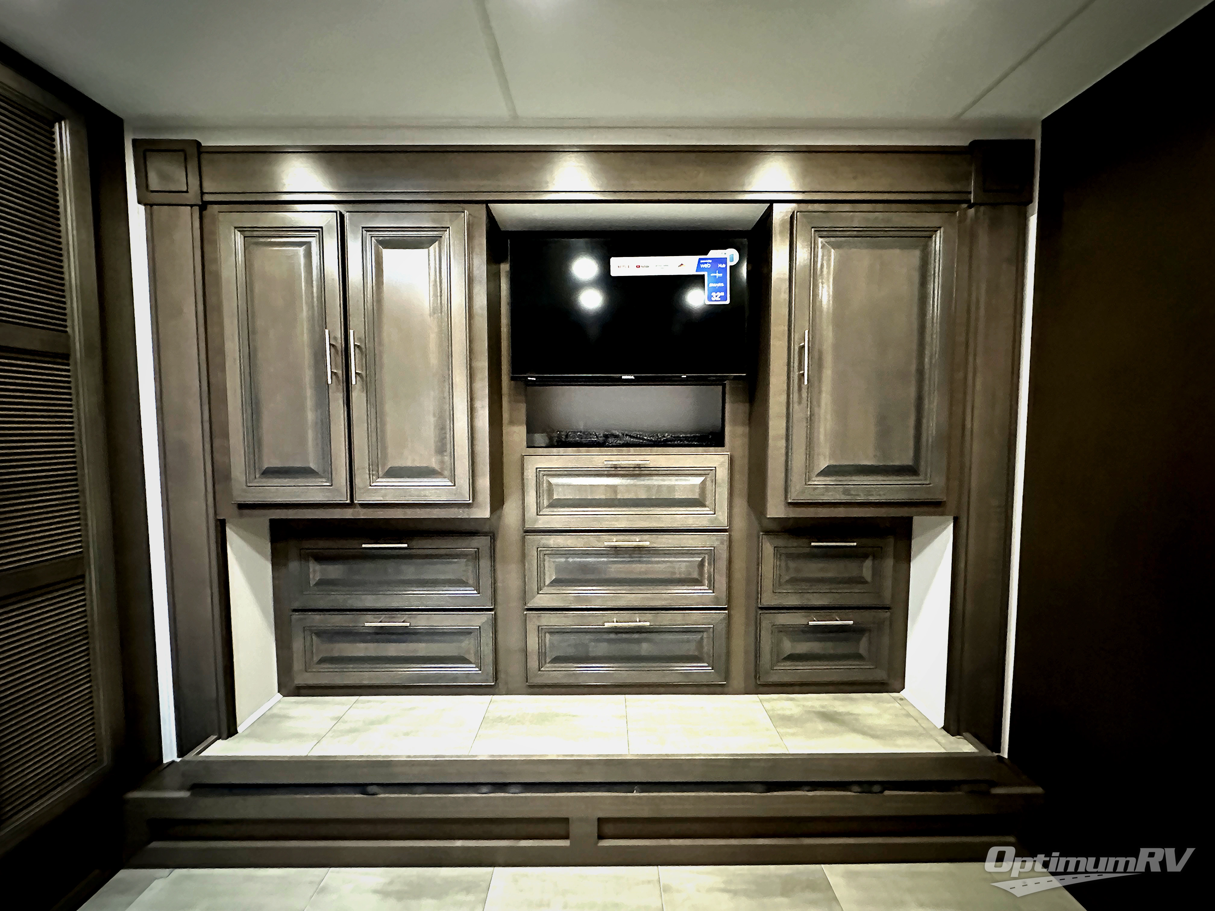 You won't believe all that the rear private bedroom has to offer in this motorhome! It features a 72" x 80" king bed slide with overhead cabinets, a dresser with a 32" TV and overhead cabinets, wardrobes on either side of the dresser, and a desk with wardrobes on either. And one of the wardrobes features an optional stacked washer and dryer for convenience! The split-style bathroom makes it easy for one person to freshen up in the shower with a seat while another uses the private toilet and sink. After a long day of traveling, you can relax on either the Thomas Payne theater seating with heat and massage across from the 5,000 BTU fireplace with a 40" LED TV above it or play a game and eat a meal at the Dream Dinette. There is also a power front overhead bunk for more sleeping space!