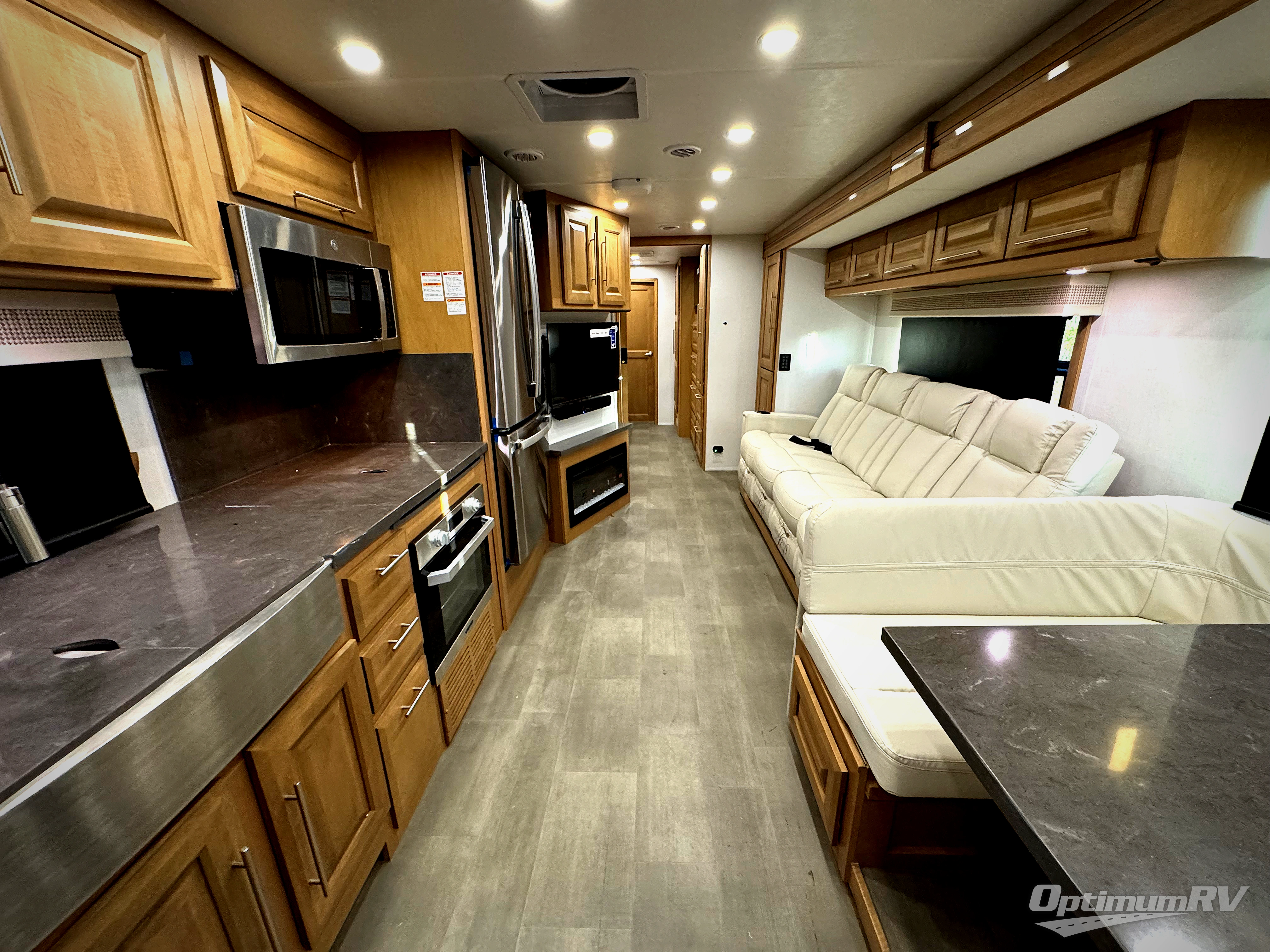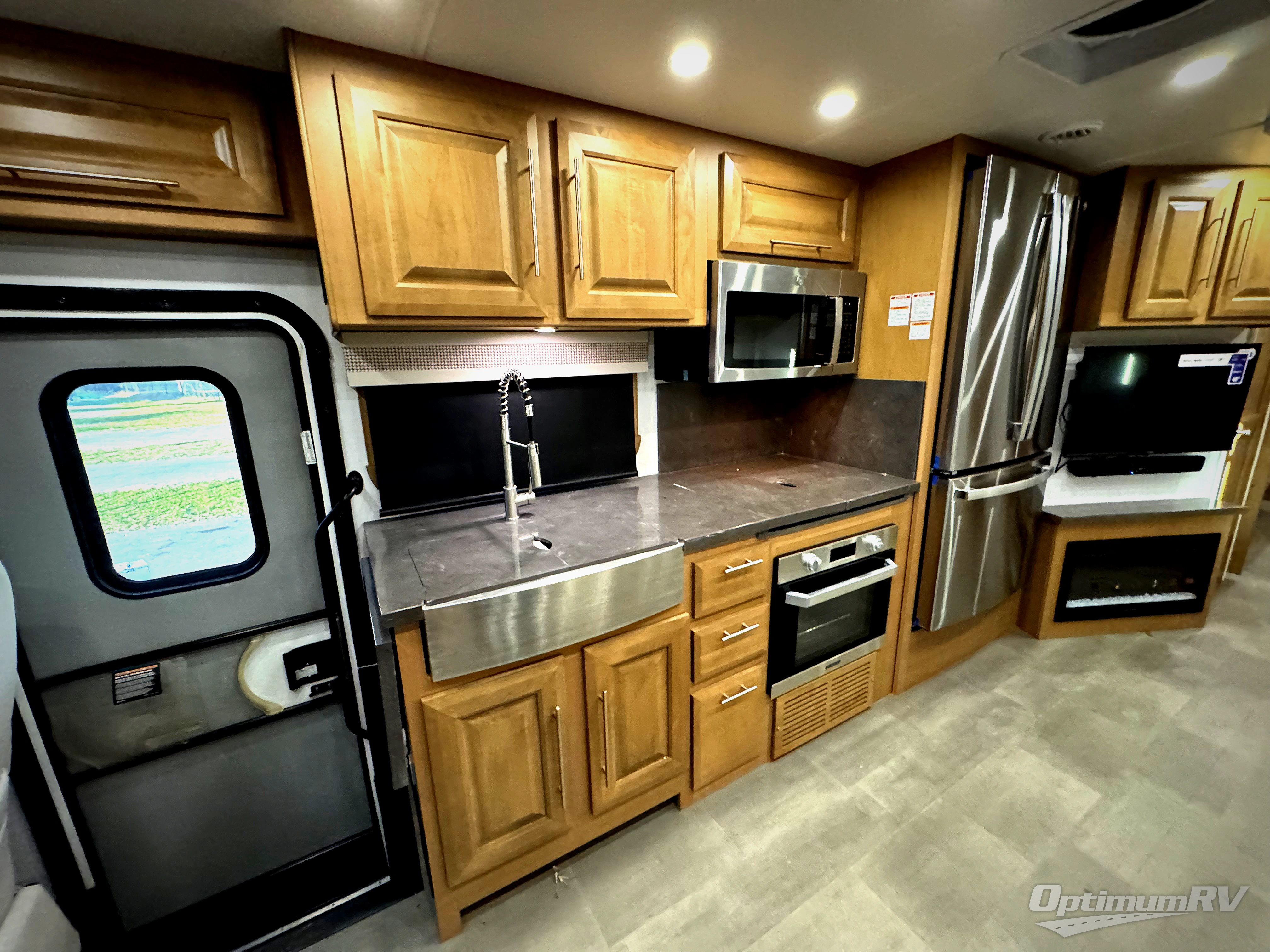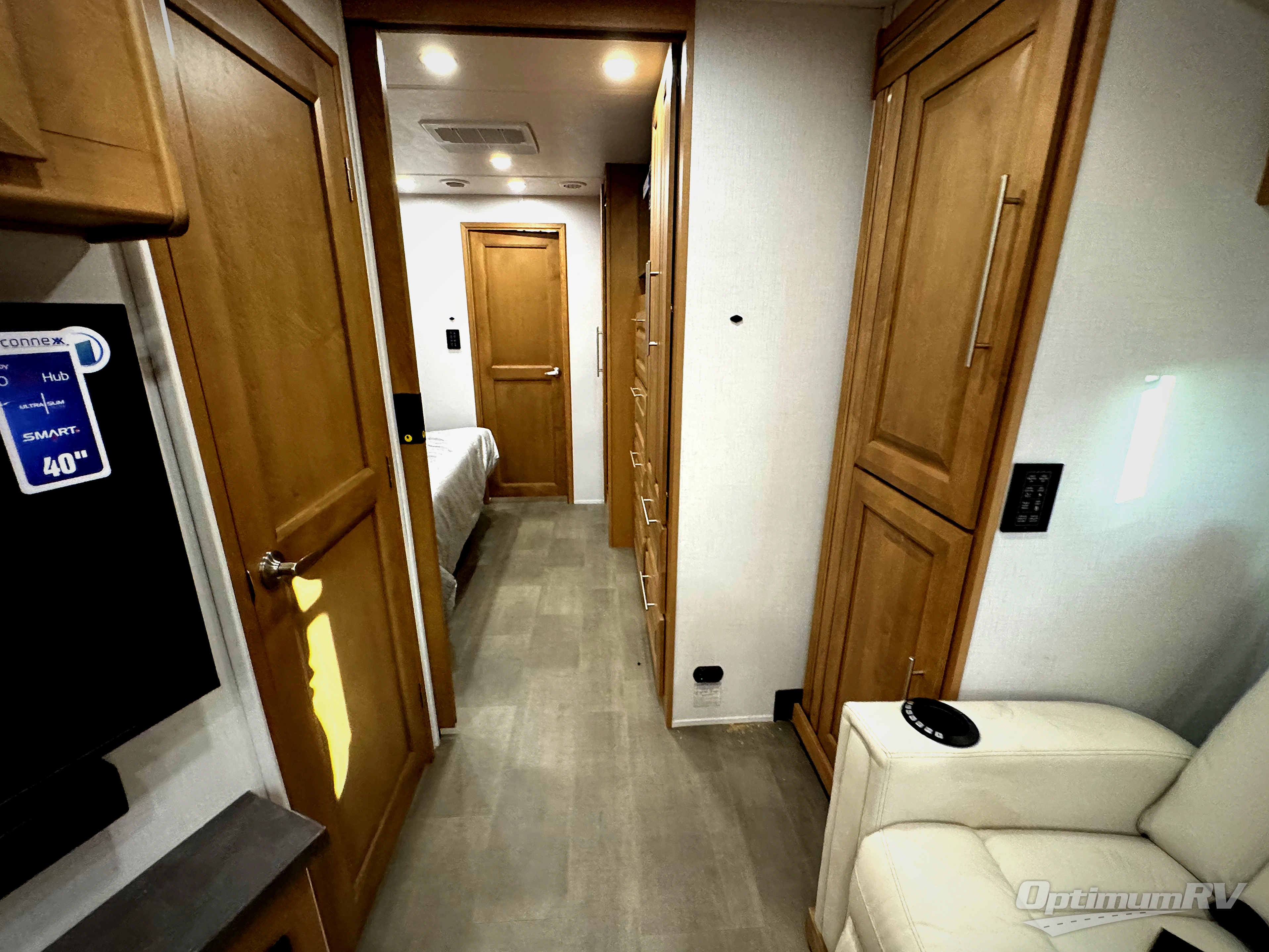 Comfort and convenience is found all throughout this motorhome! Starting with the full rear master bath that has a shower with a seat and a dual sink vanity, plus it leads into the private bedroom. Inside the bedroom is a 72" x 80" Power Tilt king bed slide with overhead cabinets across from a dresser with overhead cabinets and a 32" LED TV, a wardrobe, and another wardrobe that is prepped to add an optional stackable washer and dryer. The half bathroom is conveniently near the fully equipped kitchen so you can get back to creating your best home cooked meals fast. Relax in true comfort each night by either playing games at the booth dinette or on the theater seating that comes with power recline, heat, and massage!