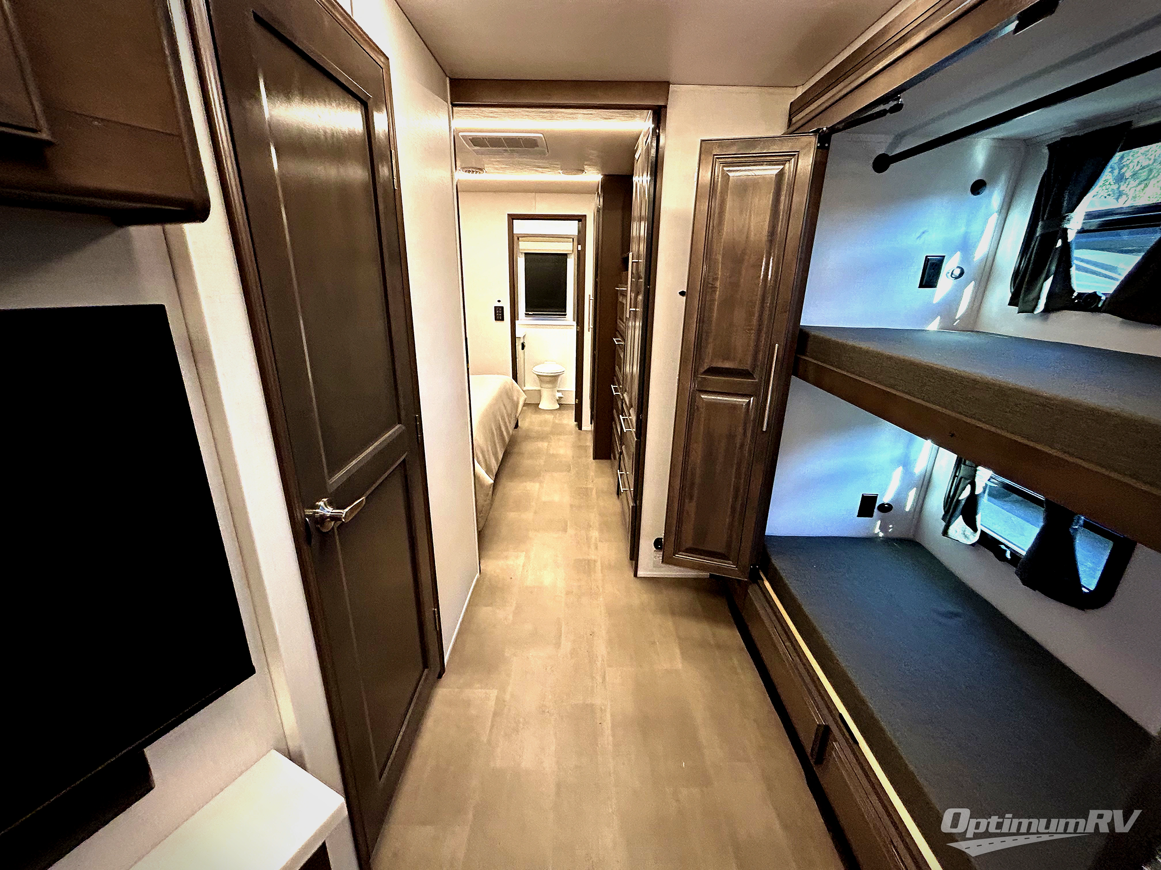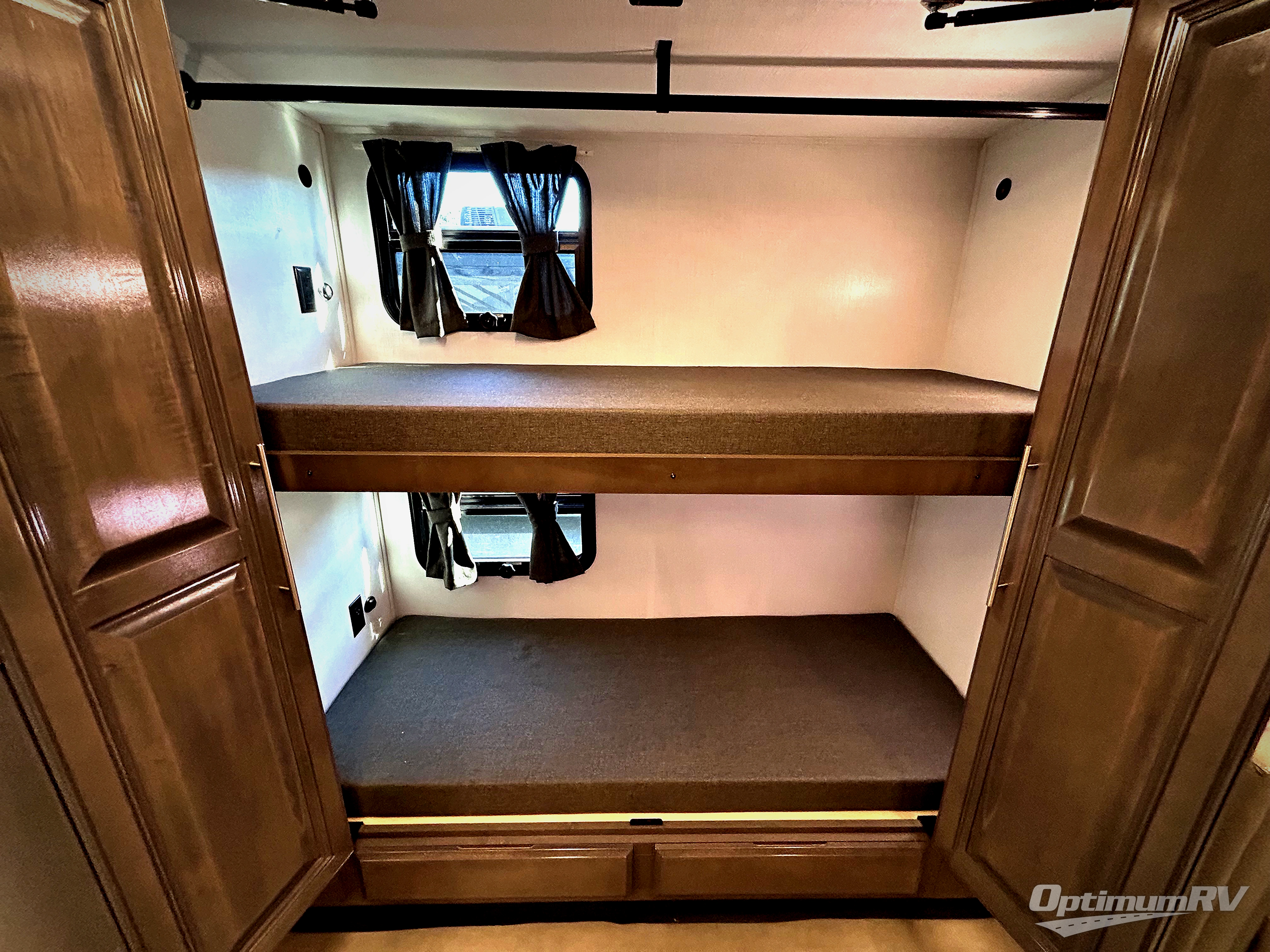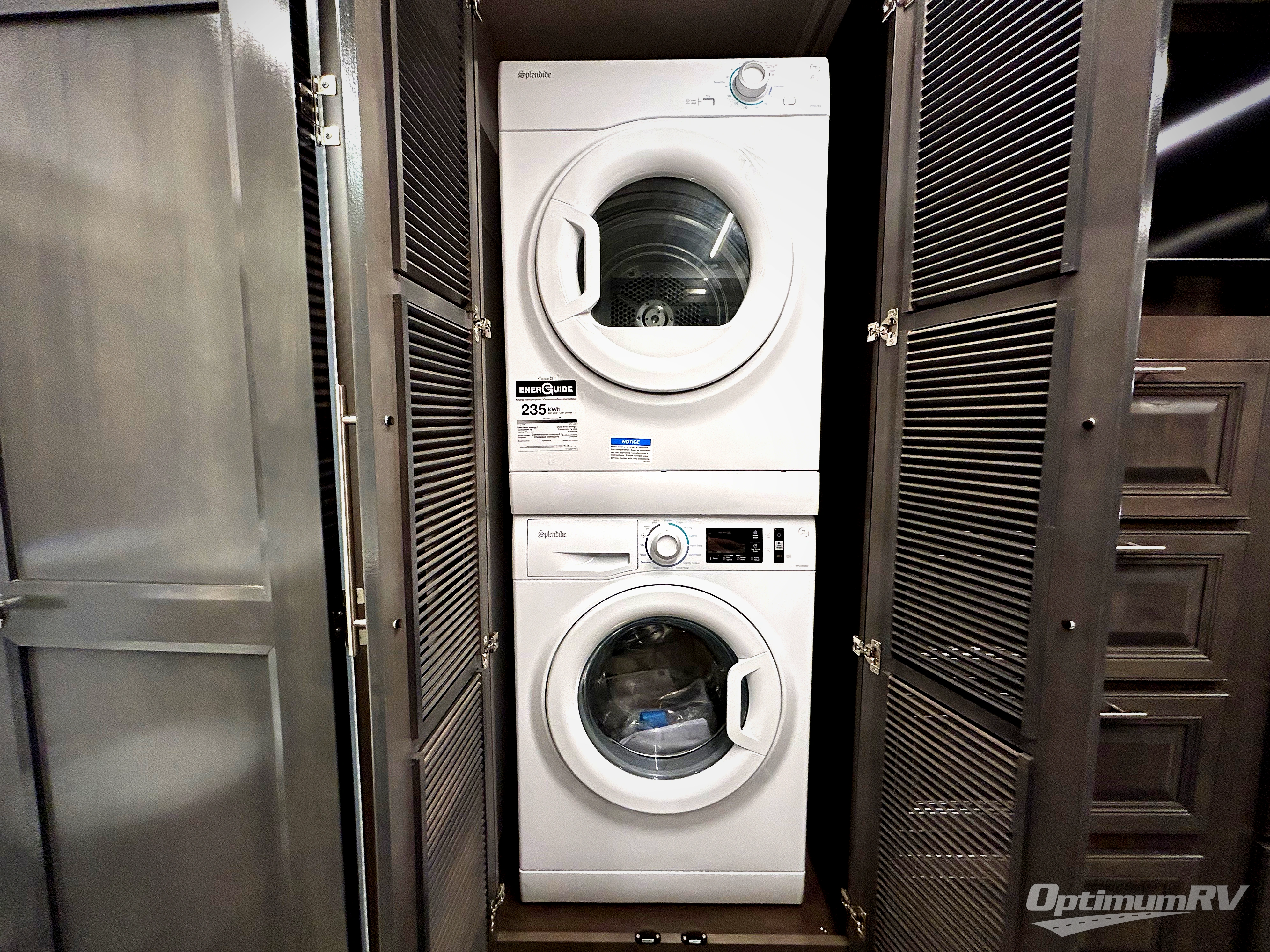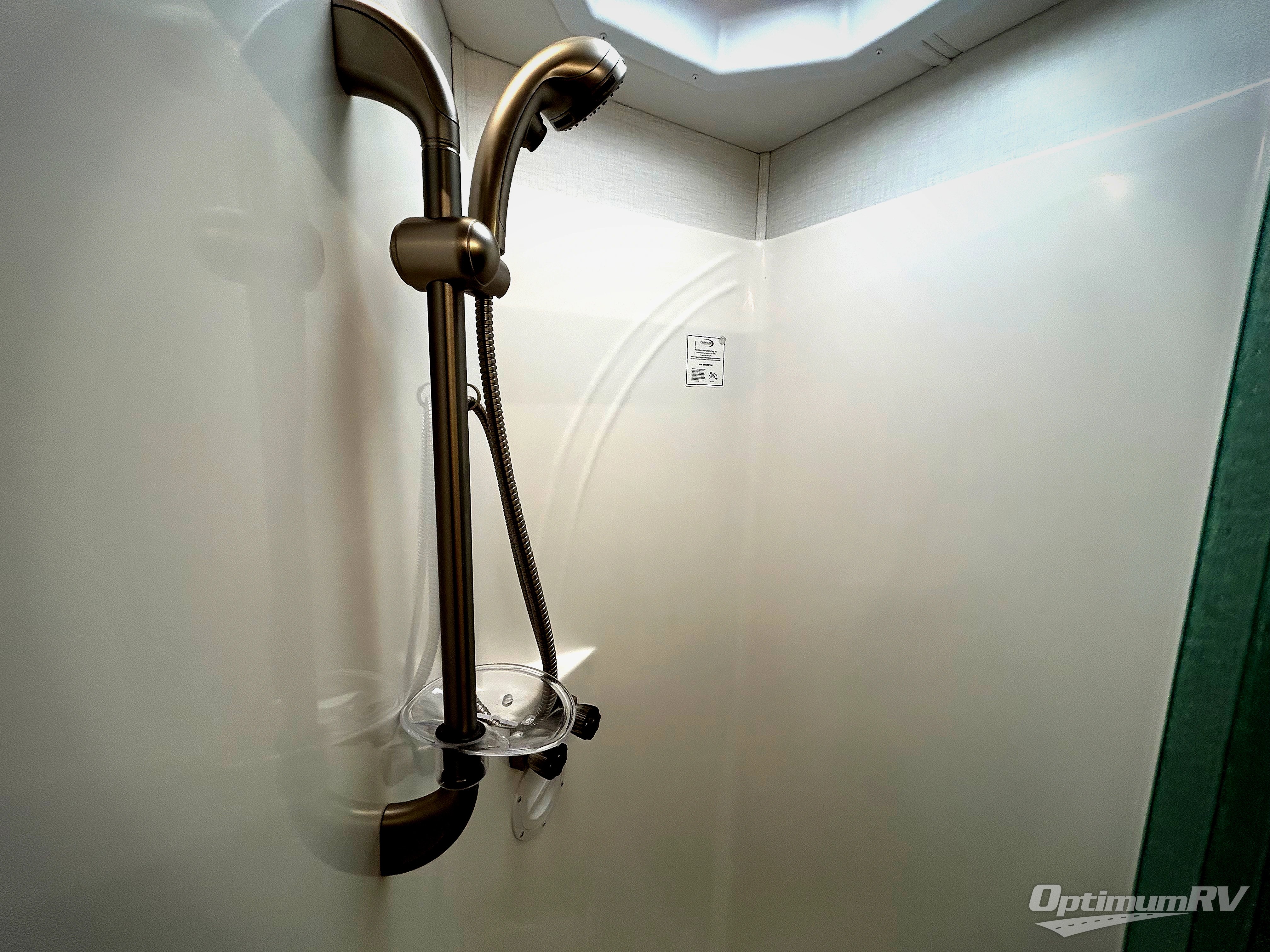 It's a clean decision to take this motorhome on all of your adventures with two full bathrooms! The full rear bathroom has a shower with a seat and creates a master suite with the bedroom which has a 72" x 80" Power Tilt king bed slide across from a dresser with a 32" LED TV and wardrobes on either side of it with one of them with washer and dryer prep. The set of bunk beds are conveniently across from the second full bathroom which will come in handy at night and keep things running smoothly in the mornings with a shower. Prepare your best home cooked meals with the three burner cooktop and enjoy them at the booth dinette then relax on the theater seating!