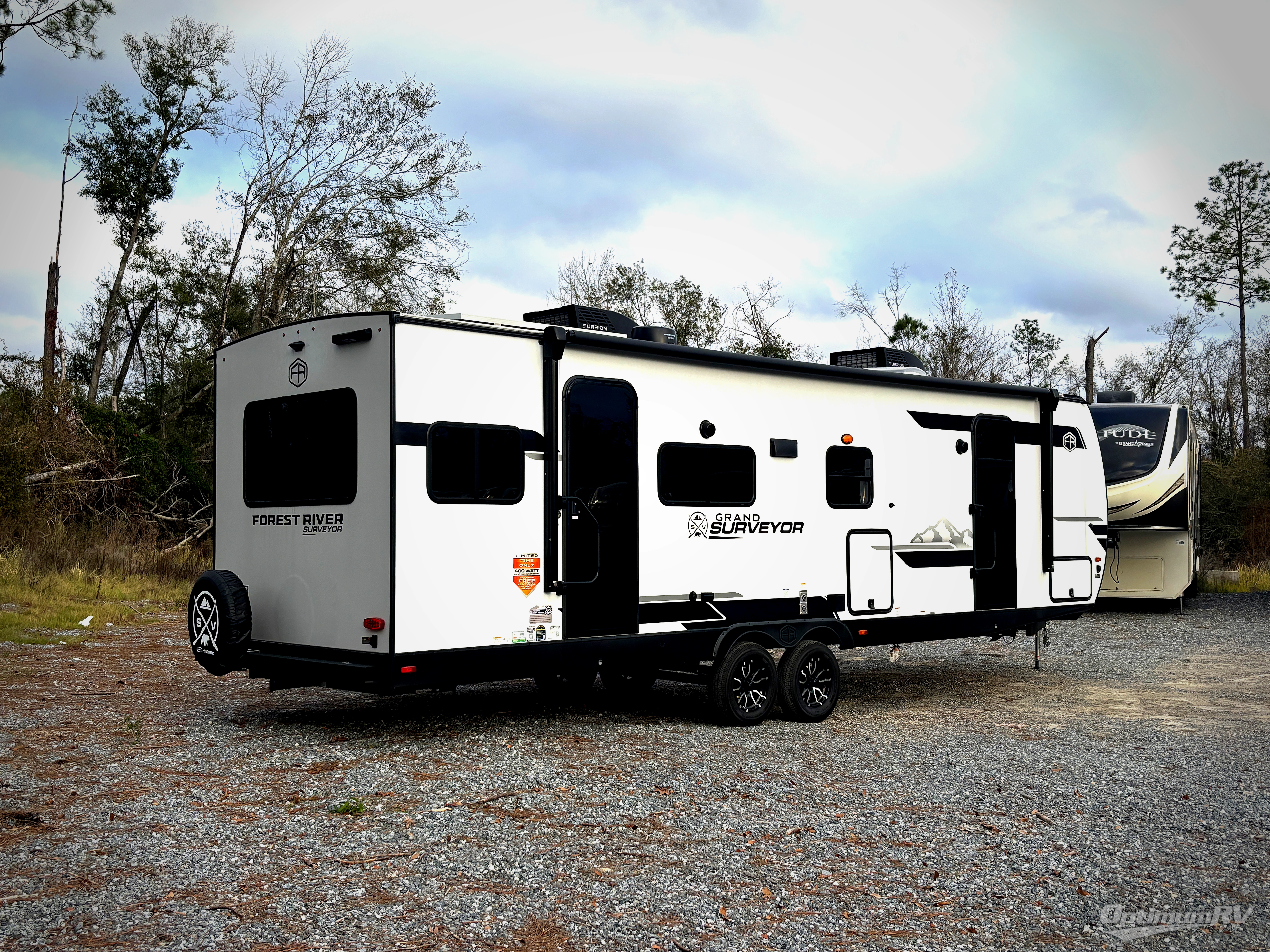 With any Grand Surveyor travel trailer by Forest River you will enjoy turn-key ready-to-go features and quality construction! Each model includes Azdel composite walls and a gel coated fiberglass front cap with an automotive style tinted windshield for a sleek look. There are friction hinge black glass entry door(s), an adjustable platform step with a night light, plus Goodyear tires and a power tongue jack for easy towing. The interior will have you feeling right at home with roller shades, residential faucets, sinks, and bathroom vanity, plus Surf(x) seamless countertops throughout. You can also plan for adventure with a 2" rear accessory and exterior spray port, and there are slam latch exterior baggage doors throughout to keep all your gear secure. Other stand-out features include a central vacuum system, a 200 watt solar panel with a 30 amp controller, a tankless water heater, carpet-free interiors, and the list goes on!