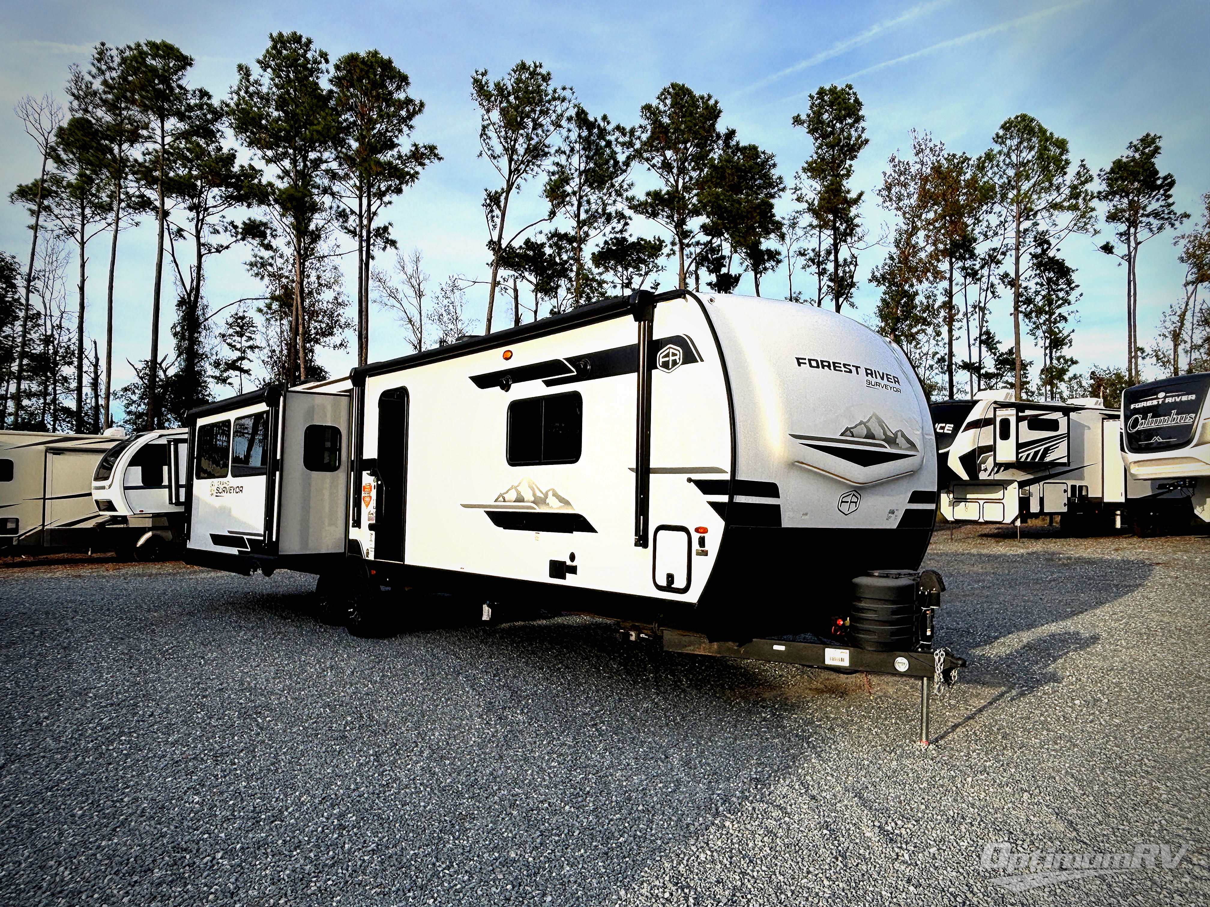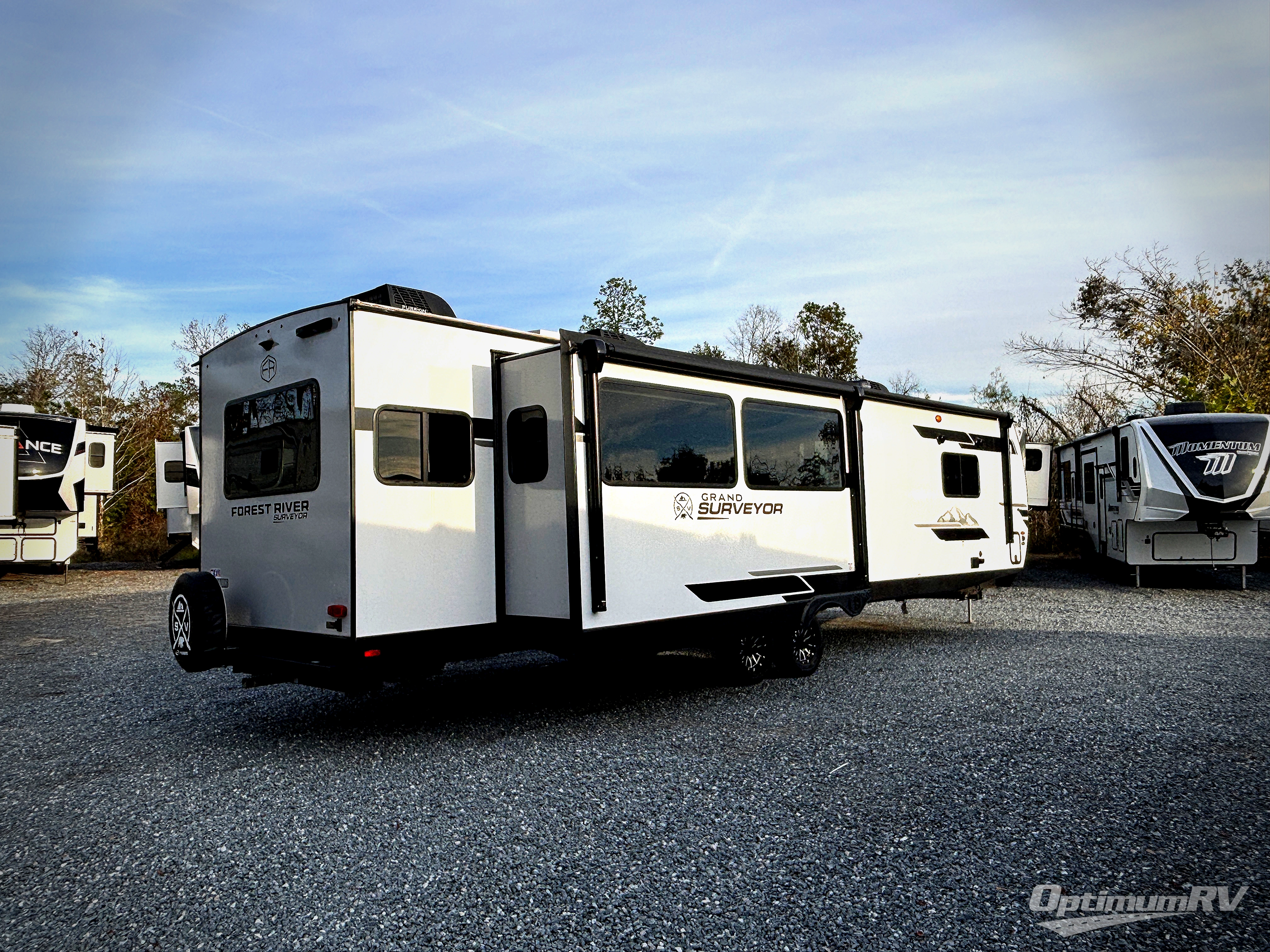 With any Grand Surveyor travel trailer by Forest River you will enjoy turn-key ready-to-go features and quality construction! Each model includes Azdel composite walls and a gel coated fiberglass front cap with an automotive style tinted windshield for a sleek look. There are friction hinge black glass entry door(s), an adjustable platform step with a night light, plus Goodyear tires and a power tongue jack for easy towing. The interior will have you feeling right at home with roller shades, residential faucets, sinks, and bathroom vanity, plus Surf(x) seamless countertops throughout. You can also plan for adventure with a 2" rear accessory and exterior spray port, and there are slam latch exterior baggage doors throughout to keep all your gear secure. Other stand-out features include a central vacuum system, a 200 watt solar panel with a 30 amp controller, a tankless water heater, carpet-free interiors, and the list goes on!