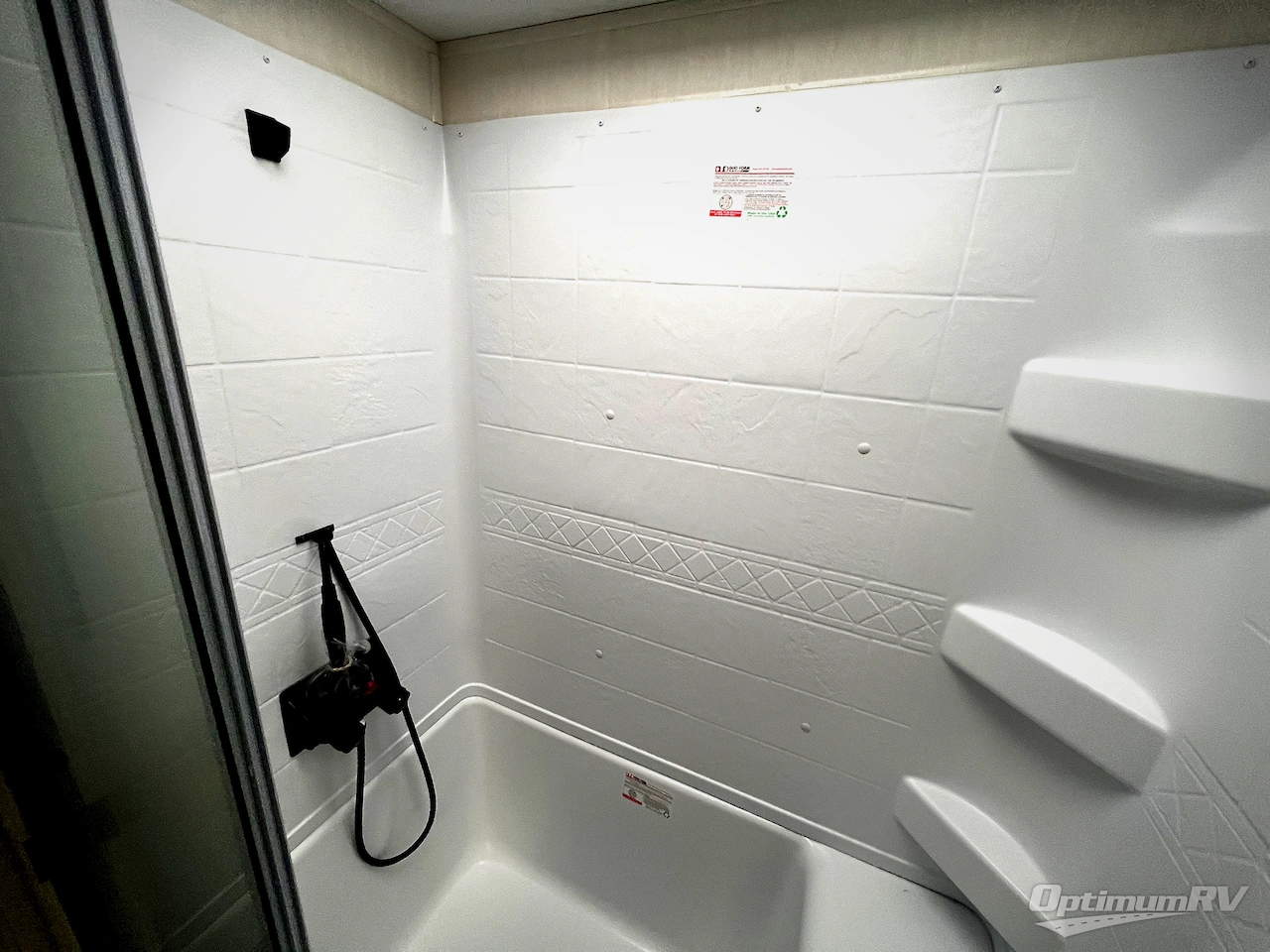 Are you looking for a fifth wheel where you can bring along your neighbor friends? You can do just that since there are two bedrooms in this unit, one of which includes a master bath with its own exterior entry door! The front bedroom is right next to the second full bath for convenience, and includes a camper king bed slide, a dresser, and front wardrobe. The rear master bedroom has a queen bed slide out across from a second slide for more floor space, and there is a loft above this room for more sleeping or storage space. Everyone can meet in the middle kitchen and living room since there are recliners, a ceiling fan, and kitchen island with four chairs. There is also storage below the island for kitchen necessities, and the hidden pantry behind the TV will be perfect for snacks, board games and more!