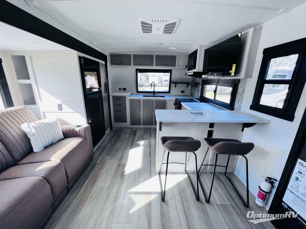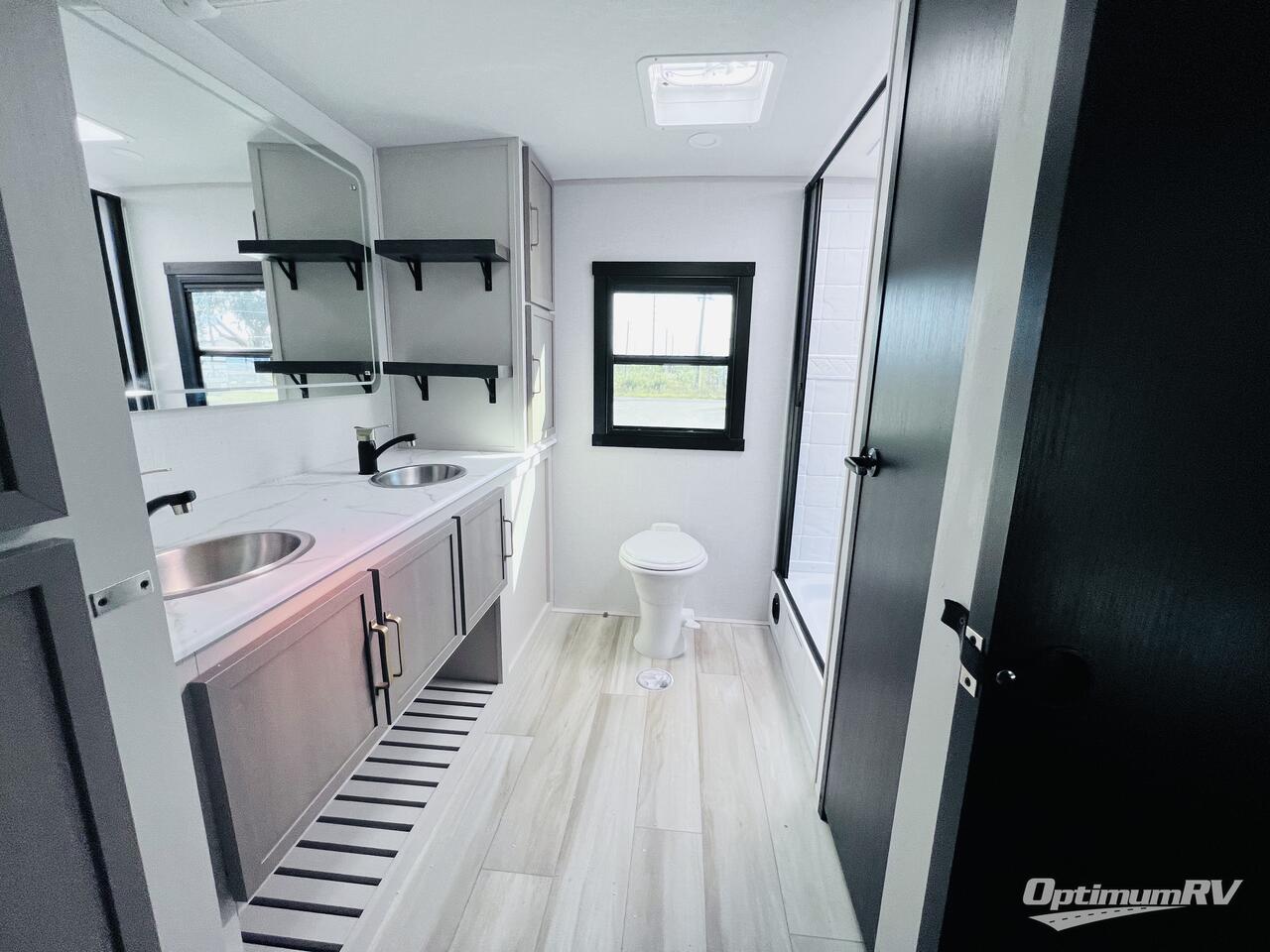 This is the perfect couple's trailer for weekend trips to the campground. The front kitchen includes ample counter space, including a bar top with two stools. You can relax on the theater seat within the slide out here, and the pantry and 12V refrigerator is close by so you can grab a snack. A master bedroom includes a custom king bed slide out, a panoramic window, an ottoman, plus a dresser with a fireplace to make your space cozy. The full rear bath includes dual bath sinks, a walk-in shower with a skylight, plus washer and dryer connections if you want to add those appliances.