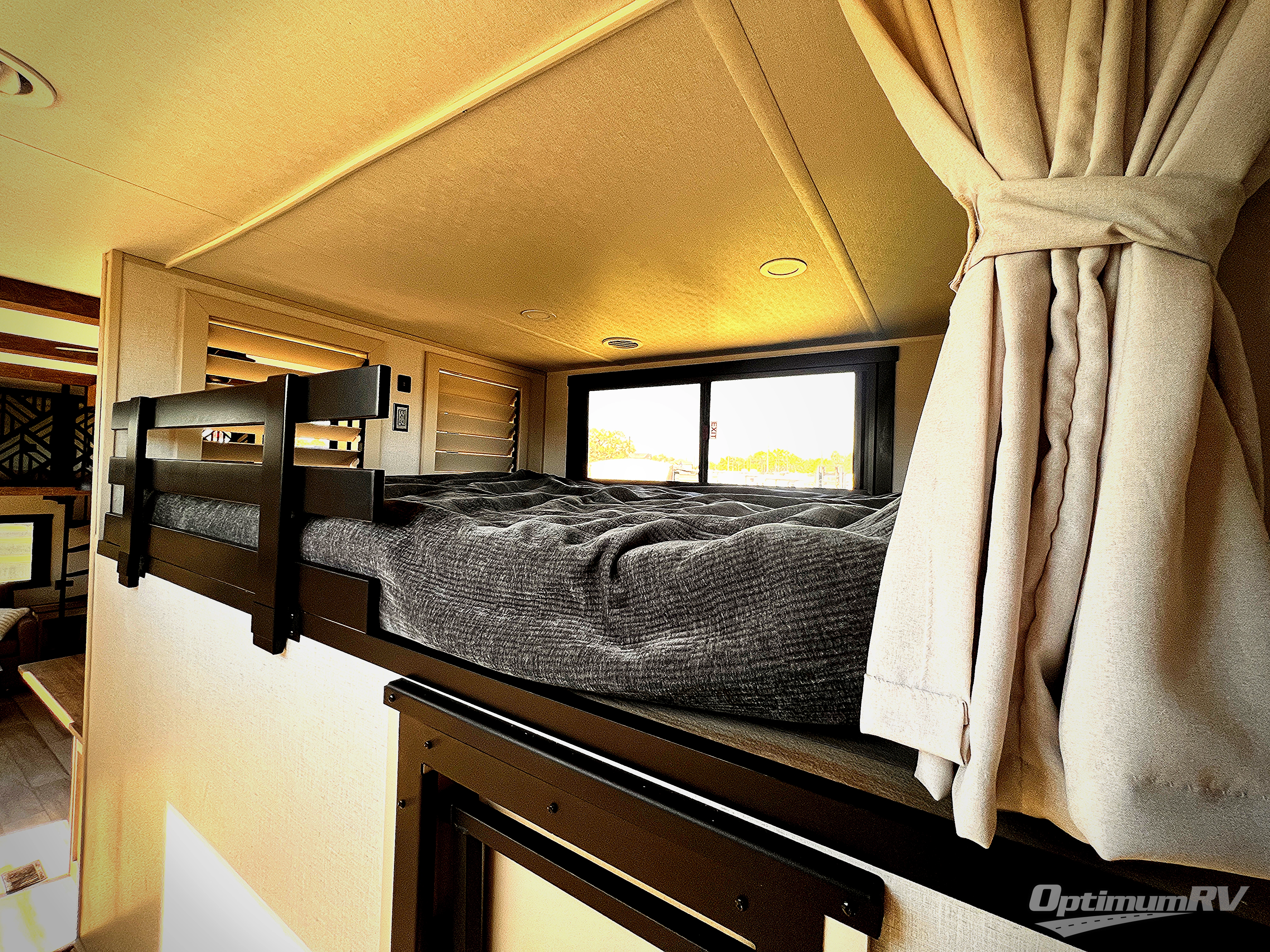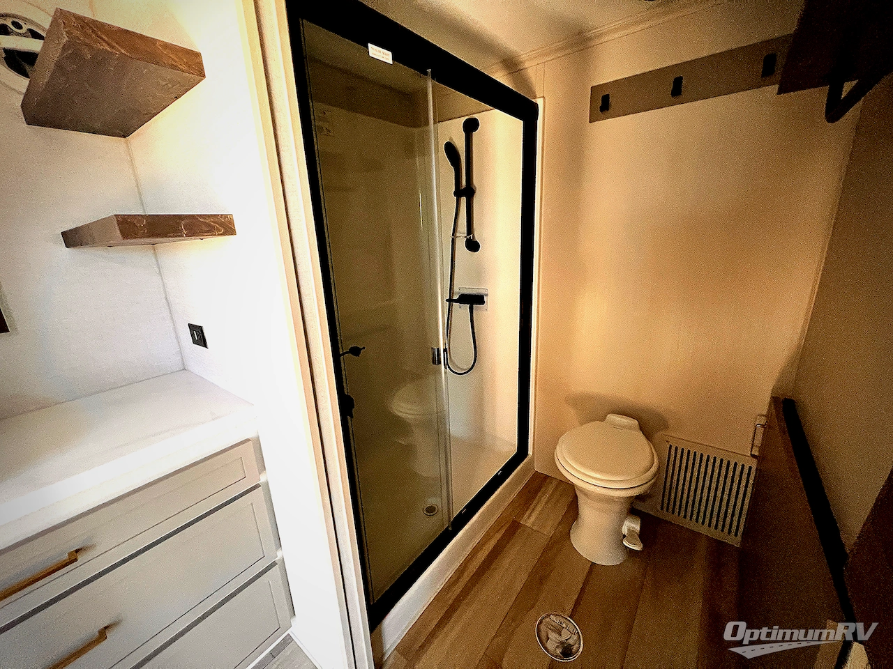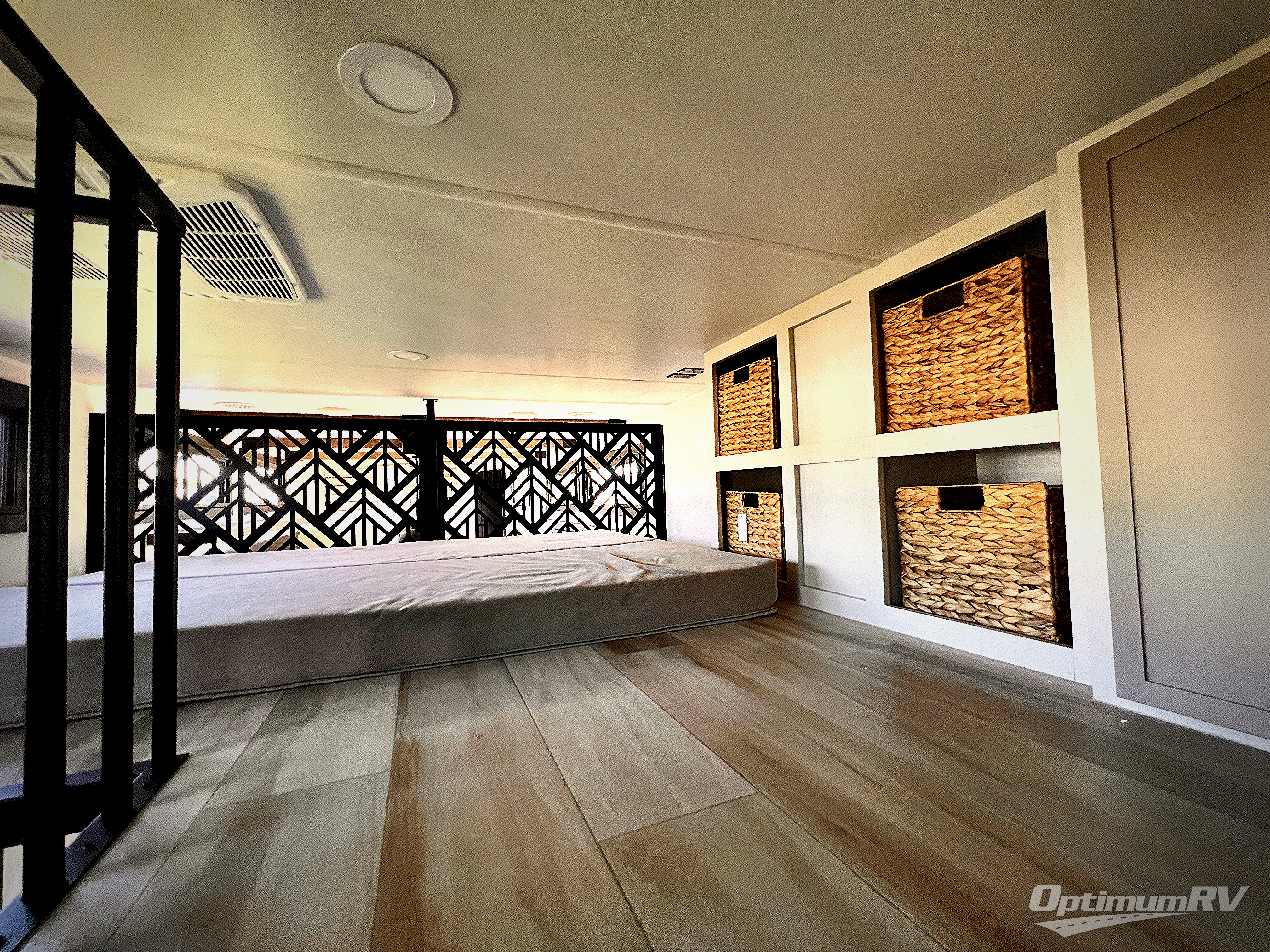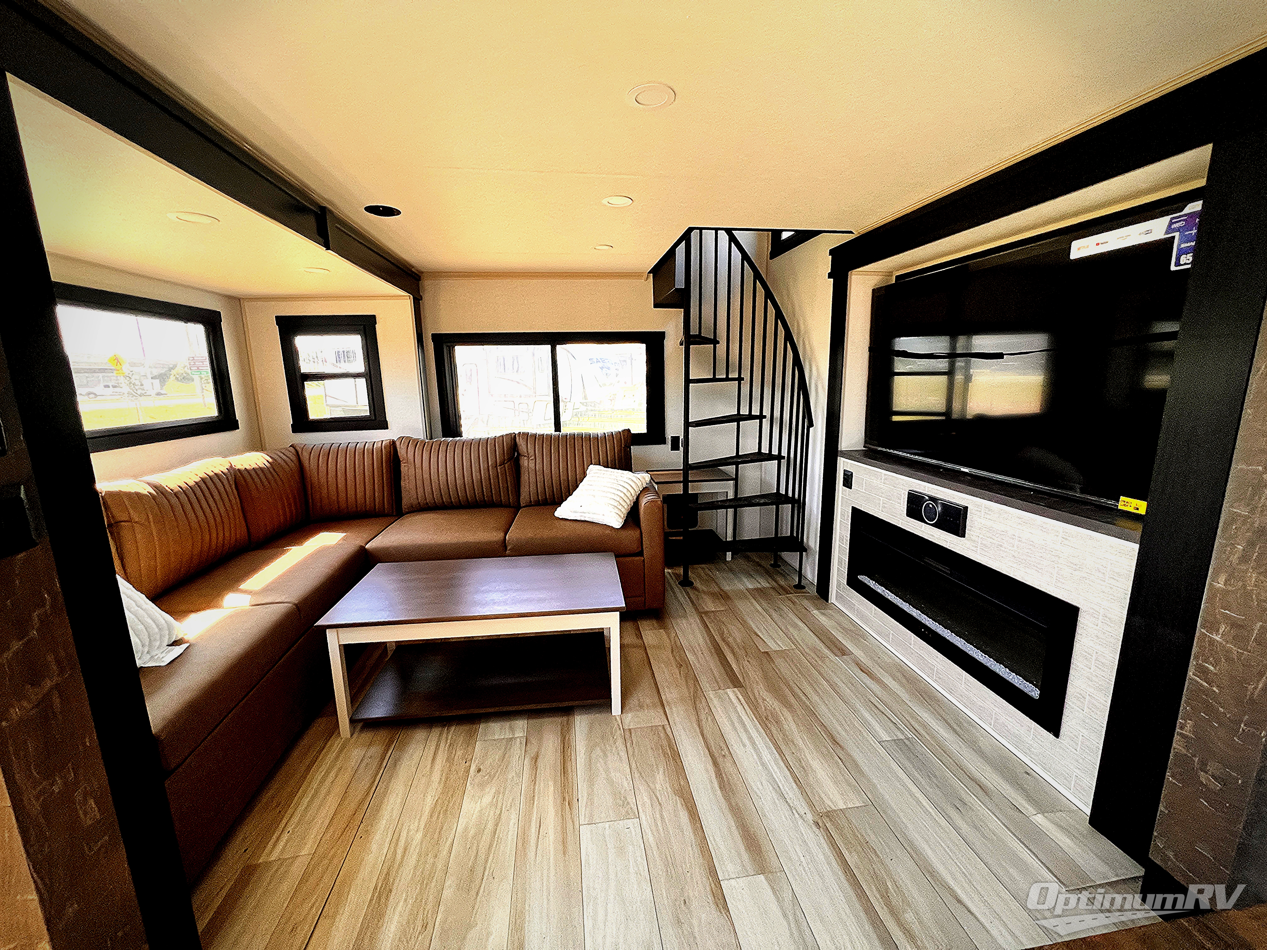 Introducing a new RV of its kind, the ROOST43 is a destination-style fifth wheel you are sure to love! There are two levels, making it feel more like home, and you can sleep six to eight each night. The master bedroom includes a custom king bed slide out, a 32" TV and fireplace, a desk/vanity, plus a half bath for convenience. A custom king-size bed is also found in the front loft, and there are storage cubbies plus a coax/110V outlet here to plug in chargers or a laptop. The second loft in the back includes spiral stairs, two bunk mats, a wardrobe, and cubby cubes here also for your guests' things. Some of the stand-out features you'll find on the first level are the sectional sofa with a coffee table, an entertainment center with a 65" TV, a kitchen island with five chairs, and a fully-equipped kitchen. The 20 cu. ft. 12V refrigerator and pull-out pantry will let you stock up on food, and the kitchen hutch will be perfect for nice dishes. The full bath on this model is one to remember; there is a one-piece fiberglass shower with a teak seat, a flip-up shelf and a washer/dryer, a backlit mirror, and more. And we haven't even touched on the exterior features, such as the pull-out tray, outdoor refrigerators, 20' awning, and more!