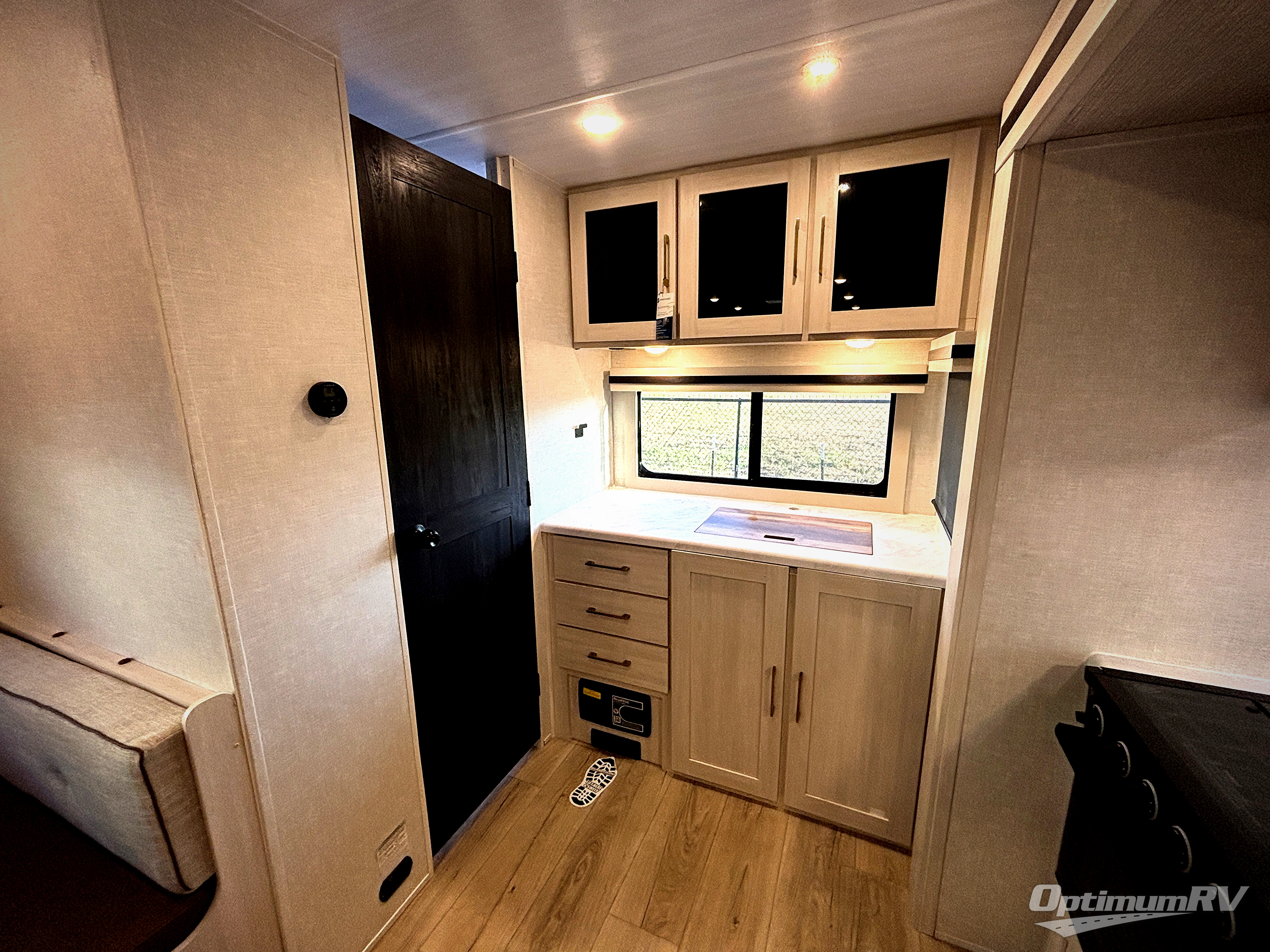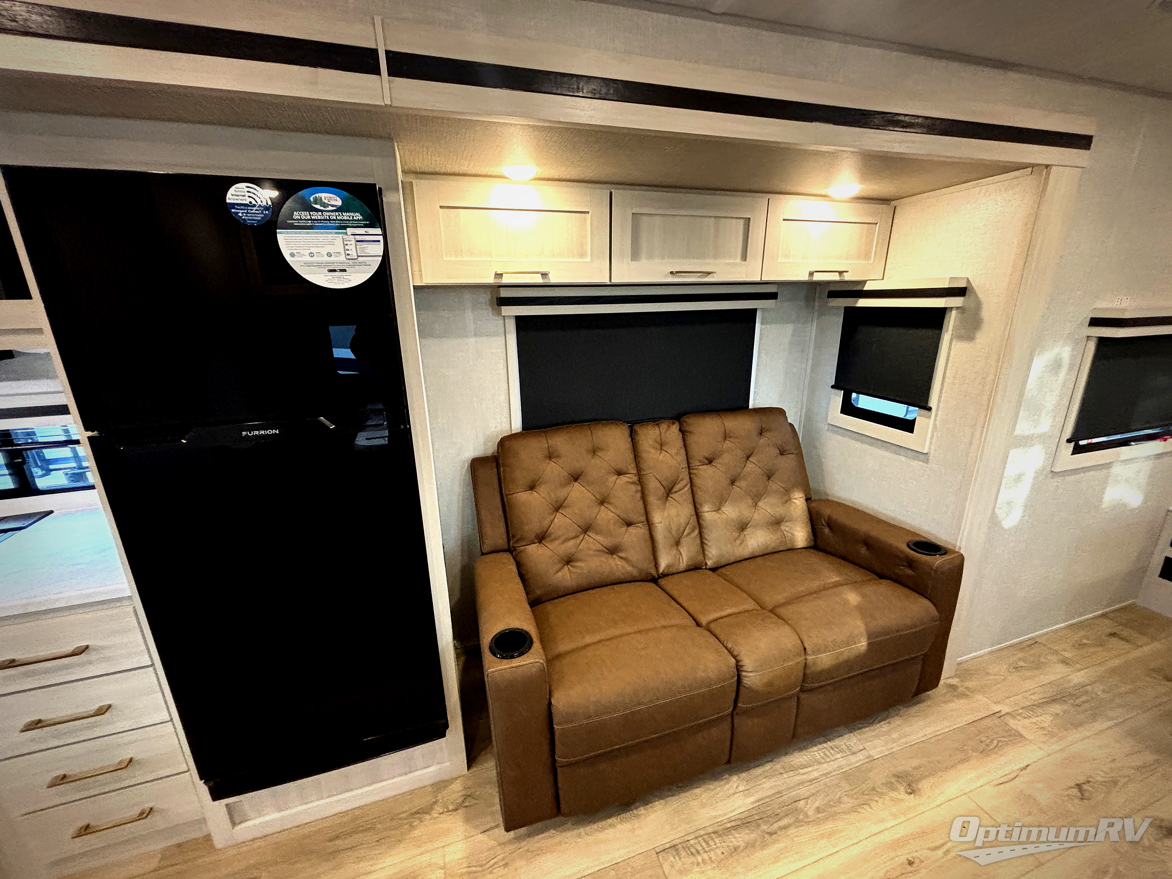 You'll love camping and spending time with loved ones in this spacious travel trailer. The 18' power awning with LED lights can be set up once you arrive at the campground, and you can unload camp gear from the pass-through storage. Head inside to make lunch on the residential range top or in the microwave oven. There is a booth dinette and tri-fold sofa for seating space, plus an additional counter with bar stools beside the dinette. A full bath onboard lets you clean up each day, and the front queen bed is sure to bring a great night's rest. There are also dual wardrobes to keep your space tidy and overhead storage for even more belongings.