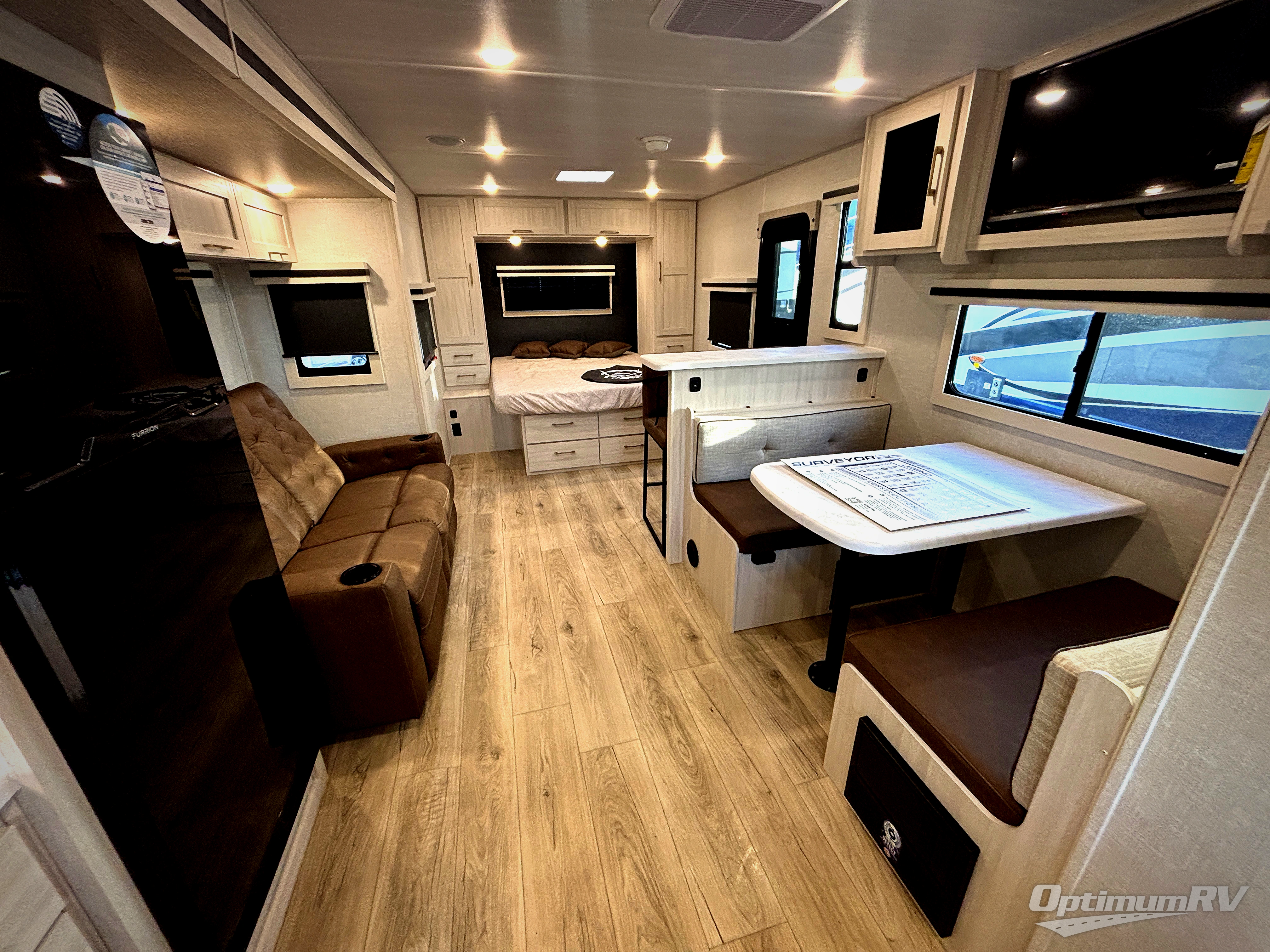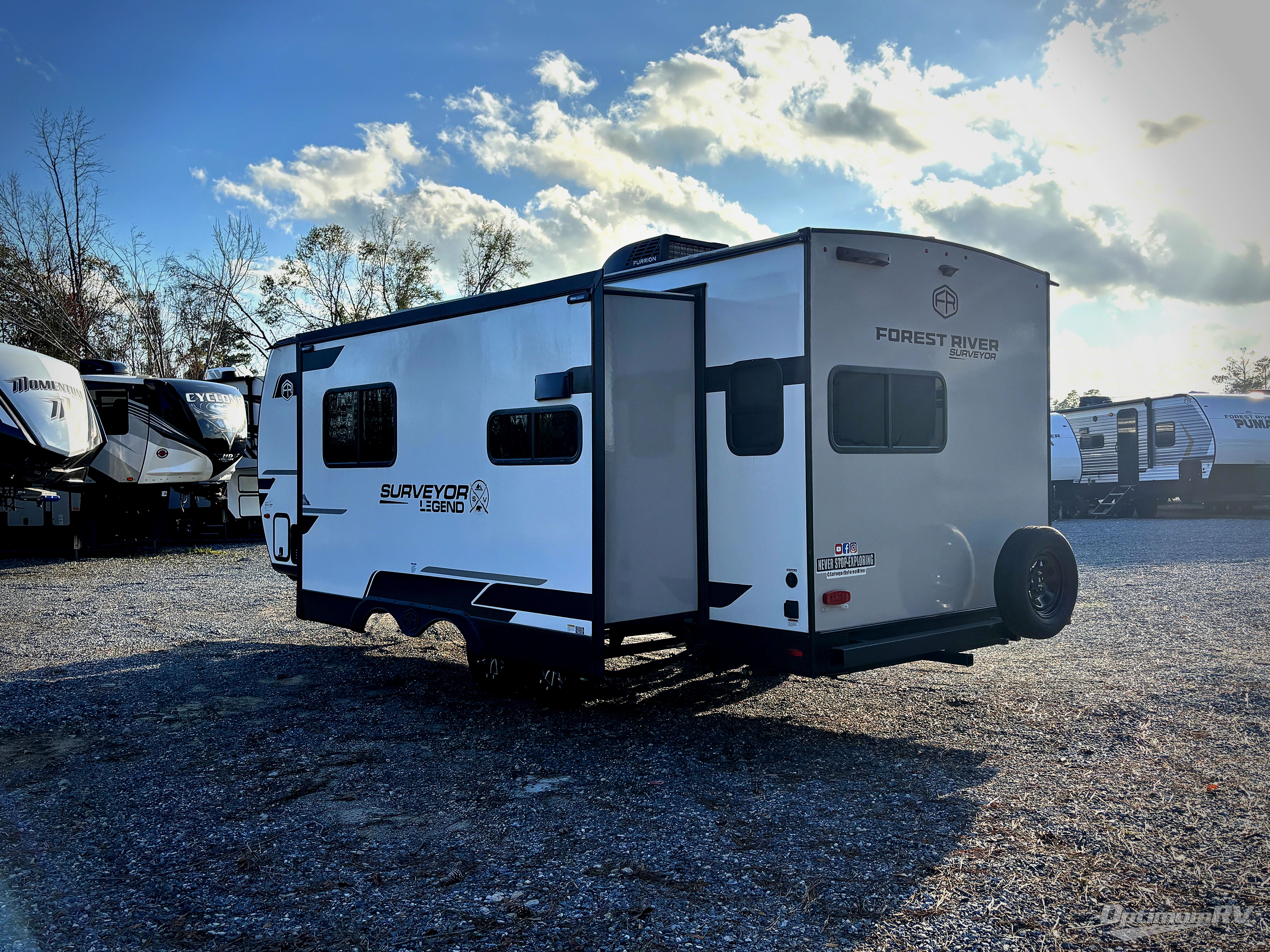 With any Surveyor Legend travel trailer by Forest River you will enjoy quality craftsmanship, convenient amenities, and at-home comforts. The Azdel composite walls provide a longer-lasting trailer, and the power tongue jack with a hitch light will get you back on the road in no-time. There are also Goodyear tires and a tire pressure monitoring system for hassle-free towing. Each model includes the Surveyor Legend Package that comes standard with oversized dinette storage access doors, front slam latch baggage doors, plus an automotive style tinted front windshield. You'll appreciate camping with a tankless water heater for endless hot showers, a 2" accessory hitch to bring bikes along, plus carpet-free interiors and a central vacuum system for easy clean up.