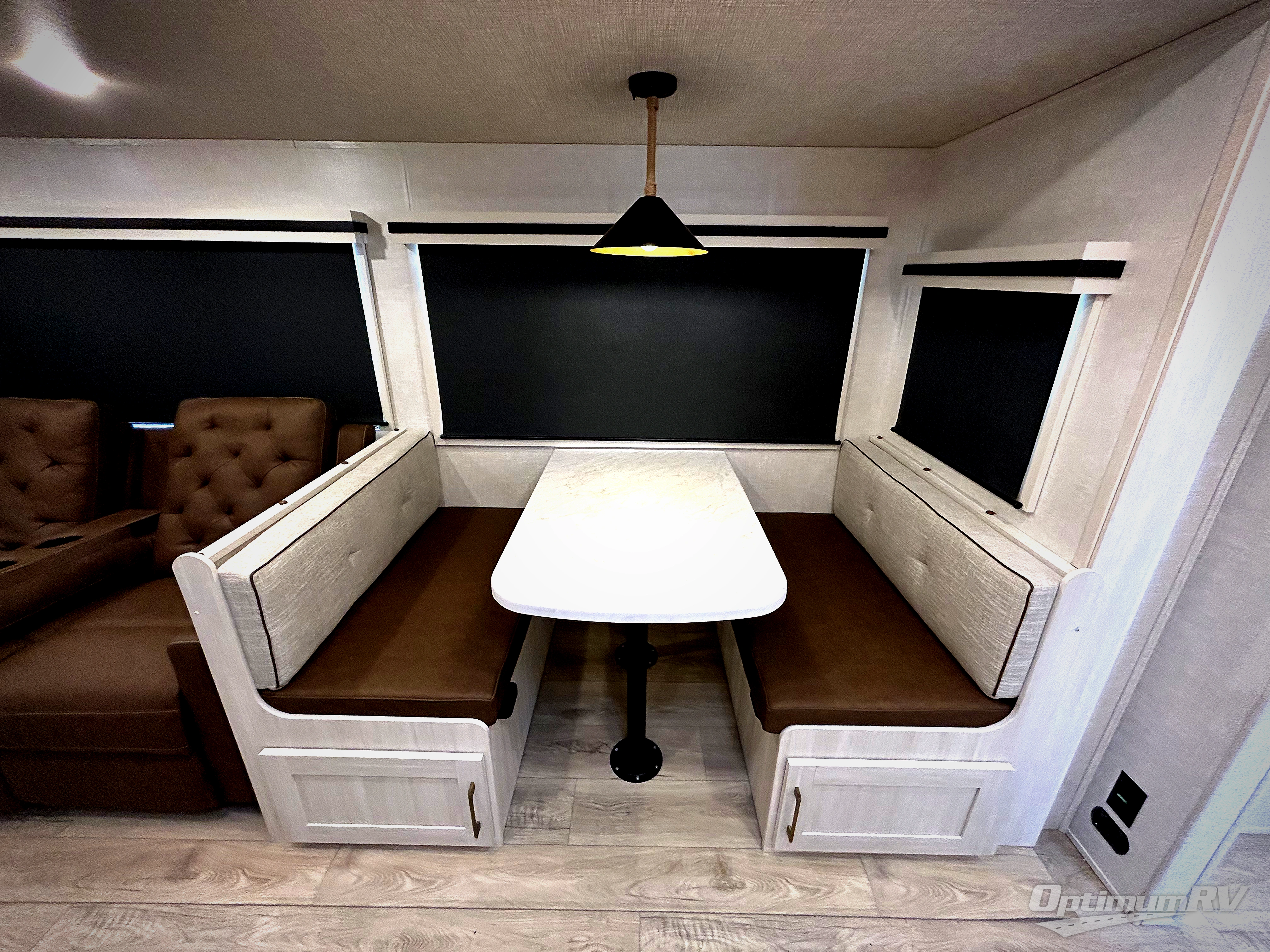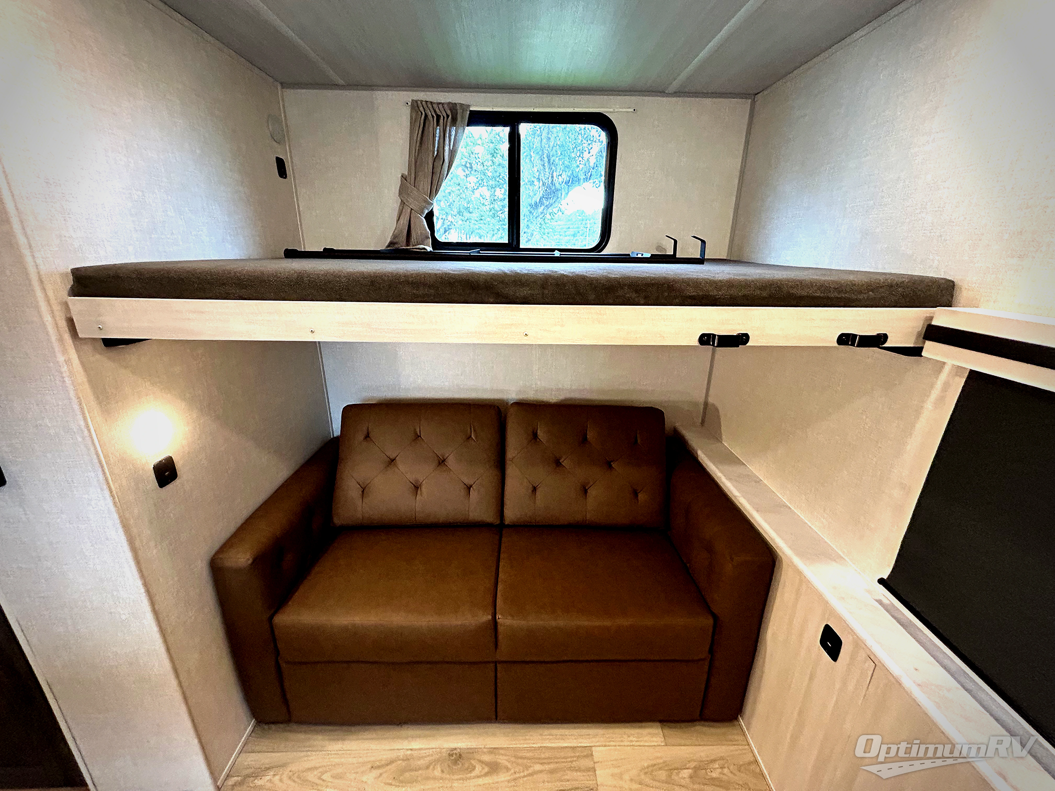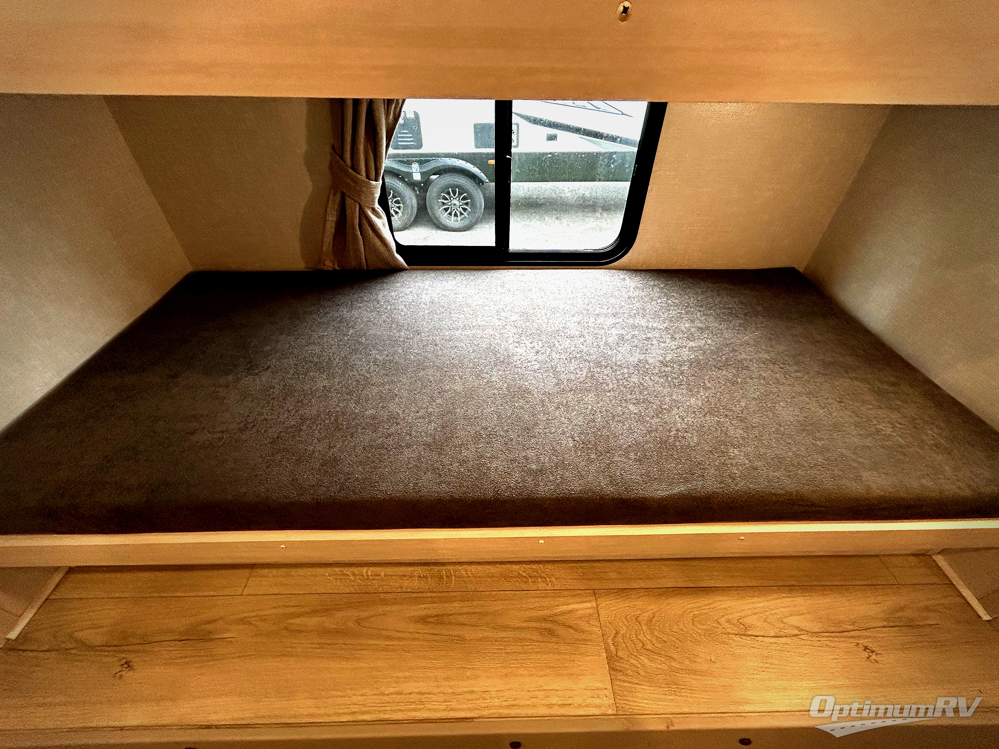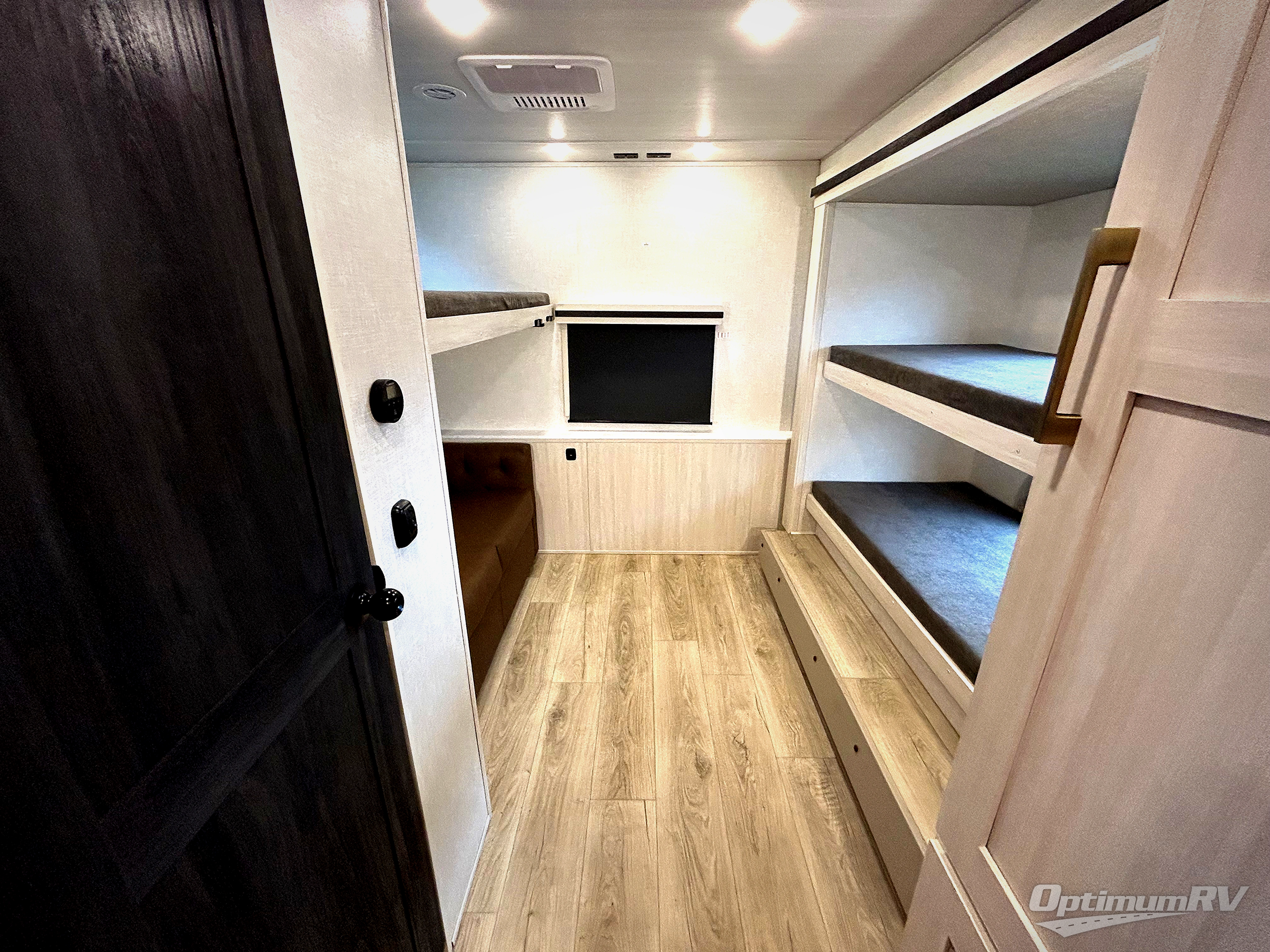 This travel trailer is perfect for larger groups or families since it can sleep up to ten people each night! There is a private bunkhouse with three bunks, a tri-fold sofa, plus storage space and a removable table! The front master bedroom is just as accommodating with its dual bedroom wardrobes, overhead cabinets, and quick access to the walk-through bath. The main living are will be a favorite hangout spot with a tri-fold sofa, a booth dinette, and an HD TV for movies. And a walk-in pantry with washer and dryer prep gives you the option to add these appliances. The chef of your group can cook meals in the fully-equipped kitchen, or head outdoors to cook on the outside kitchen. There is also a 21' electric awning here with LED lights for an inviting outdoor living space.