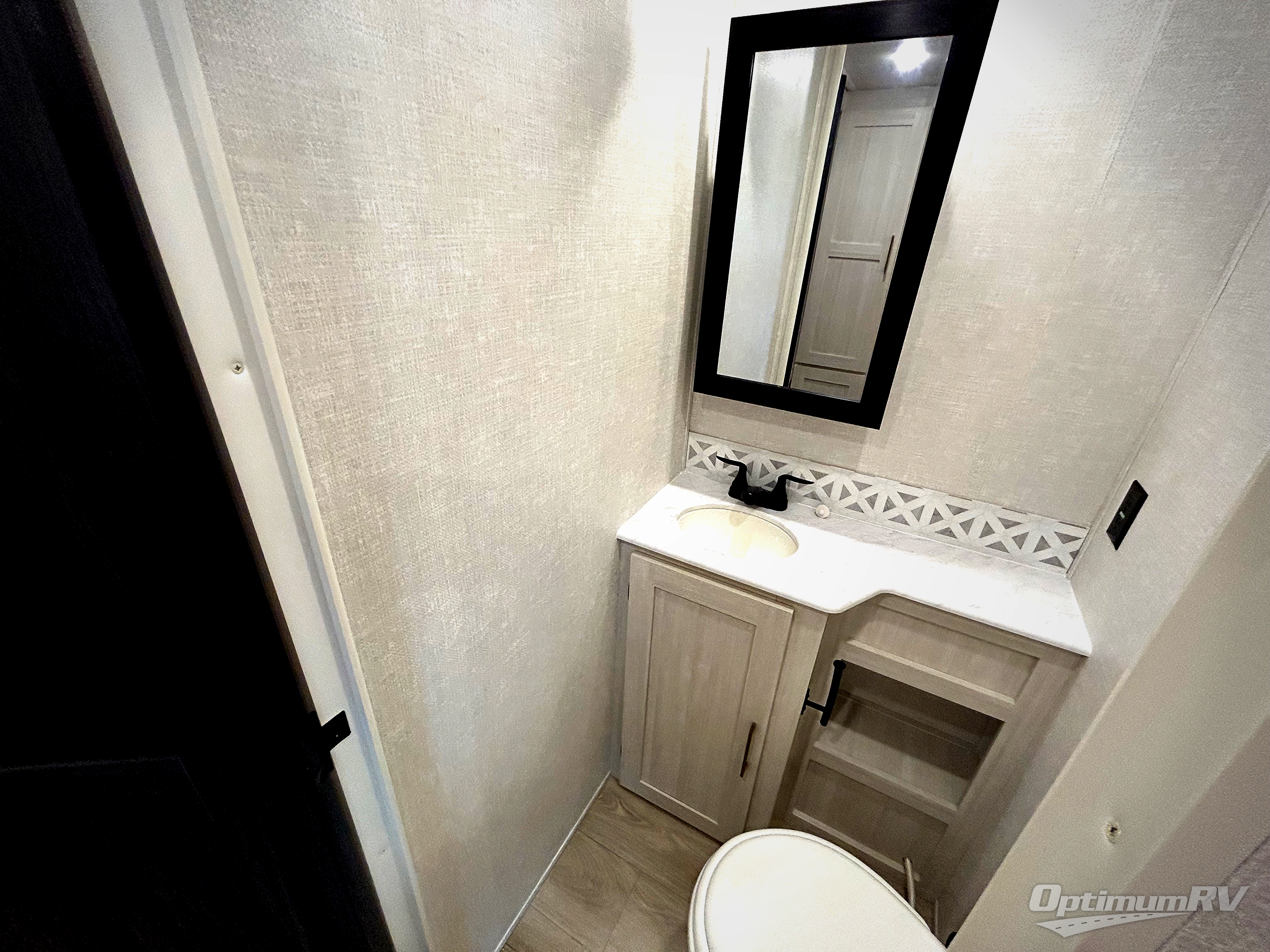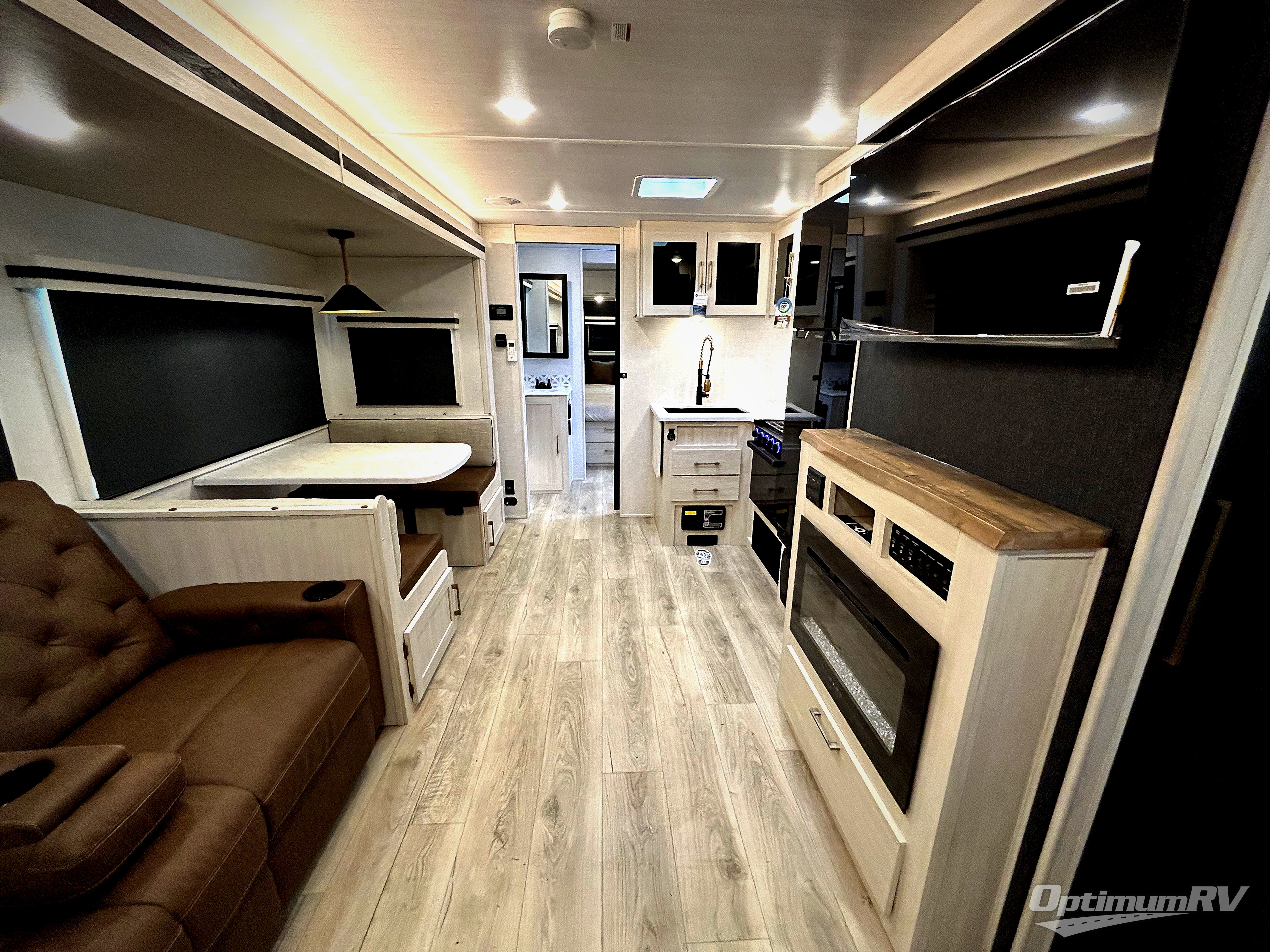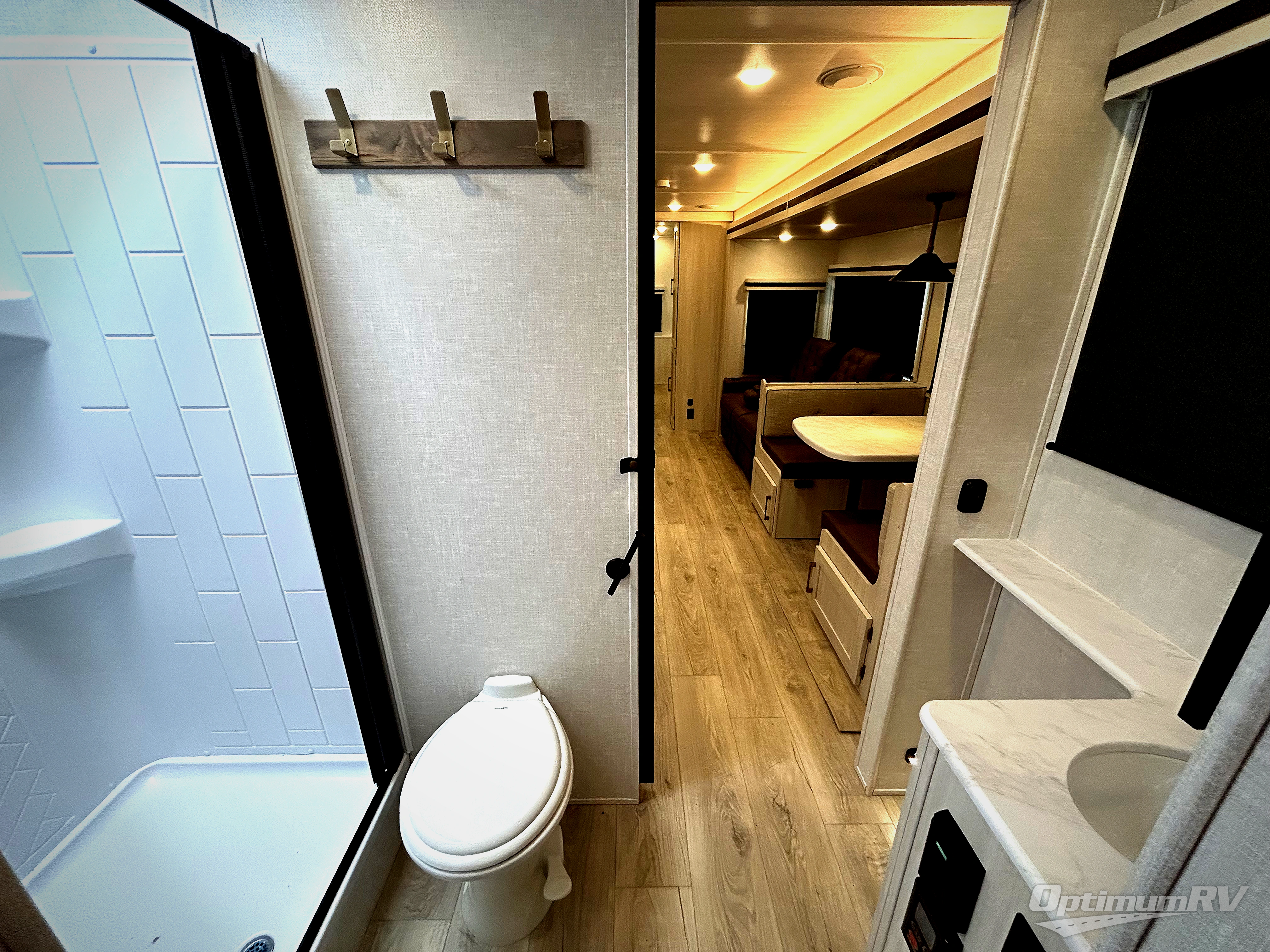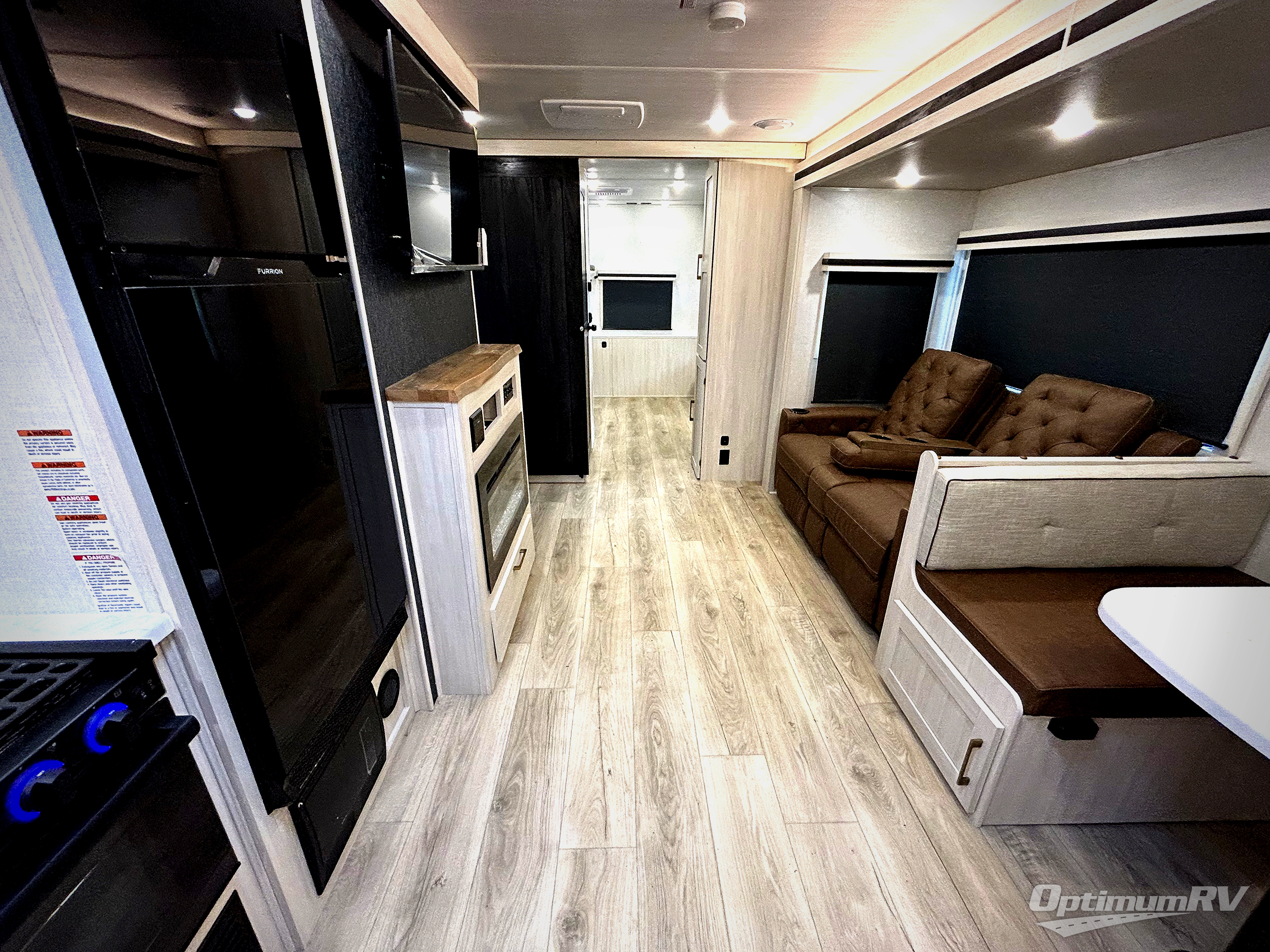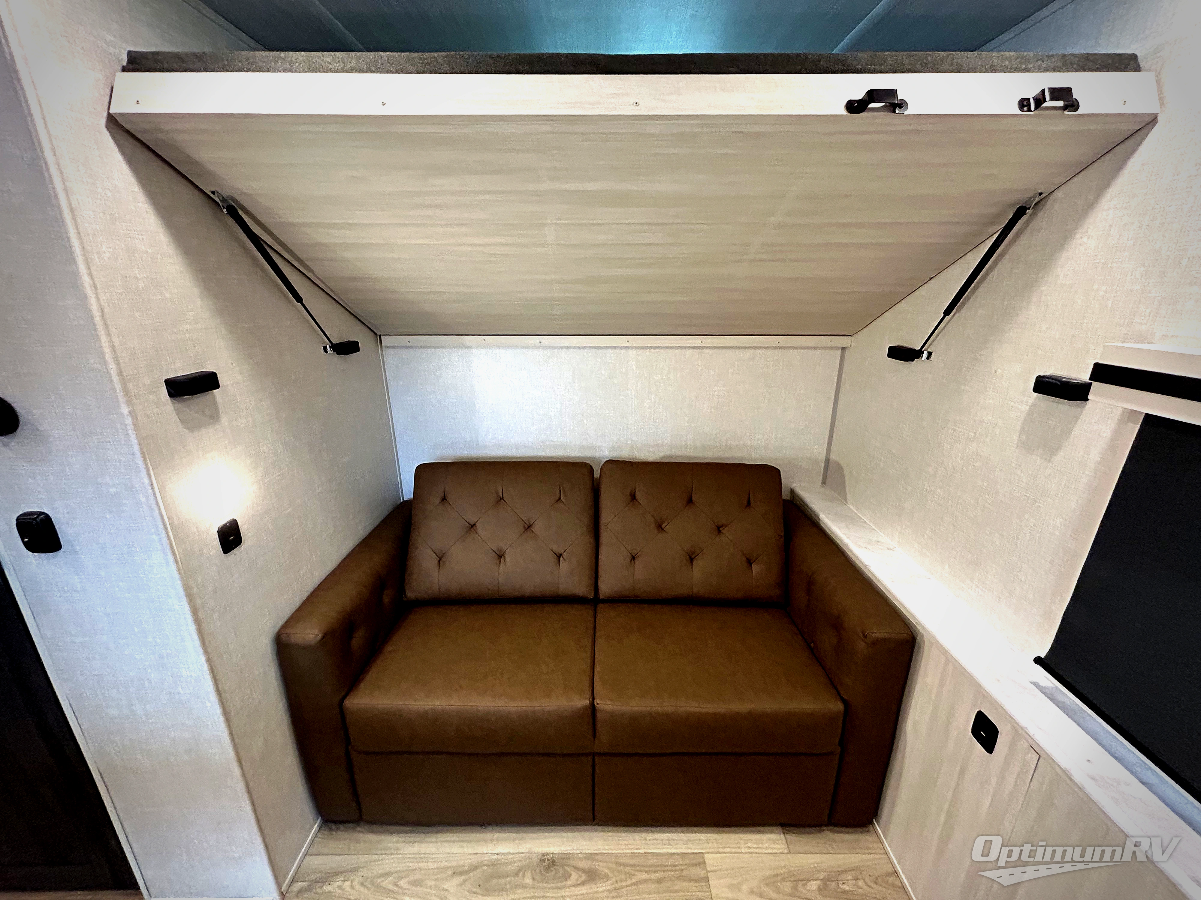 This travel trailer is perfect for larger groups or families since it can sleep up to ten people each night! There is a private bunkhouse with three bunks, a tri-fold sofa, plus storage space and a removable table! The front master bedroom is just as accommodating with its dual bedroom wardrobes, overhead cabinets, and quick access to the walk-through bath. The main living are will be a favorite hangout spot with a tri-fold sofa, a booth dinette, and an HD TV for movies. And a walk-in pantry with washer and dryer prep gives you the option to add these appliances. The chef of your group can cook meals in the fully-equipped kitchen, or head outdoors to cook on the outside kitchen. There is also a 21' electric awning here with LED lights for an inviting outdoor living space.
