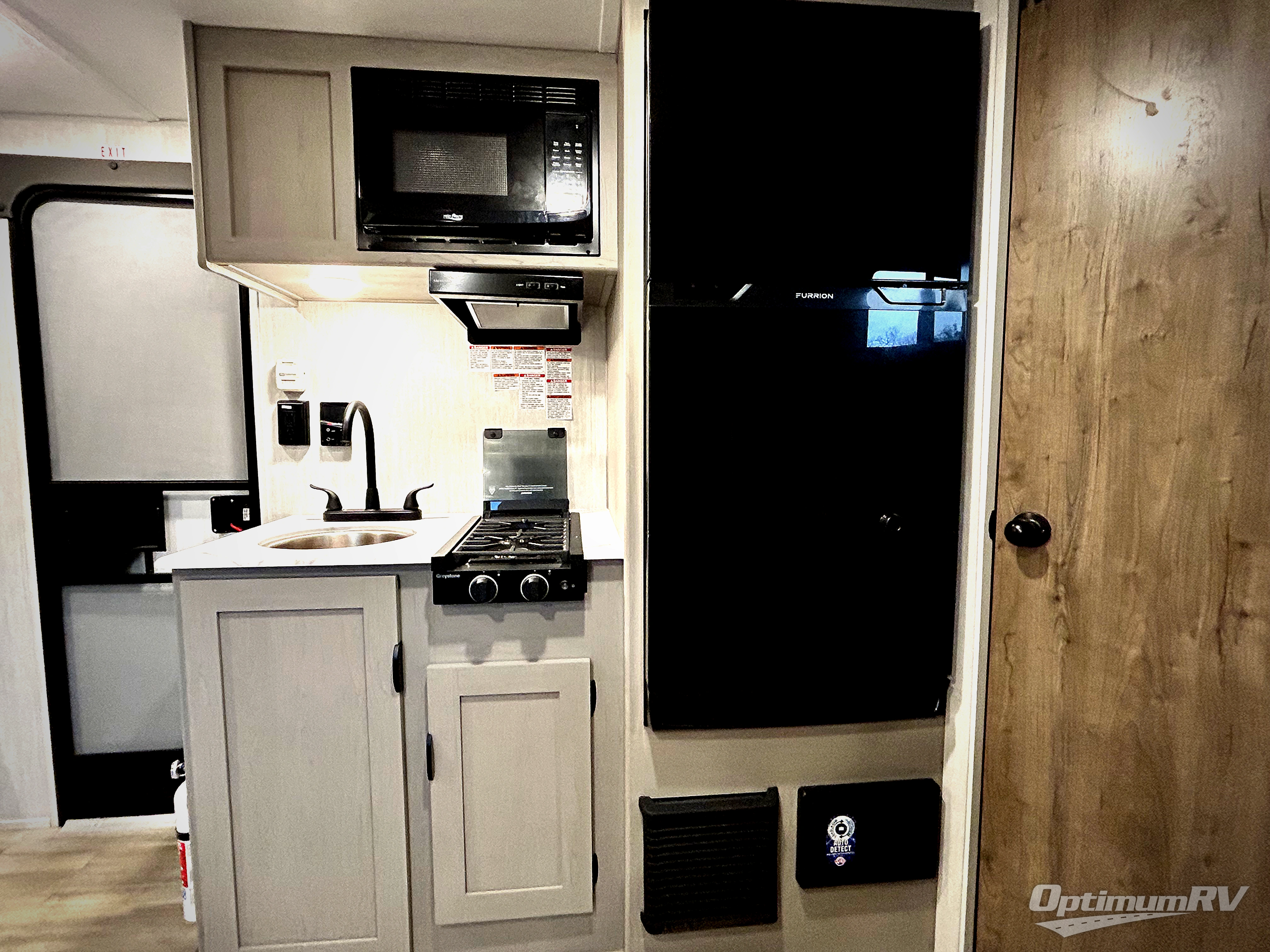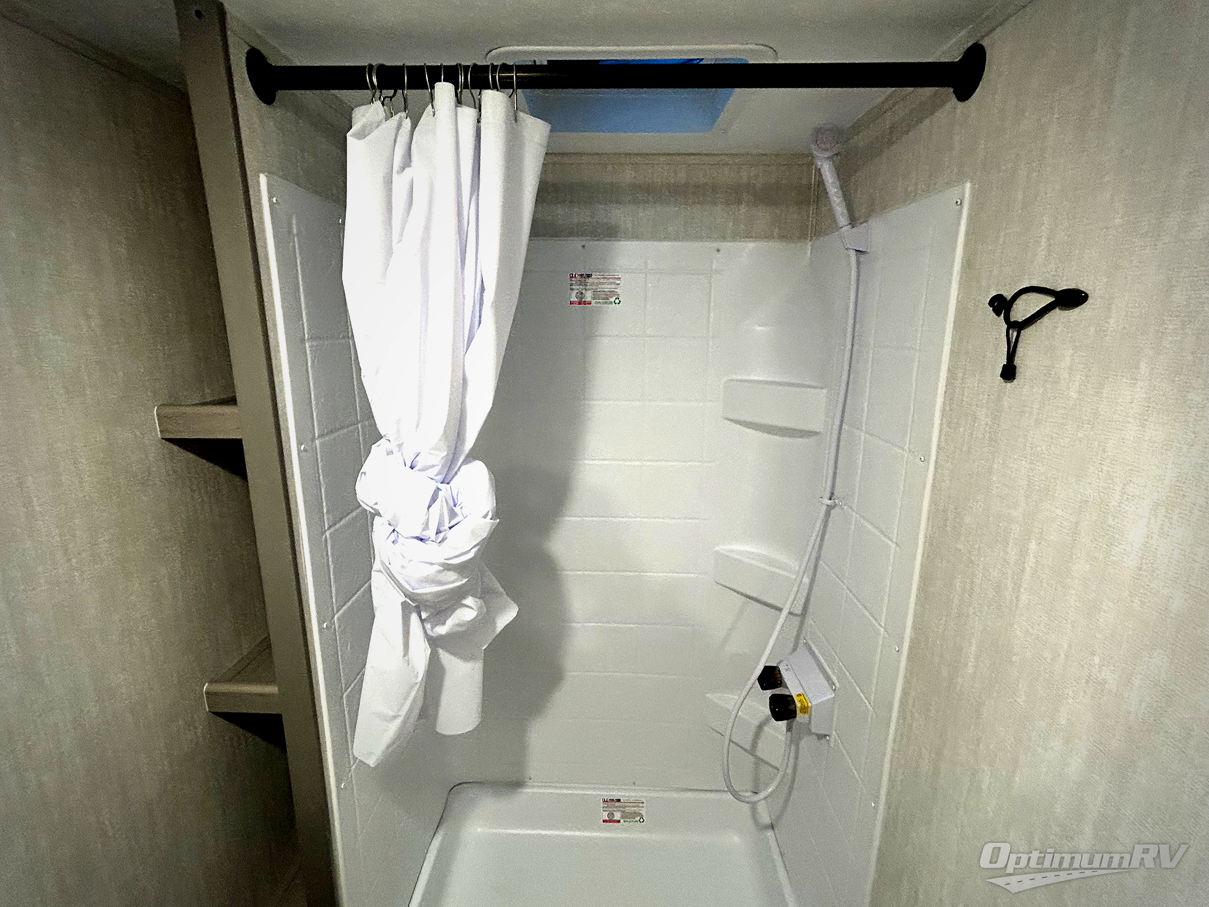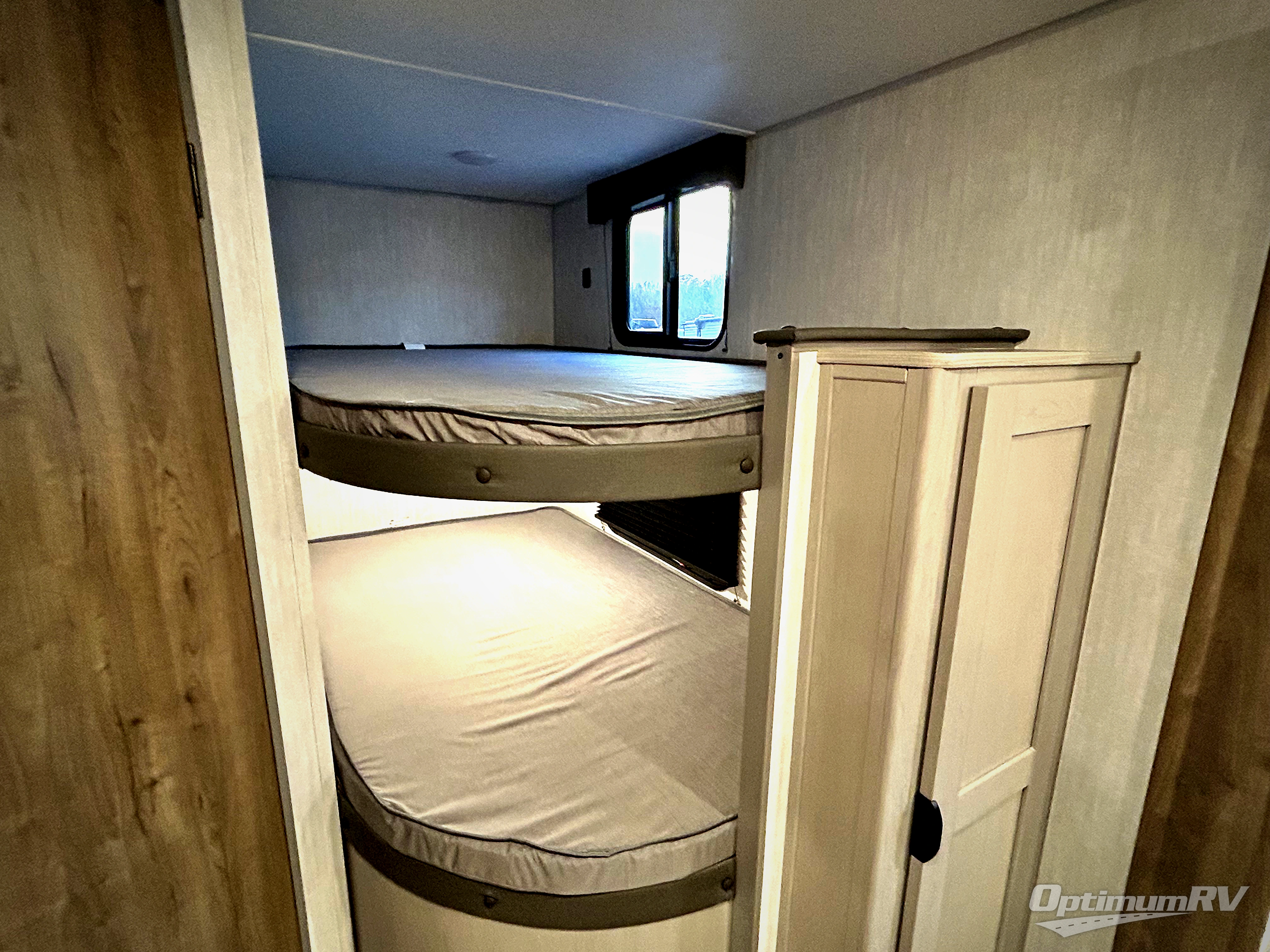 This versatile trailer easily sleeps a family of six and provides plenty of seating thanks to the versatile front hidden Murphy bed and U-dinette. During the day, the U-dinette provides seating for the whole gang. At night, move the table and cushions and flip down a comfortable bed. There is a jackknife sofa slide, and opposite you will find the kitchen area allowing you to easily whip up meals and snacks using the two burner cooktop, sink, overhead microwave oven, and refrigerator. A pantry cabinet is also available for all of your dry goods. At the rear of this unit, you will find sleeping for four on the double-size bunks along the roadside corner, and a full bath with a shower, toilet, and vanity with a sink and medicine cabinet along the curbside corner.