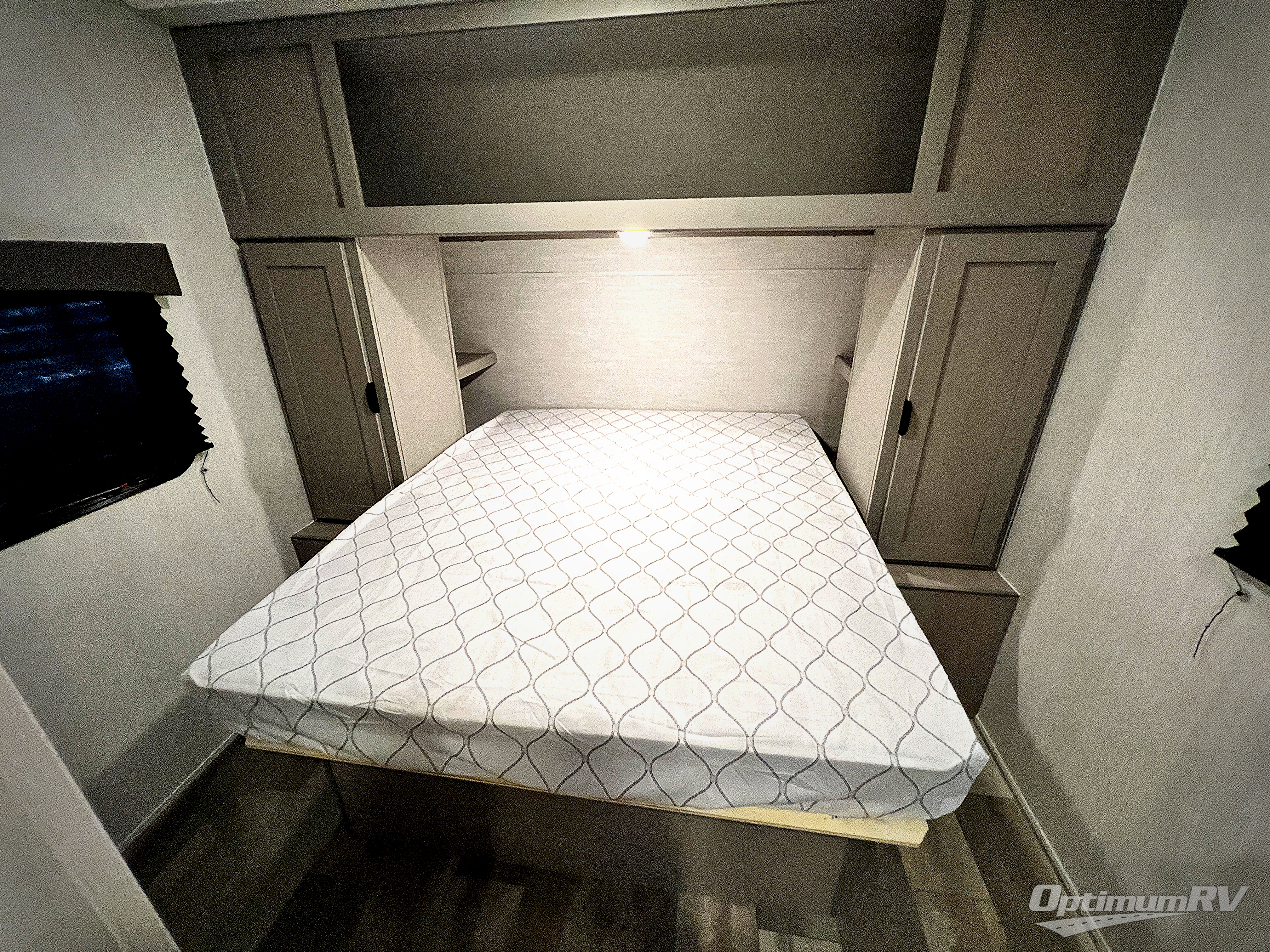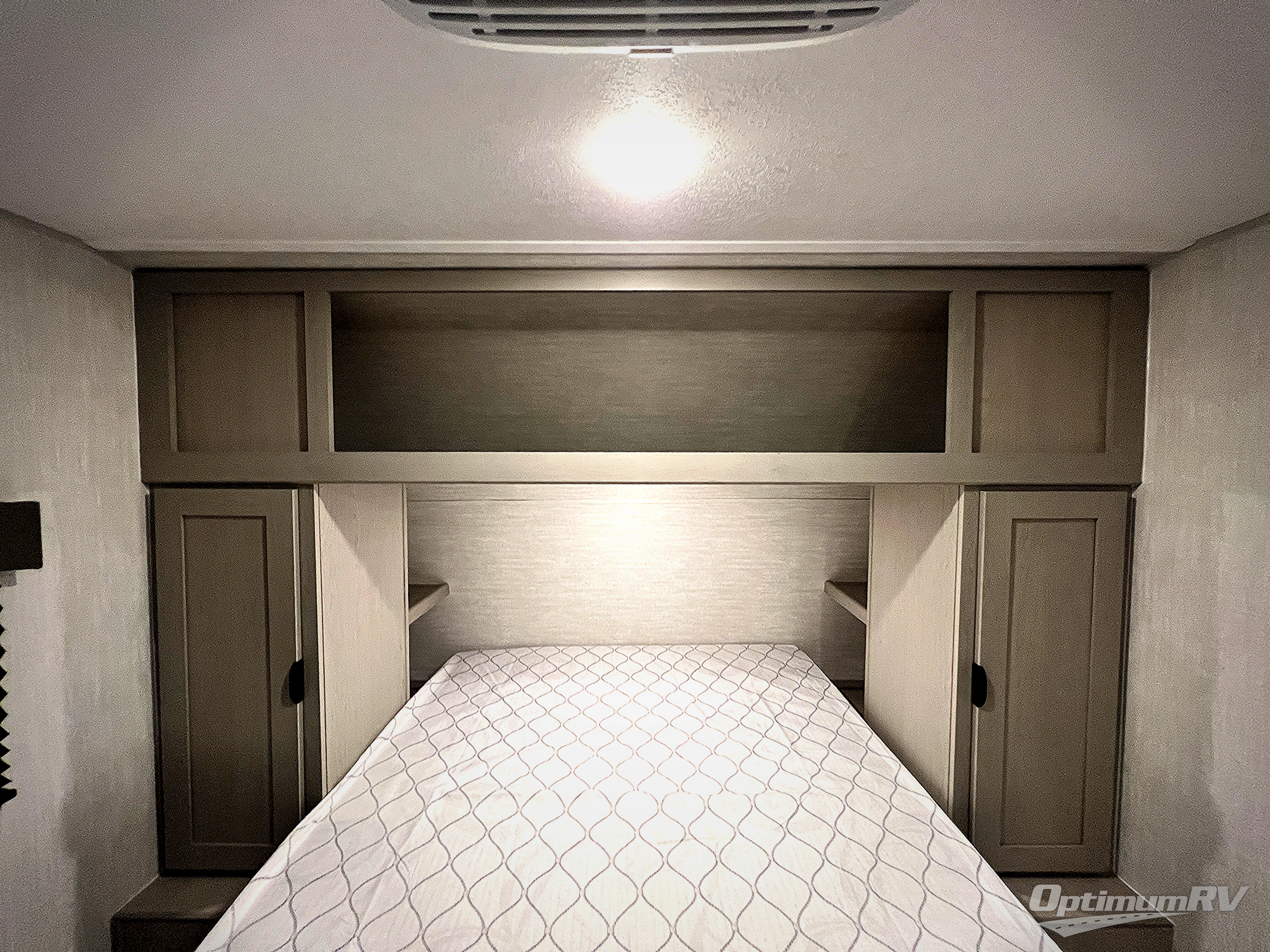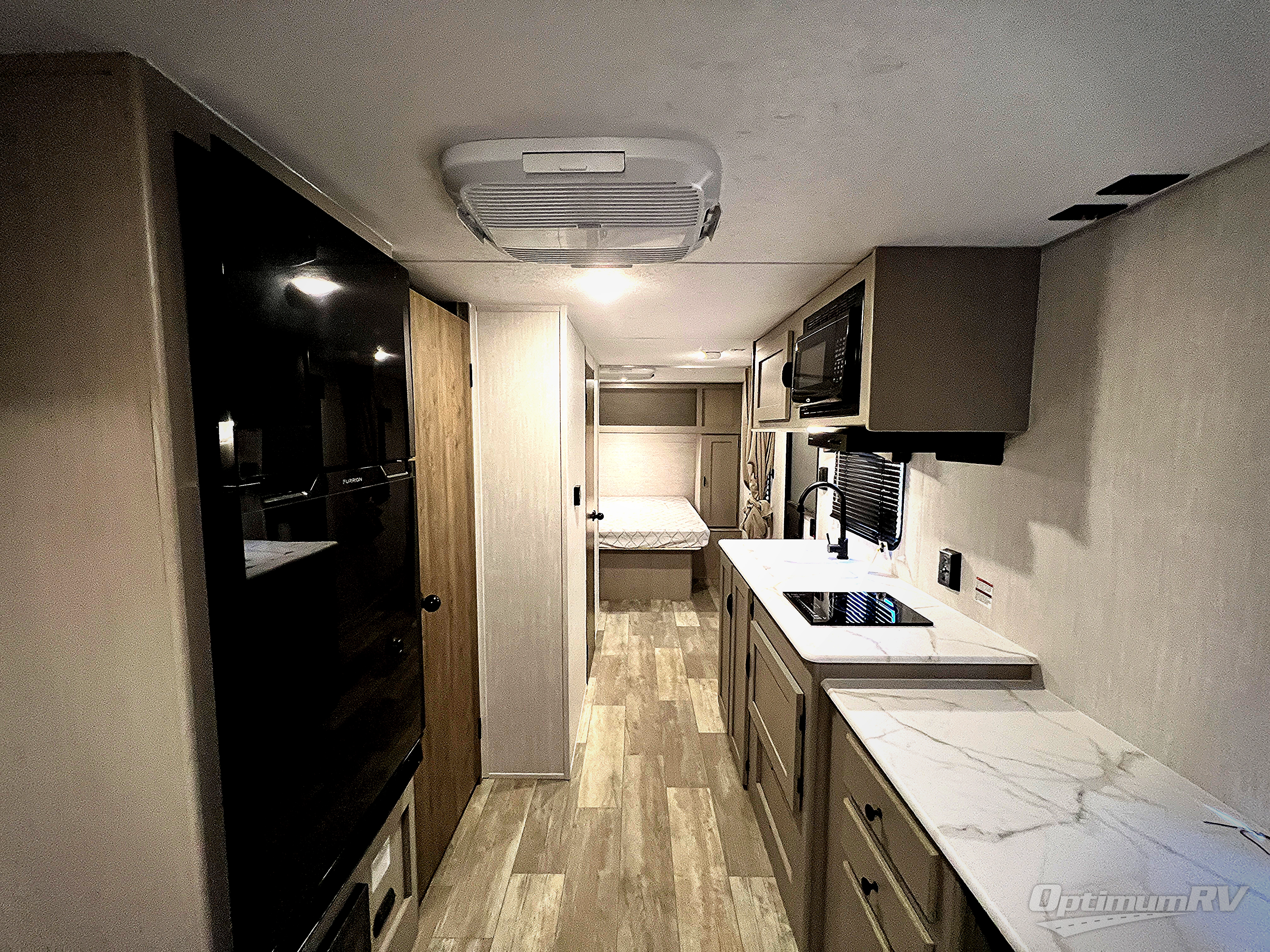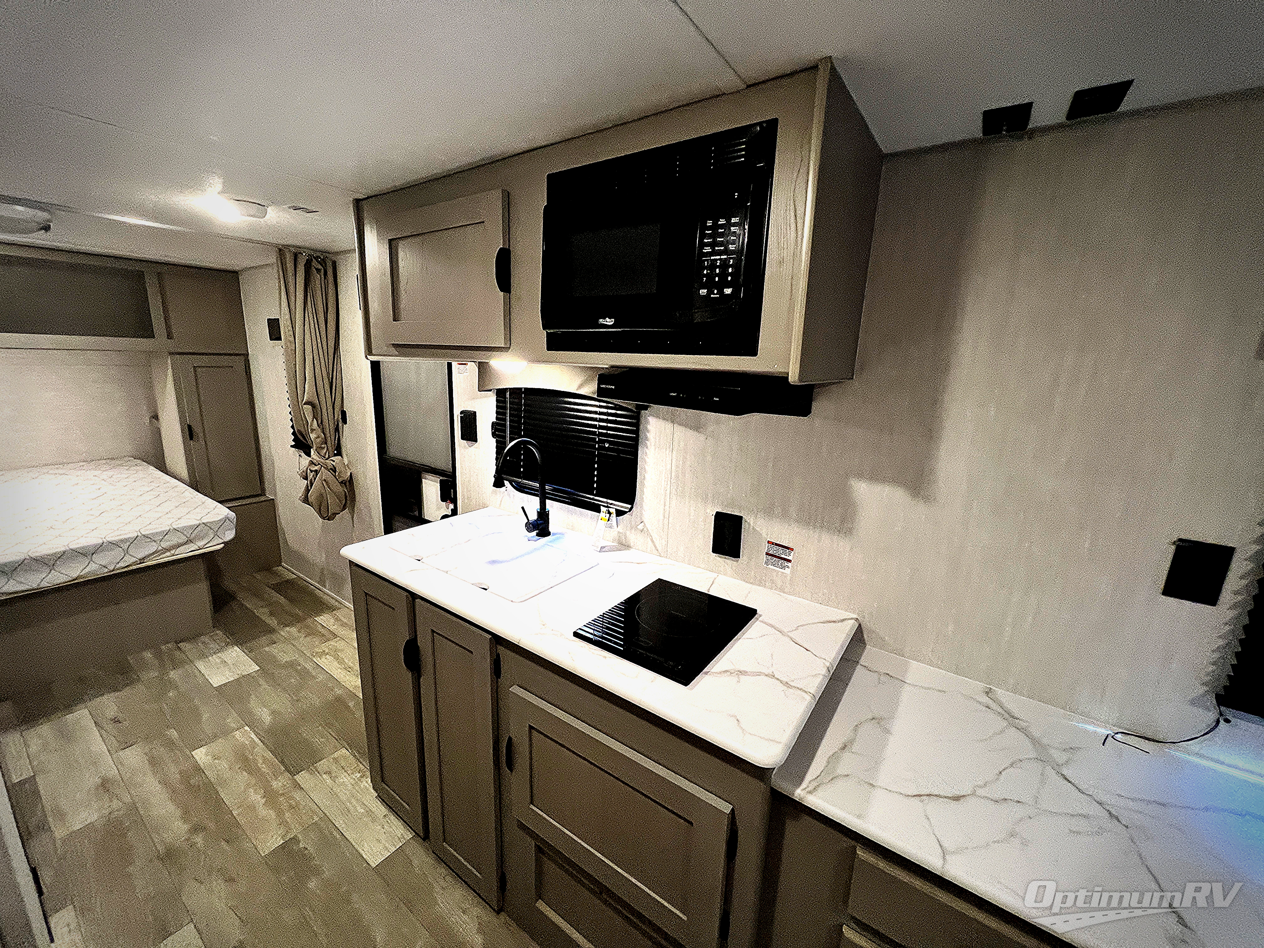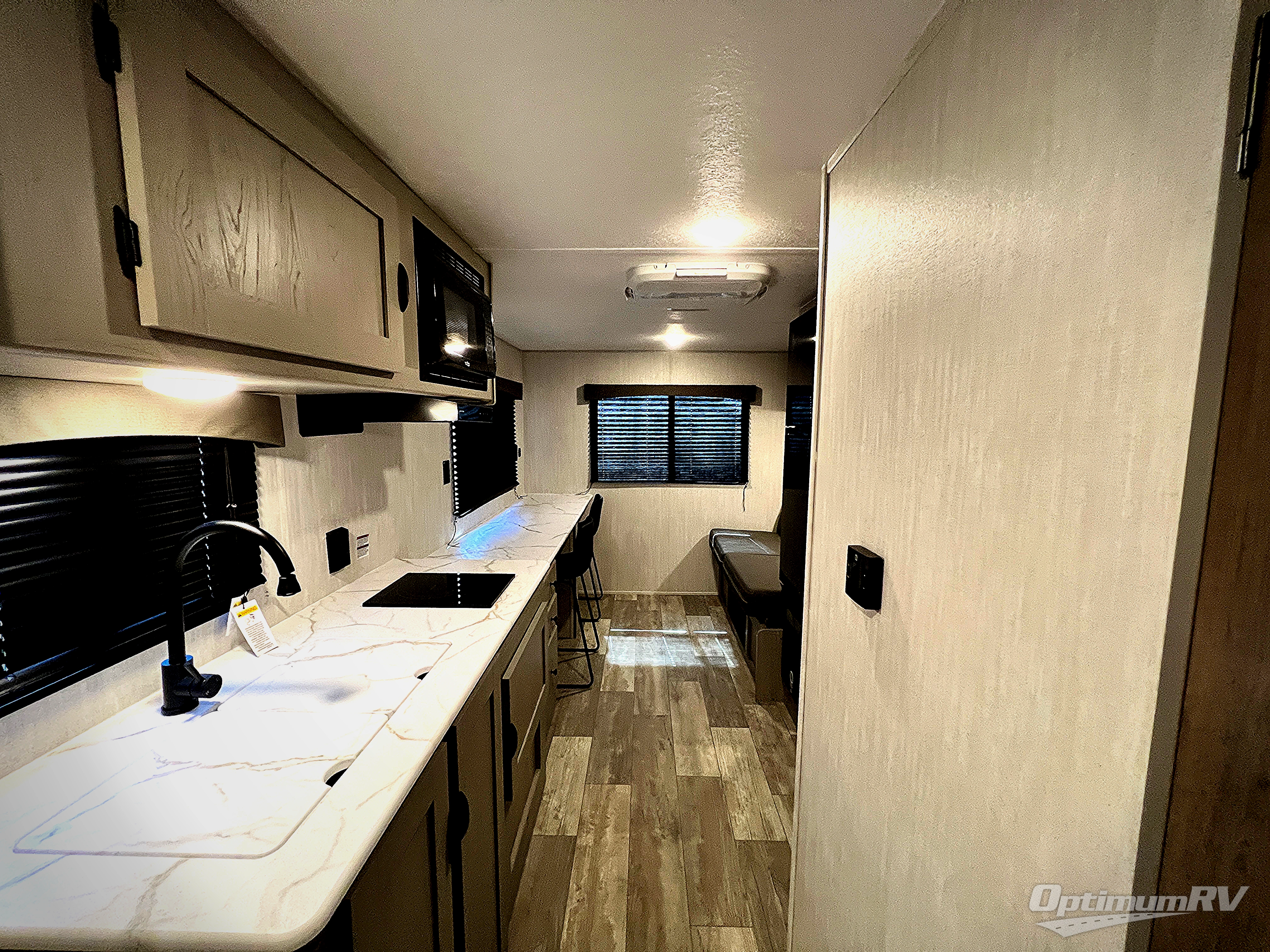 Time spent in this travel trailer will be time well spent! There is a front bedroom with a 60" x 74" queen bed, dual wardrobes, and a private shelf on either side of the bed to keep your belongings close by. A three burner cooktop and microwave will let you make meals each day, and an 8 cu. ft. 12V refrigerator and pantry will help keep food stocked. This unit includes a large countertop with two barstools in the back where you can dine together, along with a jack knife sofa on the other side for a place to relax!
