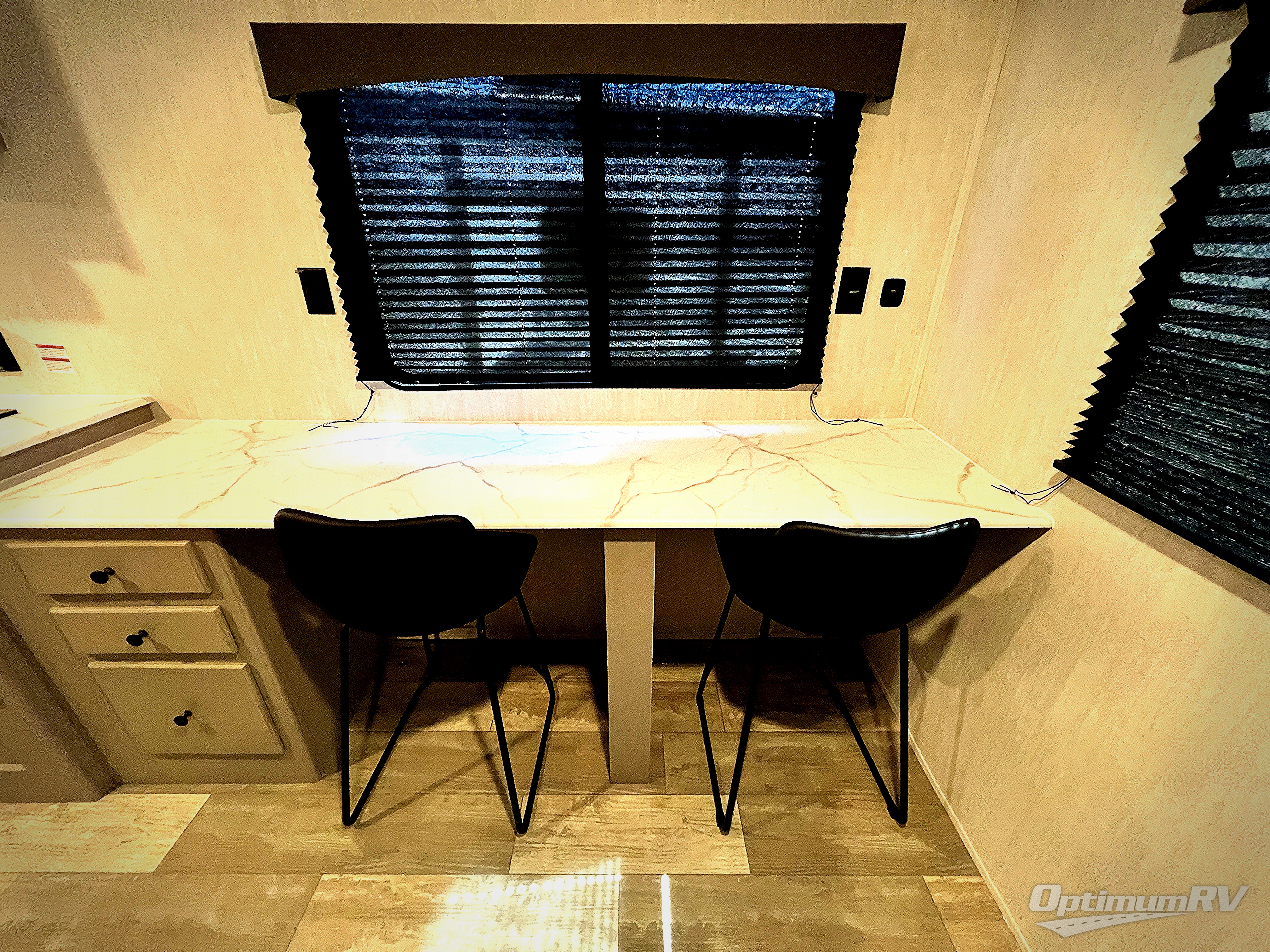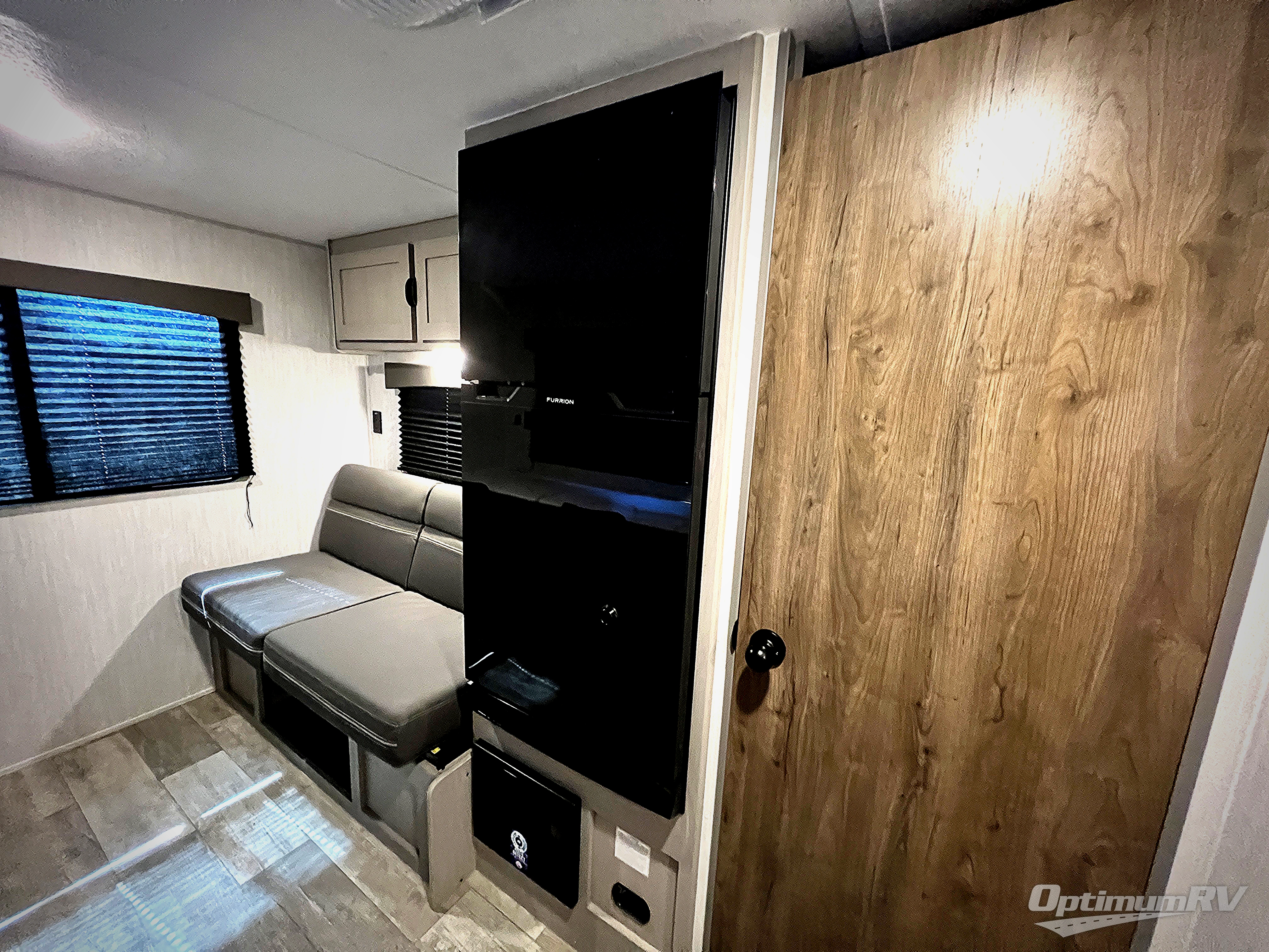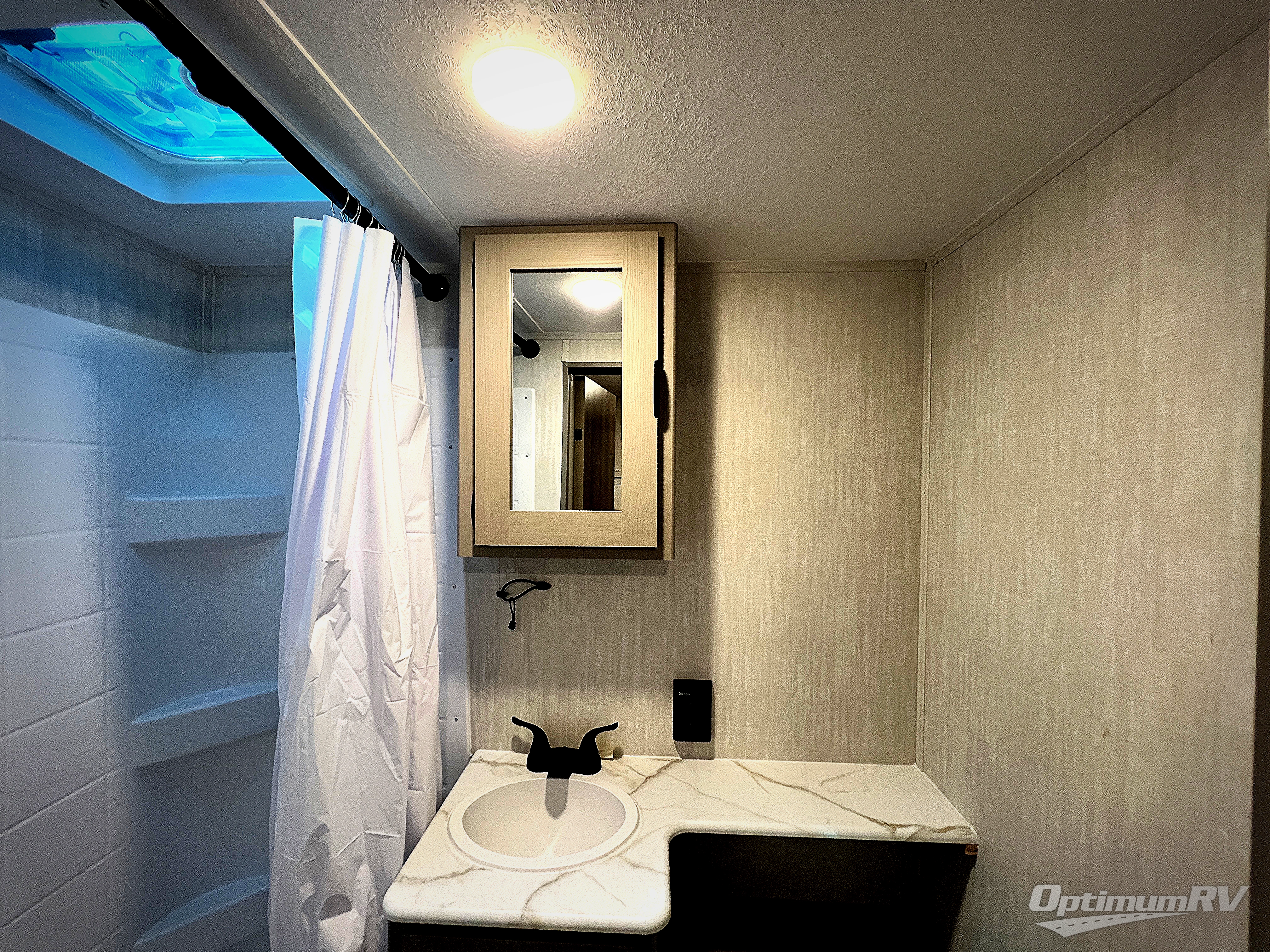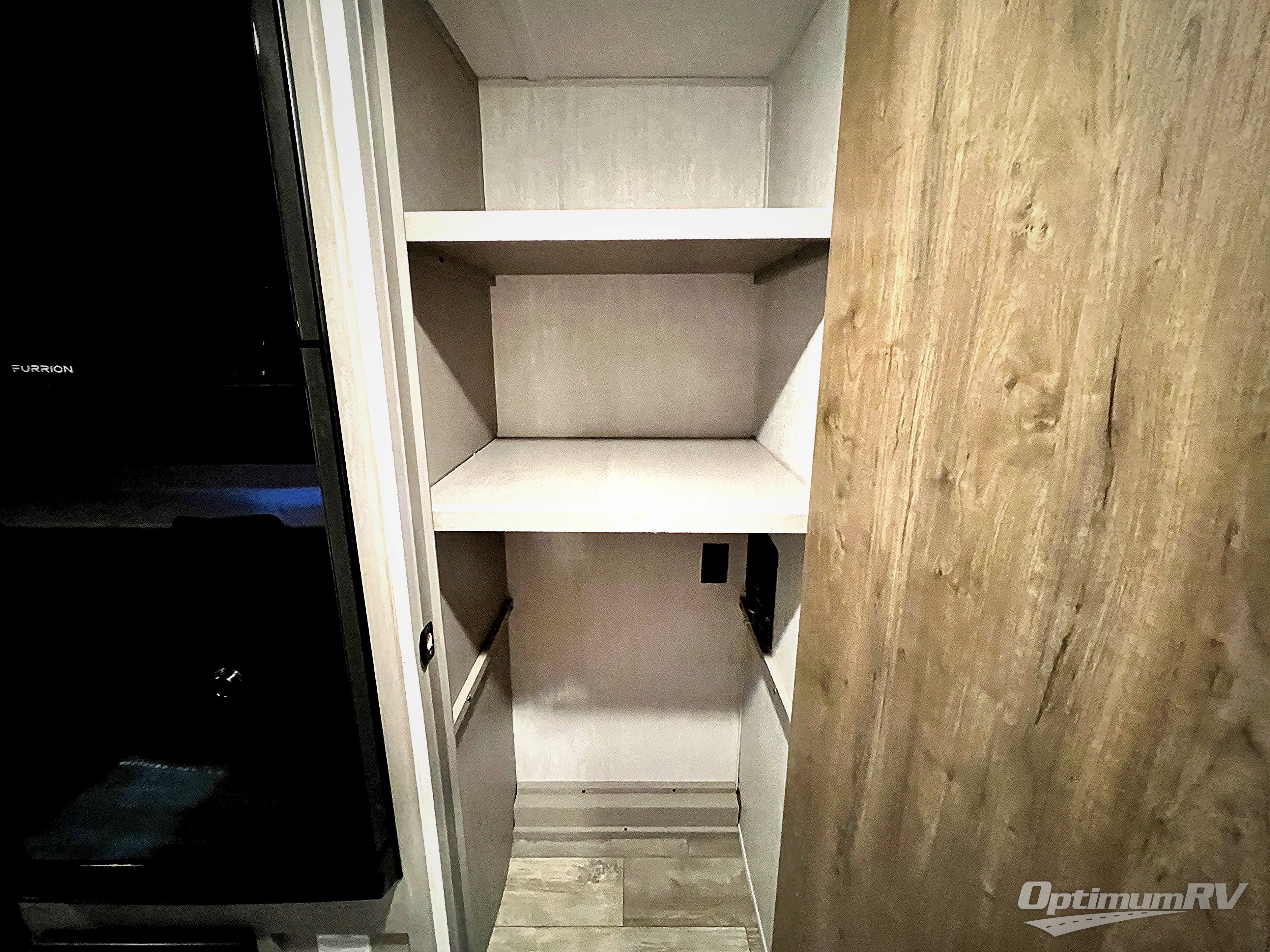 Time spent in this travel trailer will be time well spent! There is a front bedroom with a 60" x 74" queen bed, dual wardrobes, and a private shelf on either side of the bed to keep your belongings close by. A three burner cooktop and microwave will let you make meals each day, and an 8 cu. ft. 12V refrigerator and pantry will help keep food stocked. This unit includes a large countertop with two barstools in the back where you can dine together, along with a jack knife sofa on the other side for a place to relax!