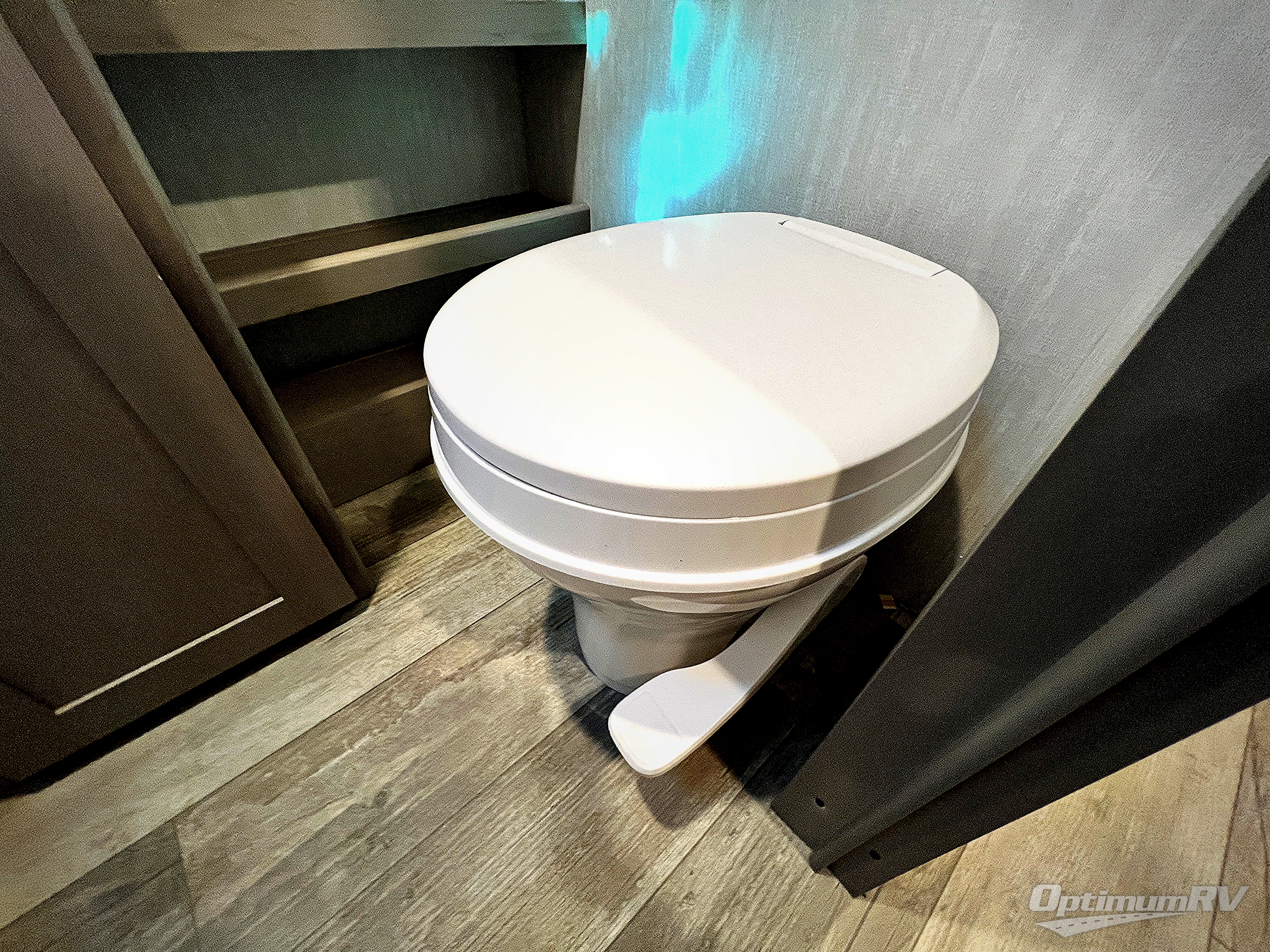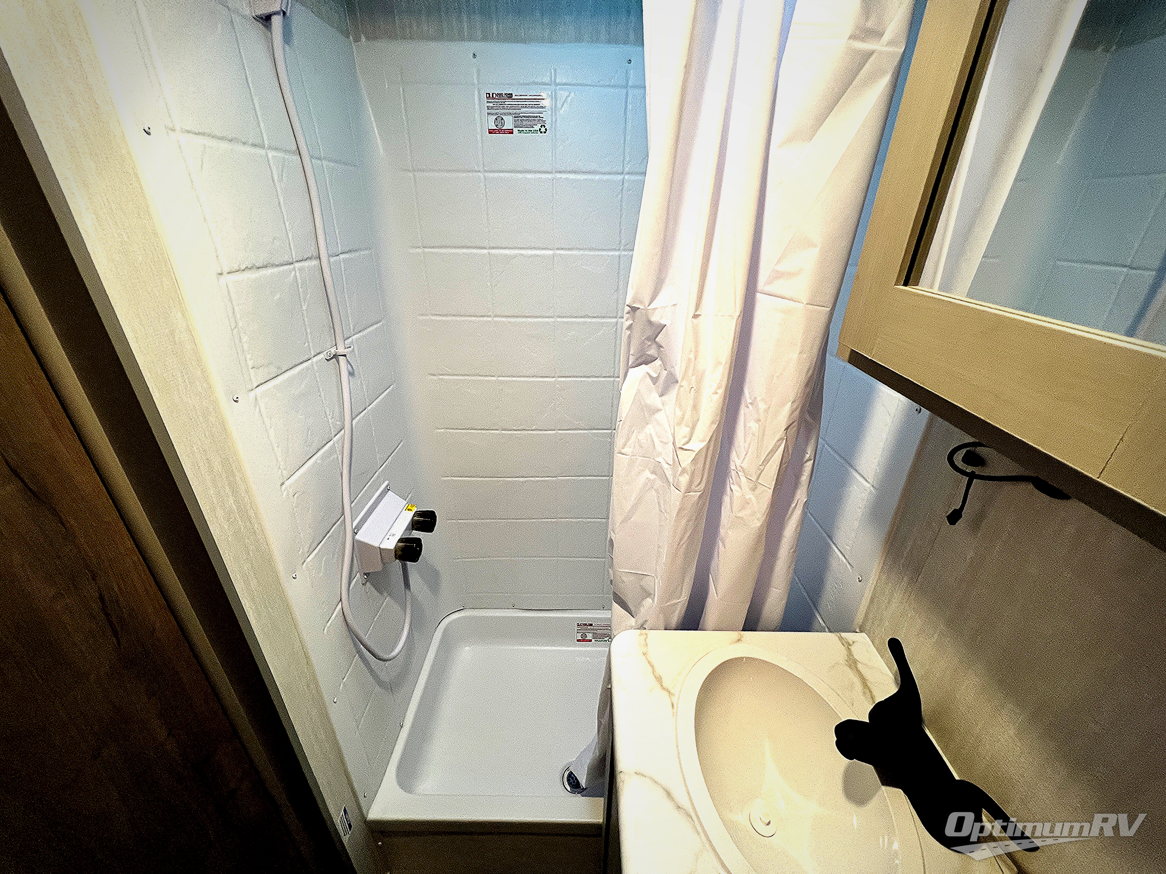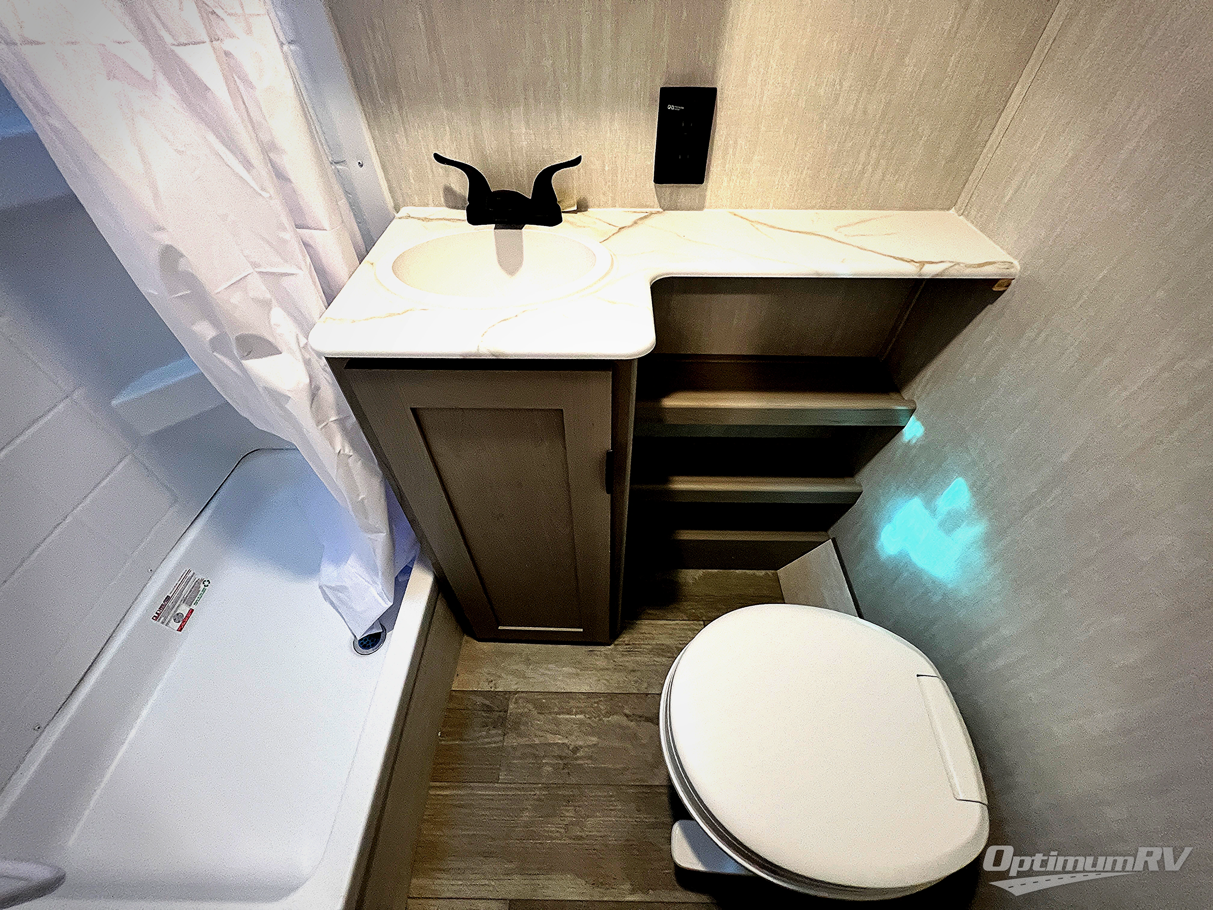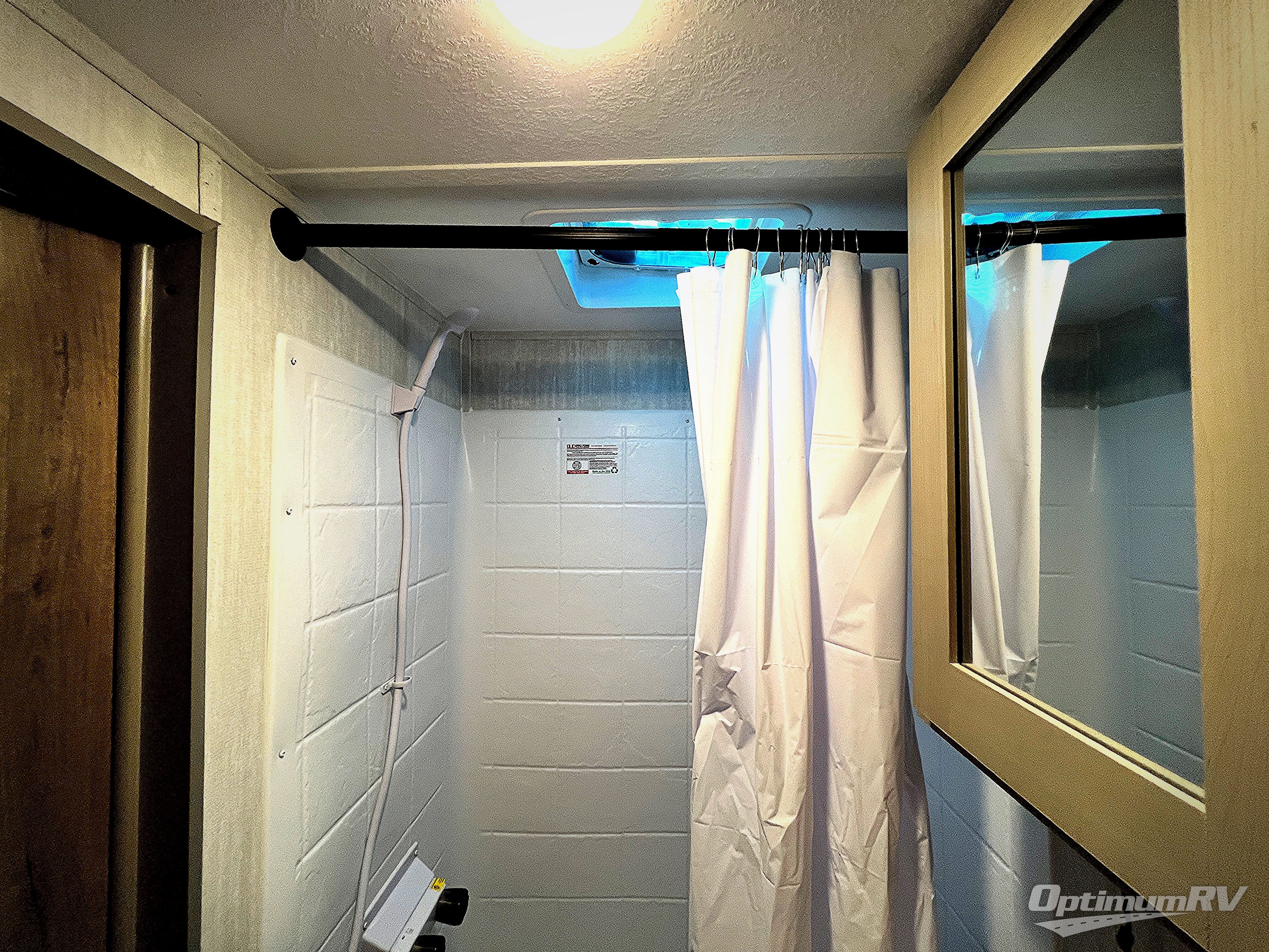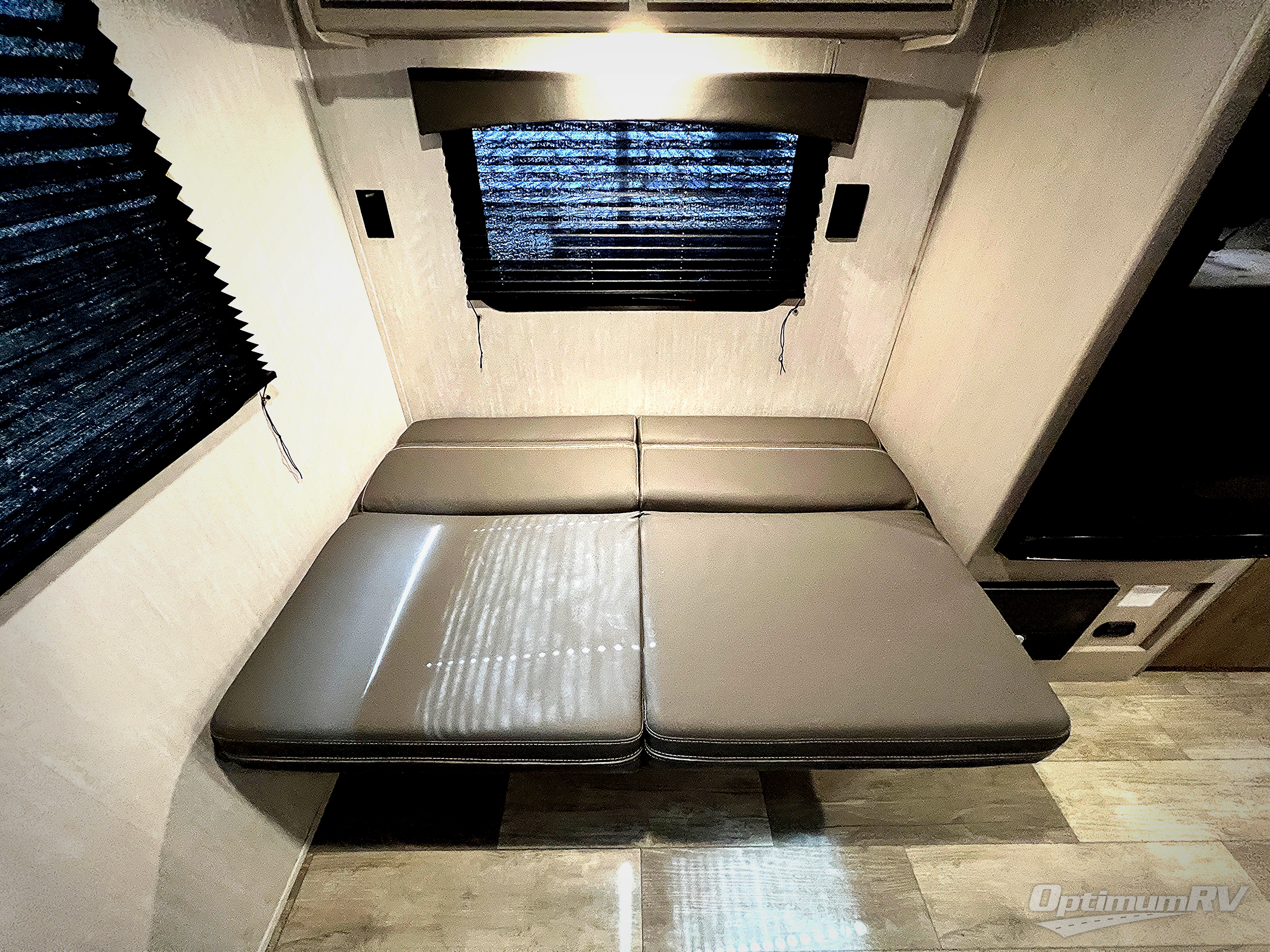 Time spent in this travel trailer will be time well spent! There is a front bedroom with a 60" x 74" queen bed, dual wardrobes, and a private shelf on either side of the bed to keep your belongings close by. A three burner cooktop and microwave will let you make meals each day, and an 8 cu. ft. 12V refrigerator and pantry will help keep food stocked. This unit includes a large countertop with two barstools in the back where you can dine together, along with a jack knife sofa on the other side for a place to relax!