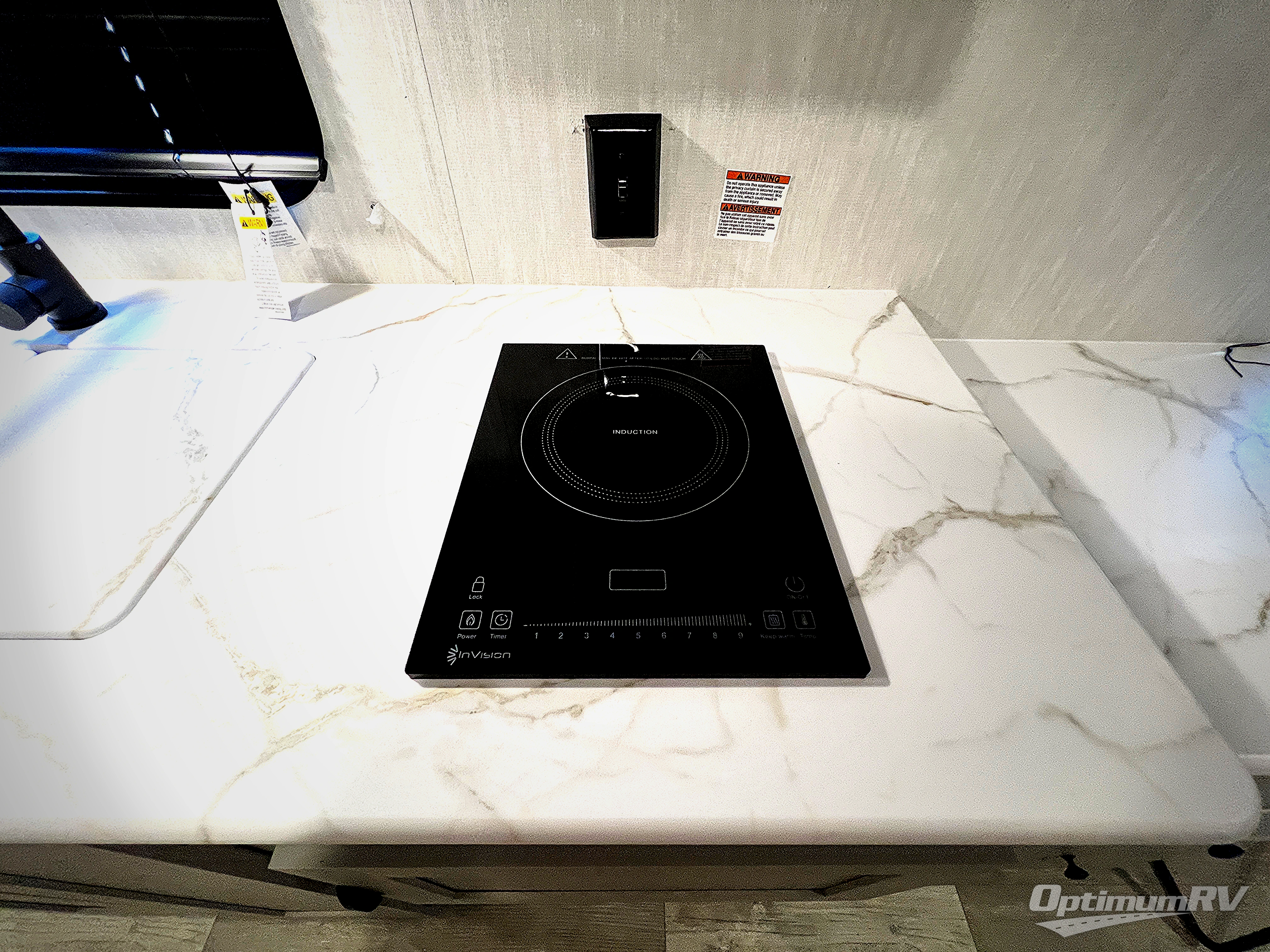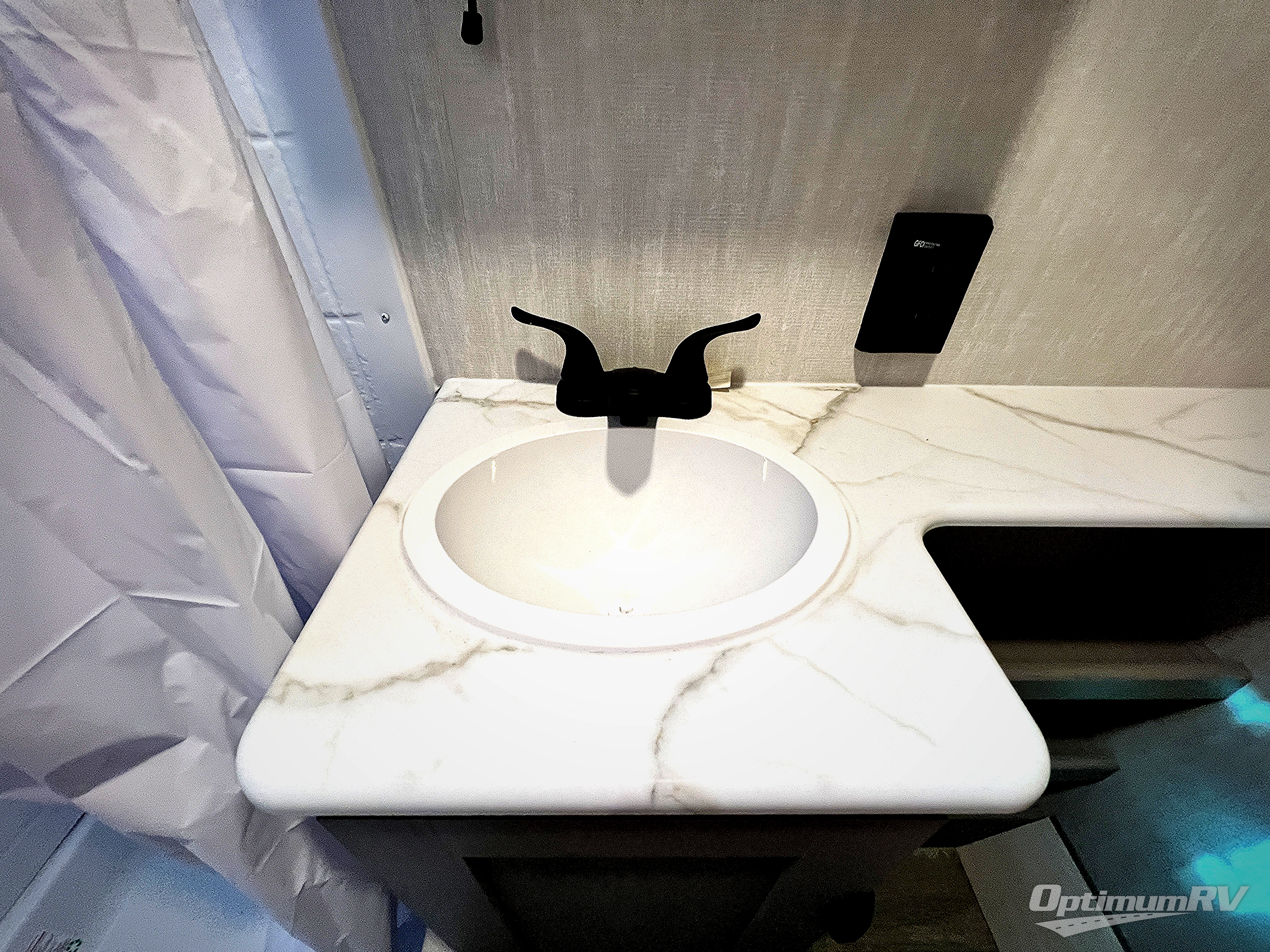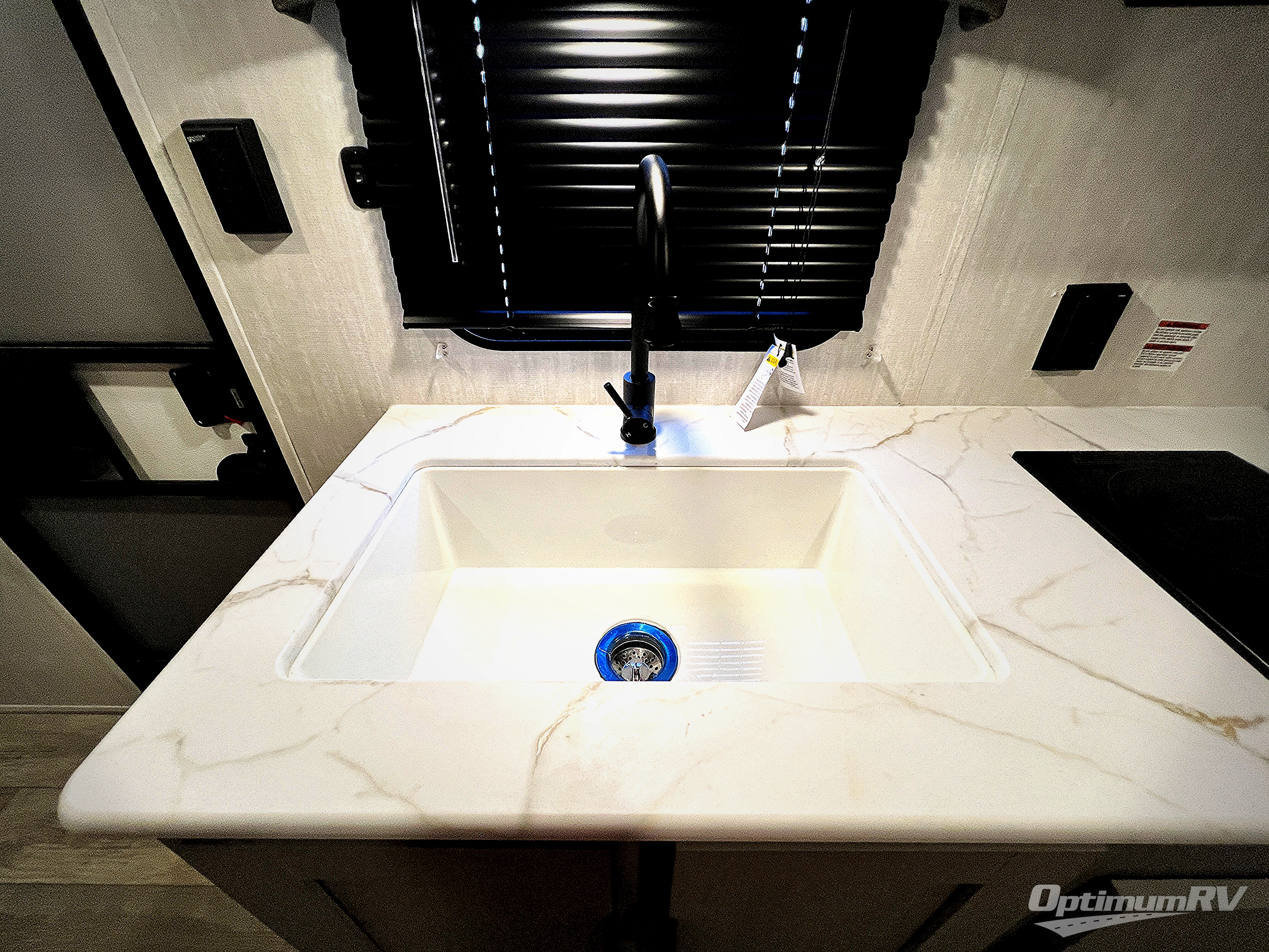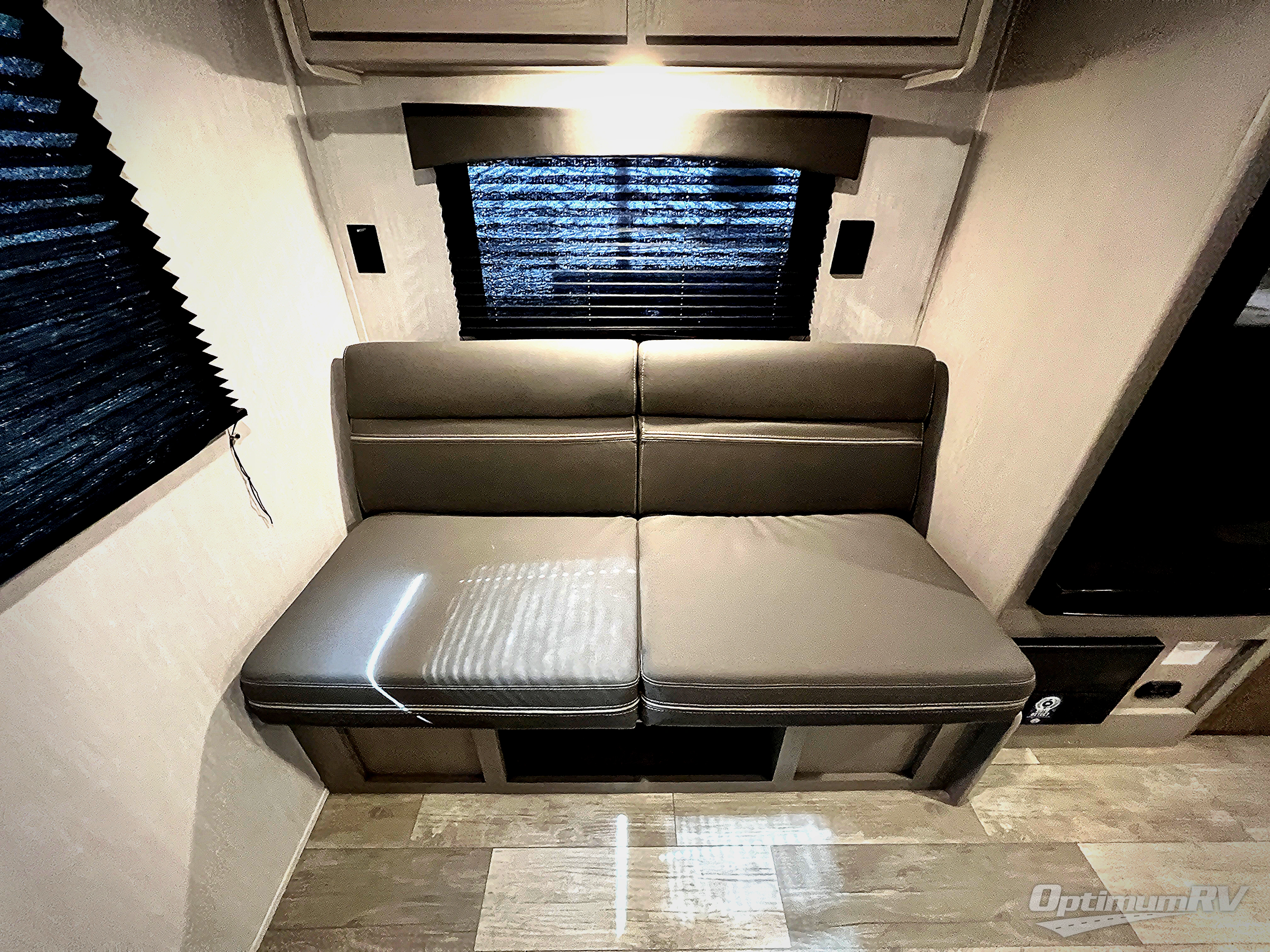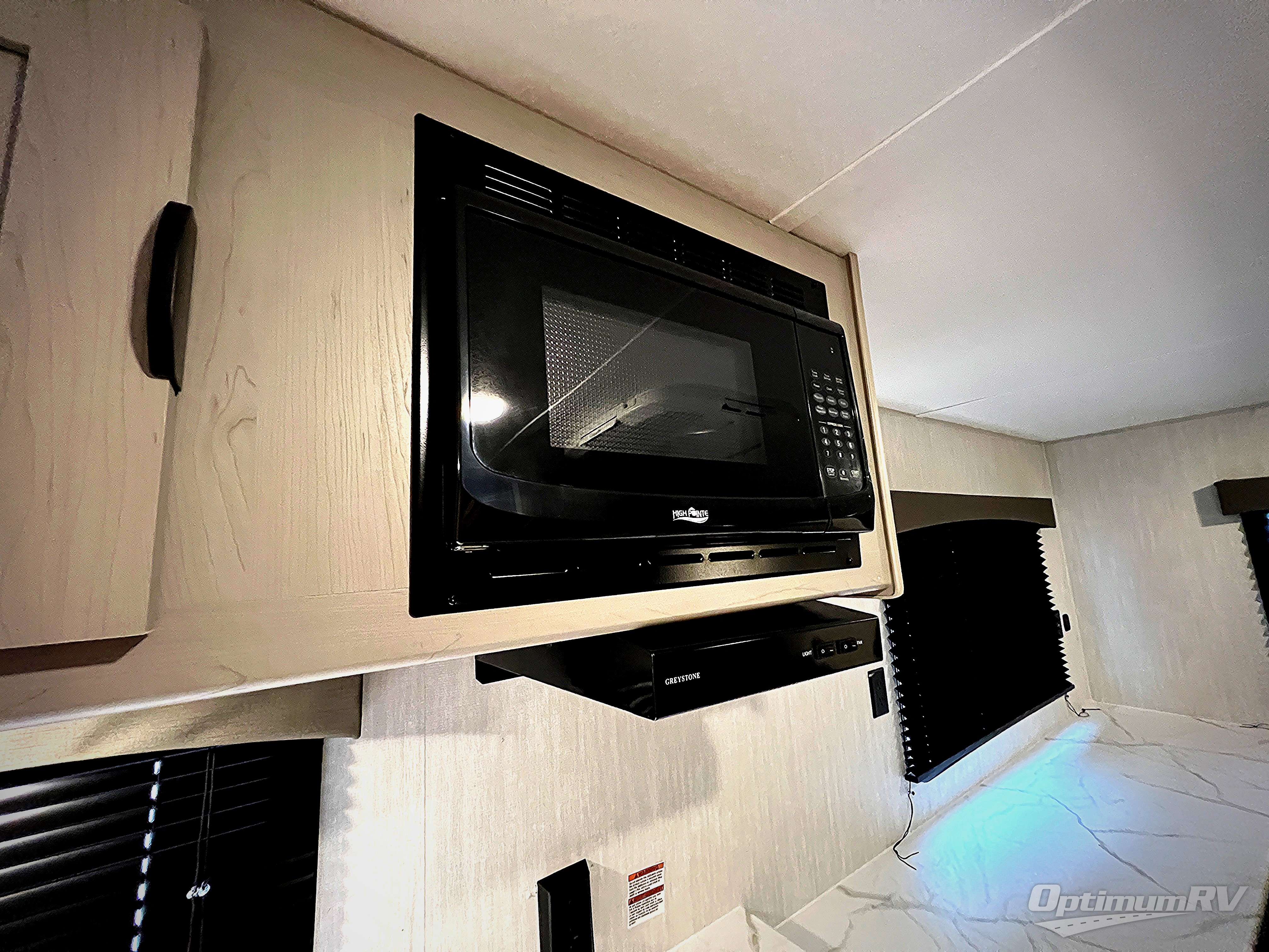 Time spent in this travel trailer will be time well spent! There is a front bedroom with a 60" x 74" queen bed, dual wardrobes, and a private shelf on either side of the bed to keep your belongings close by. A three burner cooktop and microwave will let you make meals each day, and an 8 cu. ft. 12V refrigerator and pantry will help keep food stocked. This unit includes a large countertop with two barstools in the back where you can dine together, along with a jack knife sofa on the other side for a place to relax!