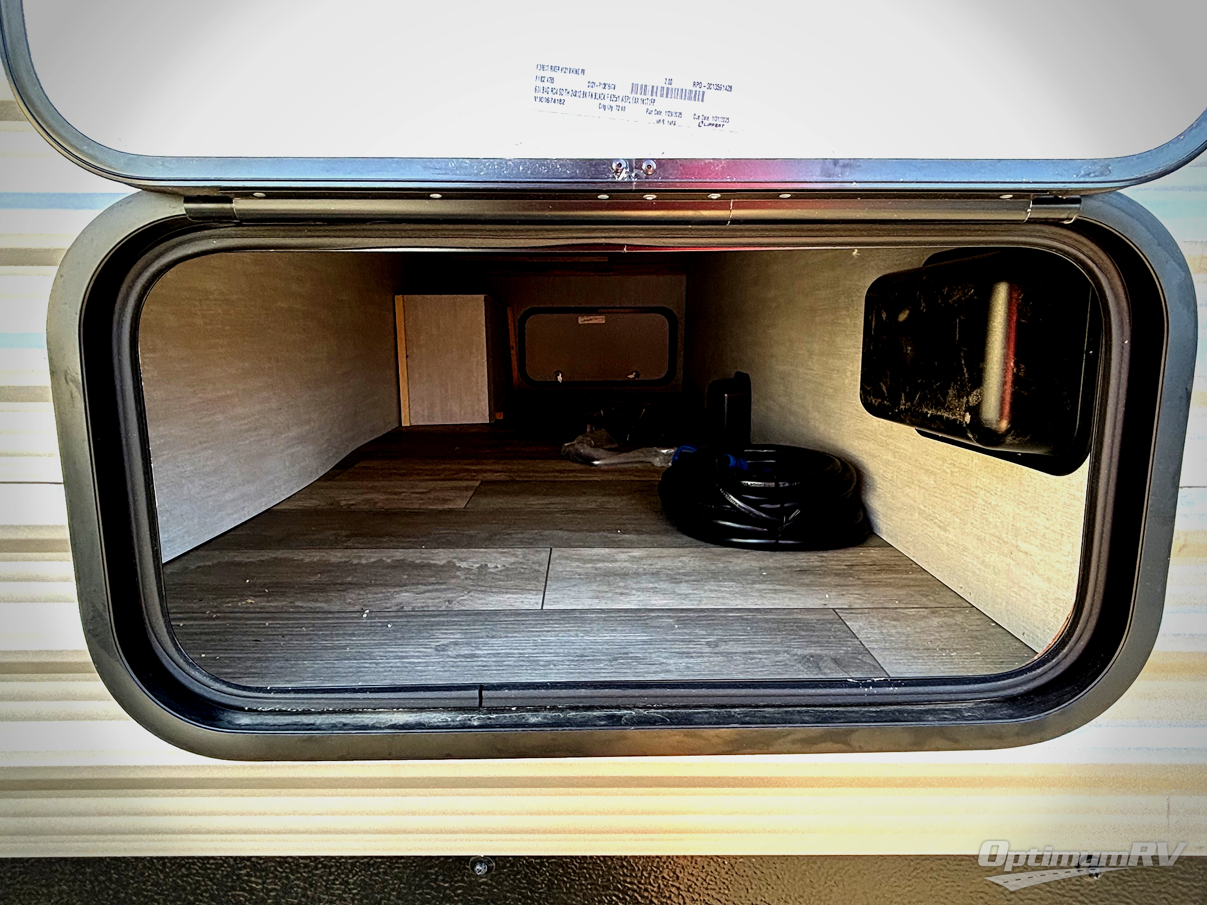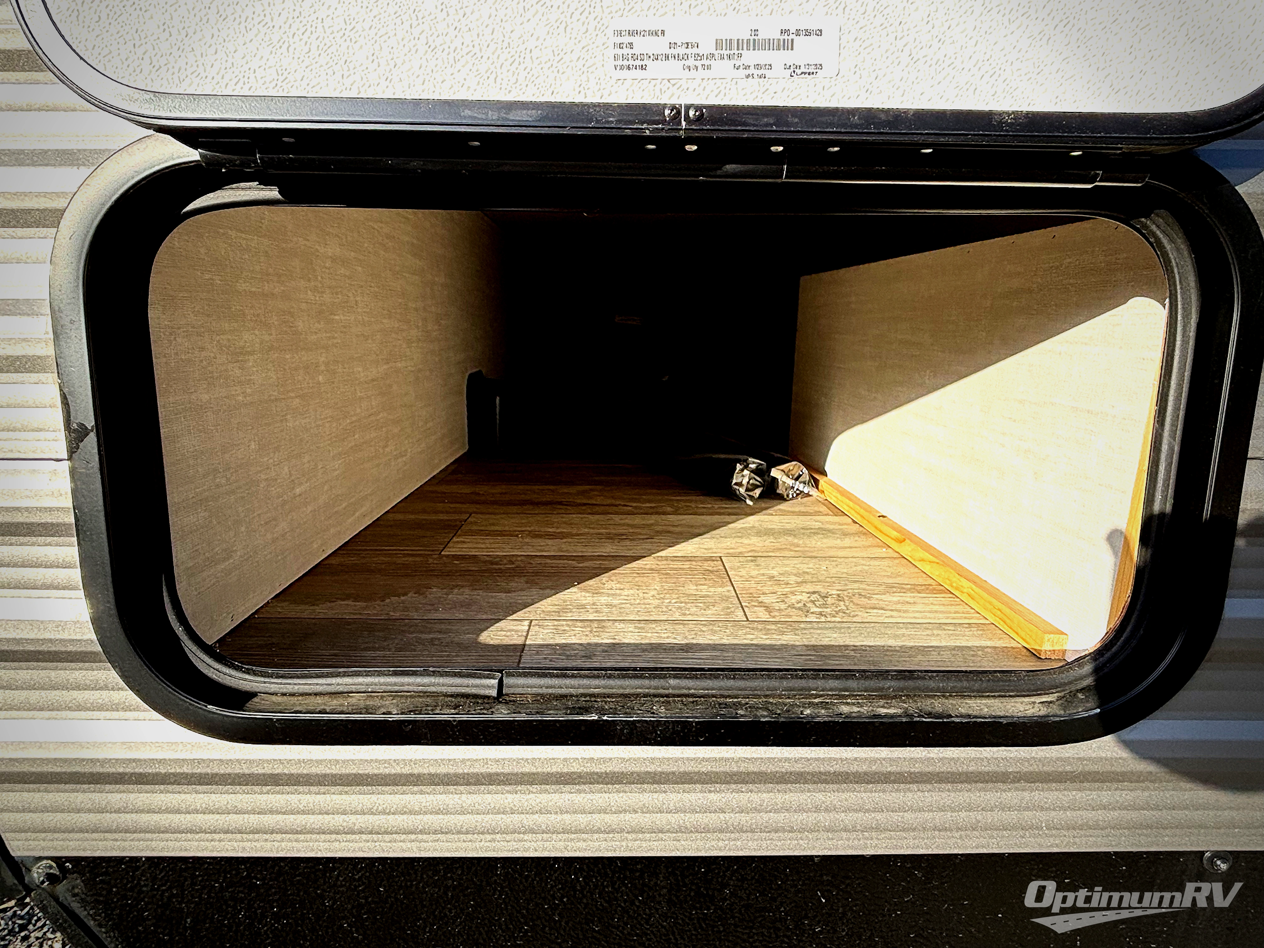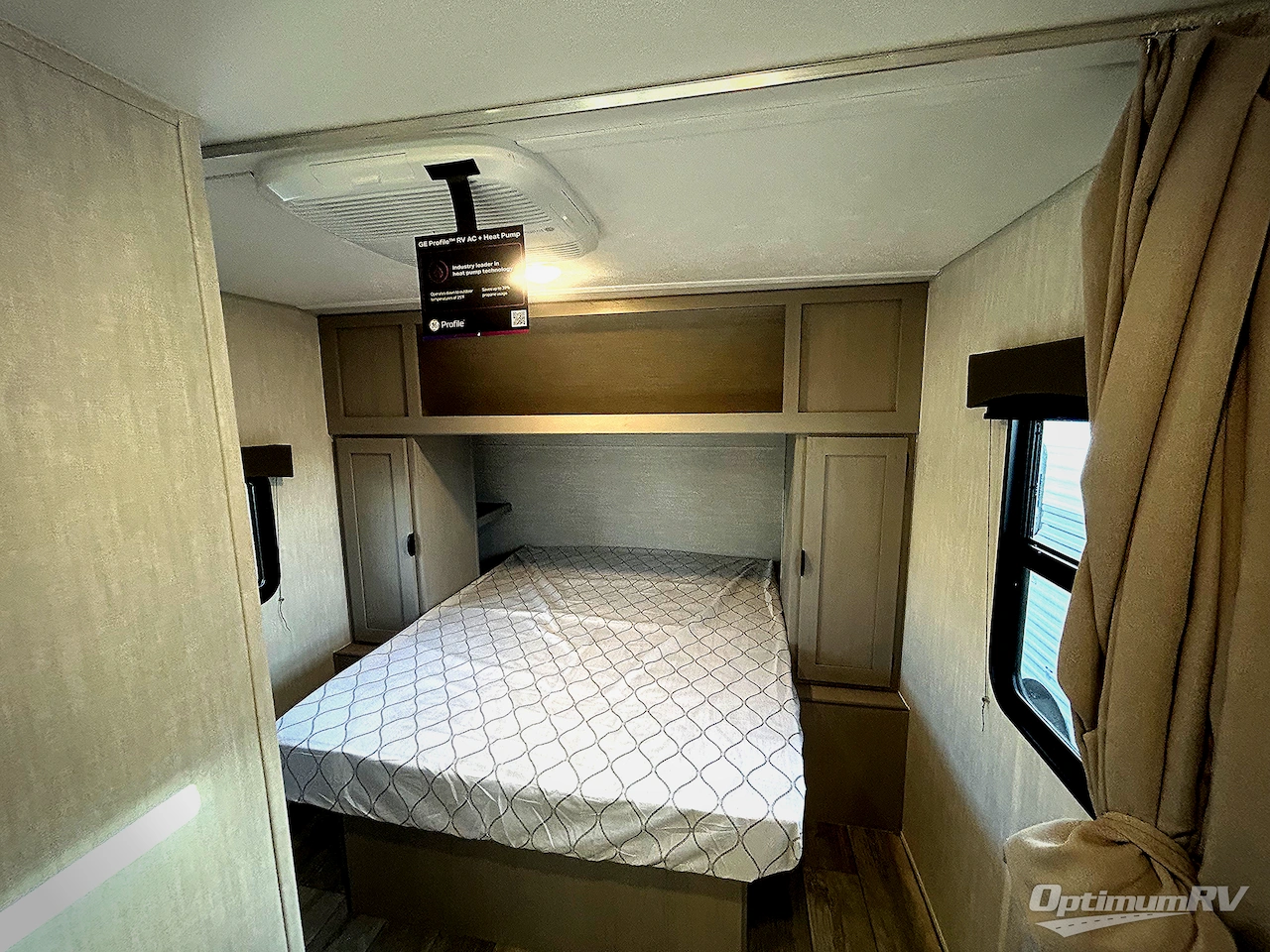 Time spent in this travel trailer will be time well spent! There is a front bedroom with a 60" x 74" queen bed, dual wardrobes, and a private shelf on either side of the bed to keep your belongings close by. A three burner cooktop and microwave will let you make meals each day, and an 8 cu. ft. 12V refrigerator and pantry will help keep food stocked. This unit includes a large countertop with two barstools in the back where you can dine together, along with a jack knife sofa on the other side for a place to relax!
