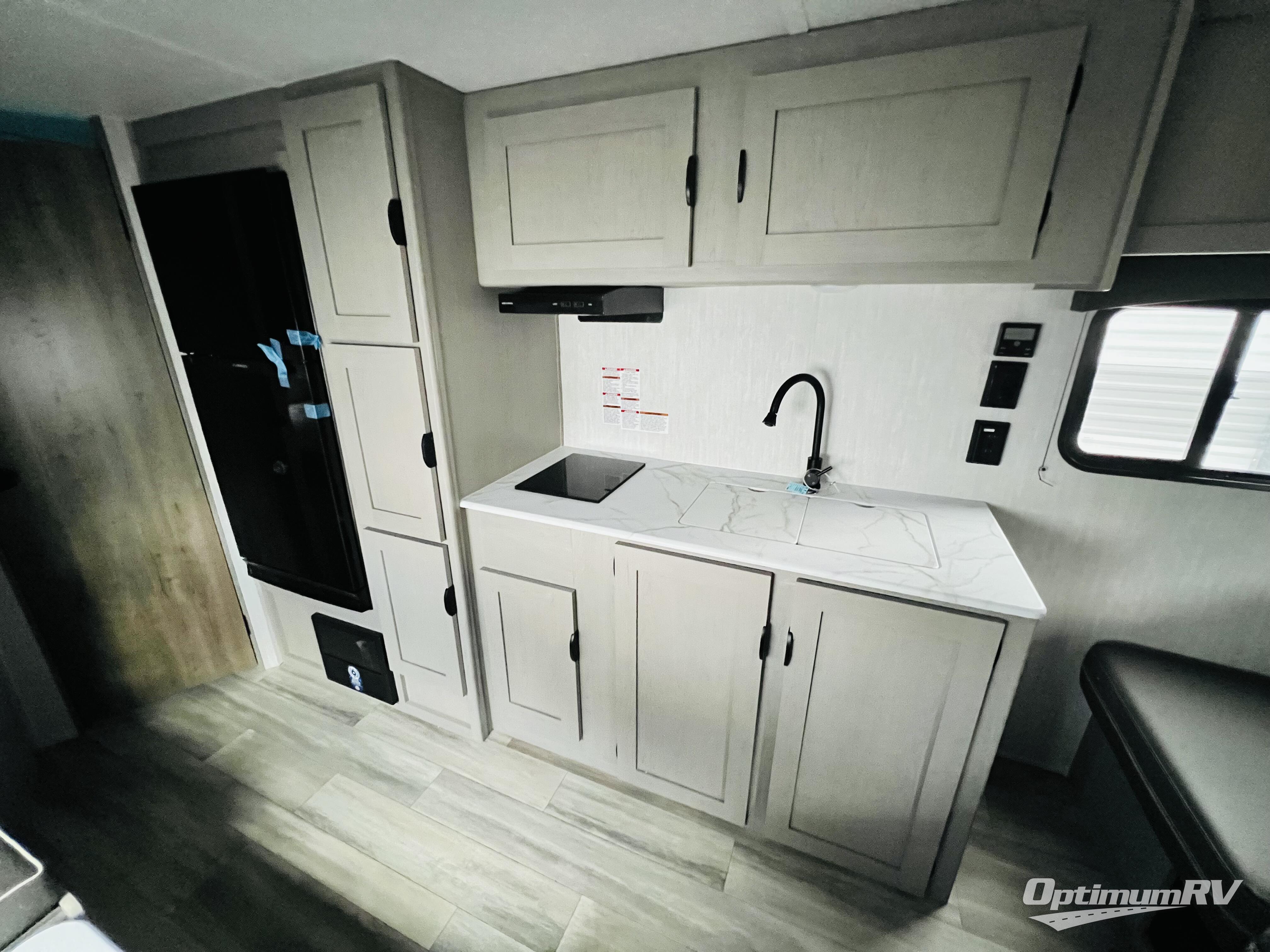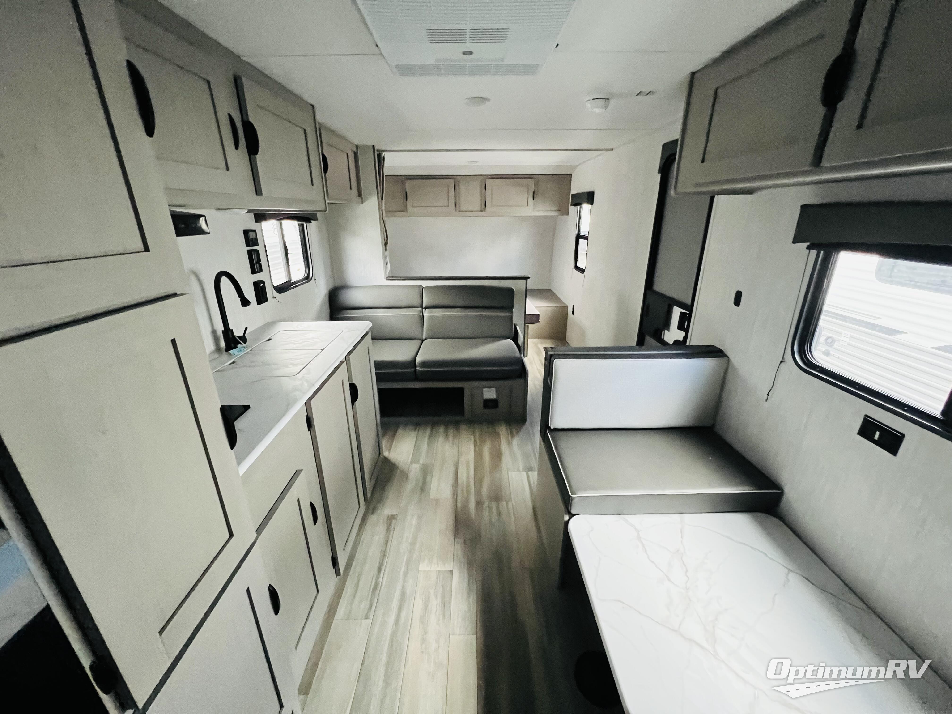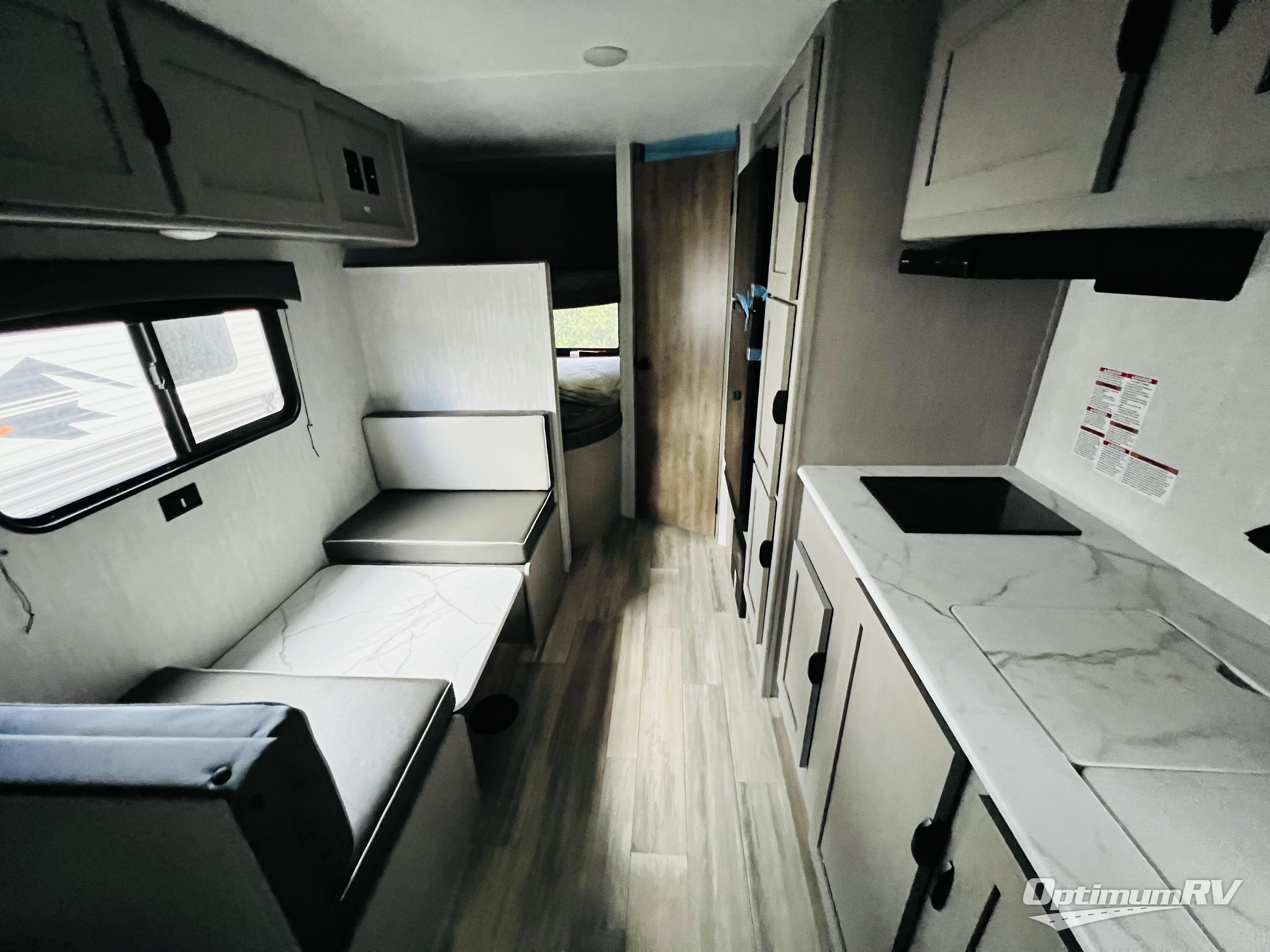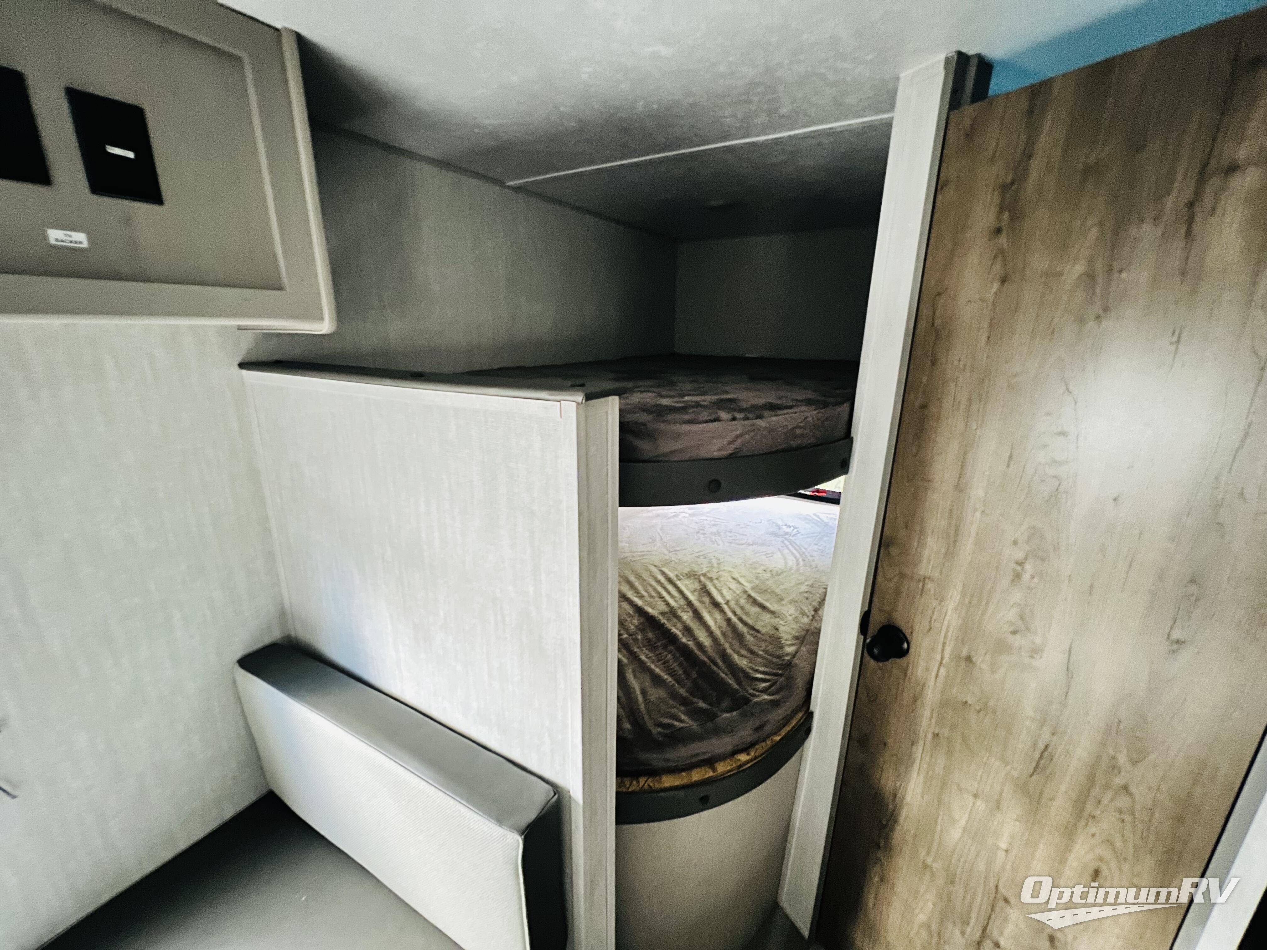 Bring the whole family with you in this travel trailer! The kiddos can sleep on the rear corner set of double bed bunks. The opposite rear corner features a full bath including a 24" x 36" shower, linen cabinet, toilet, and vanity with medicine cabinet overhead. In the main living space, you will find plenty of seating with a booth dinette and jackknife sofa which can also transform into an extra sleeping space if needed. Everyone's bellies will stay full with the two burner cooktop, 11 cu. ft. 12-volt refrigerator, and microwave which you can use to pop a bag of popcorn for movie night. You will enjoy the front bedroom for a bit of privacy including a queen bed and large overhead cabinet for your things. On the outside, a large front pass-through for lawn chairs and camp gear. There is more storage beneath the double bed bunks in back and a nice 10' awning to provide protection from the elements when outdoors.