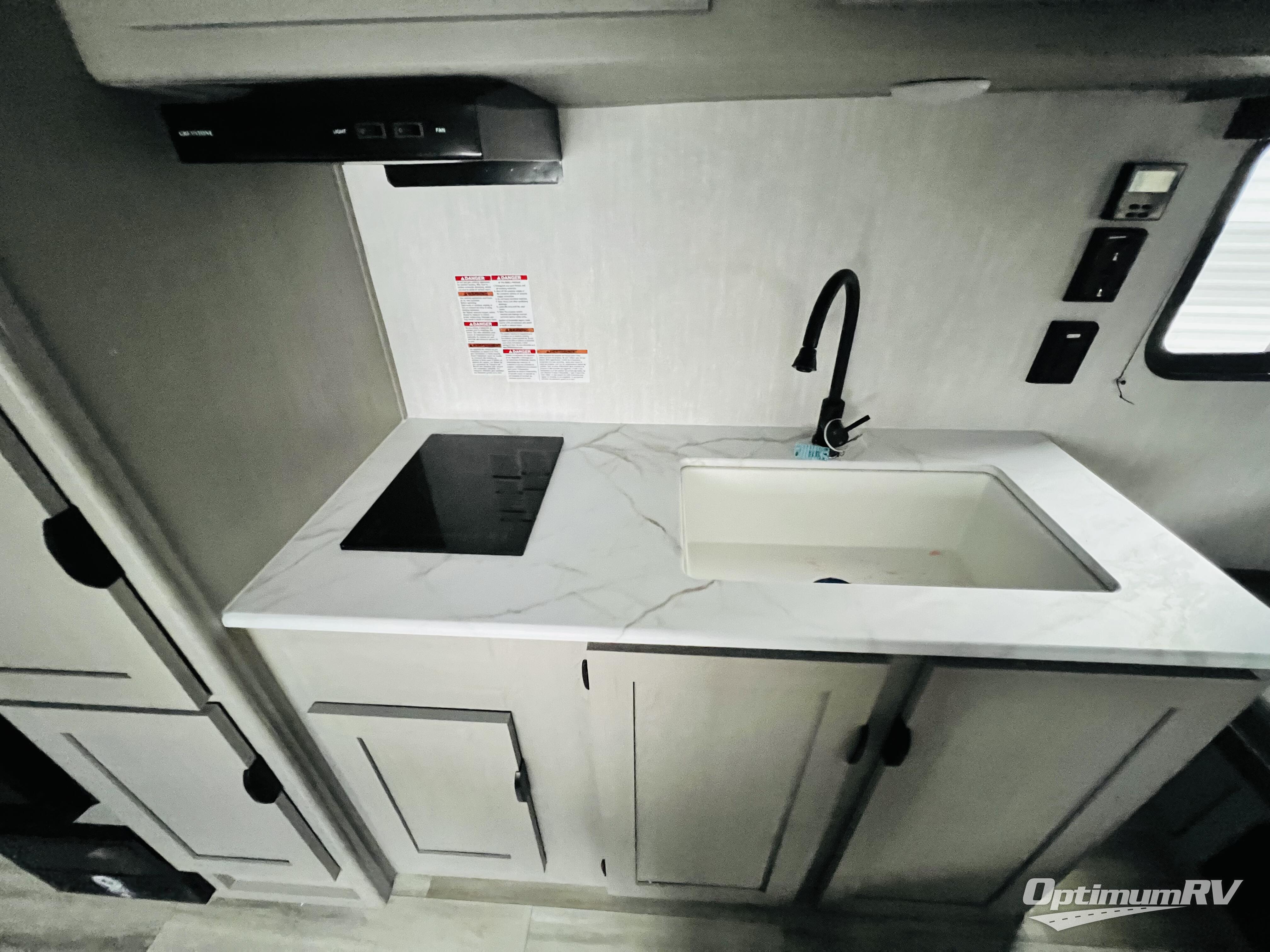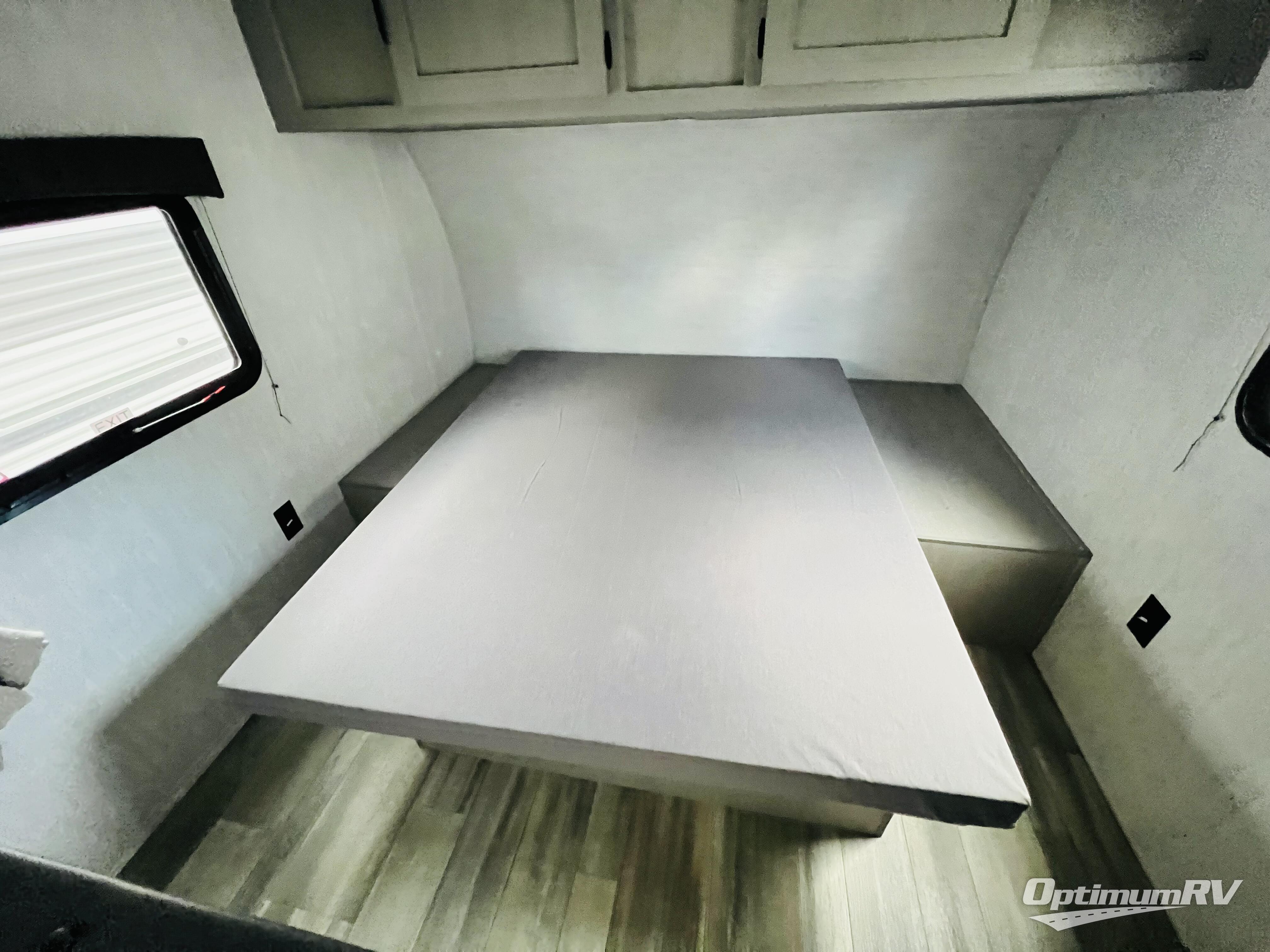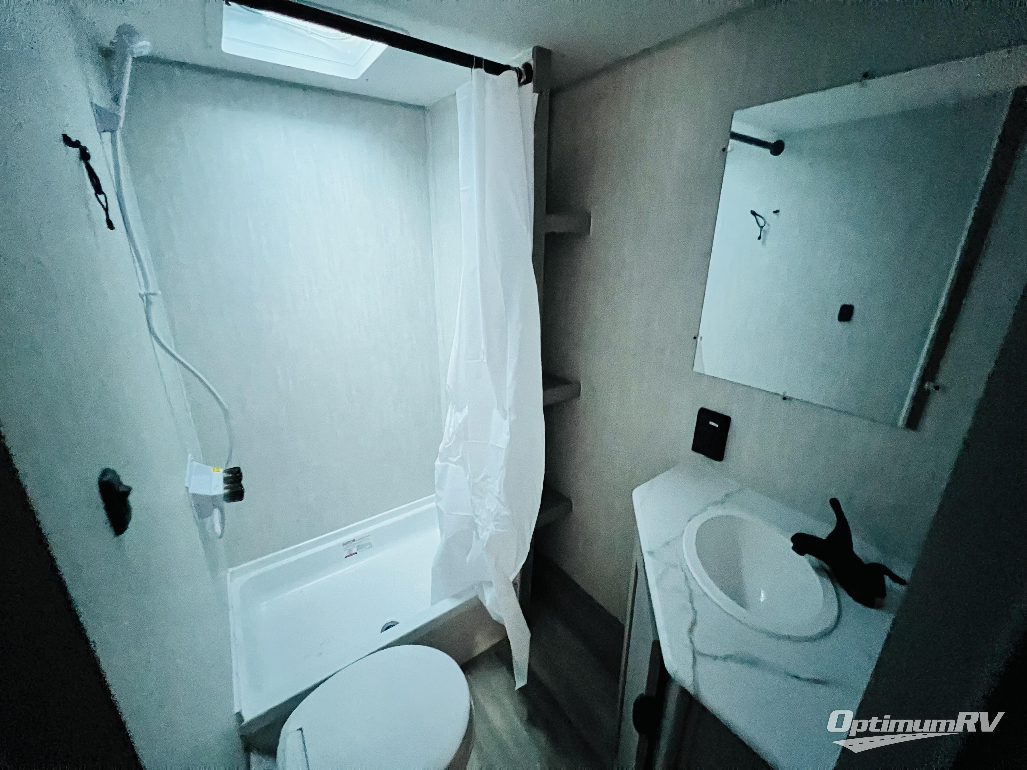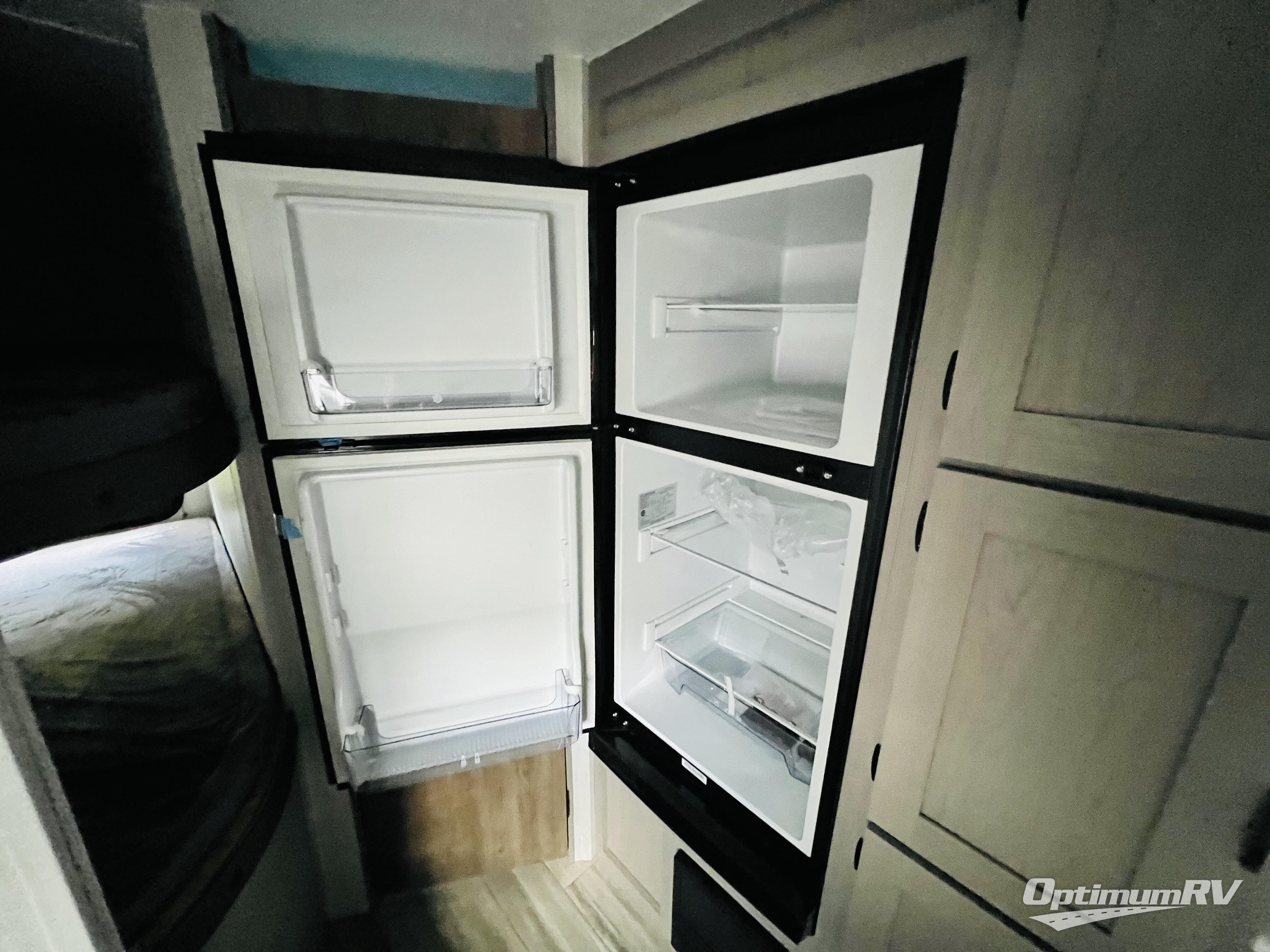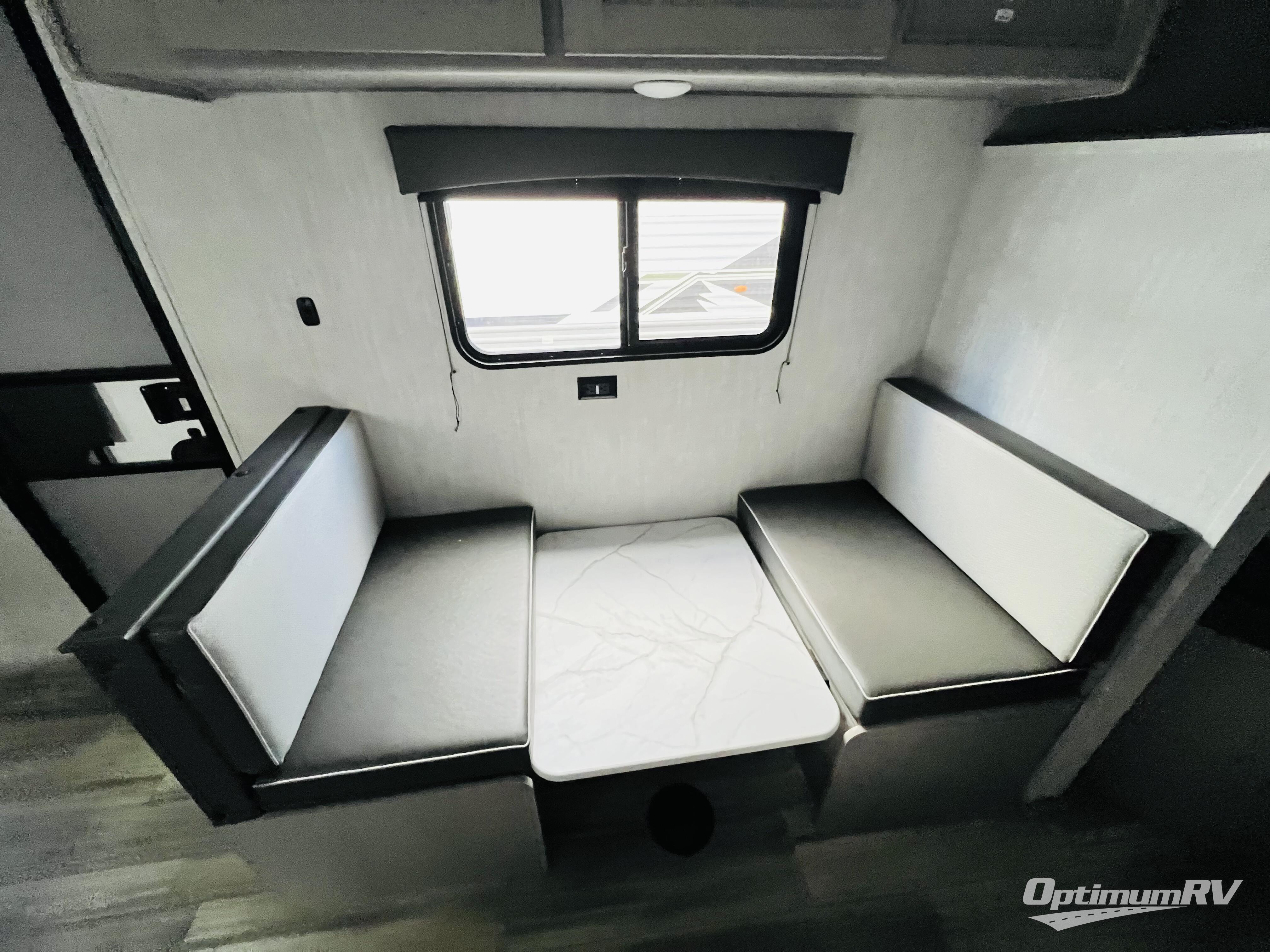 Bring the whole family with you in this travel trailer! The kiddos can sleep on the rear corner set of double bed bunks. The opposite rear corner features a full bath including a 24" x 36" shower, linen cabinet, toilet, and vanity with medicine cabinet overhead. In the main living space, you will find plenty of seating with a booth dinette and jackknife sofa which can also transform into an extra sleeping space if needed. Everyone's bellies will stay full with the two burner cooktop, 11 cu. ft. 12-volt refrigerator, and microwave which you can use to pop a bag of popcorn for movie night. You will enjoy the front bedroom for a bit of privacy including a queen bed and large overhead cabinet for your things. On the outside, a large front pass-through for lawn chairs and camp gear. There is more storage beneath the double bed bunks in back and a nice 10' awning to provide protection from the elements when outdoors.