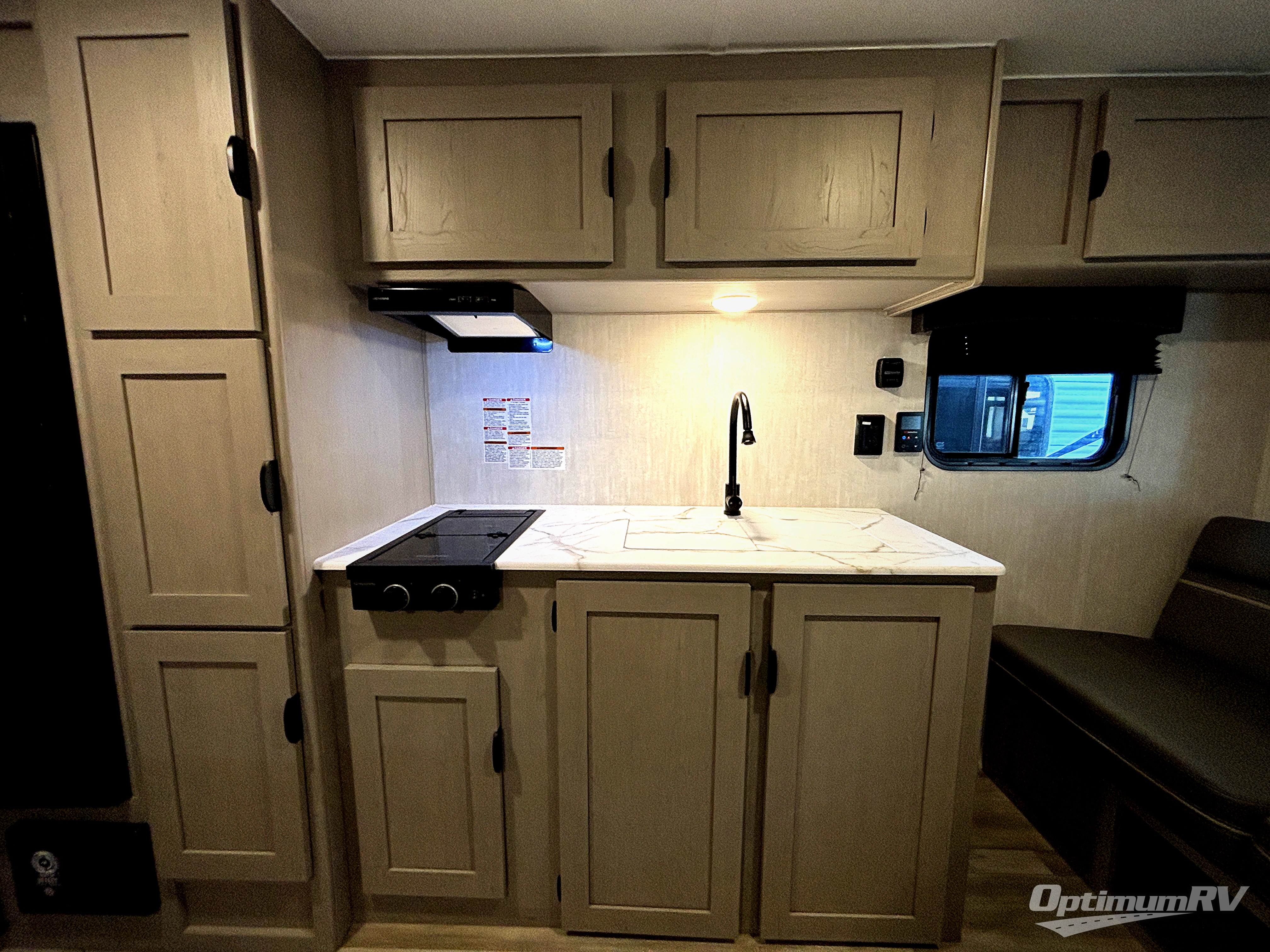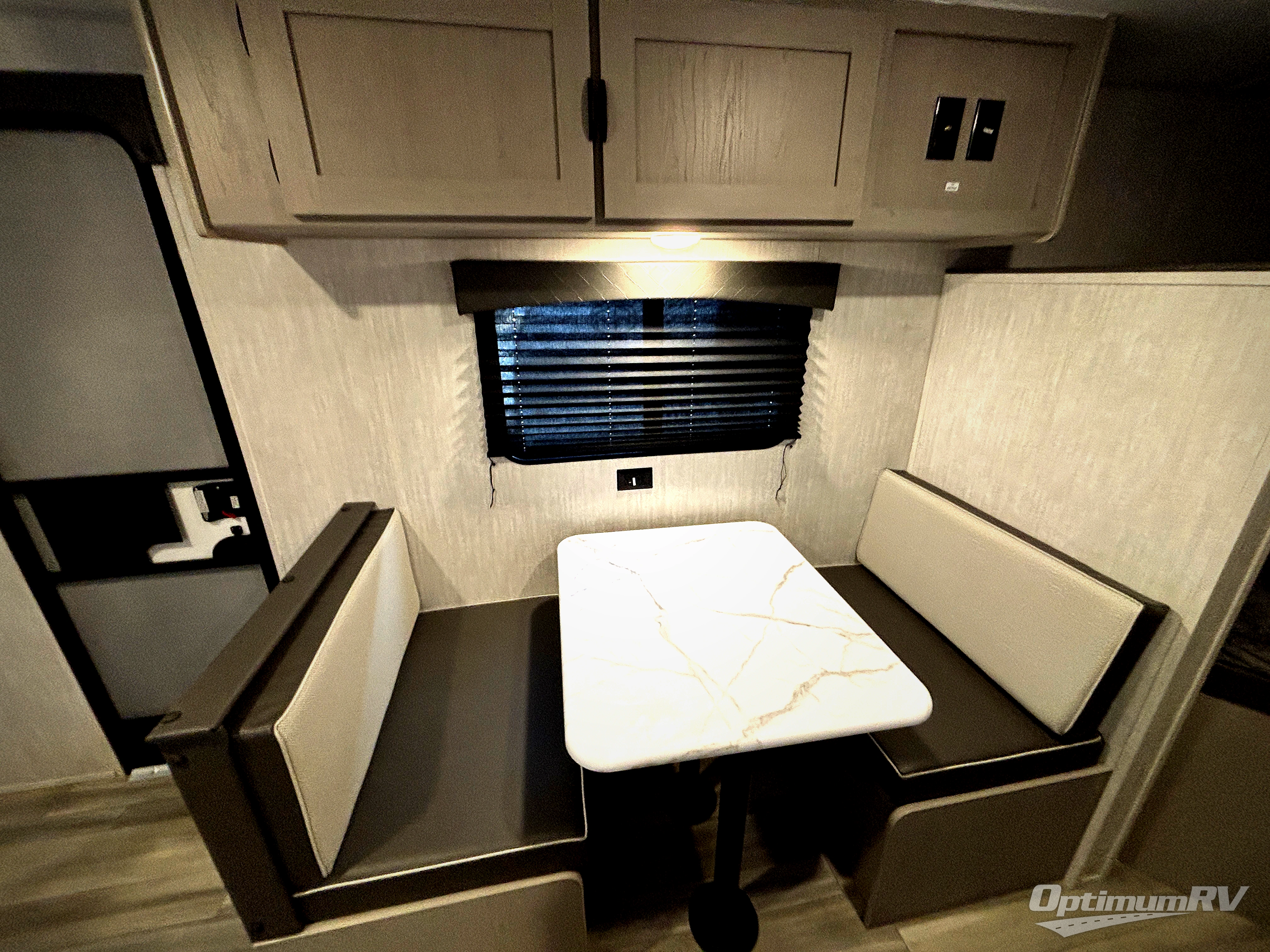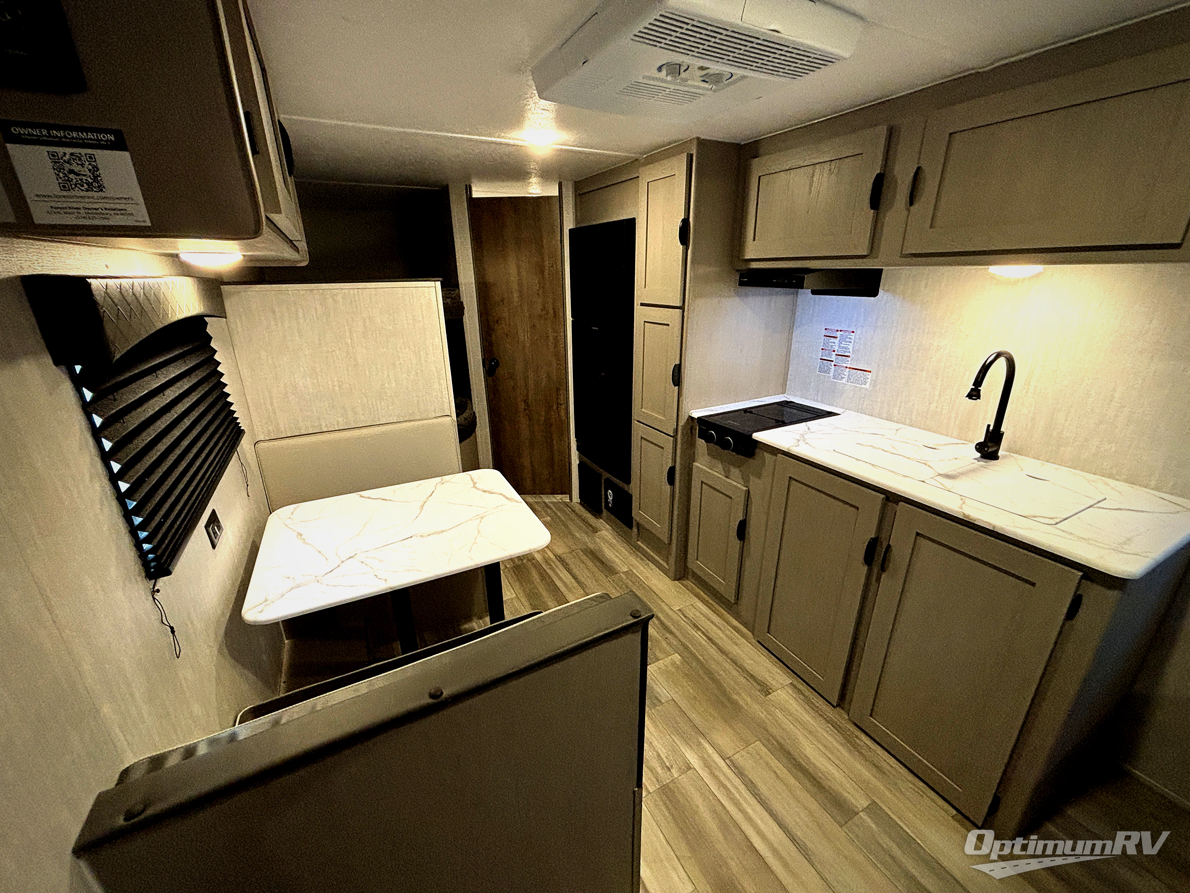 Bring the whole family with you in this travel trailer! The kiddos can sleep on the rear corner set of double-size bunks. The opposite rear corner features a full bath including a 24" x 36" shower, linen cabinet, toilet, and vanity with medicine cabinet overhead. In the main living space, you will find plenty of seating with a booth dinette and jackknife sofa which can also transform into an extra sleeping space if needed. Everyone's bellies will stay full with the induction cooktop, 8 cu. ft. 12-volt refrigerator, and microwave which you can use to pop a bag of popcorn for movie night. You will enjoy the front bedroom for a bit of privacy including a queen bed and large overhead cabinet for your things. On the outside, a large front pass-through for lawn chairs and camp gear. There is more storage beneath the bunks in back and a nice 10' awning to provide protection from the elements when outdoors.