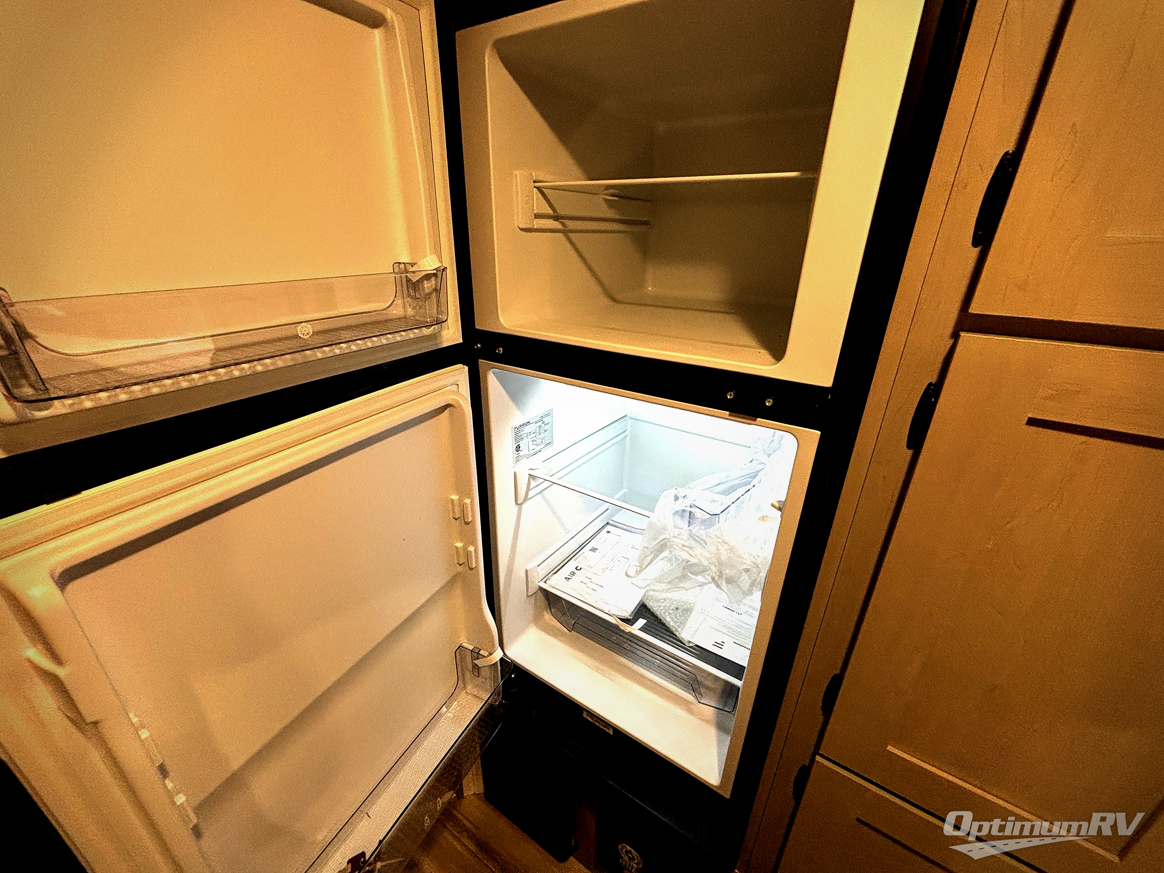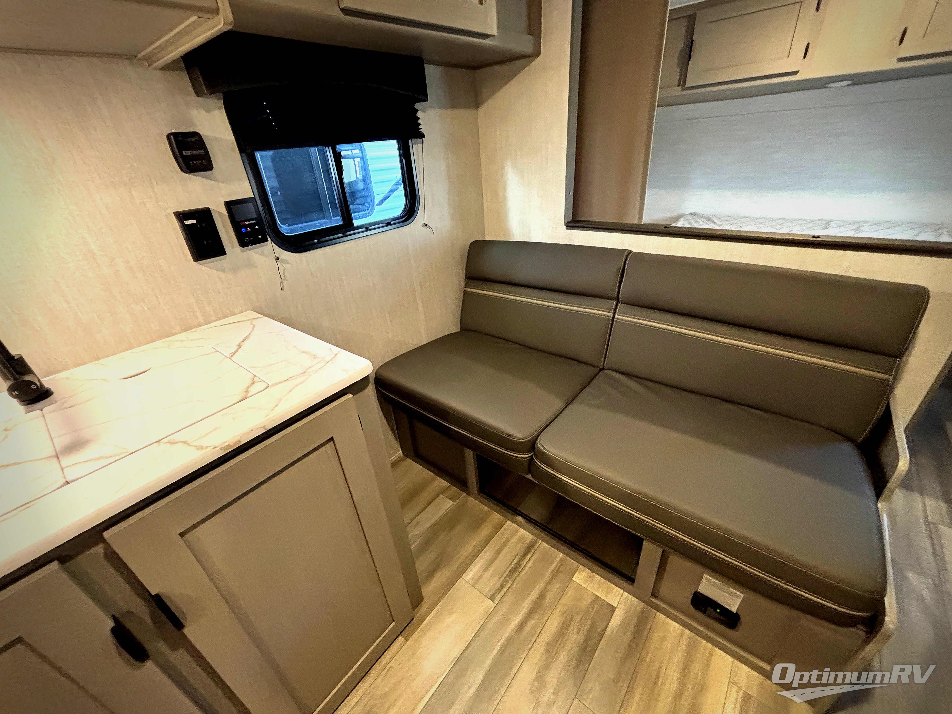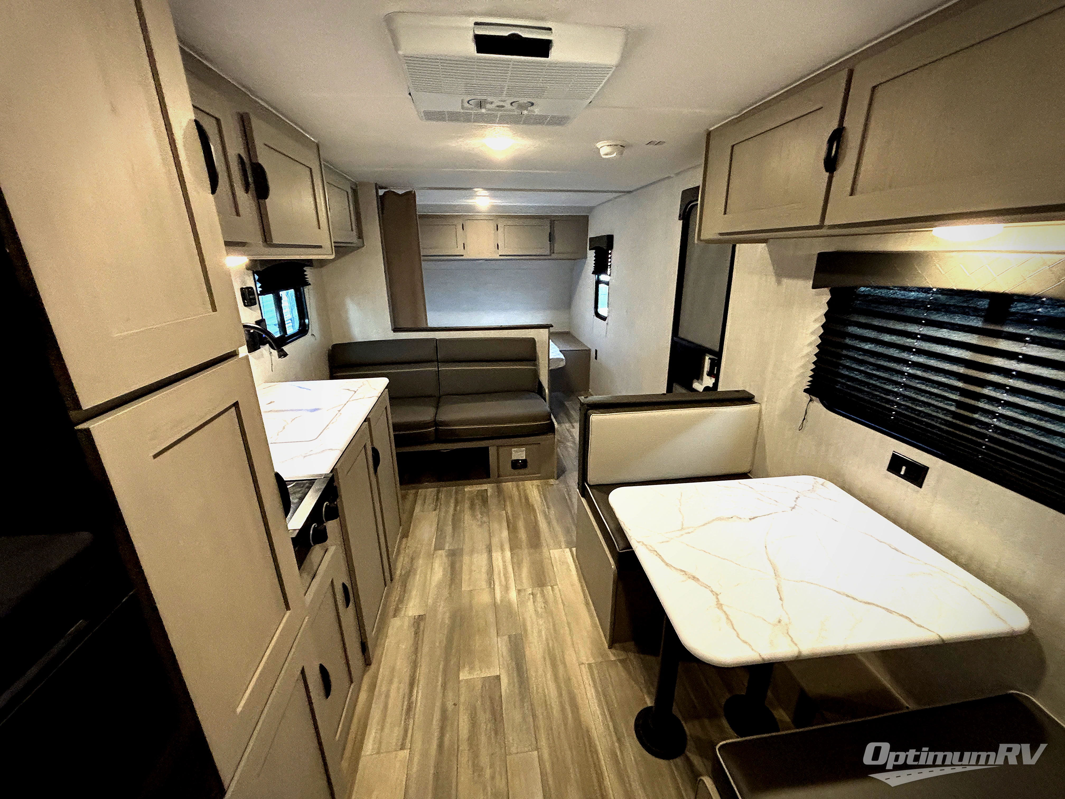 Bring the whole family with you in this travel trailer! The kiddos can sleep on the rear corner set of double-size bunks. The opposite rear corner features a full bath including a 24" x 36" shower, linen cabinet, toilet, and vanity with medicine cabinet overhead. In the main living space, you will find plenty of seating with a booth dinette and jackknife sofa which can also transform into an extra sleeping space if needed. Everyone's bellies will stay full with the induction cooktop, 8 cu. ft. 12-volt refrigerator, and microwave which you can use to pop a bag of popcorn for movie night. You will enjoy the front bedroom for a bit of privacy including a queen bed and large overhead cabinet for your things. On the outside, a large front pass-through for lawn chairs and camp gear. There is more storage beneath the bunks in back and a nice 10' awning to provide protection from the elements when outdoors.