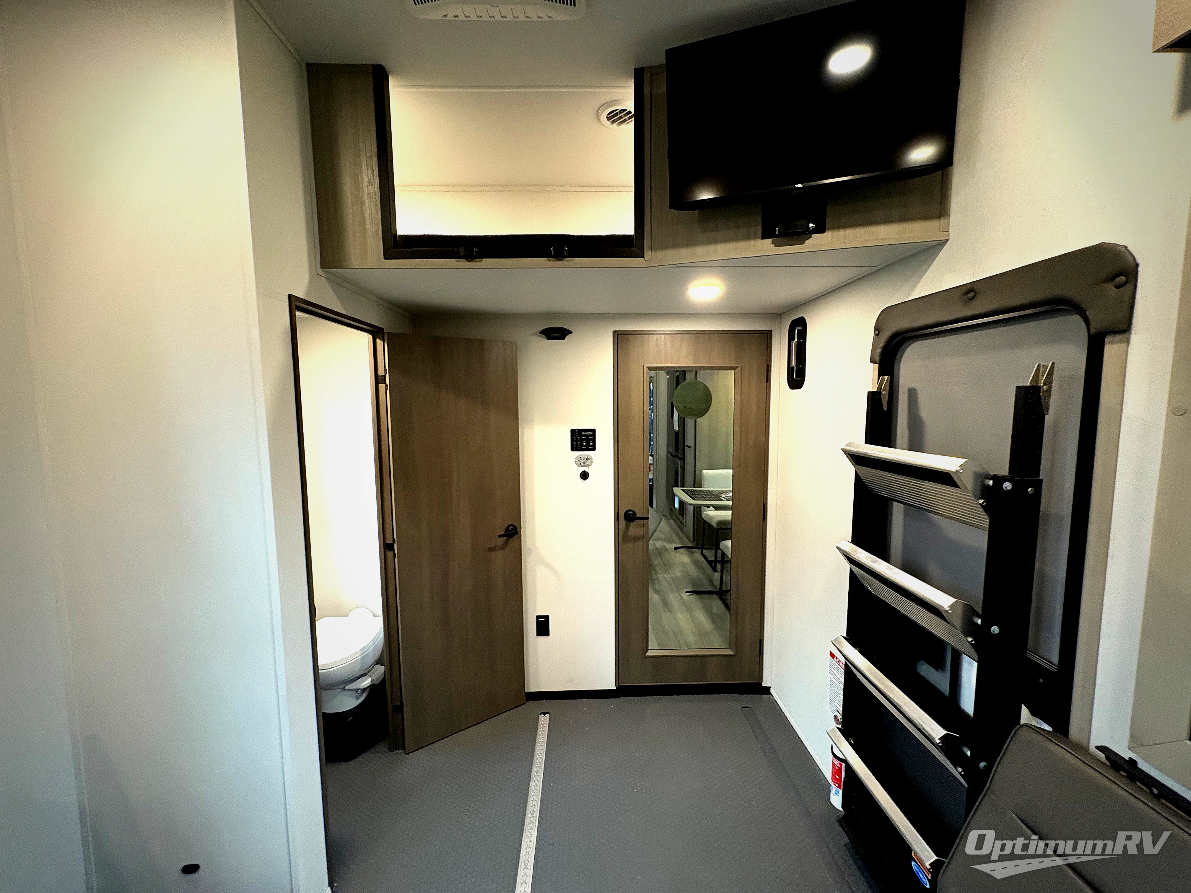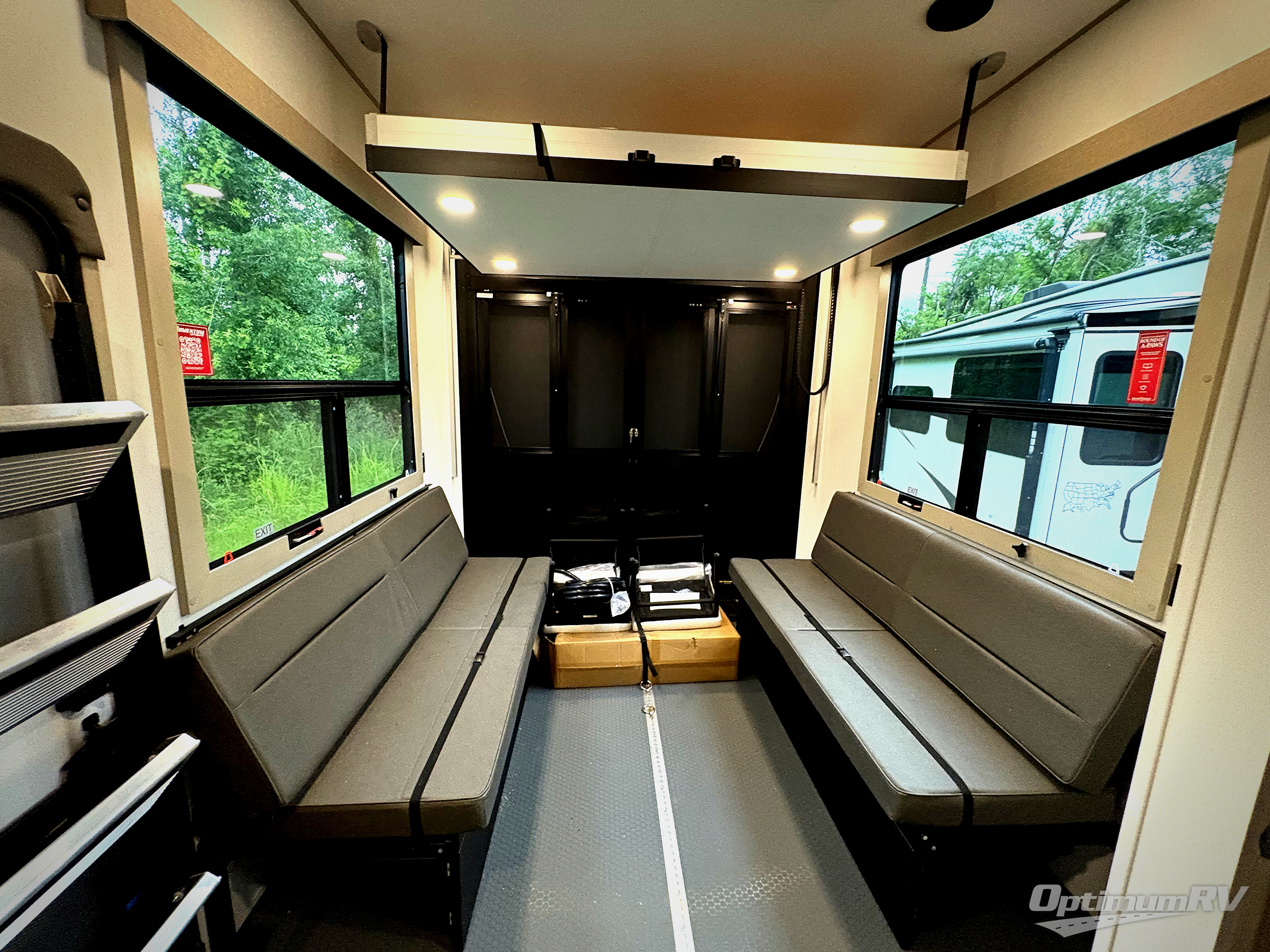 Any time spent in this spacious toy hauler will be time well spent! The 14' garage includes an overhead loft bed and a flip-up pet dish for your furry friends. If you're needing more sleeping space, you might want to choose the optional Liftsuite System and optional half bath. Once you enter in the main living area, you can relax on the L-shaped sofa with recline across from the fireplace, and there is a free-standing dinette if you want to play a game or two. The chef of your group will love the generous counter space in the kitchen, and the dual entry bath will let everyone stay clean throughout your trip! Head to the front master bedroom to enjoy the queen bed slide out with an optional king bed, a slide top dresser with TV prep, plus a large front closet, complete with washer and dryer prep!