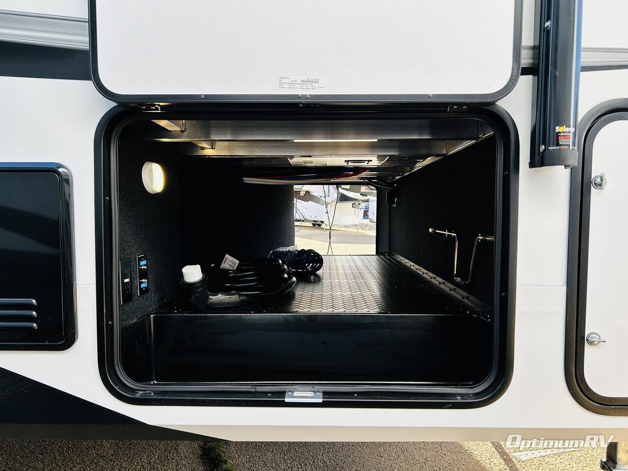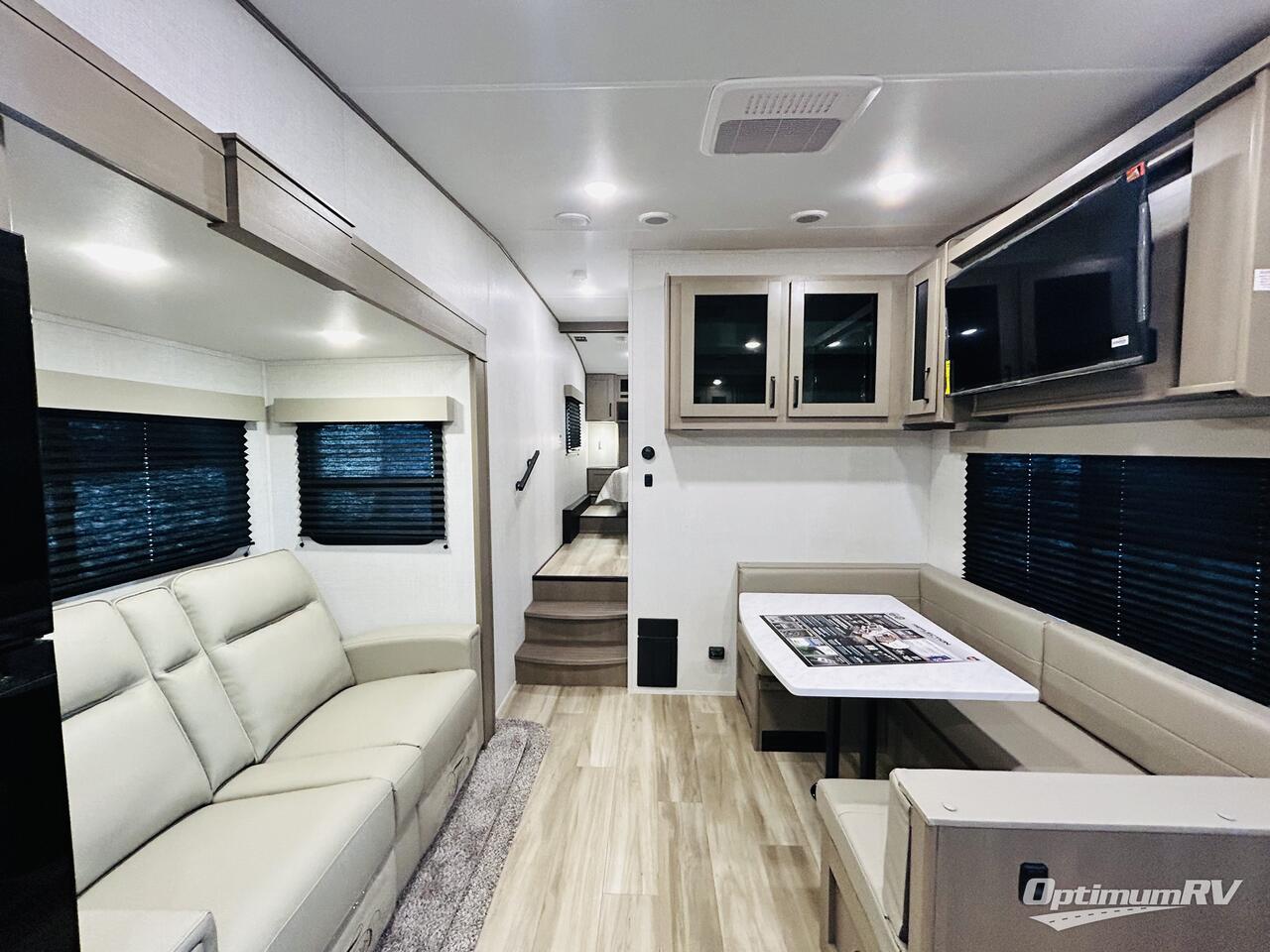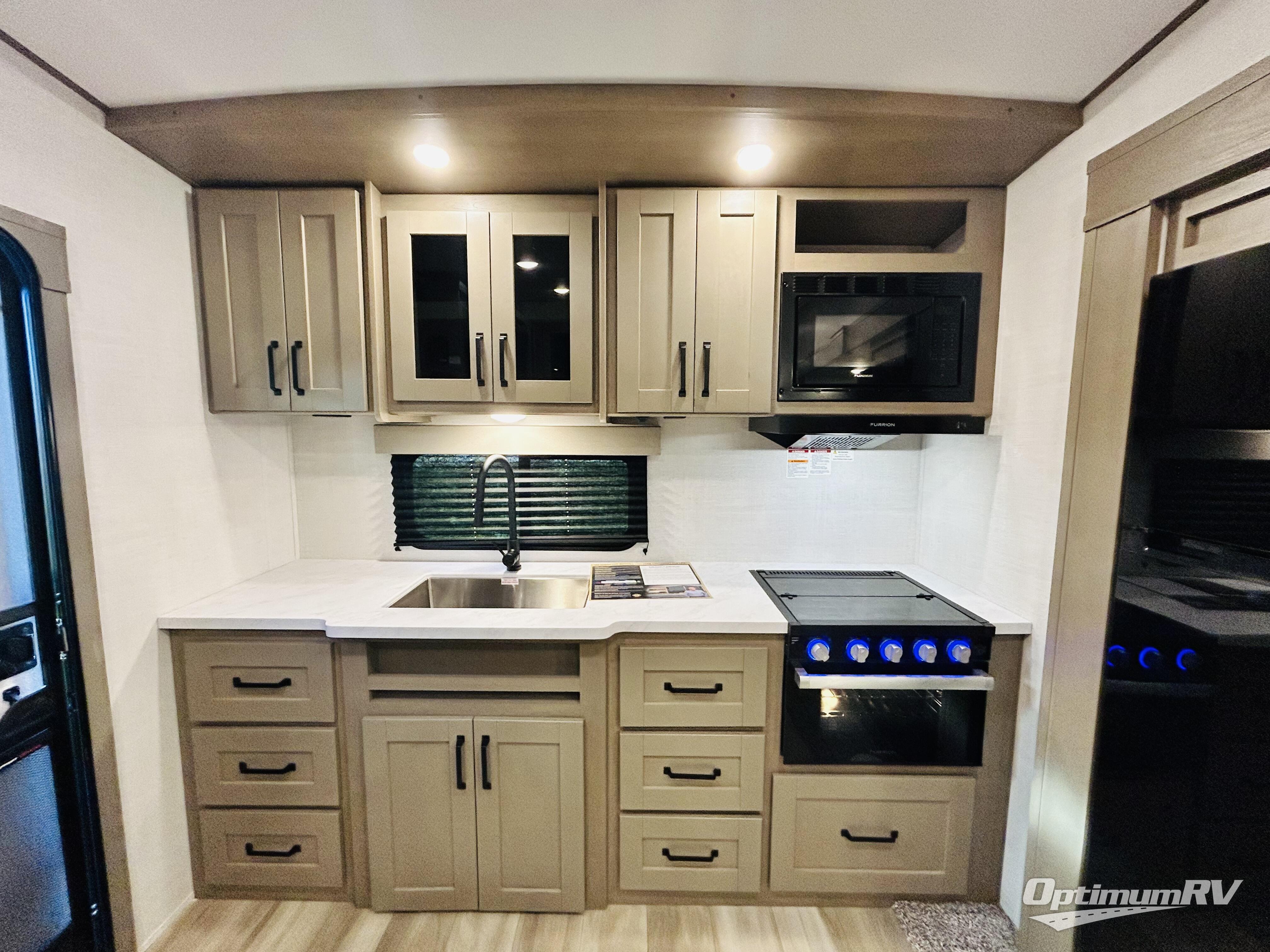 This rear kitchen fifth wheel is sure to meet all of your camping needs! Since the exterior length is only 26' 11", you can easily maneuver in and out of campgrounds. The rear kitchen includes ample counter space to prep meals, a three burner cooktop, and overhead storage for all your necessities. There is a 10 cu. ft. 12V refrigerator within the slide out that also includes the theater seating, and the booth dinette provides a place to dine or play a card game. You will appreciate having convenient storage by the entry door, along with pull-out pet bowls, a functional wardrobe closet in the bedroom and an exterior pass-thru for belongings and camping gear. When you're ready to turn in for the night, the queen bed is sure to bring a great night's rest, while your guests sleep on the booth dinette or optional tri-fold sofa if you replace the theater seating!