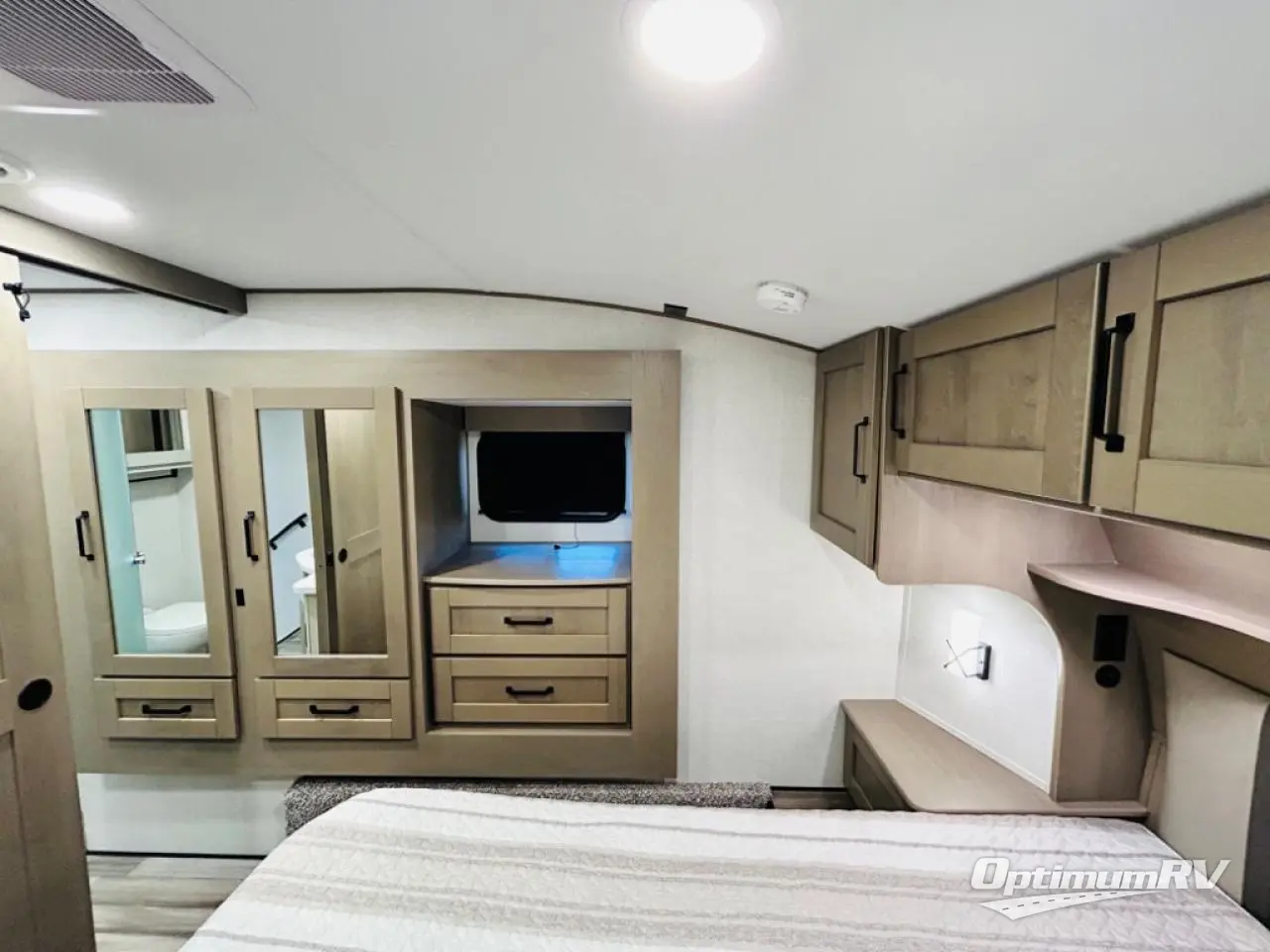 Whether you travel for pleasure or work, you will love the spacious main living and kitchen area with a rear tri-fold sofa that doubles as extra sleeping space, and the theater seating directly across from the entertainment center with a 40" LED HDTV and a fireplace below. The kitchen island will make meal prepping and drying the dishes easier and the hutch is the perfect place to place your picture frames, nice dishes, and extra cooking items. There is even a pantry that is big enough to store all of your favorite snacks, dry ingredients and such. Outside you can enjoy two electric awnings that provide protection from the elements as you relax and visit with other RVers, and your camping chairs can easily be stored in the pass-through compartment. The double entry bathroom is convenient especially at night when you can slide the door to enter from the front master bedroom. You will find plenty of storage for your clothing and gear, plus the bedroom slide out gives you drawers and linen storage that stretches into the full bathroom.