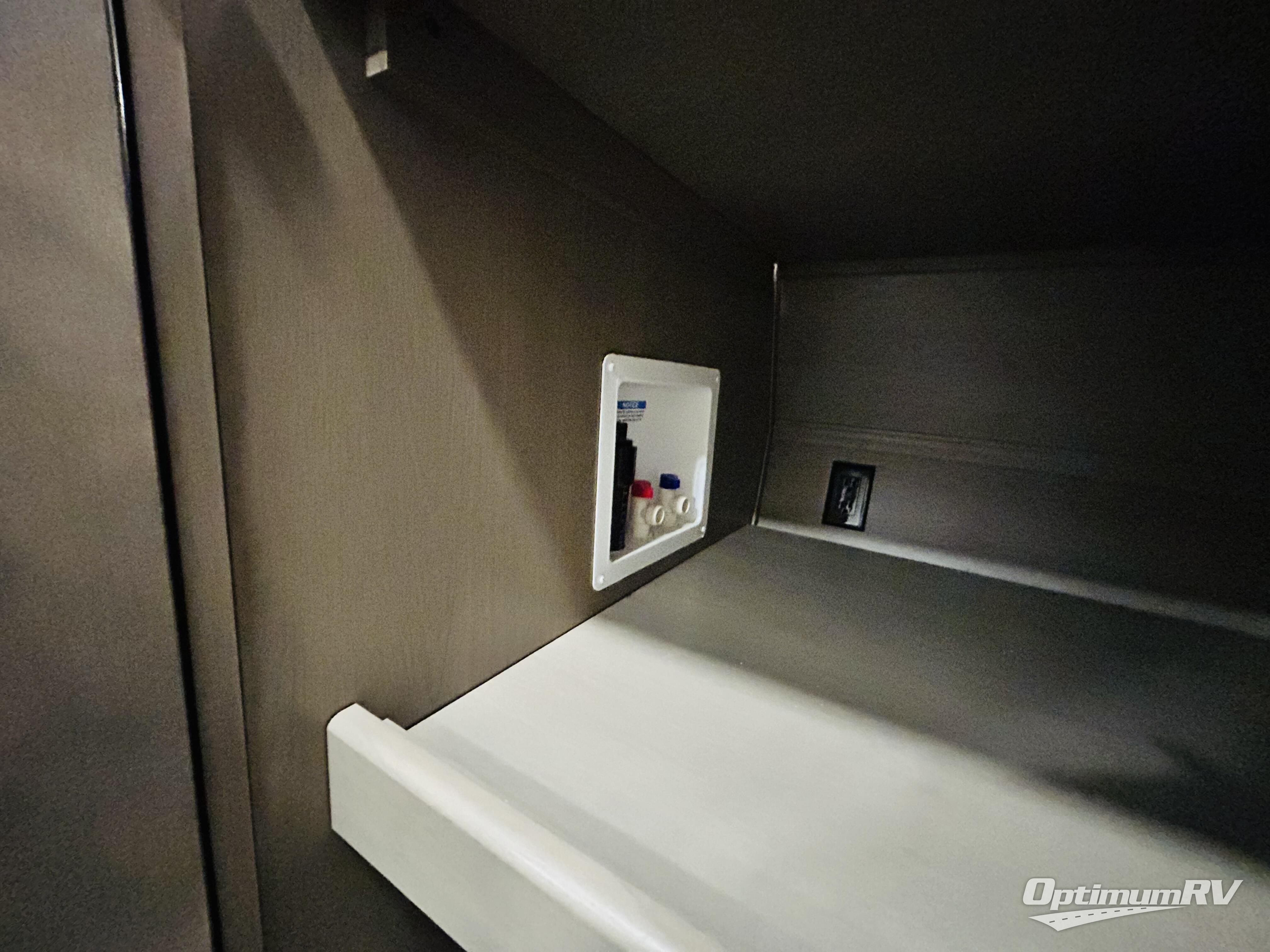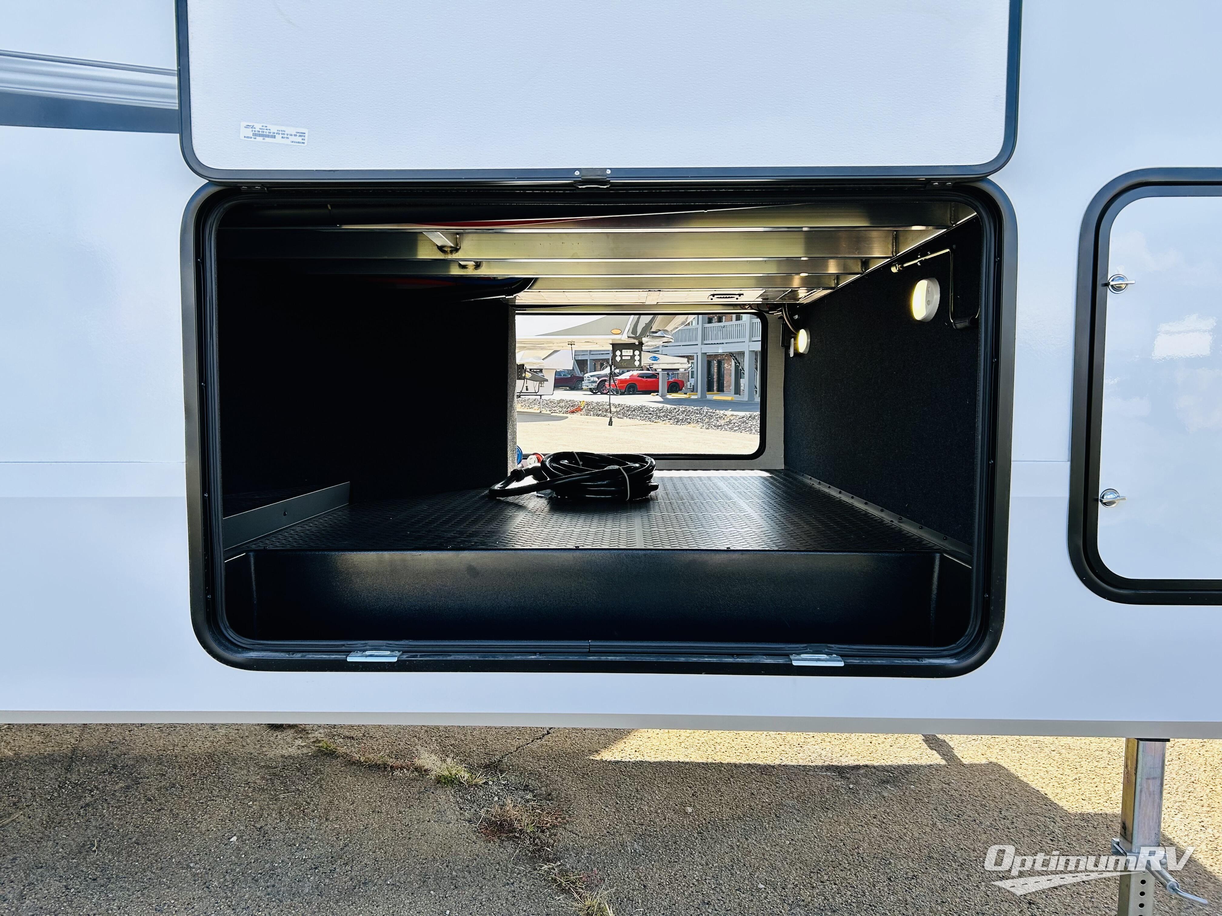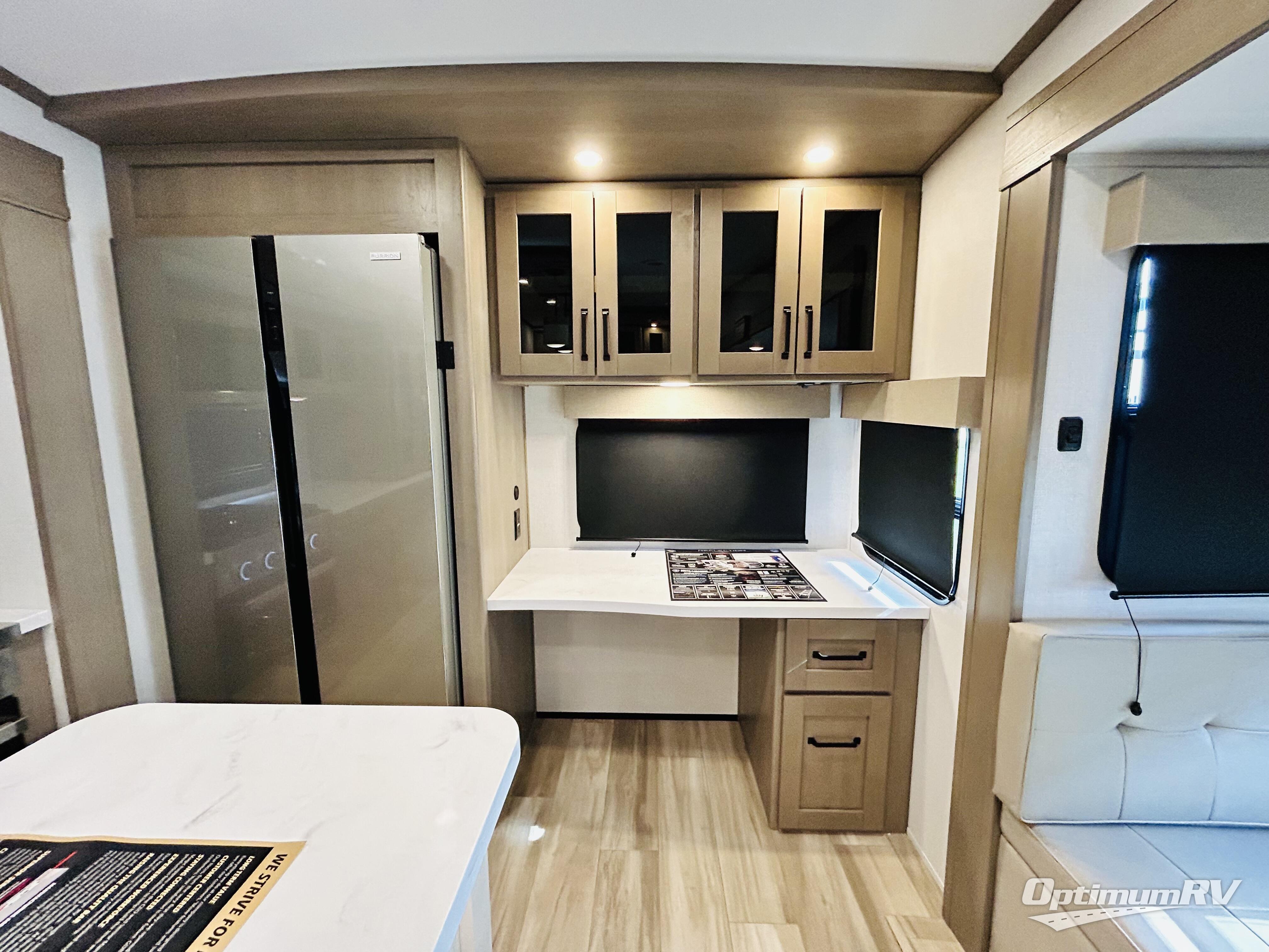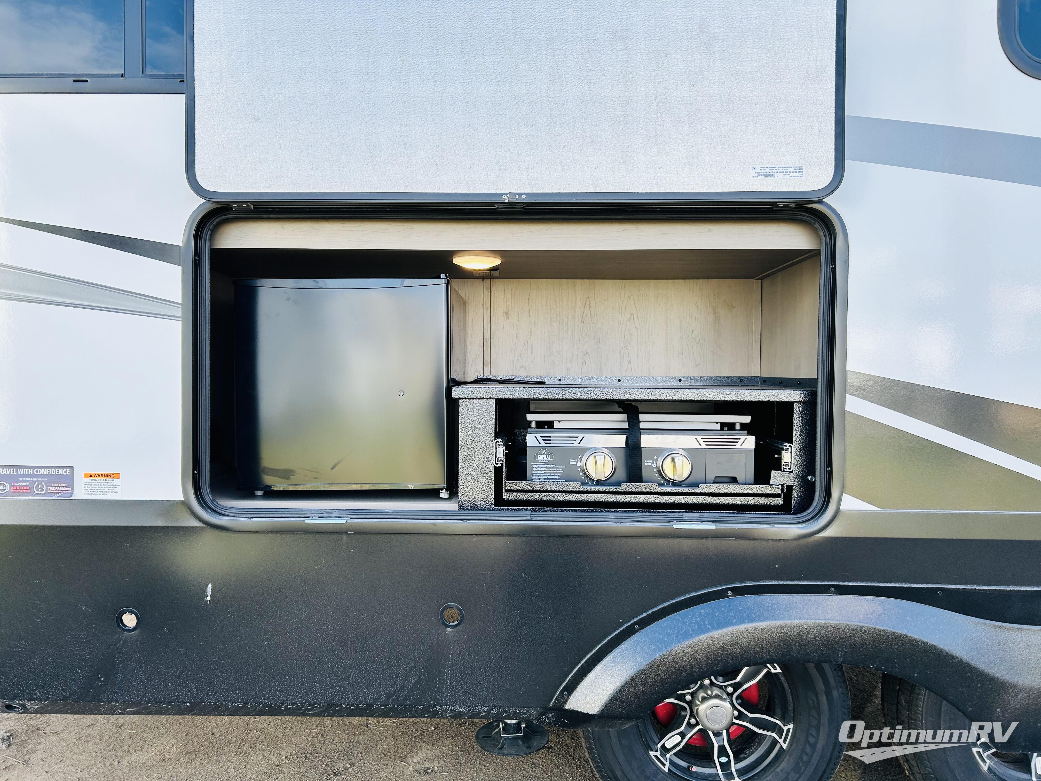 Comfortable accommodations are found throughout this fifth wheel so you can relax, unwind and enjoy your vacation be it for a weekend or a month and even when you have to work! Thanks to the rear desk with a chair and the bedroom with washer and dryer prep, you could stay in this RV as long as you like and keep all your clothes and linens clean. The front bedroom also provides a front wall wardrobe, a slide out queen bed and a dresser. The spacious shower has a glass door and there is linen storage in the full bathroom. The spacious main living and kitchen area has two slide outs with full kitchen amenities and seating with theater seats including cupholders, a booth dinette, and a tri-fold sofa. And the exterior offers an outside kitchen with a griddle, a 1.6 cu ft. refrigerator, and two power awnings!