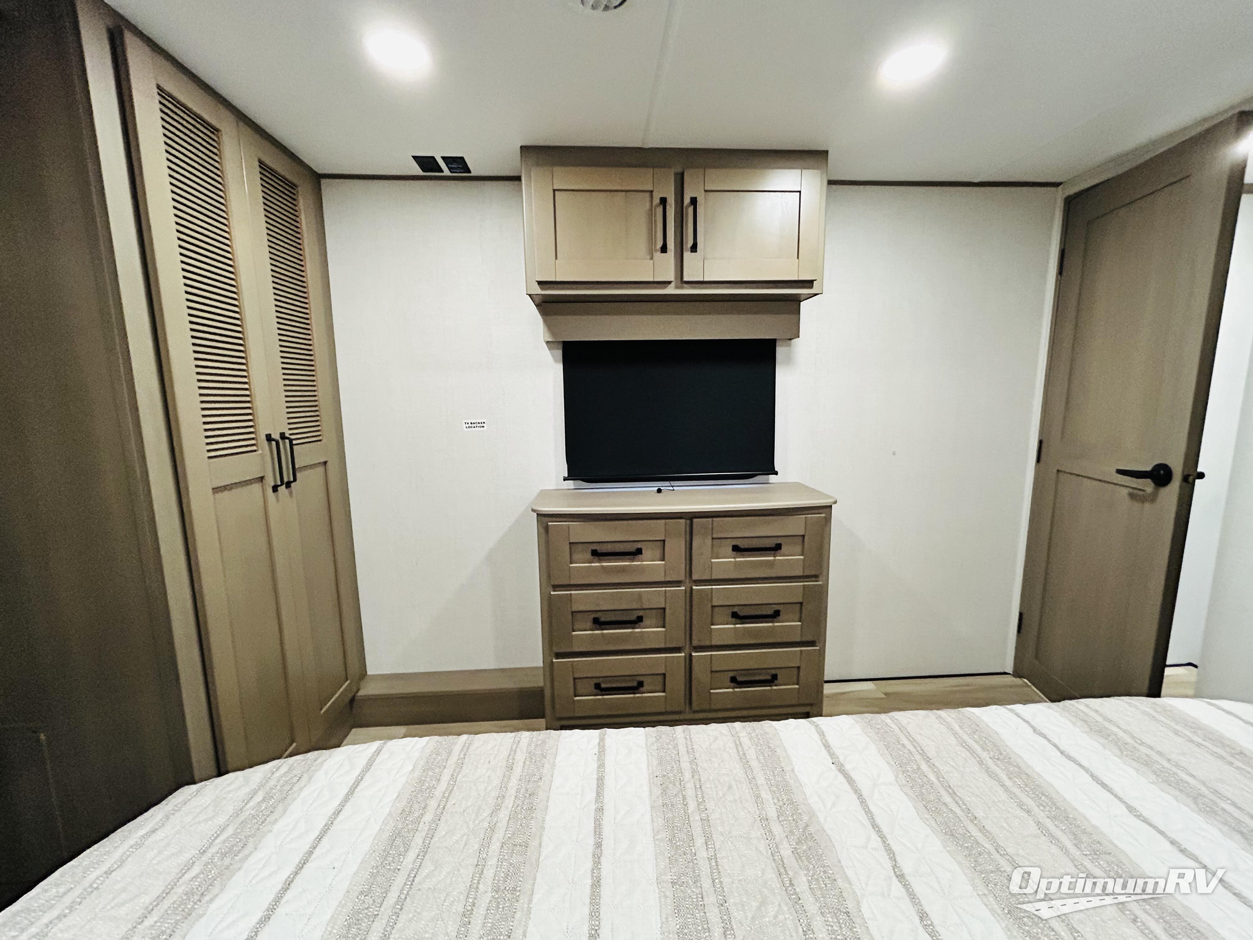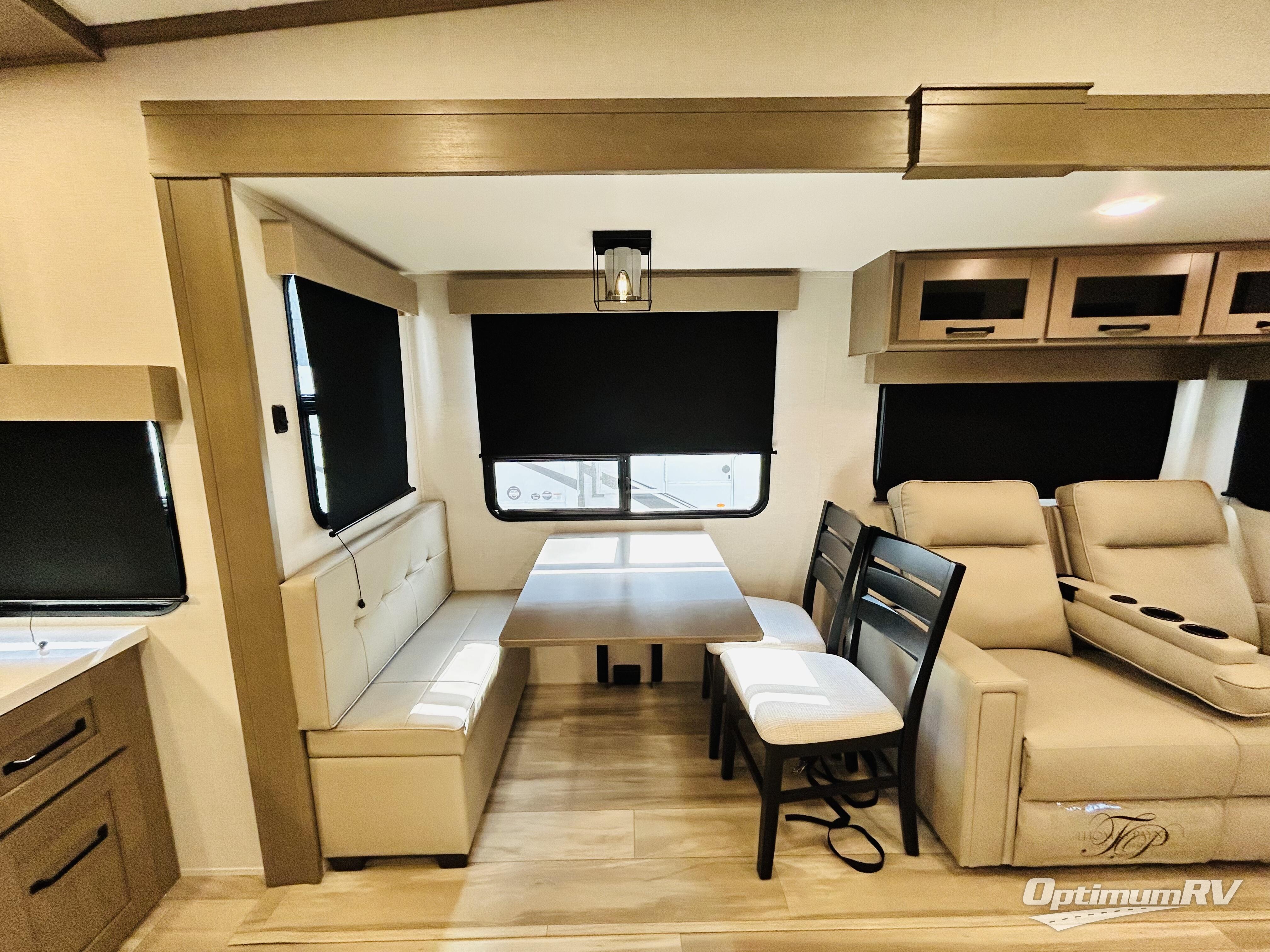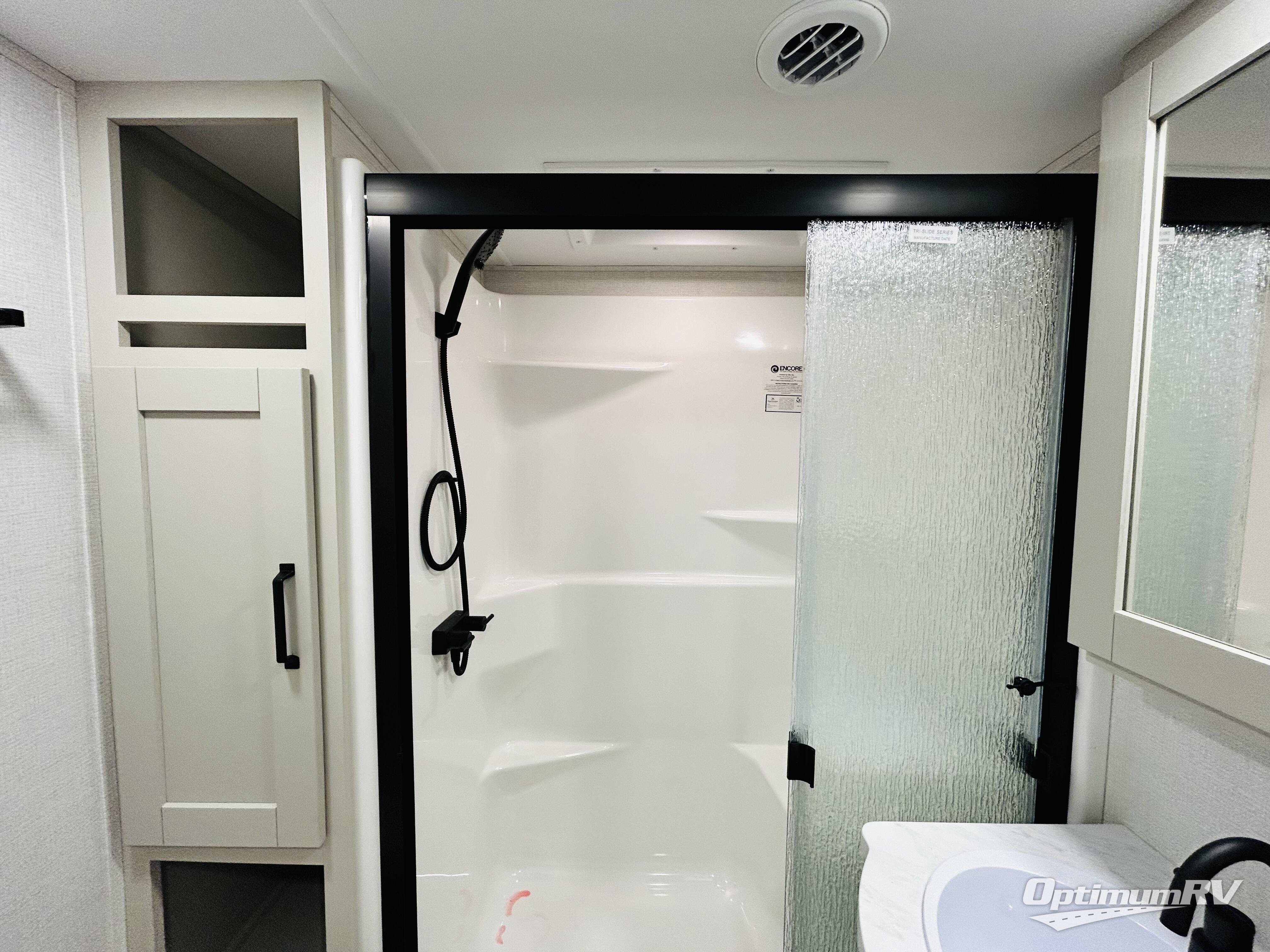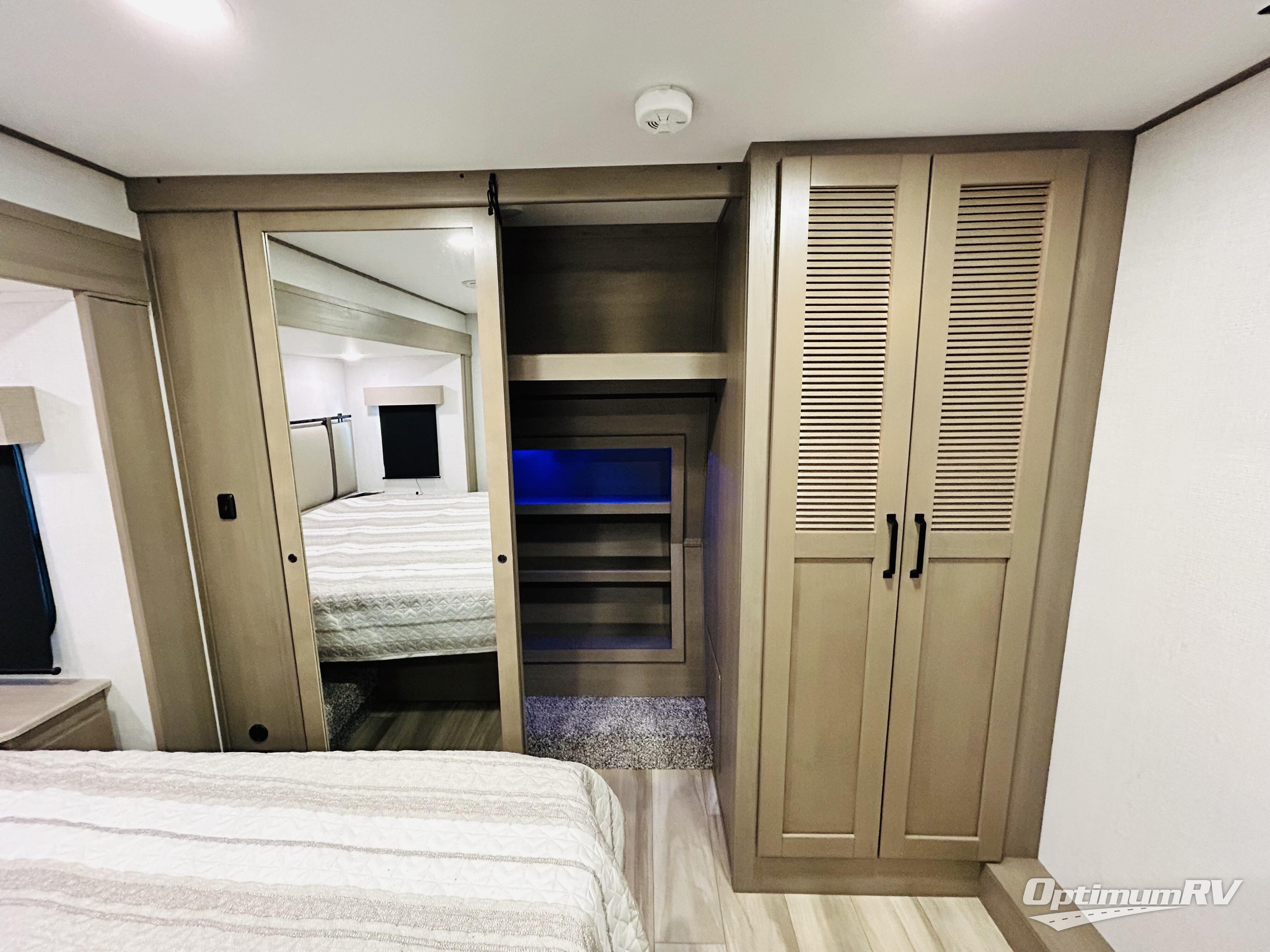 Comfortable accommodations are found throughout this fifth wheel so you can relax, unwind and enjoy your vacation be it for a weekend or a month and even when you have to work! Thanks to the rear desk with a chair and the bedroom with washer and dryer prep, you could stay in this RV as long as you like and keep all your clothes and linens clean. The front bedroom also provides a front wall wardrobe, a slide out queen bed and a dresser. The spacious shower has a glass door and there is linen storage in the full bathroom. The spacious main living and kitchen area has two slide outs with full kitchen amenities and seating with theater seats including cupholders, a booth dinette, and a tri-fold sofa. And the exterior offers an outside kitchen with a griddle, a 1.6 cu ft. refrigerator, and two power awnings!