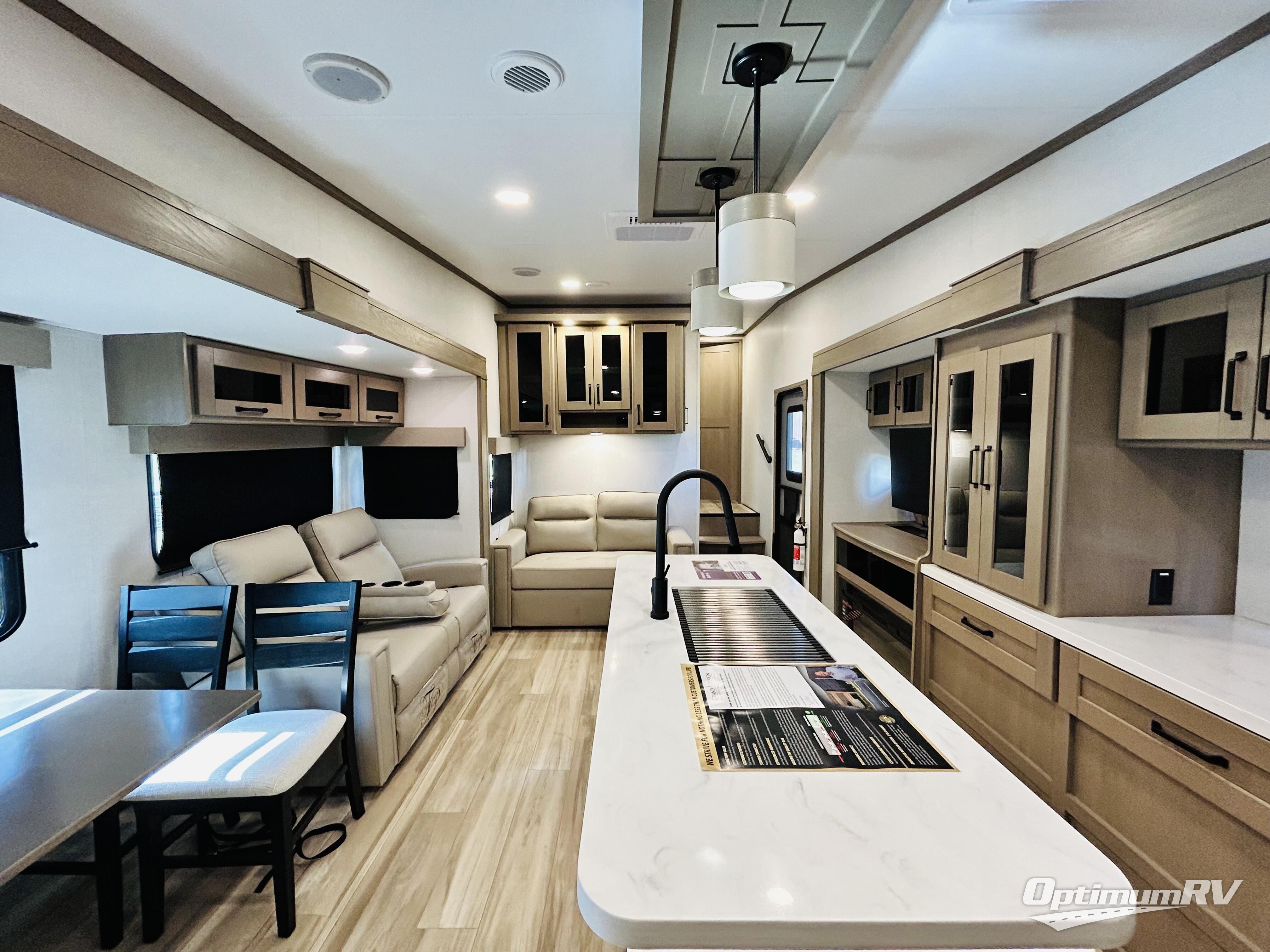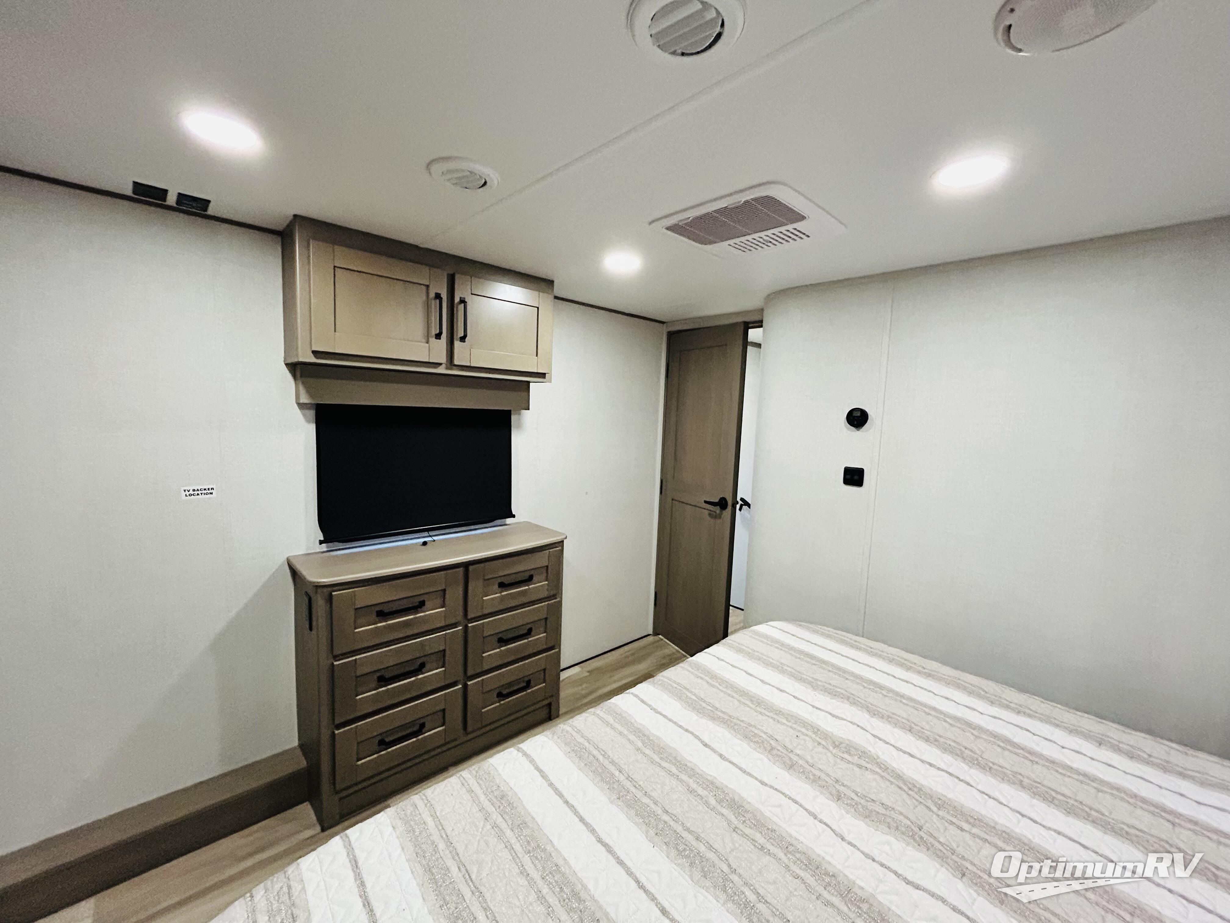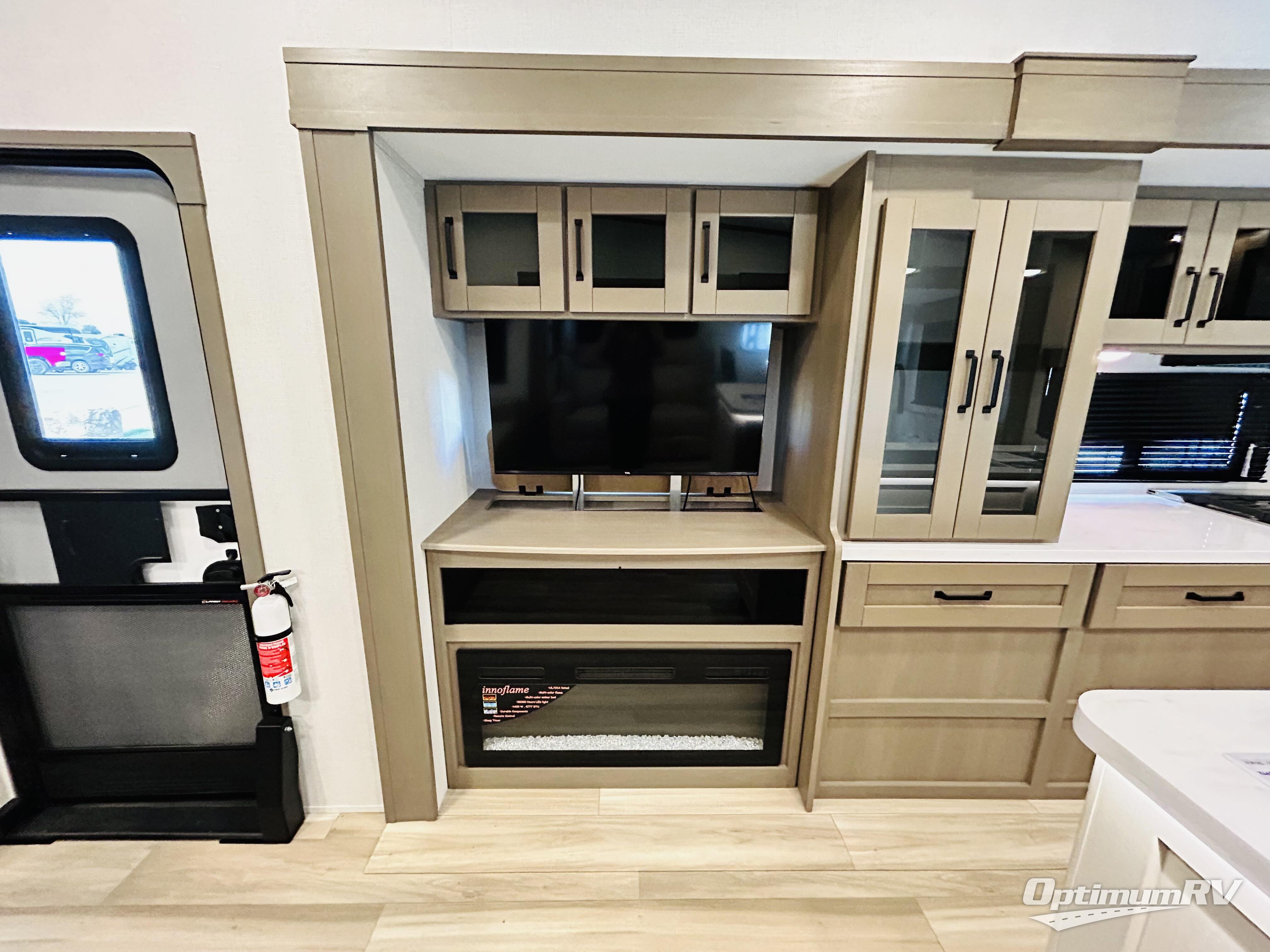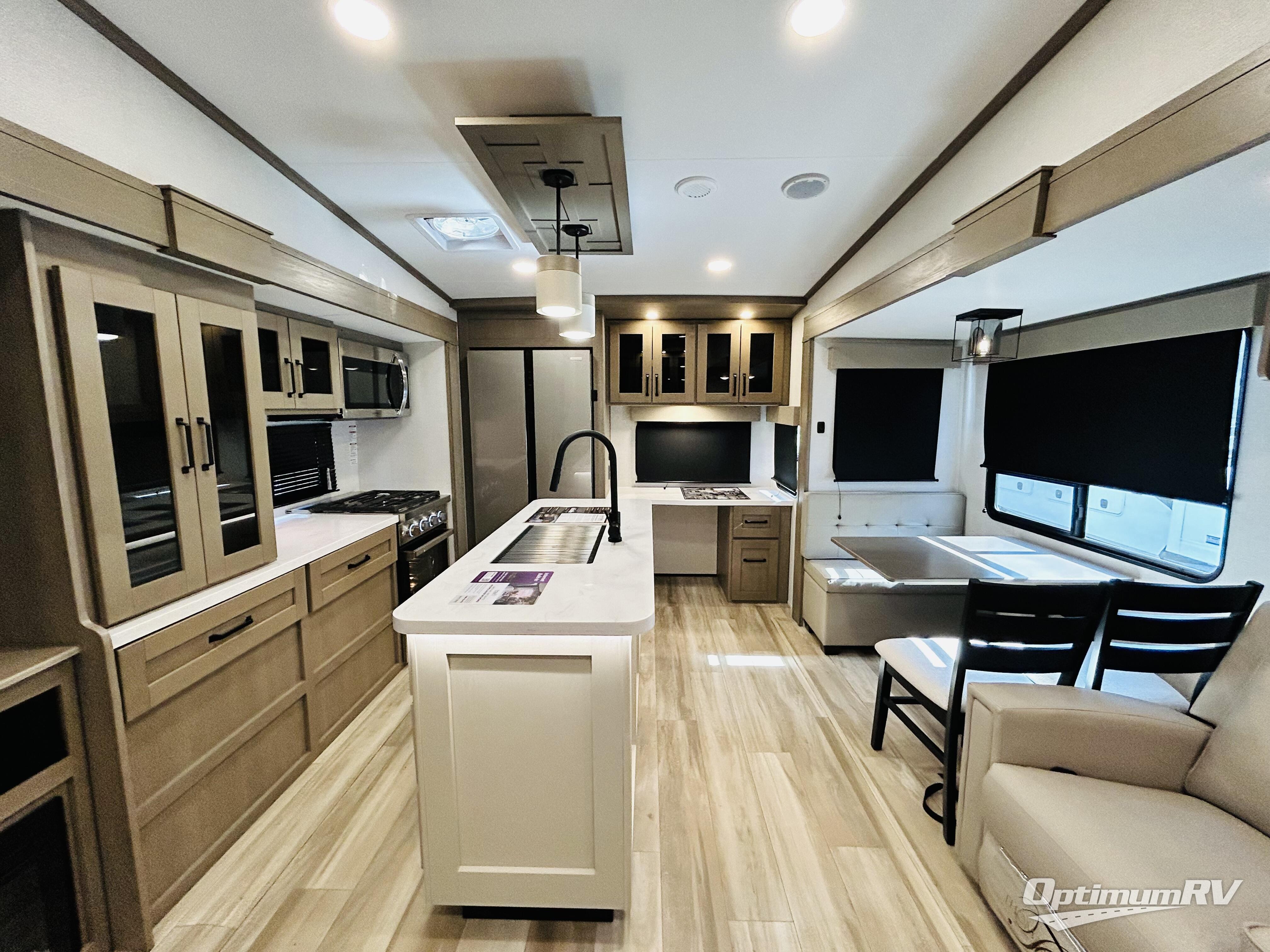 Comfortable accommodations are found throughout this fifth wheel so you can relax, unwind and enjoy your vacation be it for a weekend or a month and even when you have to work! Thanks to the rear desk with a chair and the bedroom with washer and dryer prep, you could stay in this RV as long as you like and keep all your clothes and linens clean. The front bedroom also provides a front wall wardrobe, a slide out queen bed and a dresser. The spacious shower has a glass door and there is linen storage in the full bathroom. The spacious main living and kitchen area has two slide outs with full kitchen amenities and seating with theater seats including cupholders, a booth dinette, and a tri-fold sofa. And the exterior offers an outside kitchen with a griddle, a 1.6 cu ft. refrigerator, and two power awnings!