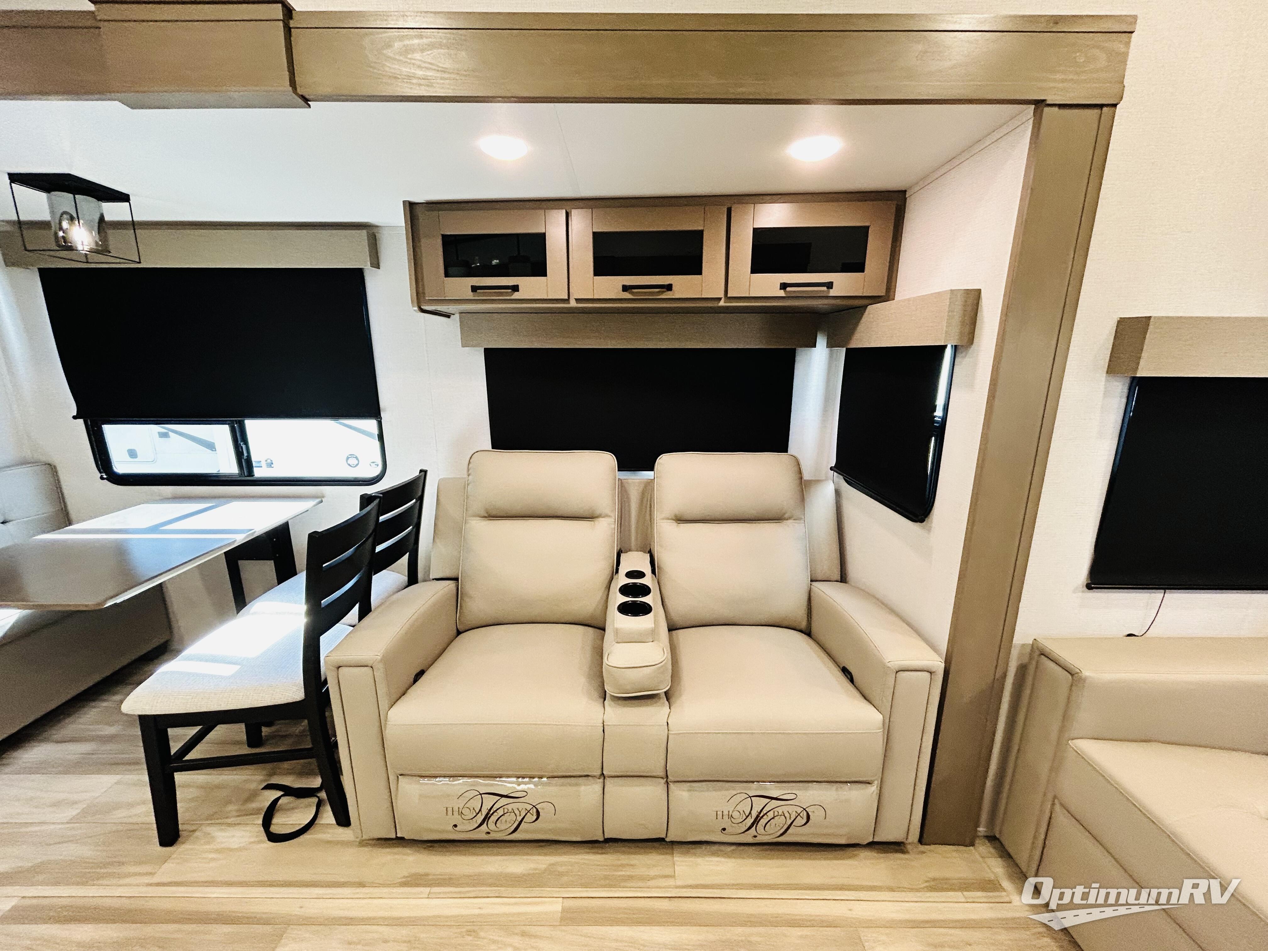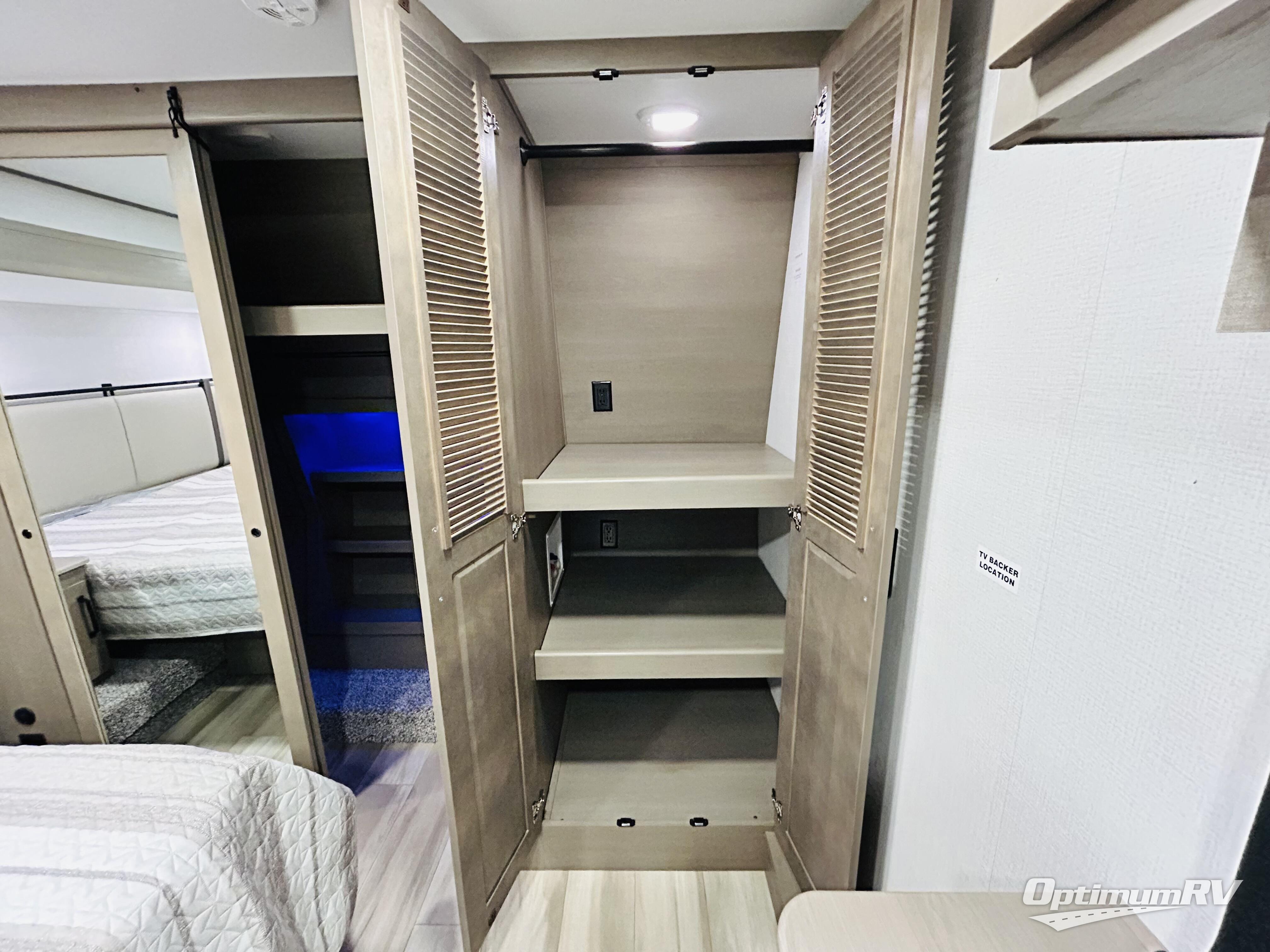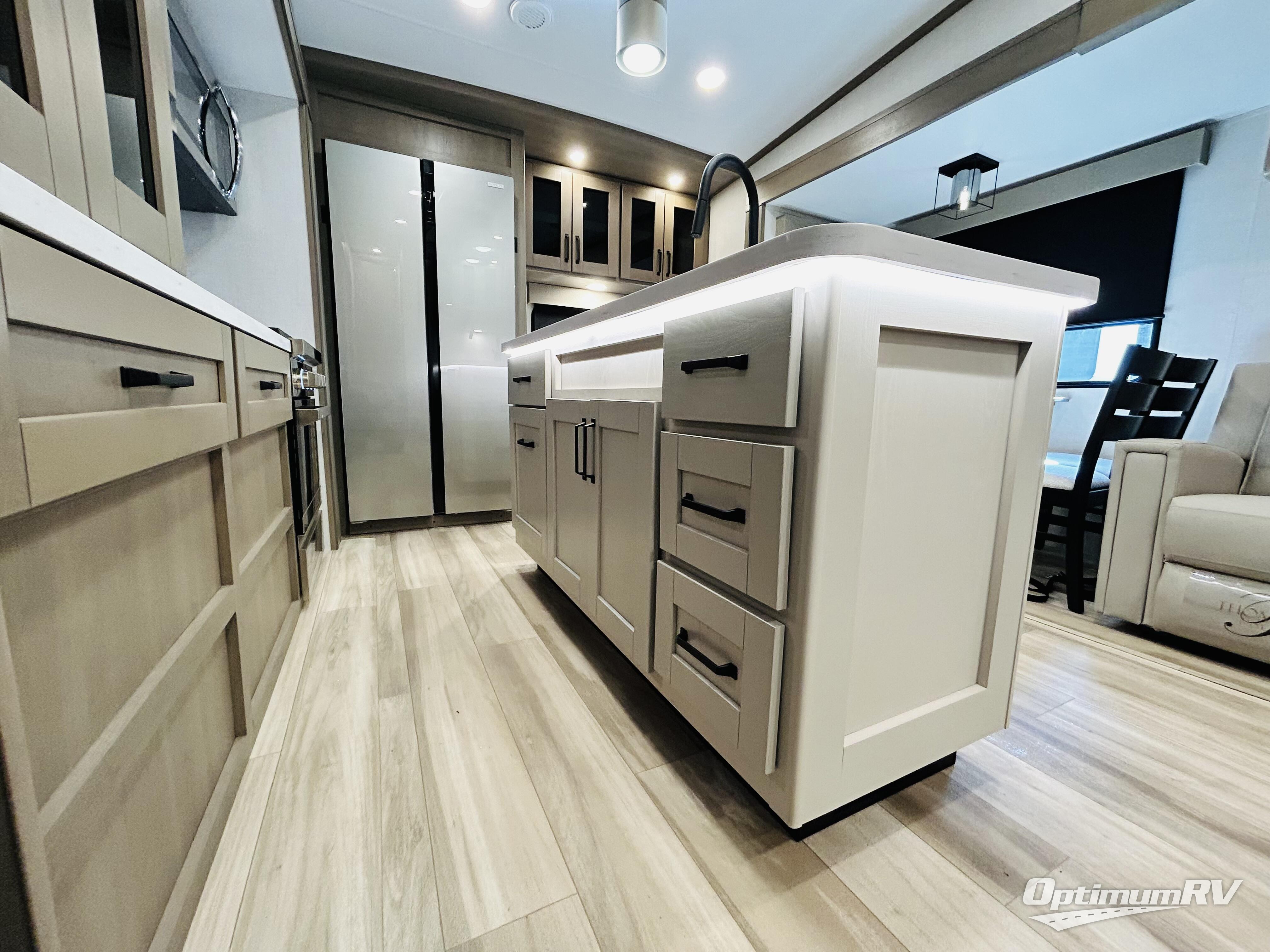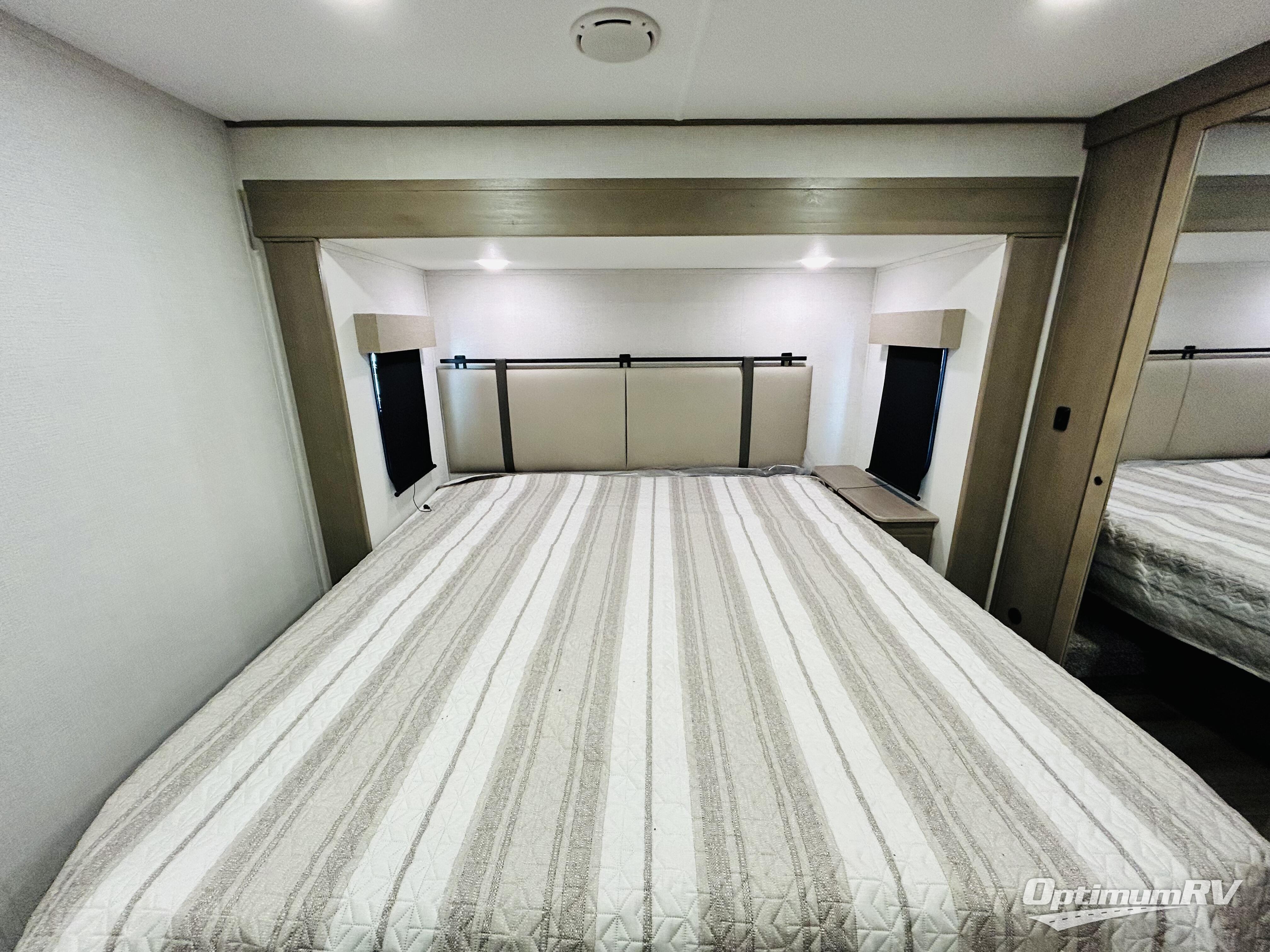 Comfortable accommodations are found throughout this fifth wheel so you can relax, unwind and enjoy your vacation be it for a weekend or a month and even when you have to work! Thanks to the rear desk with a chair and the bedroom with washer and dryer prep, you could stay in this RV as long as you like and keep all your clothes and linens clean. The front bedroom also provides a front wall wardrobe, a slide out queen bed and a dresser. The spacious shower has a glass door and there is linen storage in the full bathroom. The spacious main living and kitchen area has two slide outs with full kitchen amenities and seating with theater seats including cupholders, a booth dinette, and a tri-fold sofa. And the exterior offers an outside kitchen with a griddle, a 1.6 cu ft. refrigerator, and two power awnings!