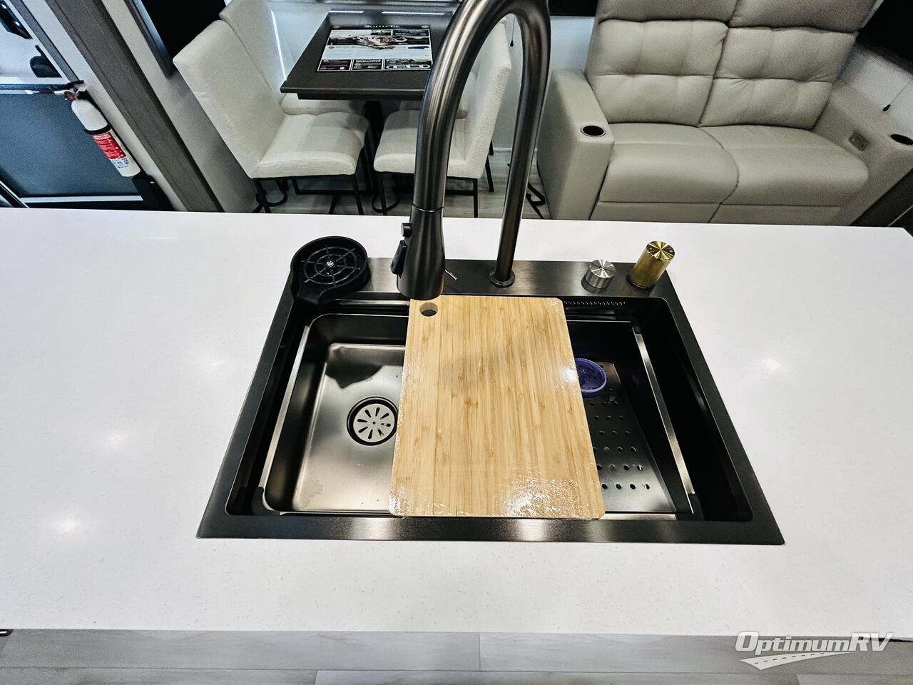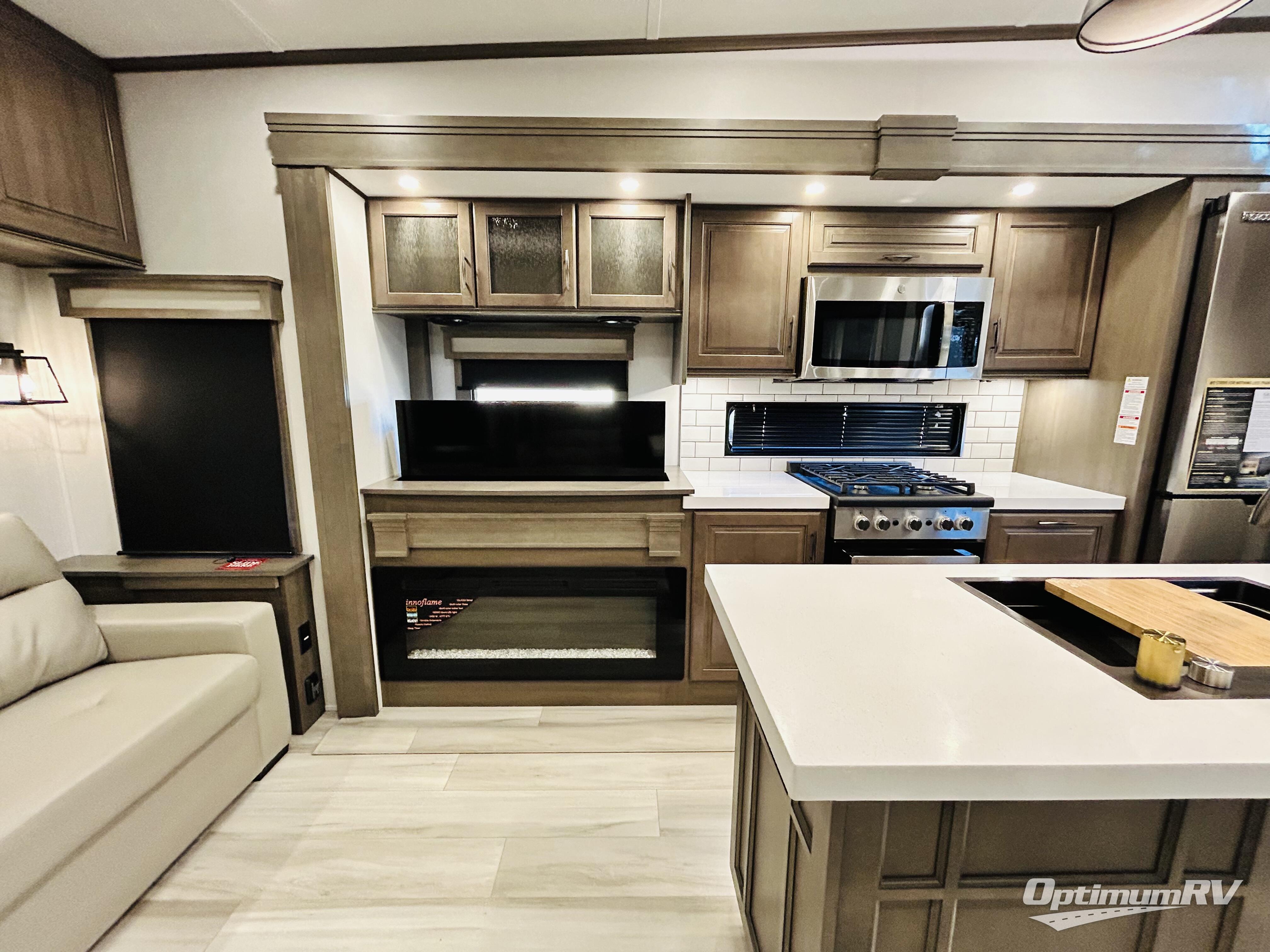 Traveling for long periods at a time is made easy with this gourmet kitchen that can feed your entire group a holiday meal! The professional-grade stainless steel cooktop with a built-in oven, microwave, 12V 20 cu. ft. refrigerator, and a kitchen island offers everything you will need to enjoy cooking for your family and guests. There is abundant storage throughout multiple overhead cabinets, a kitchen pantry and hutch, a bath linen cabinet for your towels, and in the front master bedroom which features a large closet. In the bedroom there is also a queen bed slide for added space to sleep comfortable at night, or you may choose an optional king bed if you enjoy more space. You will also find a closet with washer/dryer prep, large wardrobe, plus a slide top dresser. Two nice awnings will provide outdoor living space keeping you protected from the sun and rain, and you can add an optional pull-out kitchen to enjoy convenient cooking outdoors as well.