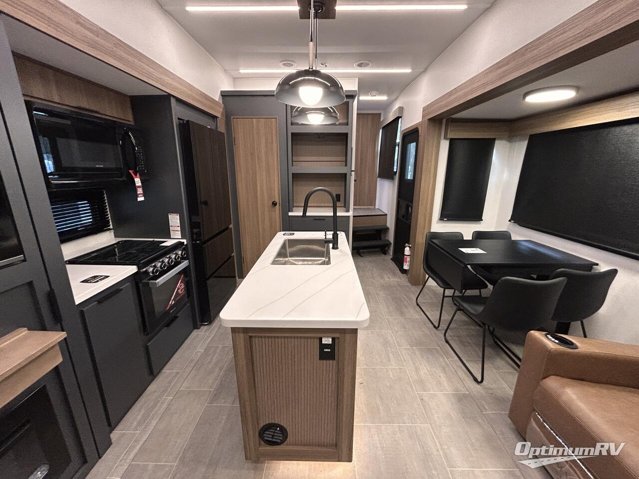 You won't even feel like you're camping in this fifth wheel! The front master suite has a 72" x 80" king bed slide across from a dresser and next to an area prepped for a washer and dryer, plus there is a front dresser with wardrobes on either side and even an entrance into the dual entry bathroom. The bathroom has a radius shower to freshen up in each morning and a lighted mirror to make it easier for seeing as you get ready. The chef will have a great time preparing their best meals in the kitchen with the kitchen island, 16 cu. ft. refrigerator big enough for their favorite ingredients, a 22" oven to cook fresh cinnamon rolls, and a 30" over the range microwave to pop a bag of popcorn on movie night. Relax in true comfort in the rear living area on the residential furniture with hidden cup holders and USB charging ports by the electric fireplace with hidden storage!