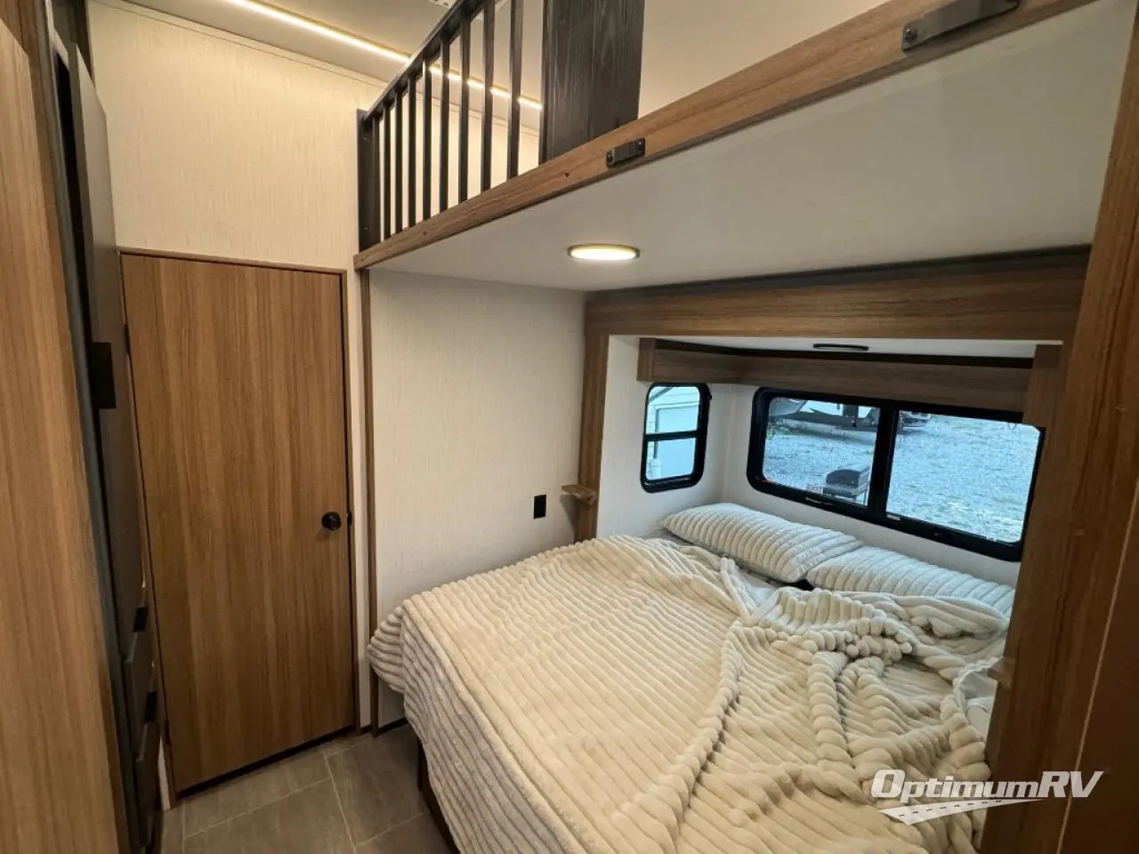 The whole family will love camping in this fifth wheel! It has everything you could need and then some, like the two full bathrooms and bedrooms. The front private bedroom has a queen bed with a wardrobe slide and a closet prepped to add a washer and dryer. The second bedroom has a queen bed slide that can be switched out for an optional sofa and a desk with TV prep, wardrobes, and a loft above it all, plus it has access to a full bathroom that also has one of the dual entry doors for easy access to the outdoors. The kitchen and living area will have you feeling right at home with a kitchen island, a 55" Smart TV and fireplace with hidden storage. There is even a wine rack and coffee bar for everyone to enjoy their favorite beverages. Enjoy your meals at the free standing table with four chairs. The residential furniture has footrests, hidden cup holders, and USB charging ports to keep your electronics at 100%!