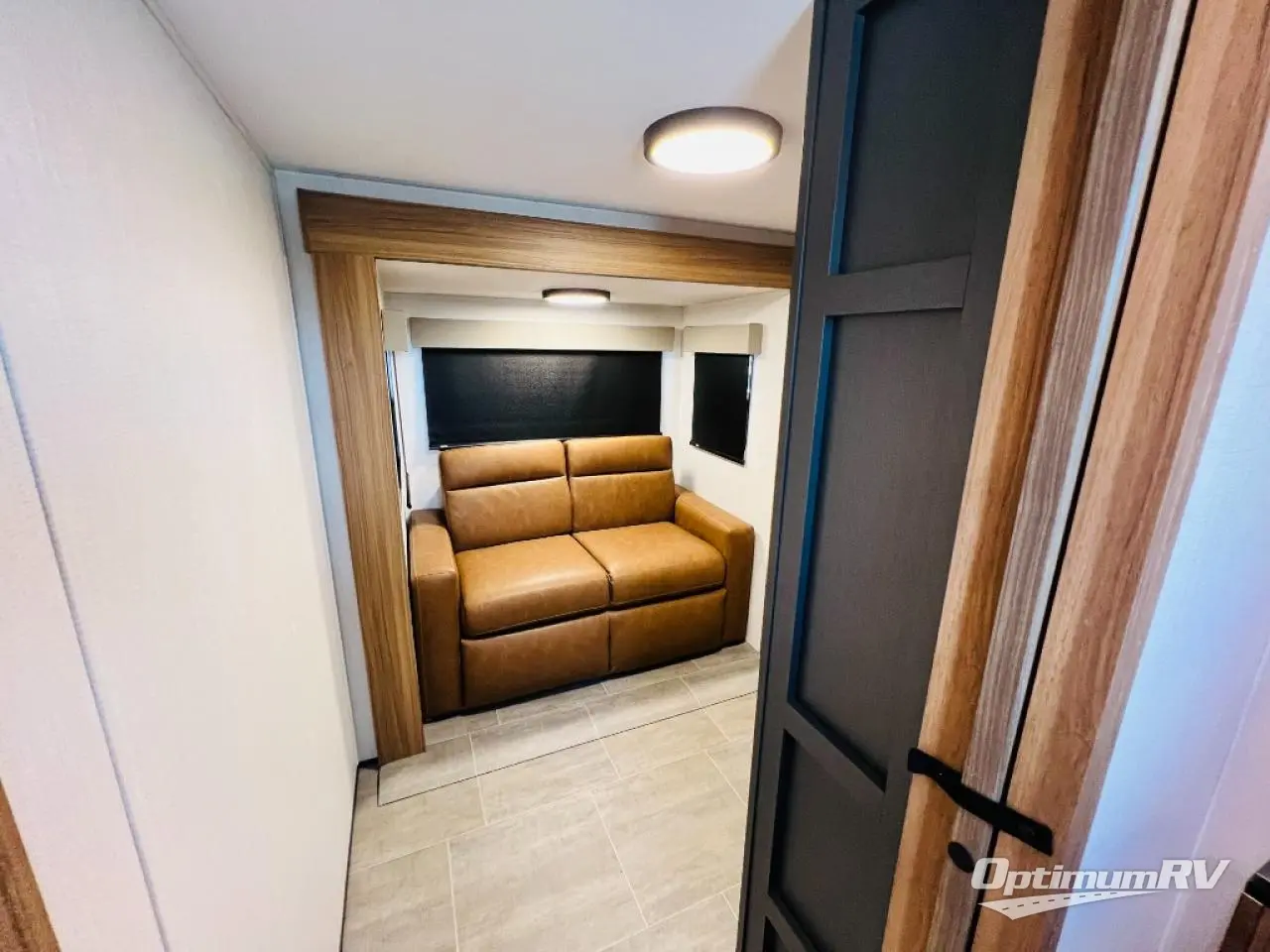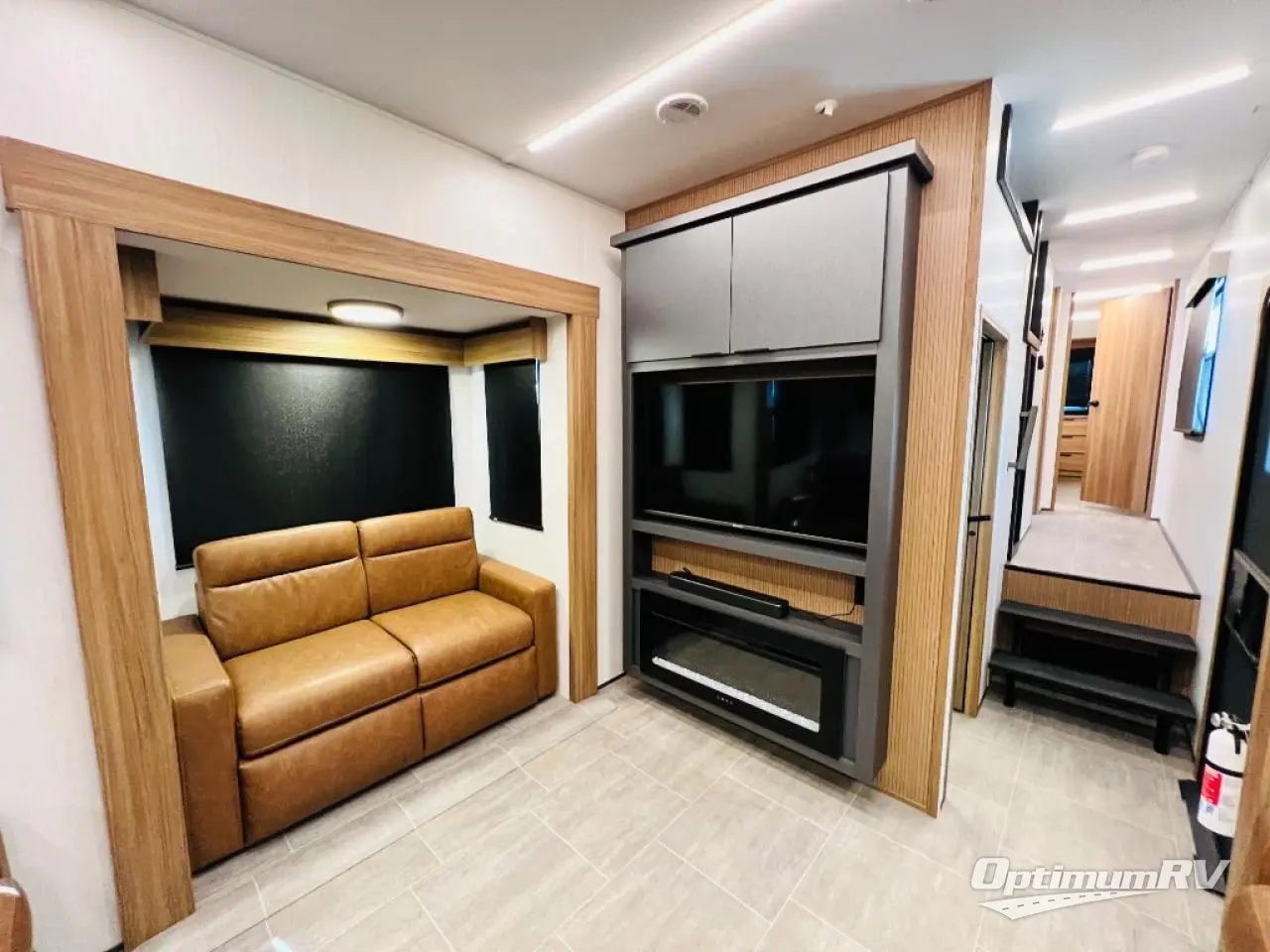 This fifth wheel is big enough for the whole group to go camping! The front master suite has a 72" x 80" king bed slide across from a dresser, plus there is a front dresser with wardrobes on either side and even an entrance into the dual entry bathroom. The bathroom has a shower to freshen up in each morning, a lighted mirror to make it easier for seeing as you get ready, and a closet prepped for a washer and dryer to be added. There is also a second bedroom that has a loft above a sofa slide, a wardrobe, and an entertainment center. The chef will have a great time preparing their best meals in the rear kitchen with the countertop space, 16 cu. ft. refrigerator big enough for their favorite ingredients, a 22" oven to cook fresh cinnamon rolls, and a 30" over the range microwave to pop a bag of popcorn on movie night. Just outside the kitchen is the living area where you can relax in true comfort on the residential furniture with hidden cup holders and USB charging ports by the electric fireplace with hidden storage!