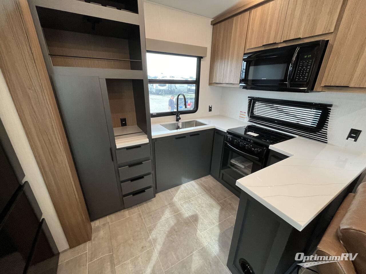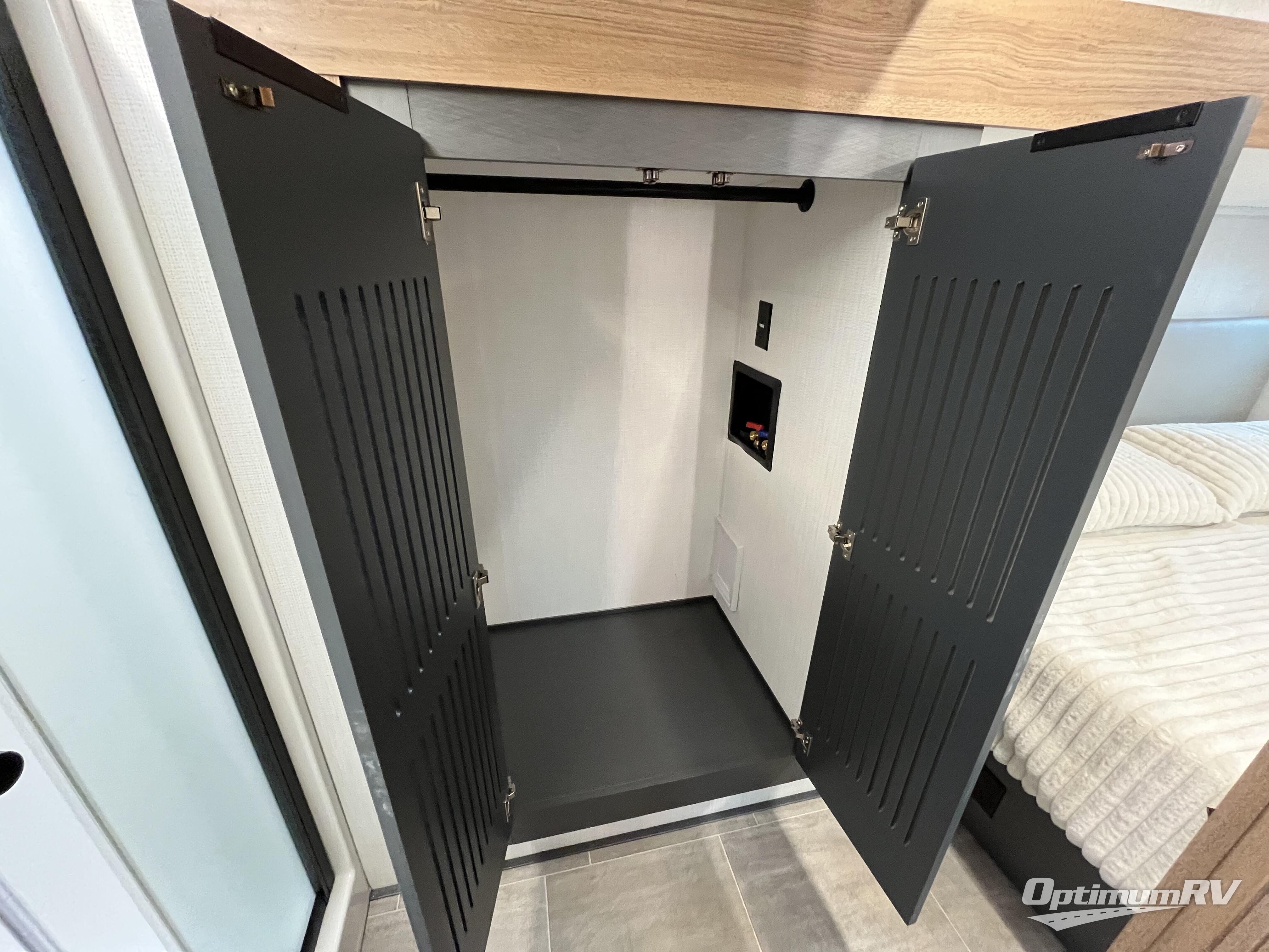 This fifth wheel is big enough for the whole group to go camping! The front master suite has a 72" x 80" king bed slide across from a dresser, plus there is a front dresser with wardrobes on either side and even an entrance into the dual entry bathroom. The bathroom has a shower to freshen up in each morning, a lighted mirror to make it easier for seeing as you get ready, and a closet prepped for a washer and dryer to be added. There is also a second bedroom that has a loft above a sofa slide, a wardrobe, and an entertainment center. The chef will have a great time preparing their best meals in the rear kitchen with the countertop space, 16 cu. ft. refrigerator big enough for their favorite ingredients, a 22" oven to cook fresh cinnamon rolls, and a 30" over the range microwave to pop a bag of popcorn on movie night. Just outside the kitchen is the living area where you can relax in true comfort on the residential furniture with hidden cup holders and USB charging ports by the electric fireplace with hidden storage!