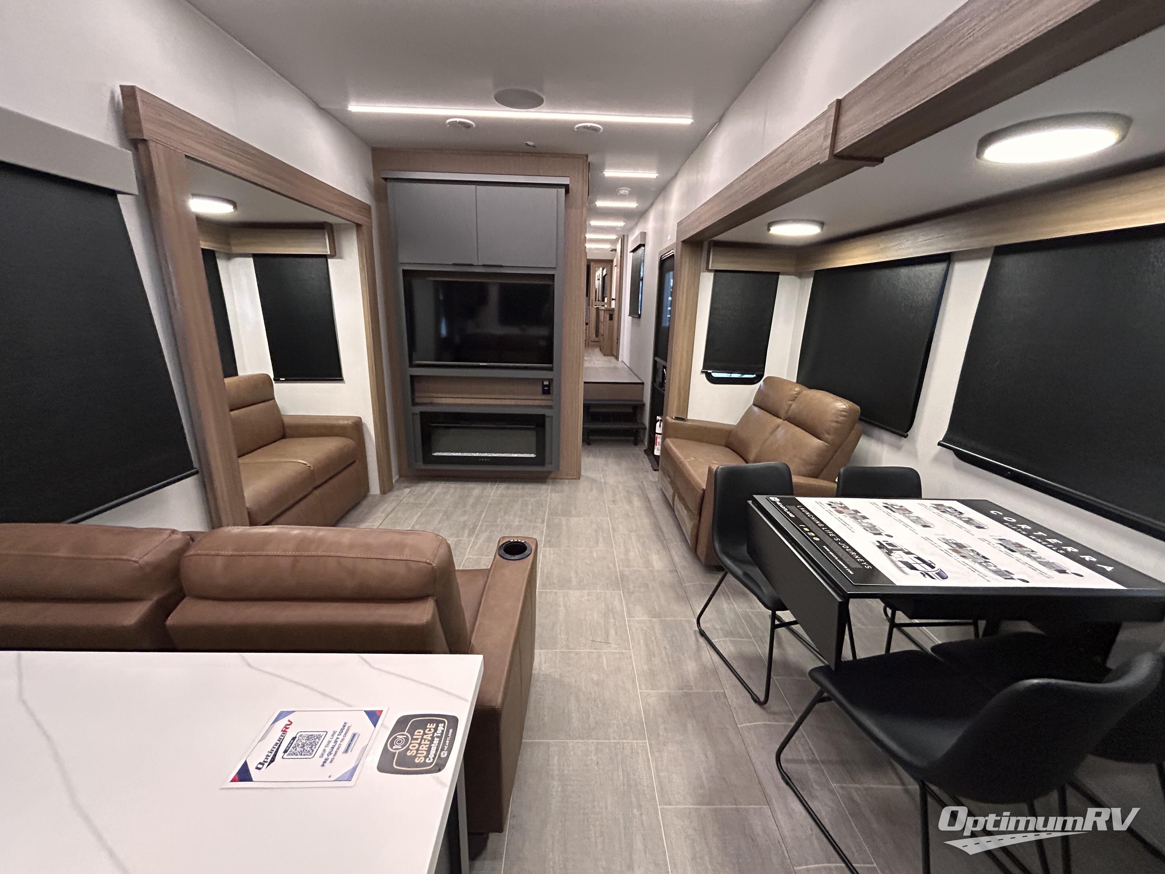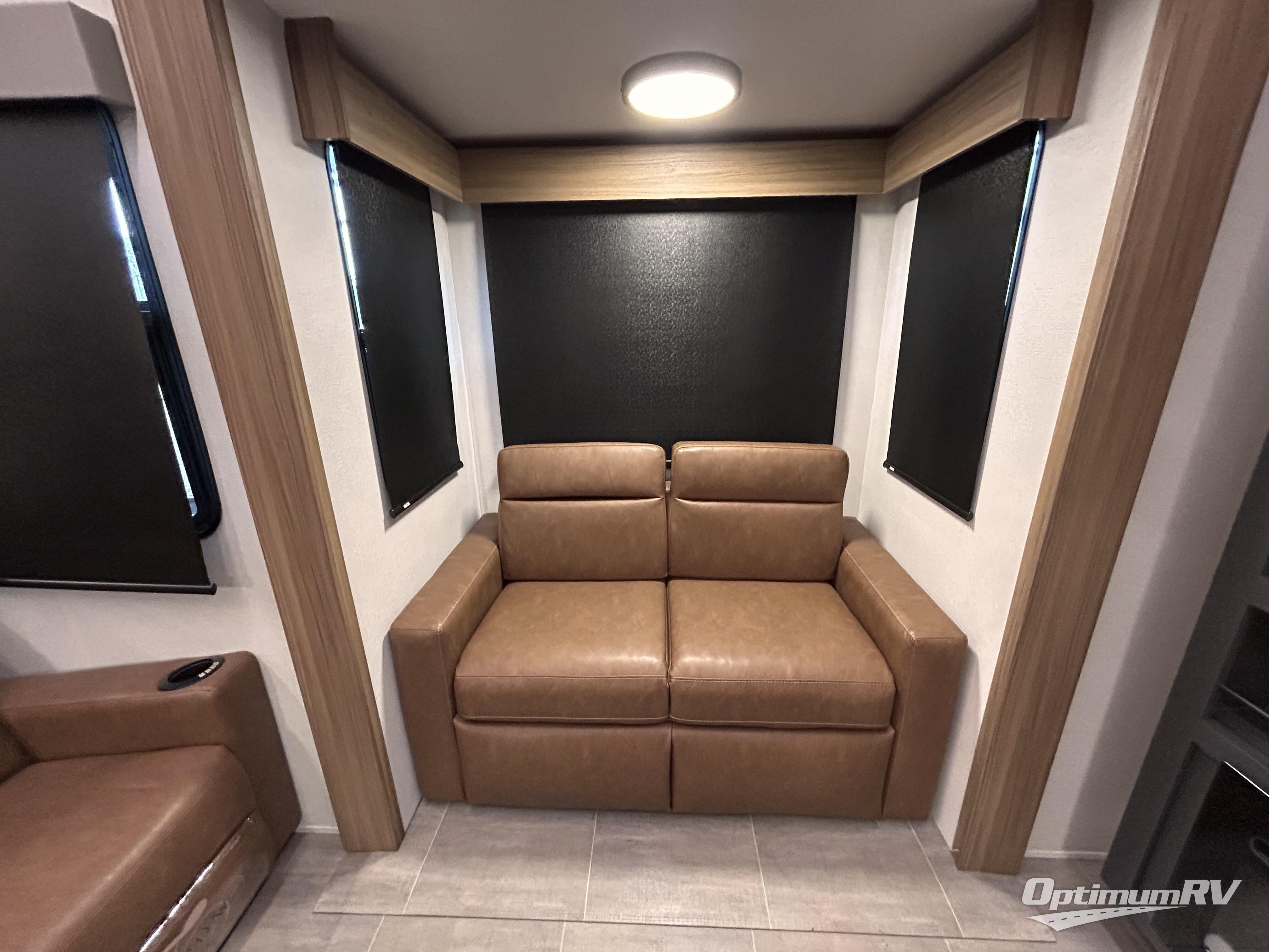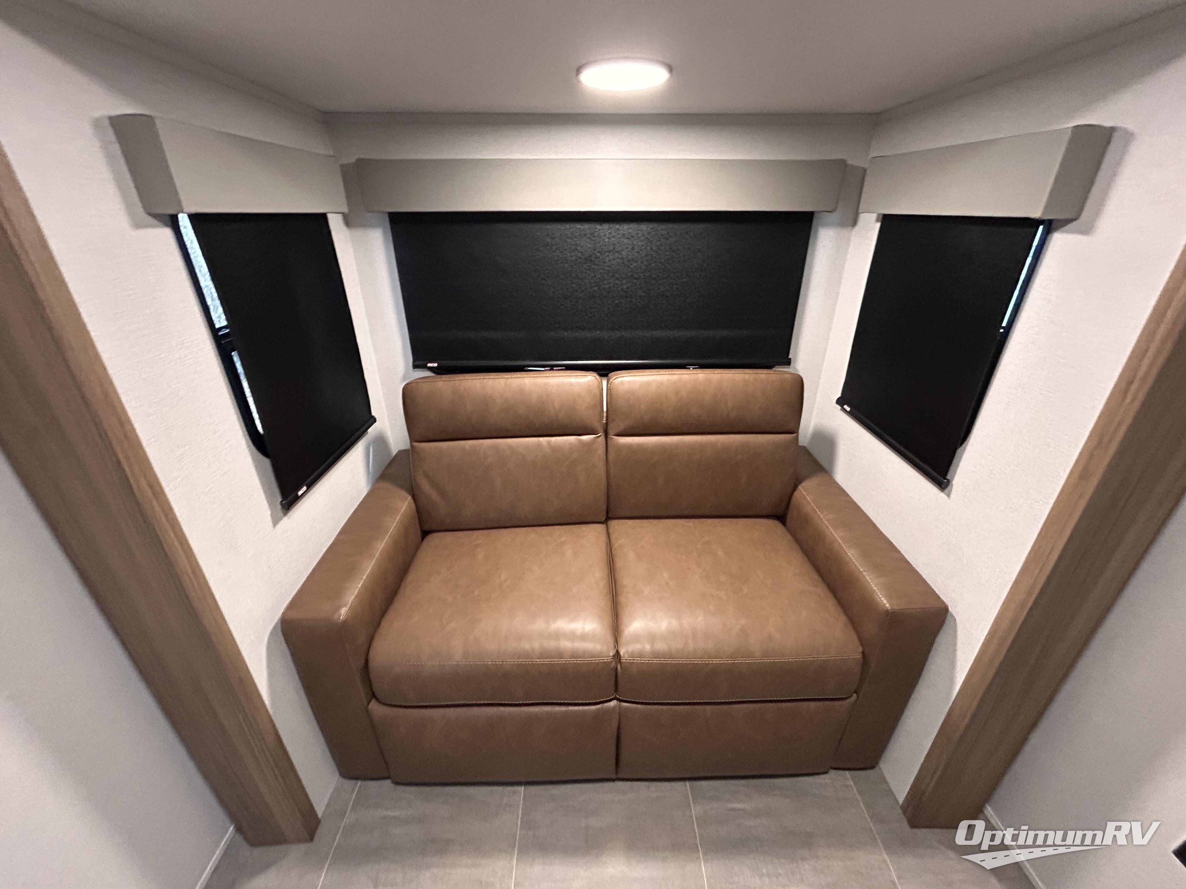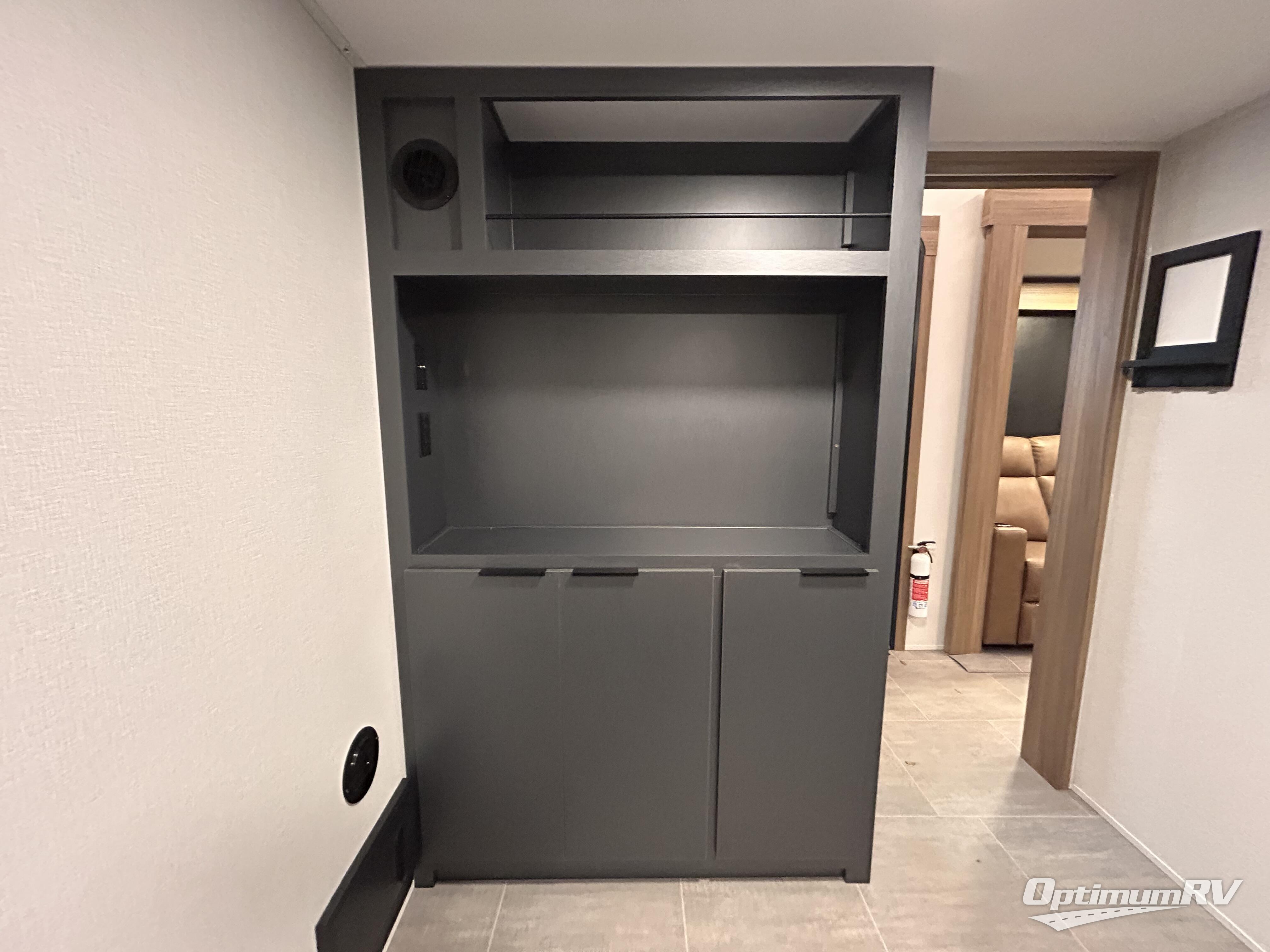 This fifth wheel is big enough for the whole group to go camping! The front master suite has a 72" x 80" king bed slide across from a dresser and next to an area prepped for a washer and dryer, plus there is a front dresser with wardrobes on either side and even an entrance into the dual entry bathroom. The bathroom has a radius shower to freshen up in each morning and a lighted mirror to make it easier for seeing as you get ready. There is also a second bedroom that has a loft above a sofa slide, a wardrobe, and an entertainment center. The chef will have a great time preparing their best meals in the rear kitchen with the countertop space, 16 cu. ft. refrigerator big enough for their favorite ingredients, a 22" oven to cook fresh cinnamon rolls, and a 30" over the range microwave to pop a bag of popcorn on movie night, plus there are optional barstools that you can add for a breakfast area. Just outside the kitchen is the living area where you can relax in true comfort on the residential furniture with hidden cup holders and USB charging ports by the electric fireplace with hidden storage!