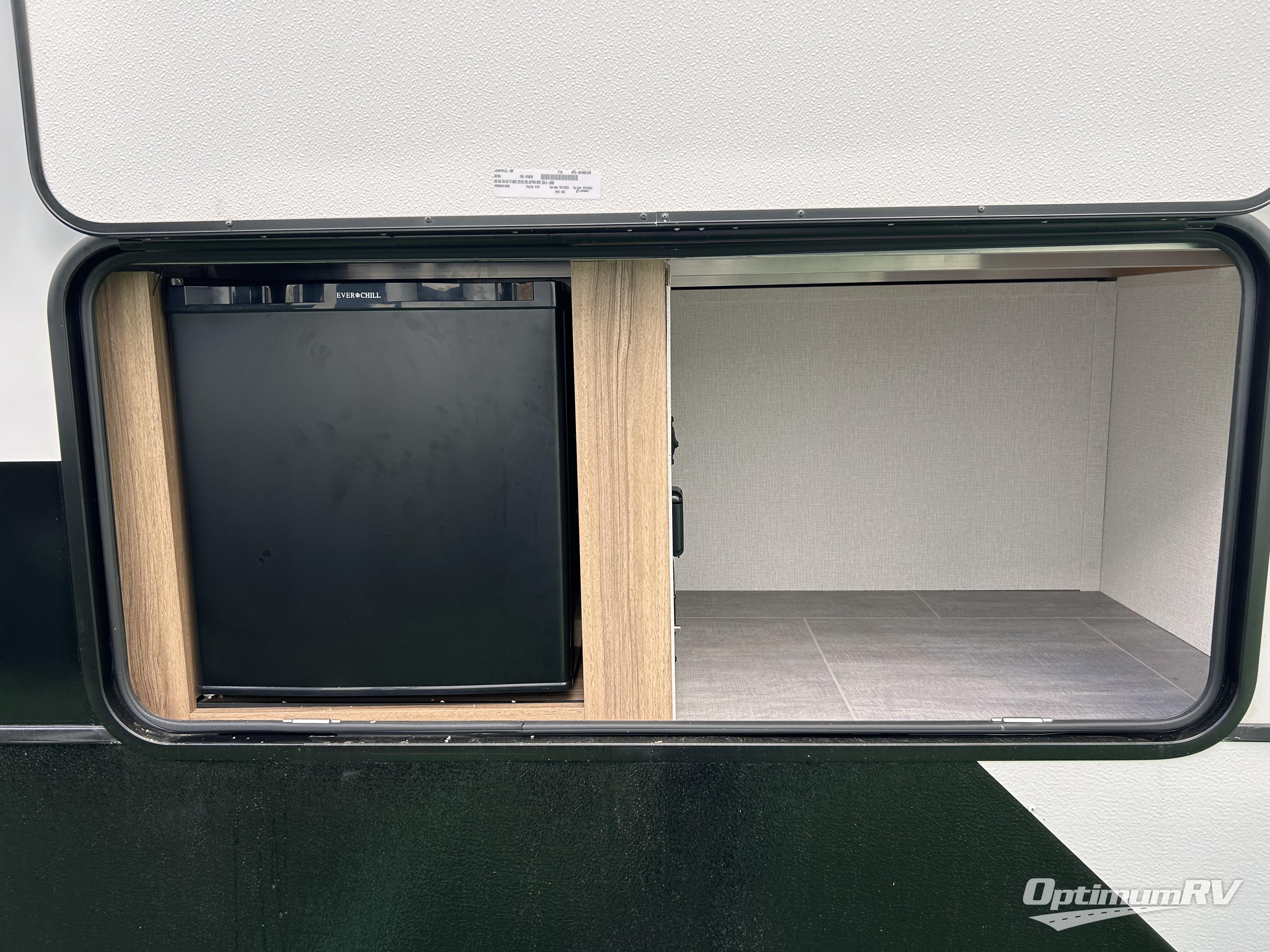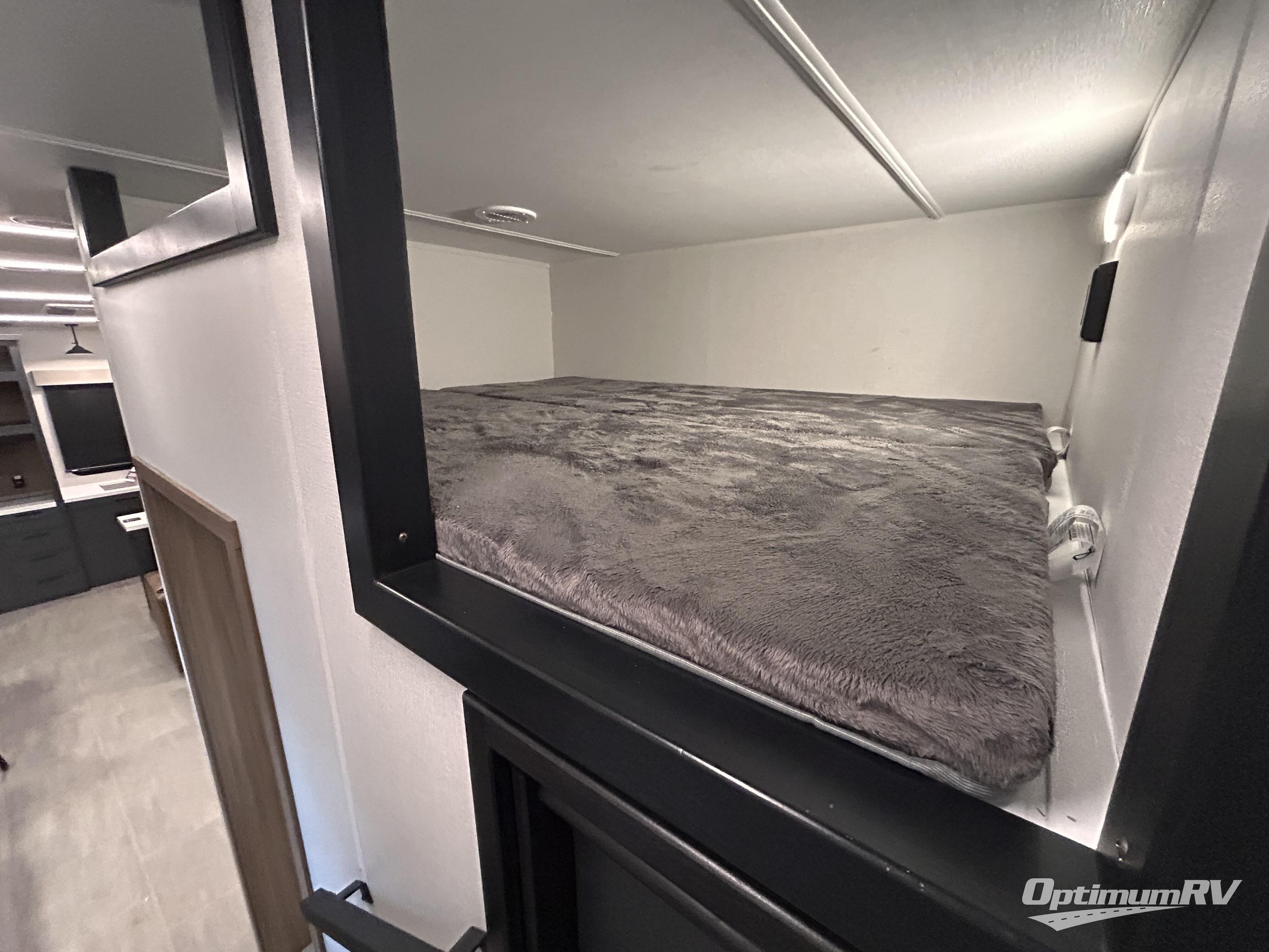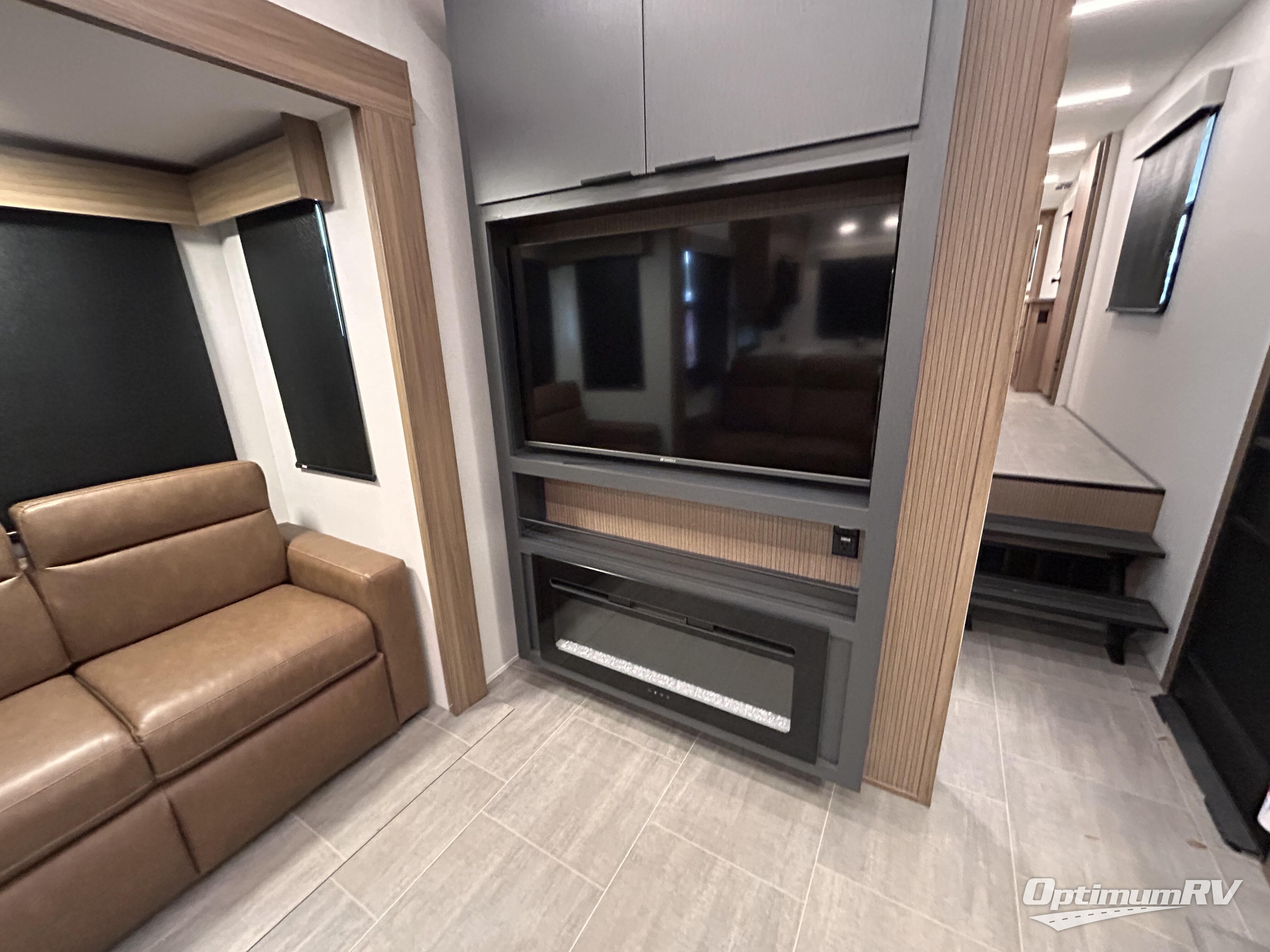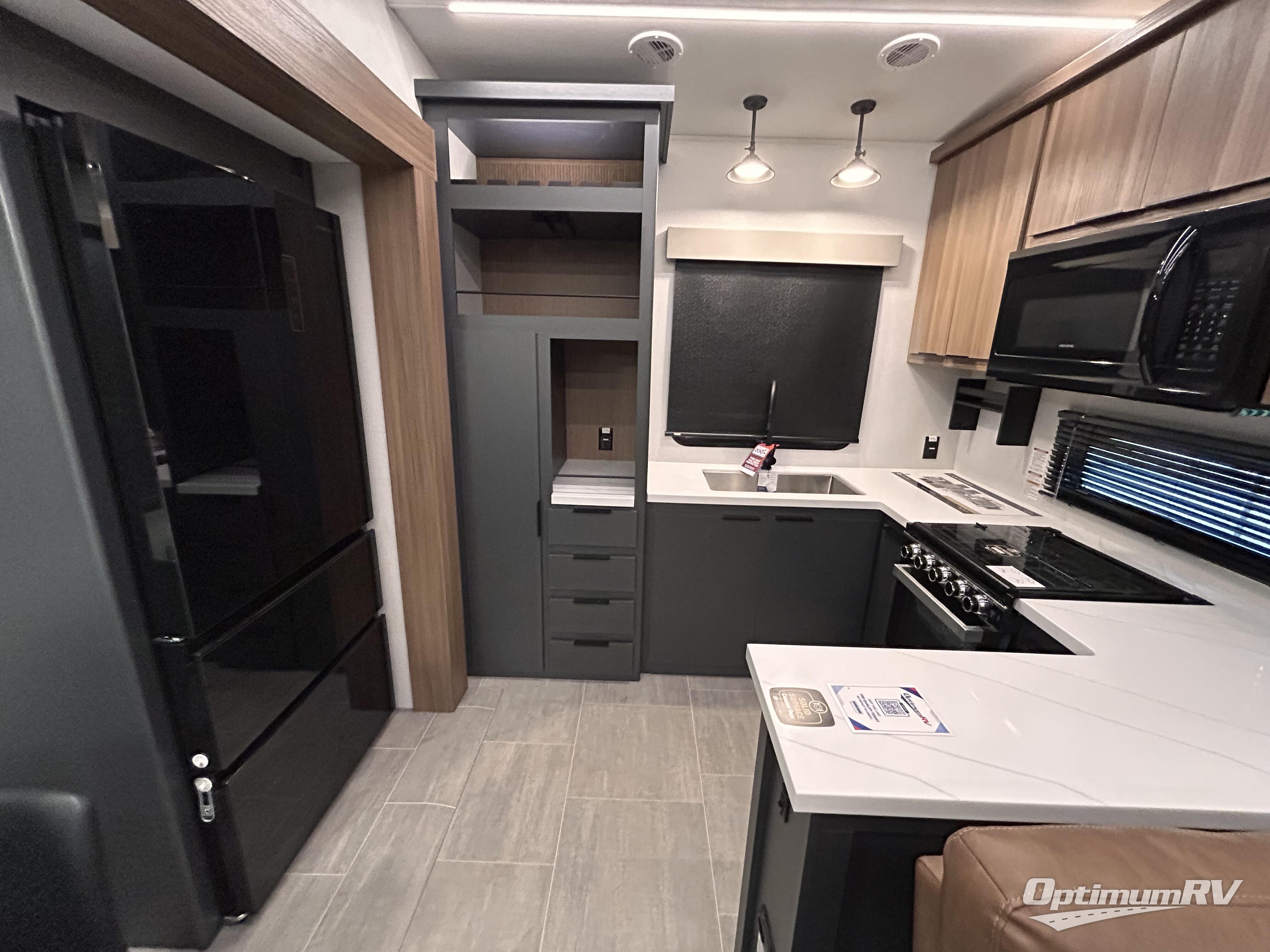 This fifth wheel is big enough for the whole group to go camping! The front master suite has a 72" x 80" king bed slide across from a dresser and next to an area prepped for a washer and dryer, plus there is a front dresser with wardrobes on either side and even an entrance into the dual entry bathroom. The bathroom has a radius shower to freshen up in each morning and a lighted mirror to make it easier for seeing as you get ready. There is also a second bedroom that has a loft above a sofa slide, a wardrobe, and an entertainment center. The chef will have a great time preparing their best meals in the rear kitchen with the countertop space, 16 cu. ft. refrigerator big enough for their favorite ingredients, a 22" oven to cook fresh cinnamon rolls, and a 30" over the range microwave to pop a bag of popcorn on movie night, plus there are optional barstools that you can add for a breakfast area. Just outside the kitchen is the living area where you can relax in true comfort on the residential furniture with hidden cup holders and USB charging ports by the electric fireplace with hidden storage!