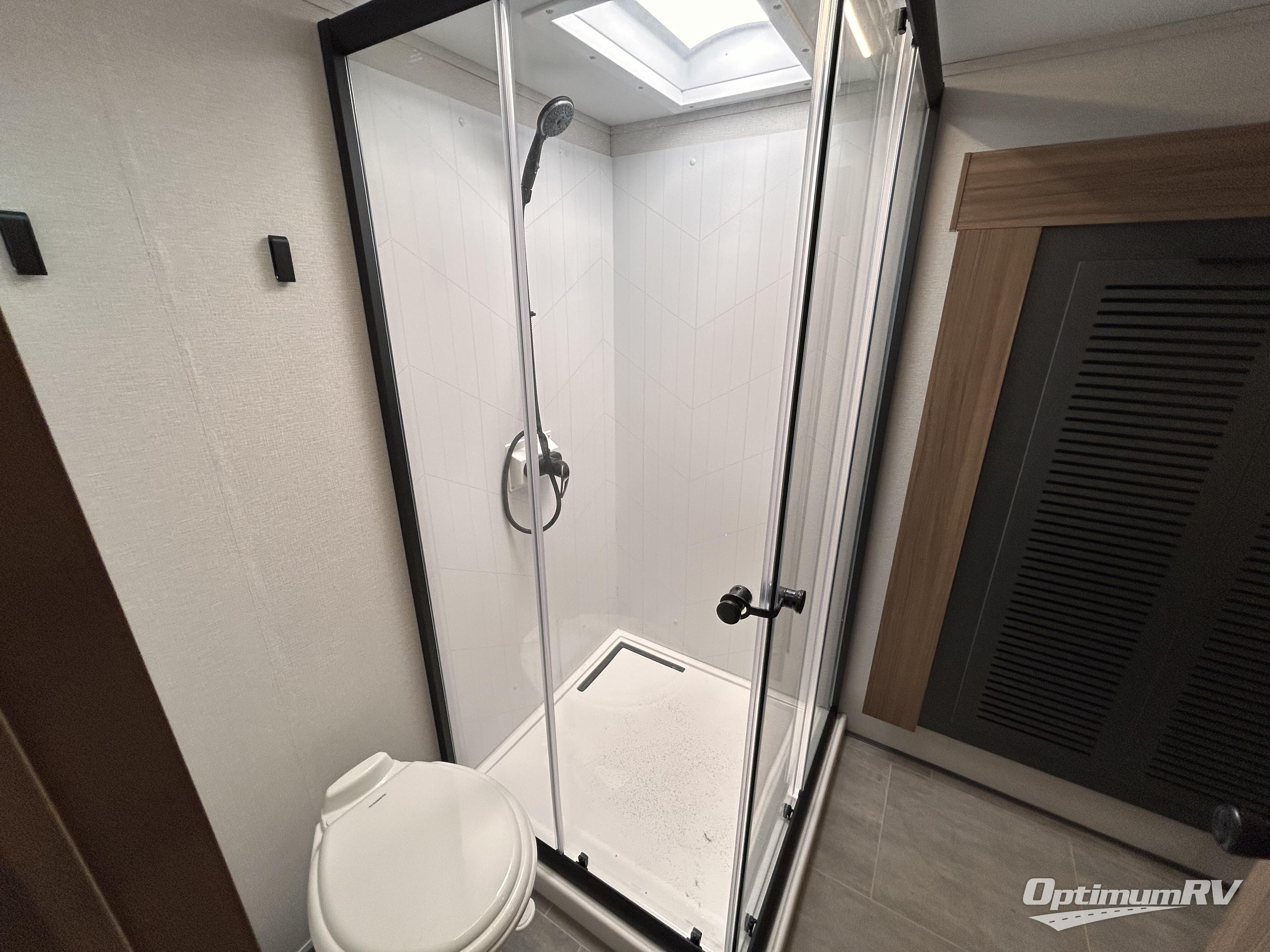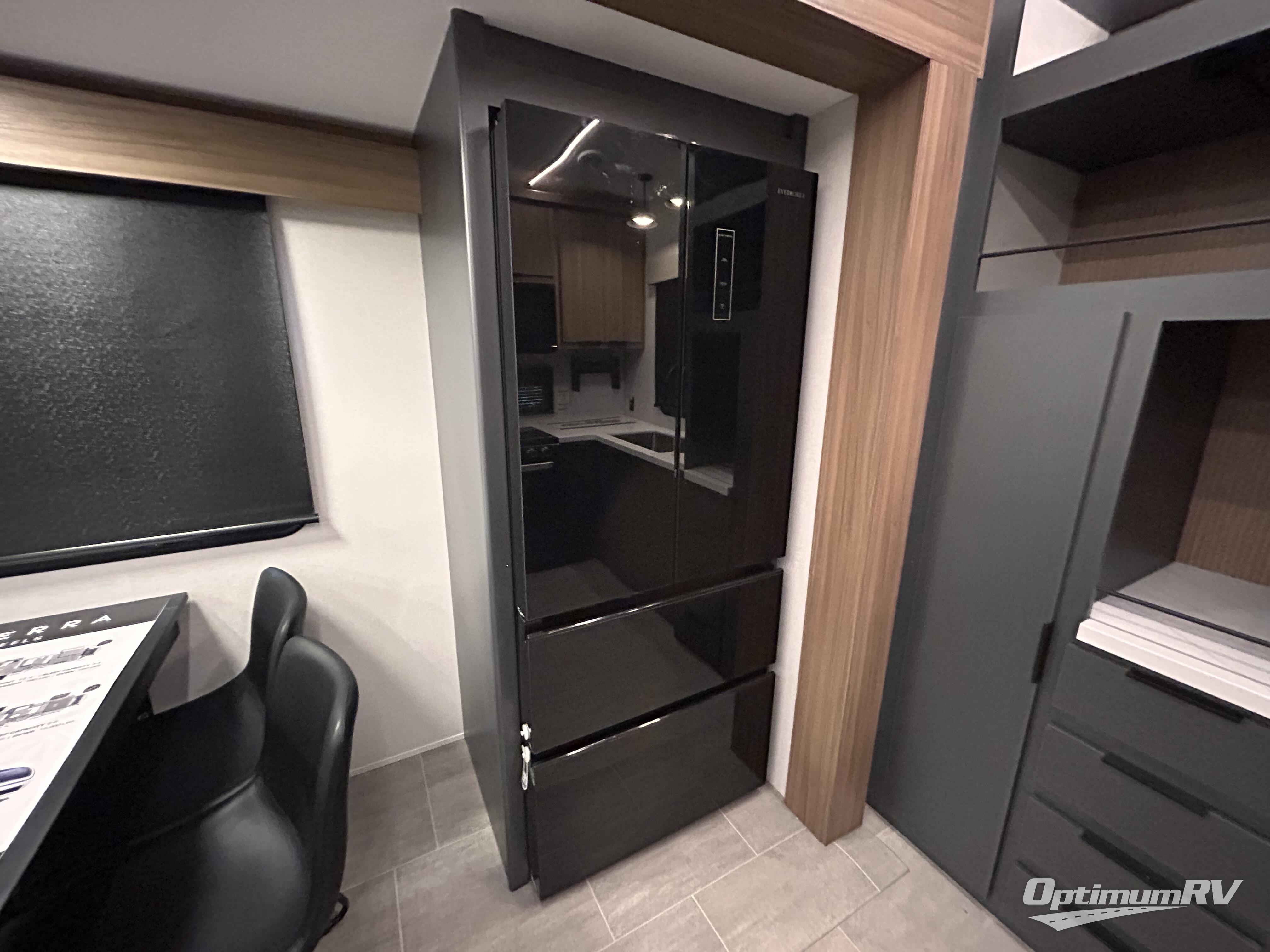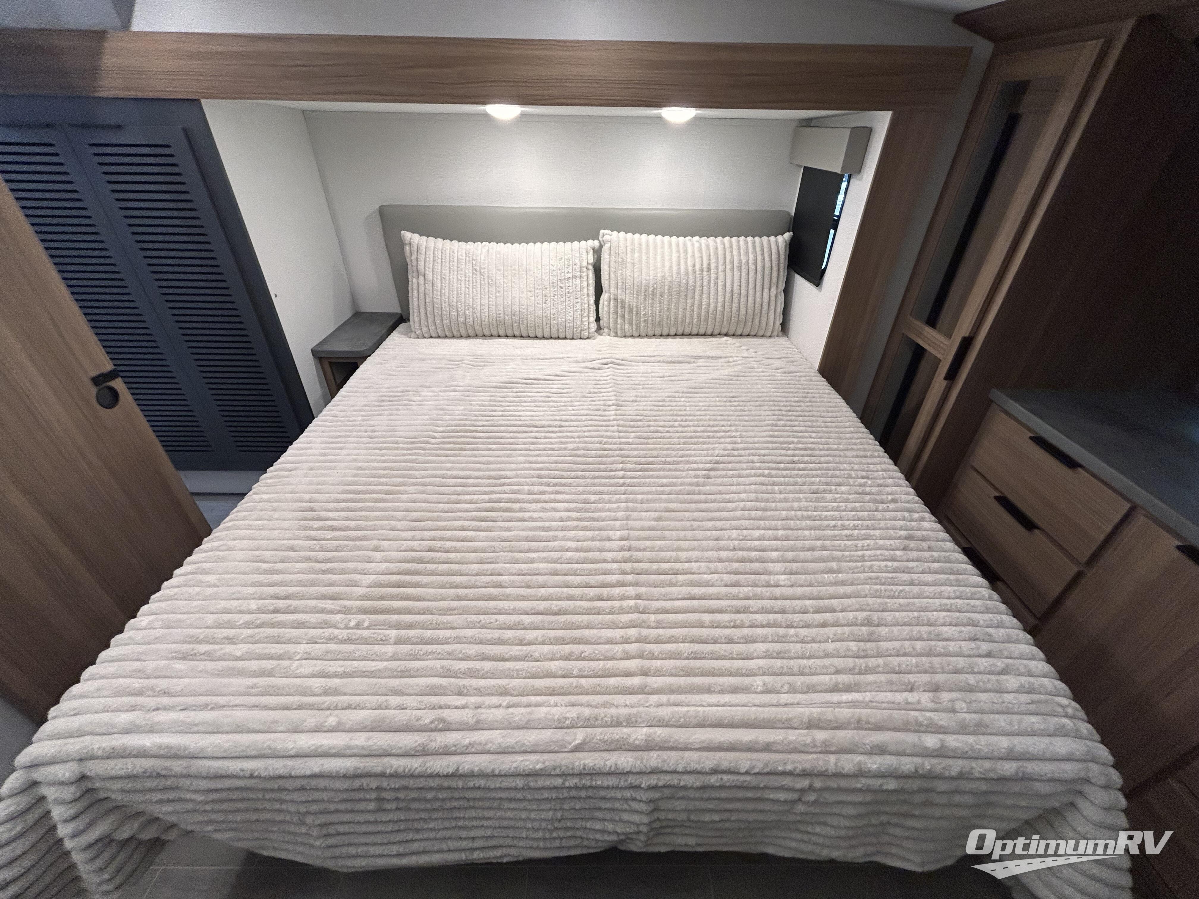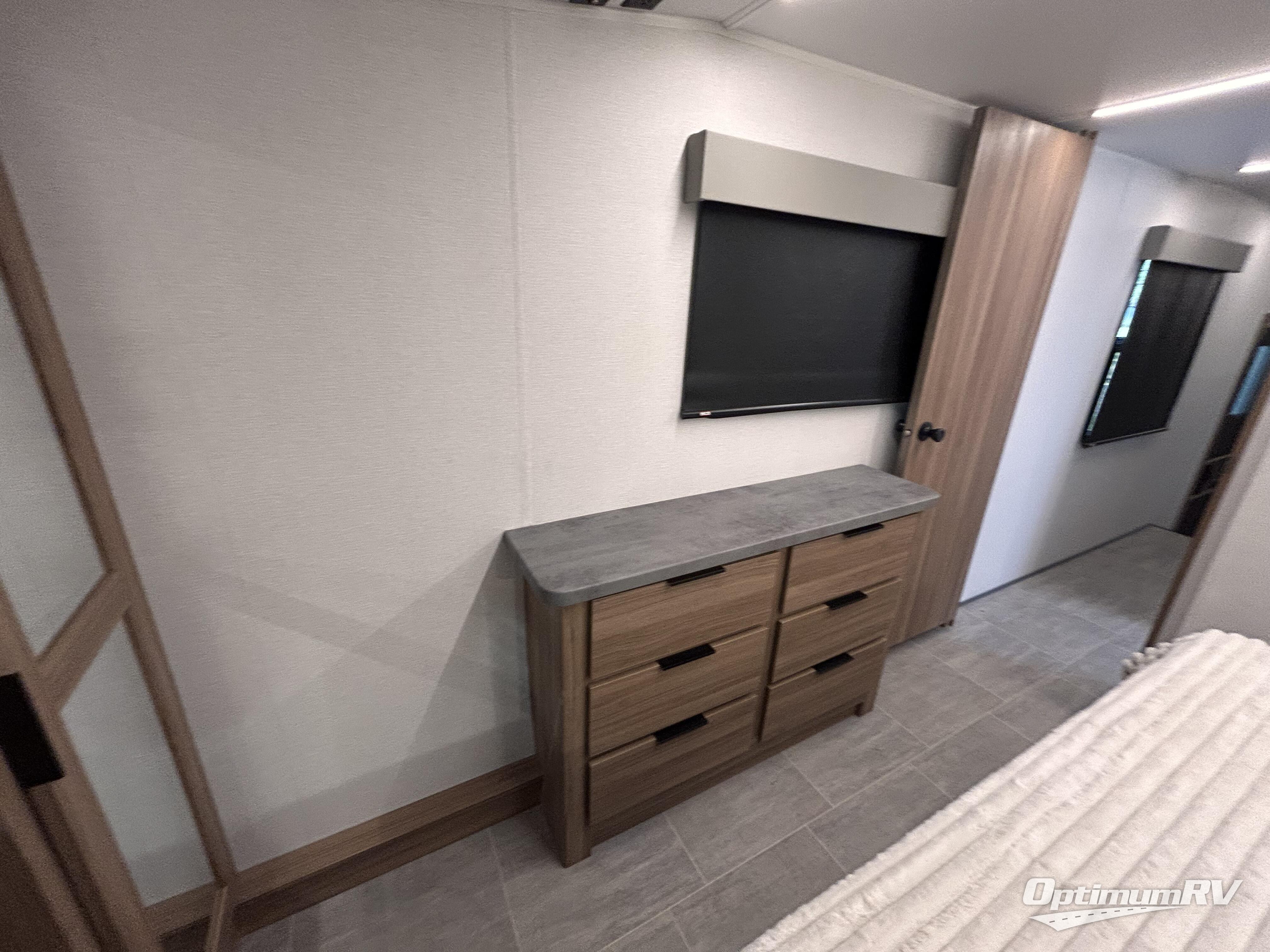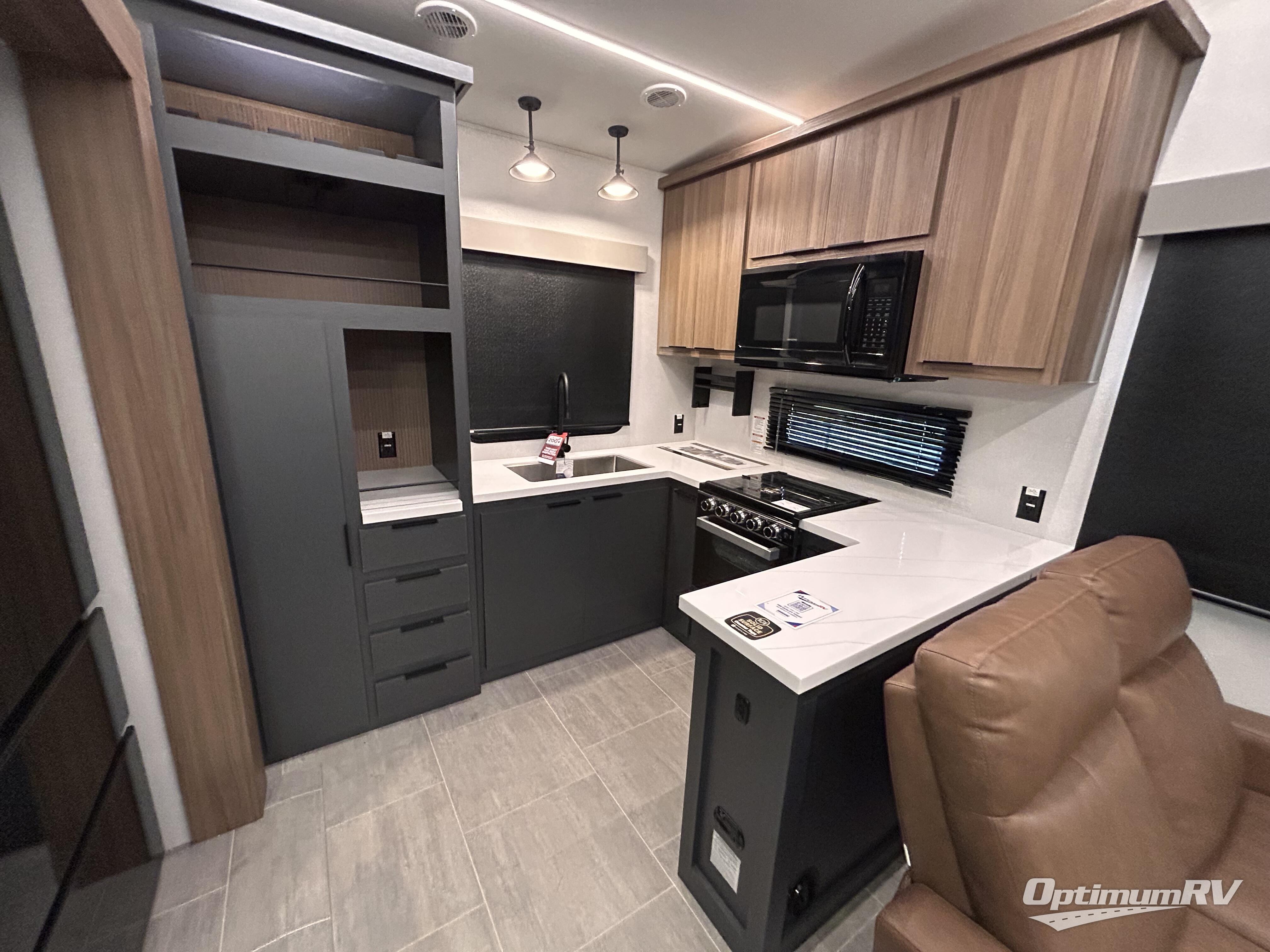This fifth wheel is big enough for the whole group to go camping! The front master suite has a 72" x 80" king bed slide across from a dresser and next to an area prepped for a washer and dryer, plus there is a front dresser with wardrobes on either side and even an entrance into the dual entry bathroom. The bathroom has a radius shower to freshen up in each morning and a lighted mirror to make it easier for seeing as you get ready. There is also a second bedroom that has a loft above a sofa slide, a wardrobe, and an entertainment center. The chef will have a great time preparing their best meals in the rear kitchen with the countertop space, 16 cu. ft. refrigerator big enough for their favorite ingredients, a 22" oven to cook fresh cinnamon rolls, and a 30" over the range microwave to pop a bag of popcorn on movie night, plus there are optional barstools that you can add for a breakfast area. Just outside the kitchen is the living area where you can relax in true comfort on the residential furniture with hidden cup holders and USB charging ports by the electric fireplace with hidden storage!