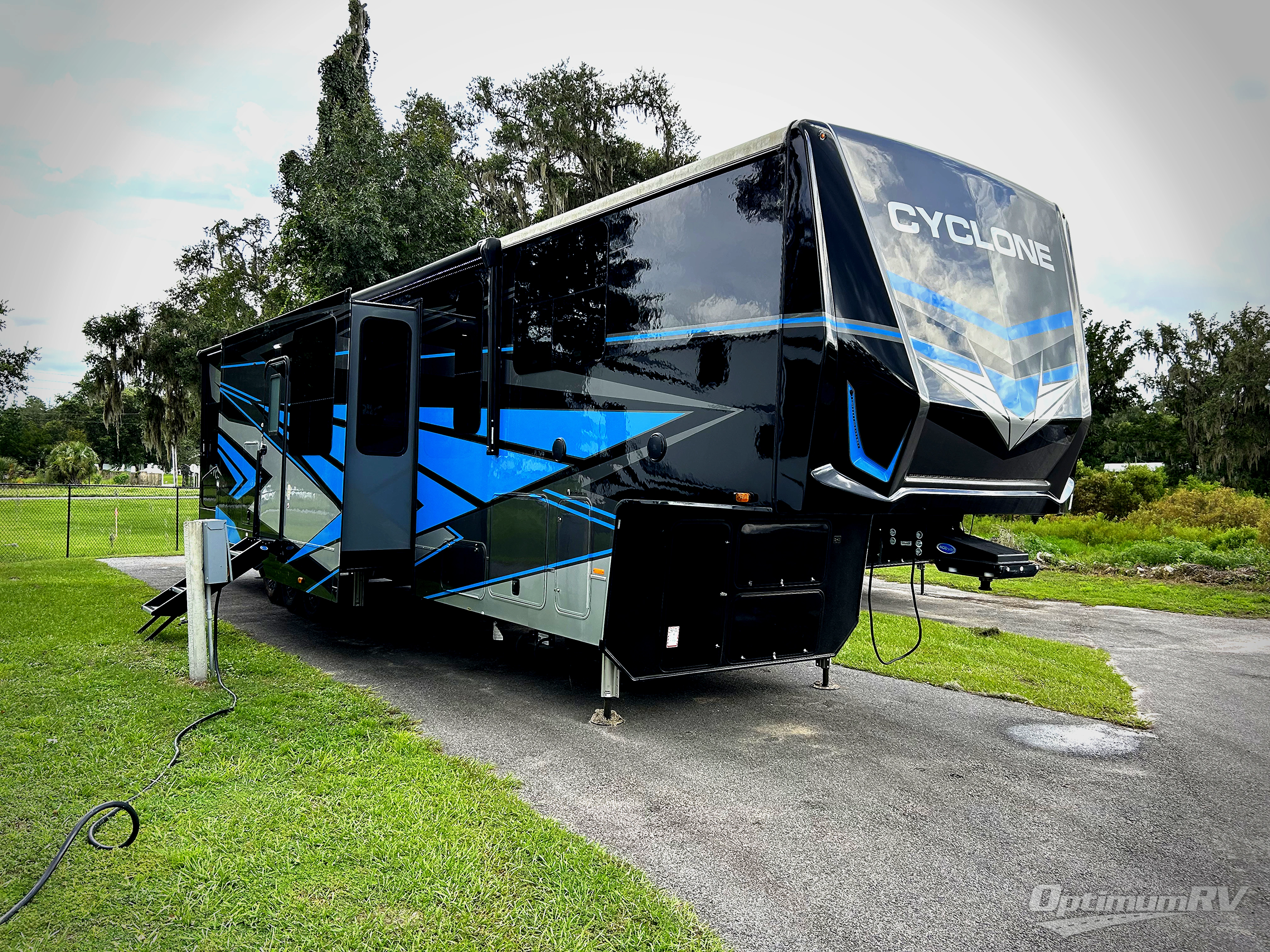 Satisfy your wanderlust with a Heartland Cyclone fifth wheel toy hauler! You won't have to sacrifice any luxury either with indulgent features like the king bedroom suite with an exclusive East to West bed tilt system with 30% more floor space, Stor-Mor three-sided access to the basement with 30% more storage capacity, and Step Caddy folding patio step for better stability as you enter or exit the patio. The industry first Grill and Go 25" residential pull out 3 burner griddle combo comes on models with an exterior kitchen for an easier cooking experience. Full height shaker cabinetry provides 25% more storage space so you can bring more camping necessities with you. If you like to dry camp longer then you will appreciate the industry's largest 150 gallons fresh water tanks. Come find the perfect model for you today!