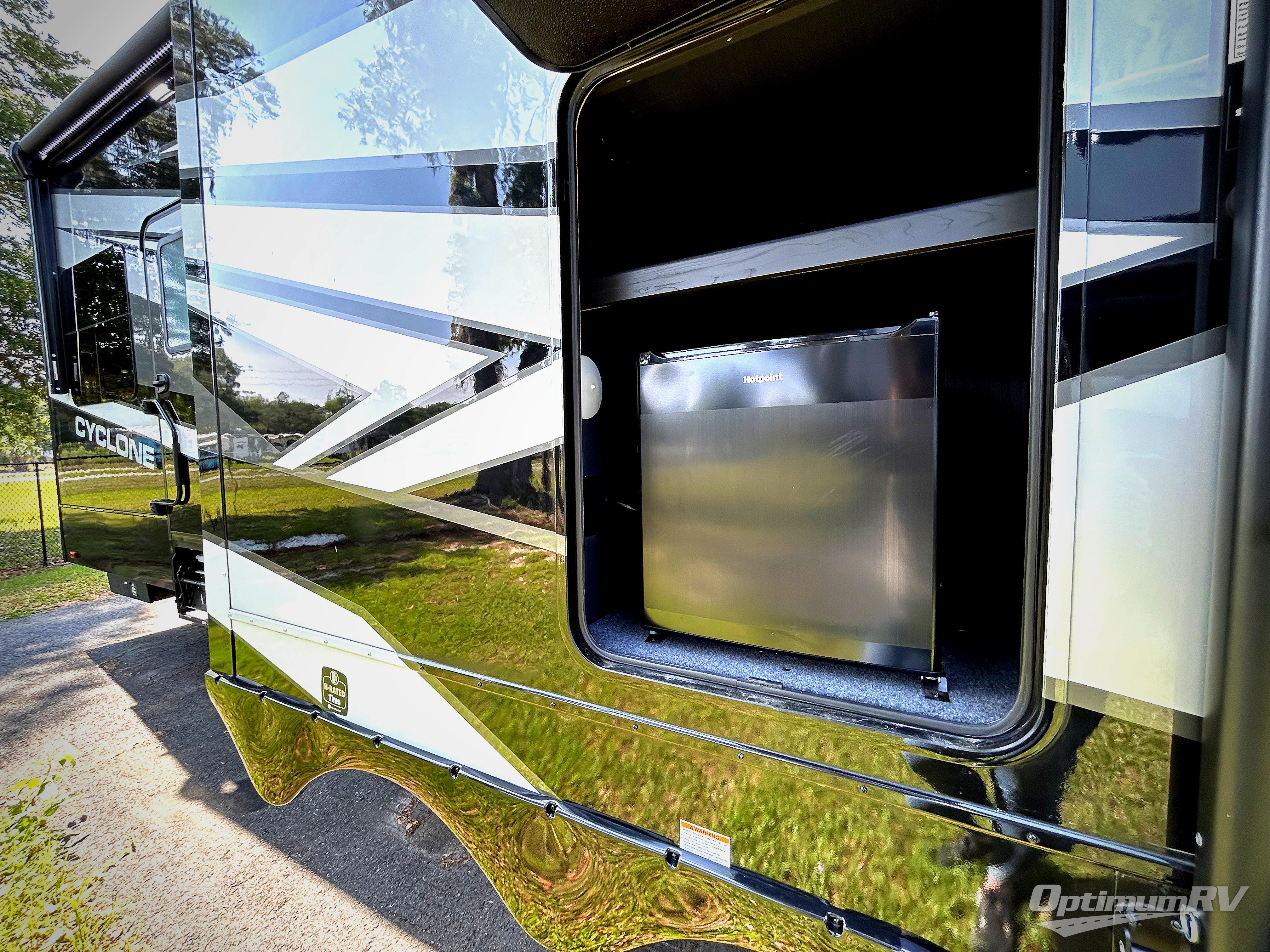 Satisfy your wanderlust with a Heartland Cyclone fifth wheel toy hauler! You won't have to sacrifice any luxury either with indulgent features like the king bedroom suite with an exclusive East to West bed tilt system with 30% more floor space, Stor-Mor three-sided access to the basement with 30% more storage capacity, and Step Caddy folding patio step for better stability as you enter or exit the patio. The industry first Grill and Go 25" residential pull out 3 burner griddle combo comes on models with an exterior kitchen for an easier cooking experience. Full height shaker cabinetry provides 25% more storage space so you can bring more camping necessities with you. If you like to dry camp longer then you will appreciate the industry's largest 150 gallons fresh water tanks. Come find the perfect model for you today!