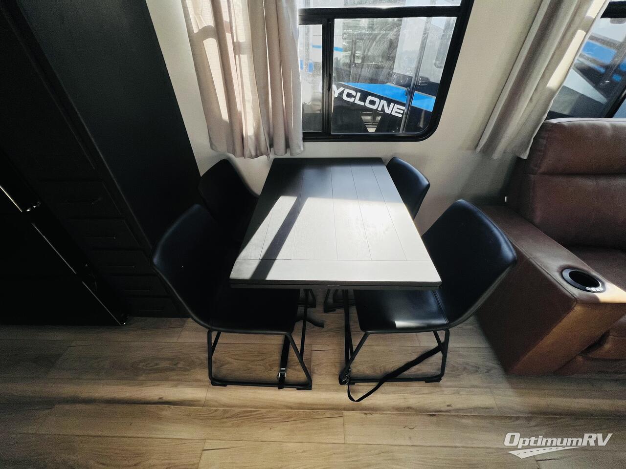 Satisfy your wanderlust with a Heartland Cyclone fifth wheel toy hauler! You won't have to sacrifice any luxury either with indulgent features like the king bedroom suite with an exclusive East to West bed tilt system with 30% more floor space, Stor-Mor three-sided access to the basement with 30% more storage capacity, and Step Caddy folding patio step for better stability as you enter or exit the patio. The industry first Grill and Go 25" residential pull out 3 burner griddle combo comes on models with an exterior kitchen for an easier cooking experience. Full height shaker cabinetry provides 25% more storage space so you can bring more camping necessities with you. If you like to dry camp longer then you will appreciate the industry's largest 150 gallons fresh water tanks. Come find the perfect model for you today!